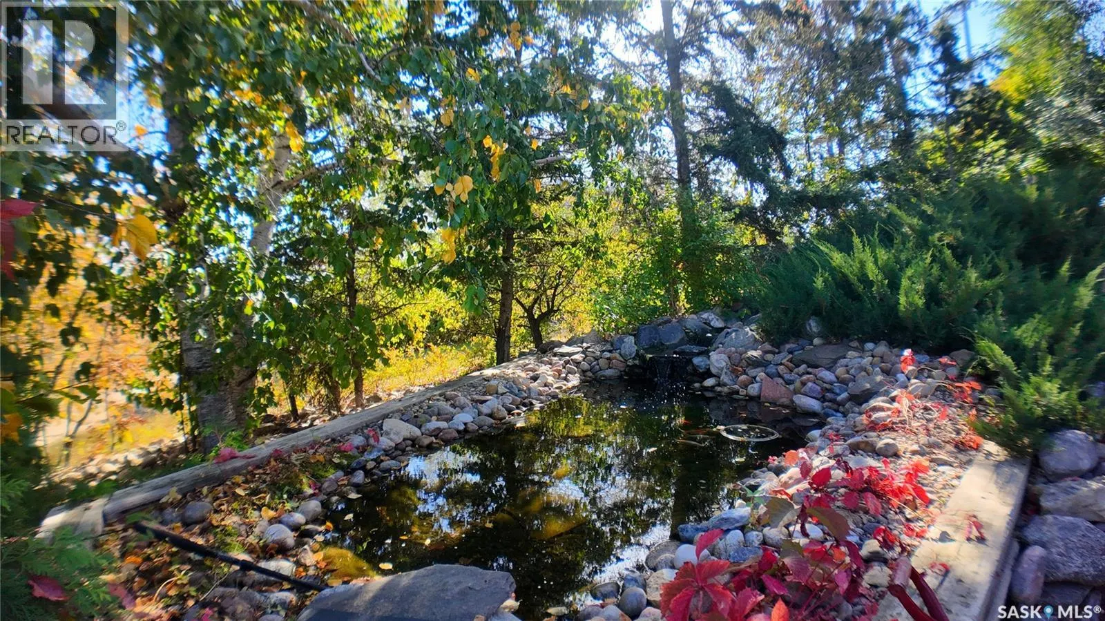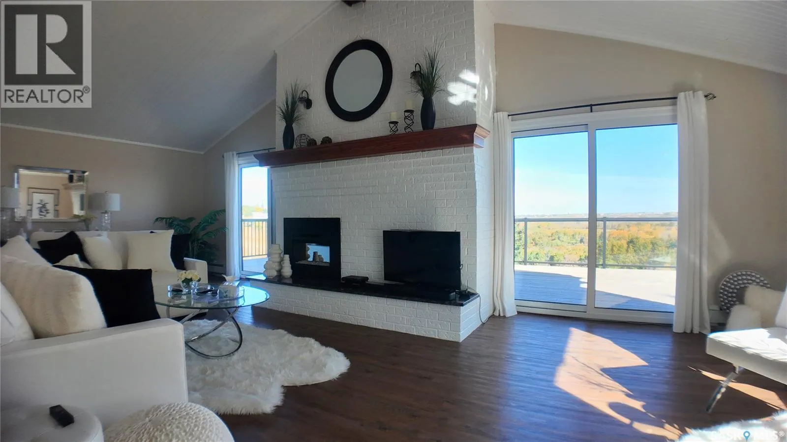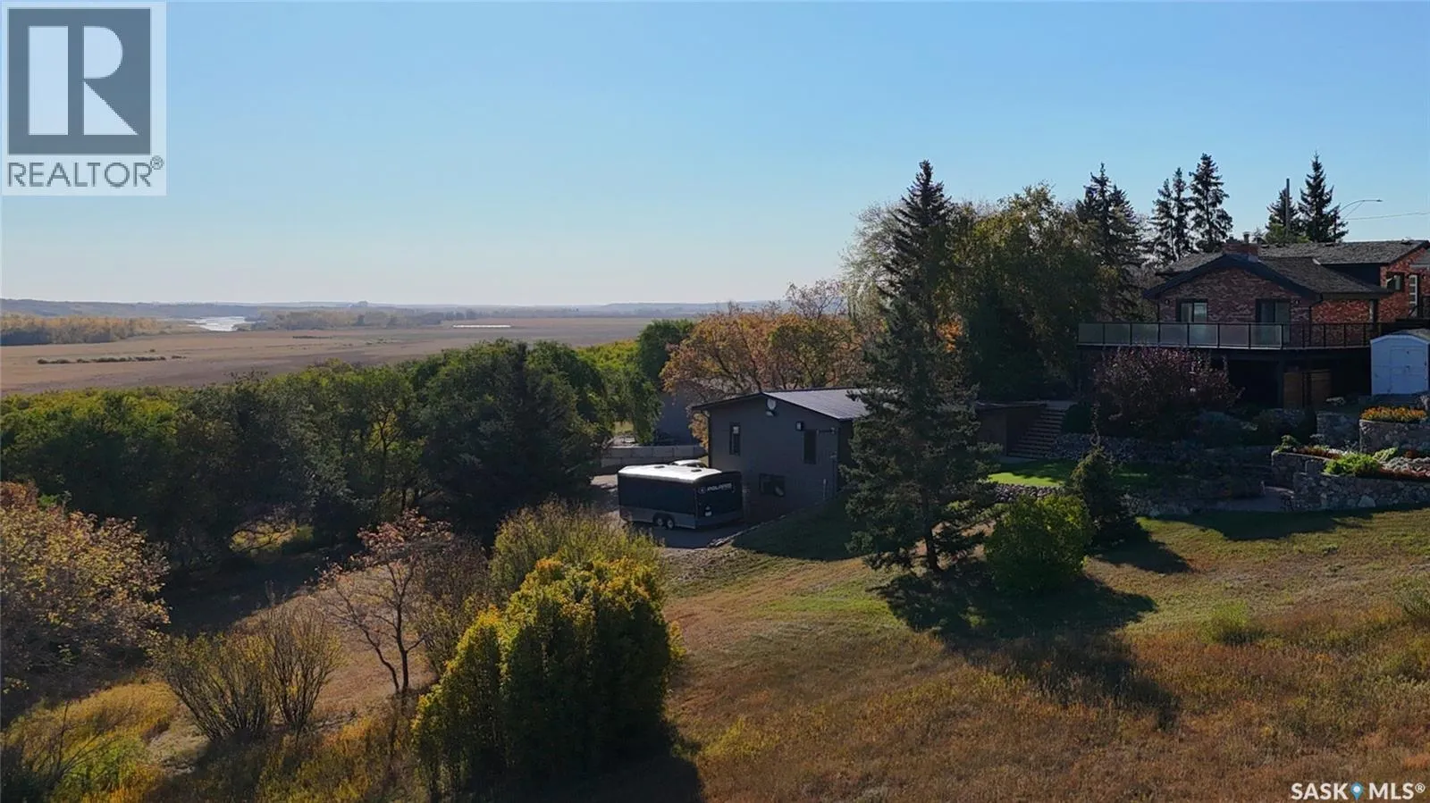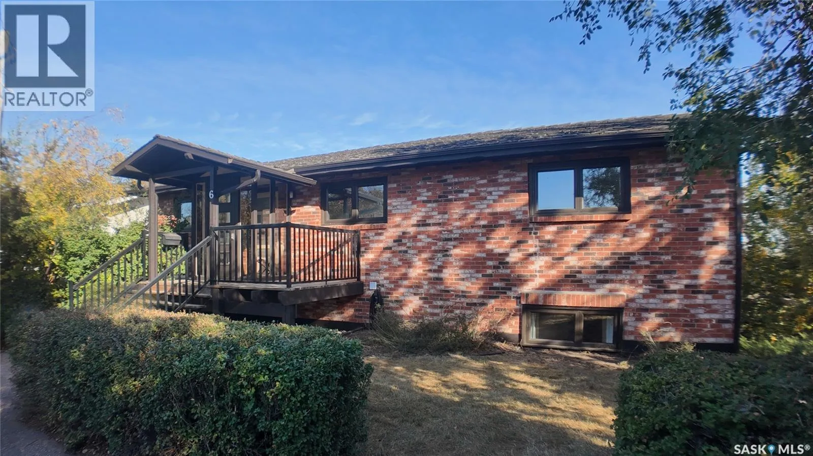 Experience refined living at 6 â 1st Avenue in Battleford. This 1,376 sq. ft. brick home blends timeless craftsmanship with modern elegance, offering 3 bedrooms, 3 bathrooms, and stunning panoramic views of the river valley, historic bridges, and ball diamonds. The interior features a custom white Bernier kitchen with Corian countertops, crown moulding, main floor laundry, and two wood-burning fireplaces for warmth and character. Outdoors, enjoy wrap-around decking, manicured landscaping with stone accents, a waterfall pond, and privacy with no homes in front. Completing the property is a 2019-built heated garage/shop with soaring 16â ceilings, mezzanine, in-floor heat, and top-quality construction. With its quiet location, upscale finishes, and unmatched setting, this home is truly one of a kind. (id:27476)