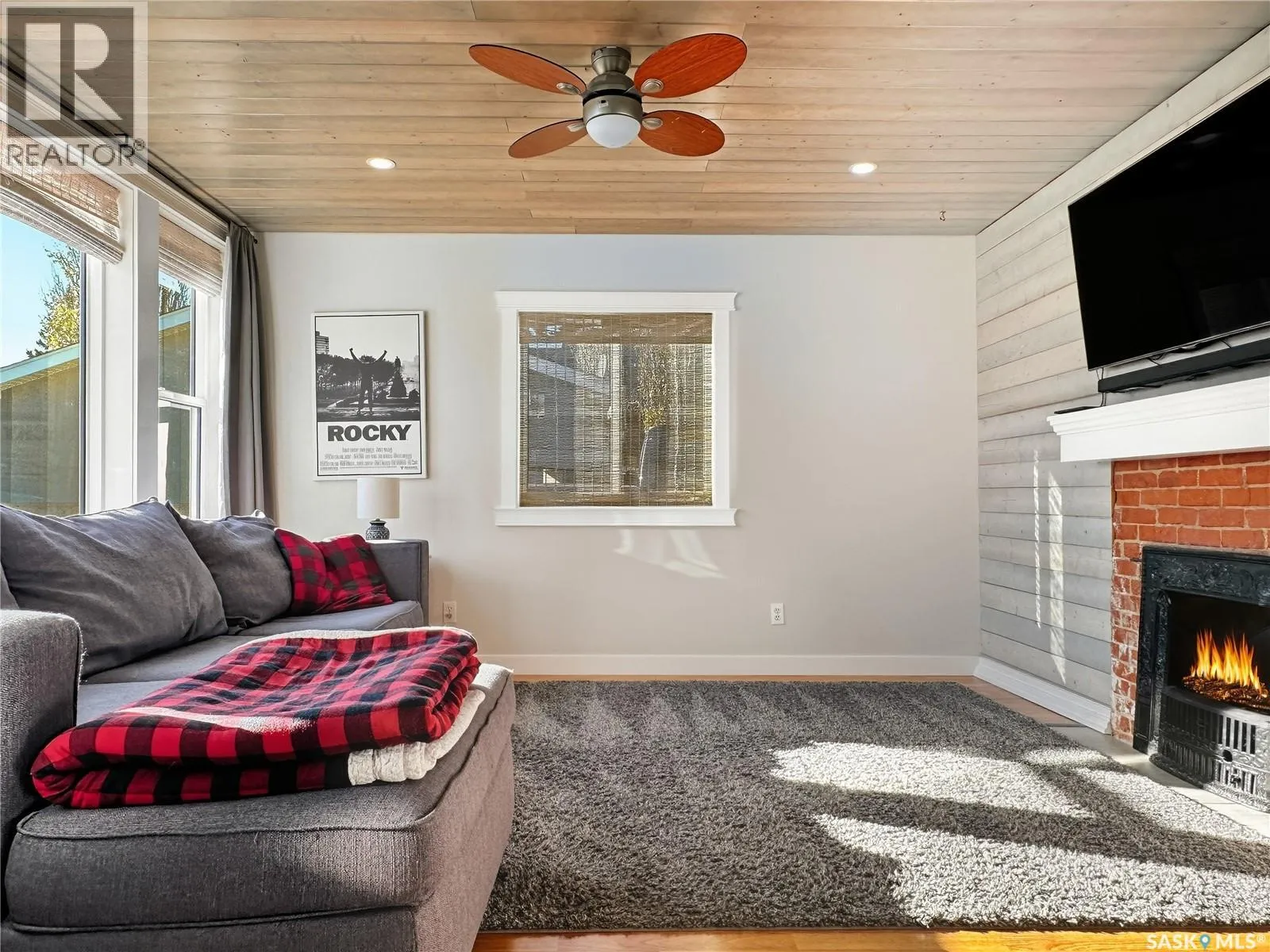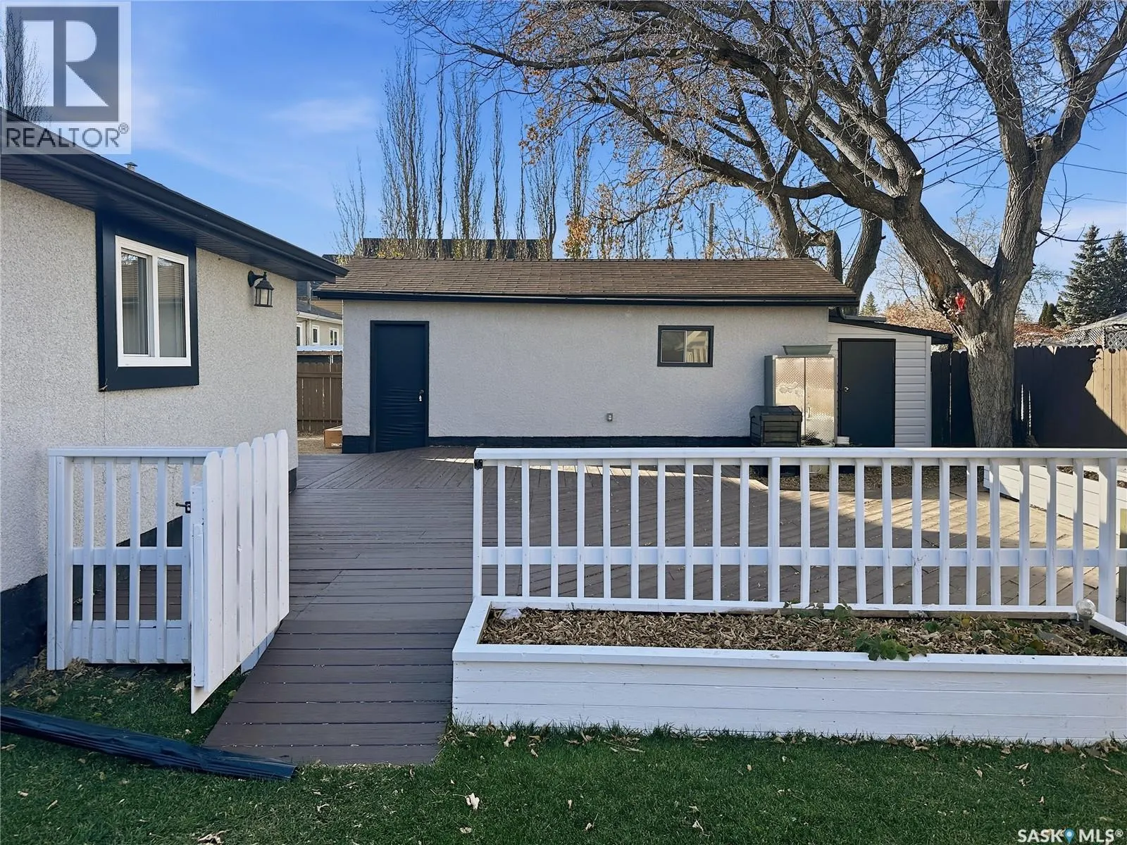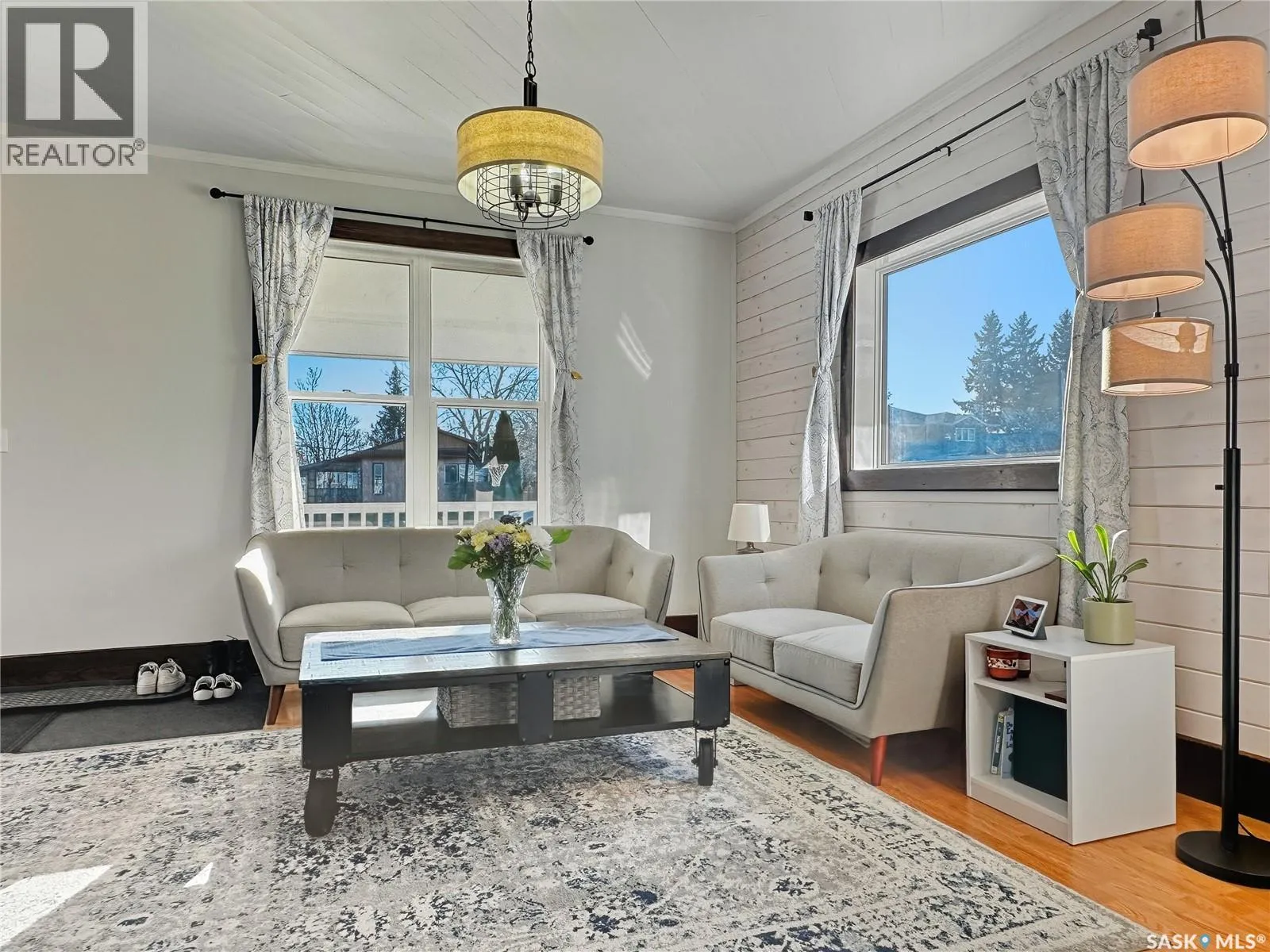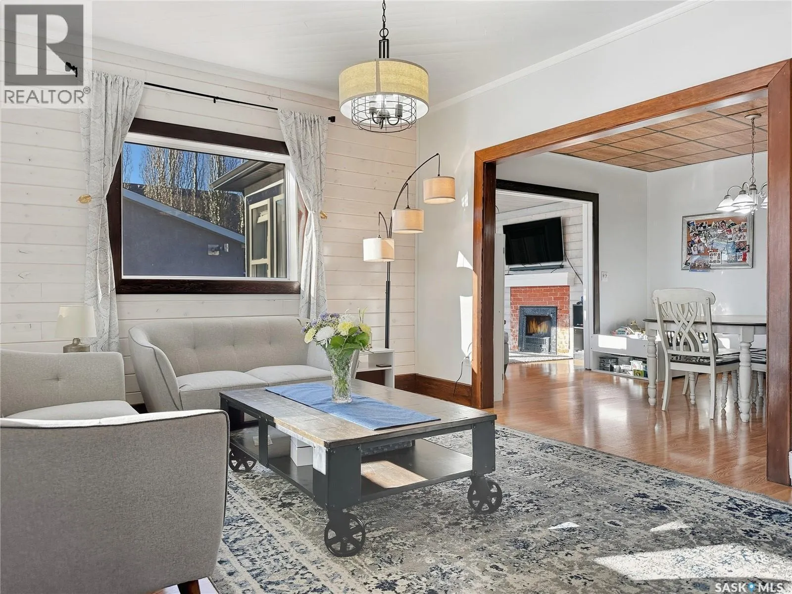 If these walls could talk⦠built in 1912, this solid and well-maintained home has countless stories to tell and all the character youâve been searching for. Located in the beautiful Town of Battleford, this property blends timeless charm with thoughtful updates. Step inside and feel the warmth right away. The spacious layout features large entryways connecting each room, with natural light pouring through the updated windows. A stunning solid wood banister greets you at the front doorâa classic hallmark of homes from this era. The living room is welcoming and flows seamlessly into the large dining area, perfect for hosting family and friends. Adjacent to the dining room is a cozy family room that was completely redoneâtaken down to the studs with new insulation, lighting, and a feature wall showcasing an electric fireplace set in the original brick surround. The kitchen offers excellent storage with an island, pantry, and plenty of cabinetry. Off the back door, youâll find a spacious mudroom ideal for winter gear and everyday use. The primary bedroom is conveniently located on the main floor, right next to the laundry area and a beautifully renovated 4-piece bathroom with quality finishes. Upstairs are two unique bedrooms, full of character and charmâeach with cozy nooks perfect for reading or play. The partial basement is great for storage and houses the updated furnace, hot water heater, and electrical panel. Central air conditioning was just installed in 2025 for added comfort. Outside, enjoy a large deck for entertaining, a fenced yard with a play structure and garden shed, and a single detached garage with a brand-new overhead door. And after a long dayâs work, unwind on the quaint covered front porchâa perfect spot to relax and take in the peaceful surroundings. This one-of-a-kind Battleford home is filled with history, charm, and comfortâready for its next story to begin. Call for your personal tour of this beautiful property today! (id:27476)