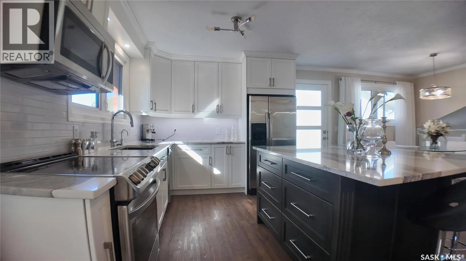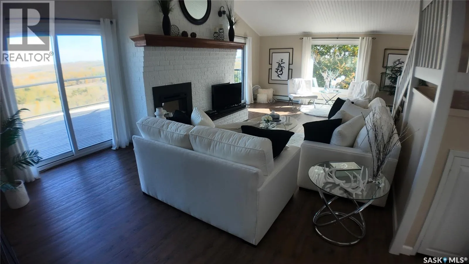 This is not a typical family home â and thatâs exactly what makes it special. Perched high above the river valley with uninterrupted views of Battlefordâs historic bridges and no neighbours in front, this beautifully updated brick home offers privacy, scenery, and lasting quality in one of the areaâs most distinctive locations. Set on a quiet, low-traffic street with year-round maintained access, the setting is both peaceful and practical. Inside, the home has been thoughtfully redesigned with modern finishes and flexible living spaces. The layout features one bedroom on the main level and two additional bedrooms on the lower levels, making it well suited for professionals, downsizers, or buyers who value lifestyle and personal space over a traditional childrenâs floor plan. Multiple living areas, decorative fireplace features, and expansive wrap-around decking create inviting spaces for everyday living and entertaining â all oriented to take full advantage of the views. A true standout is the professionally built garage / shop (2019). Fully serviced with in-floor heat, boiler with backup furnace, 220 power, high ceilings, and a mezzanine, this exceptional space is ideal for a workshop, studio, hobby use, or home-based business that requires more than a standard garage. Outdoors, enjoy extensive decking, landscaped grounds, underground sprinklers, and a waterfall pond â all overlooking one of Battlefordâs most iconic river valley views. This property is best suited for buyers seeking quality, privacy, and flexibility rather than a conventional family layout. A rare opportunity to own something truly unique. (id:27476)