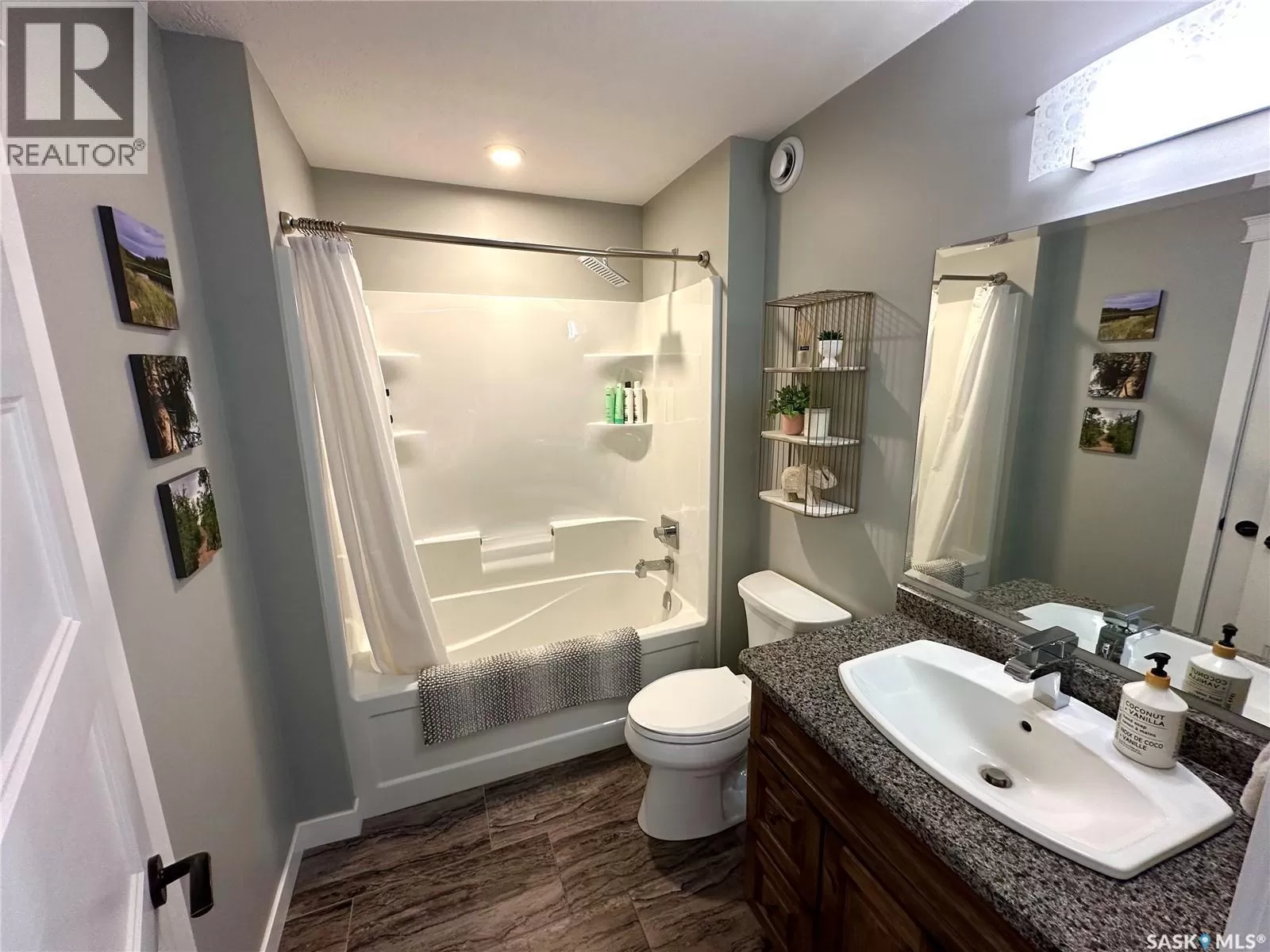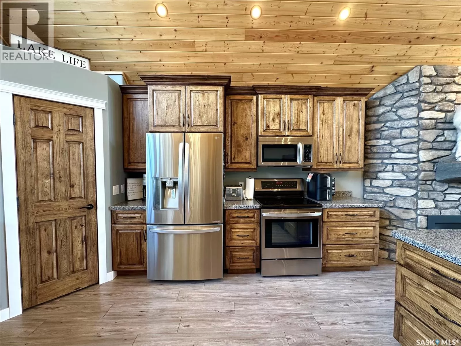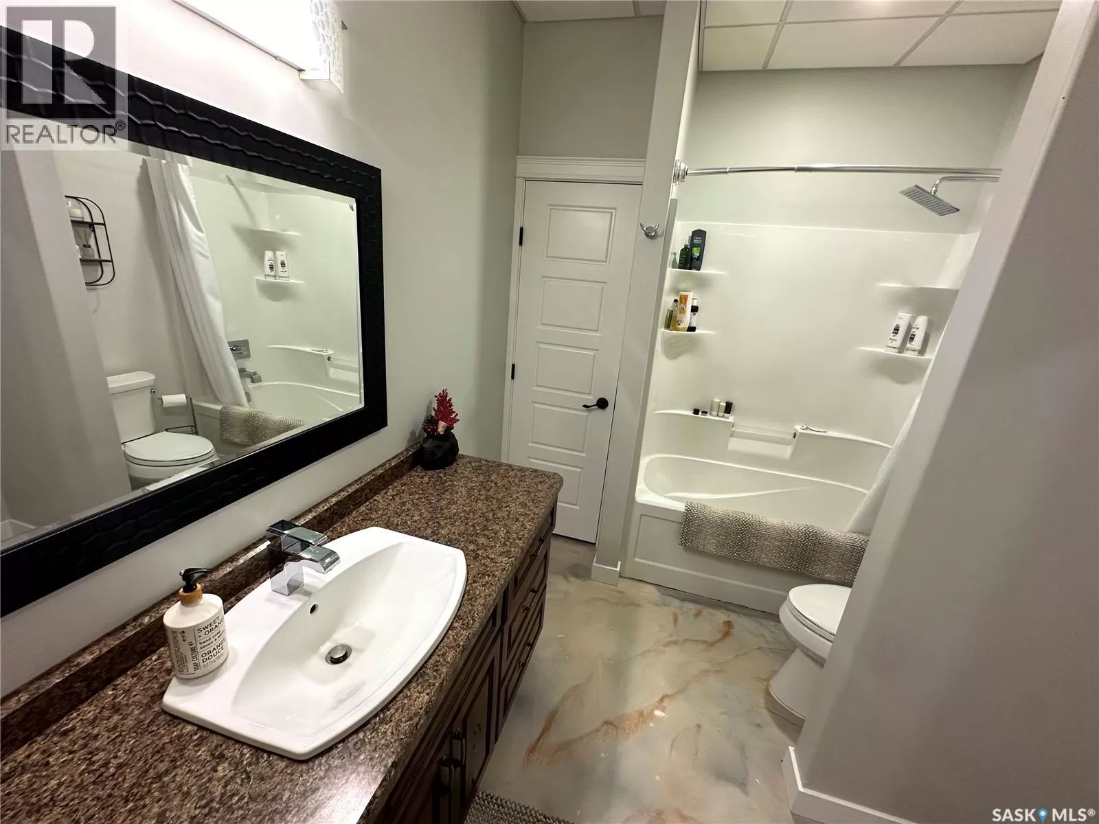 Executive home at Sunset Rim Estates overlooking the trees and the shores at the beautiful Big Shell Lake. This home is sure to impress from the moment you drive up with its eye-catching architecture design and breathtaking views. The open floor plan allowing you to enjoy the east facing windows overlooking the incredible landscape and path down to the water. The garden doors off the living room lead you to a massive covered deck with outdoor speakers, extending your useable space to enjoy the outdoors for grilling, entertaining, relaxing, and just appreciating nature. Home features 4BD, 3BA, main floor laundry, custom built hickory cabinets, vaulted ceilings, large master bedroom with walk-in closet and spacious en-suite, nat gas fireplace, 2 nat gas BBQ hook ups, walk-out basement with theatre room, large family room, and garden doors leading you to a beautiful firepit area. The yard is extremely low maintenance giving you more time to enjoy the house, lake and the outdoors. The attached 36X50 (1800sq ft) heated garage is every mans dream, two main doors and a smaller door for sleds, ATV, and your fishing boat, the garage mezzanine allows for ample storage for all your extra hunting/fishing/ gear to be stored easily. This incredible home is move in ready, and truly is a must see to appreciate all it has to offer. Comes with all appliances, boat dock/lift and future memories. Private well, and a bonus second shared well with an easement agreement in place, walkway to the water easement as well both transferable to the buyer. (id:27476)