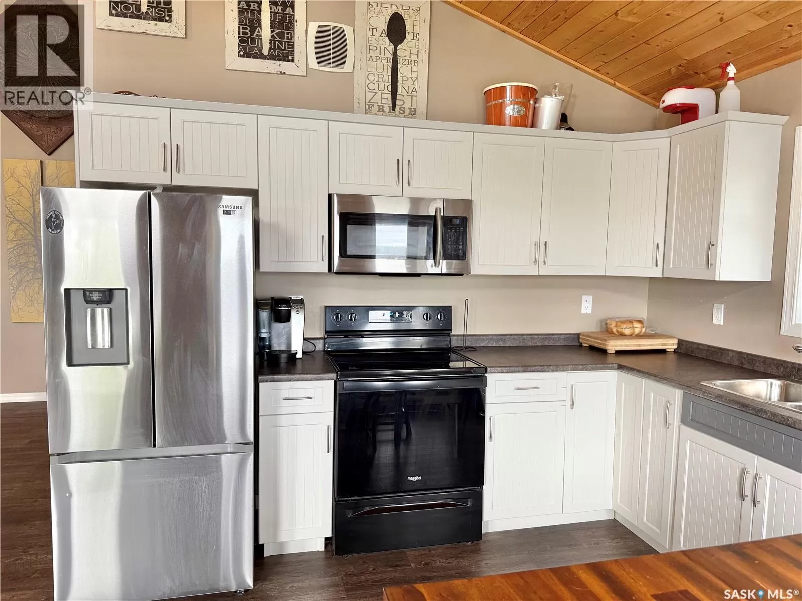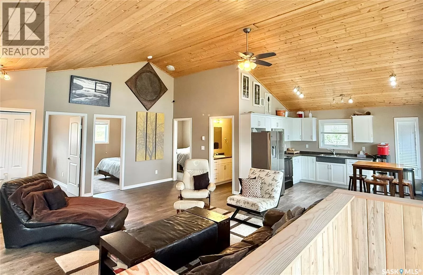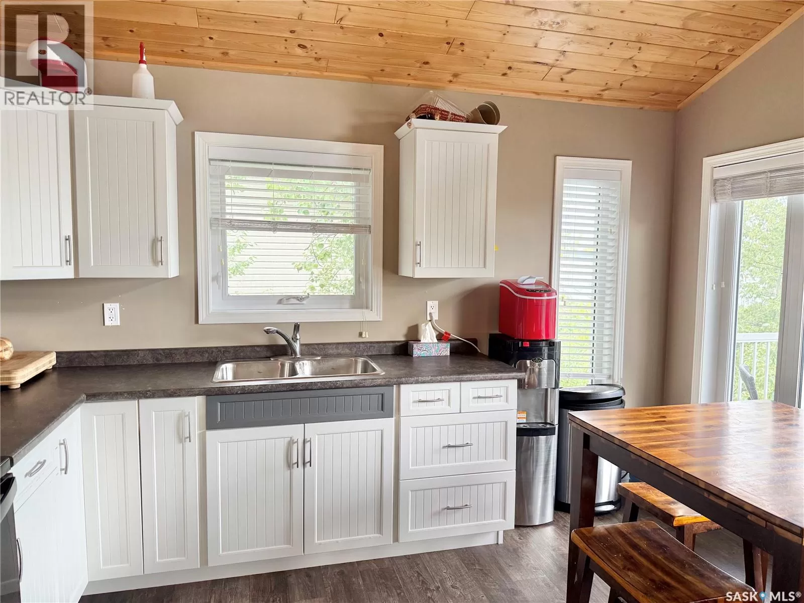 Built in 2014, this lovely 4-season lakefront cottage offers over 2,000 sq ft of living space with 6 bedrooms and 2 bathrooms, perfect for family gatherings or hosting guests. The main floor features vaulted pine ceilings, low-maintenance lino flooring, a natural gas fireplace, and an open kitchen with deck access and a natural gas BBQ. The spacious covered wrap-around deck and lower-level custom brick patio with fire pit area provide multiple spots to soak in the beautiful lake views while maintaining your privacy. The walkout basement includes 3 of the bedrooms (one unfinished), a 3pc bath/laundry, and a cozy electric fireplace. Enjoy year-round comfort with natural gas forced air heat plus electric baseboard backup. Extra items of note include a 1250-gallon fresh water tank, concrete septic holding tank, lake water intake for yard use, large shed with overhead door, and wheelchair accessibility. With a hard, sandy shoreline just steps away you can enjoy the lake to the fullest! Aspen Ridge Development is on the southwest side of Big Shell Lakeâonly 1 hour 20 minutes from Saskatoonâthis move-in ready, furnished property is an ideal getaway for fishing, water sports, or simply relaxing at the lake. Set on a large lot - there is opportunity for you to build a garage as well. Enjoy Saskatoon Berry bushes and Chokecherries right in your front yard! Reach out for more information! (id:27476)