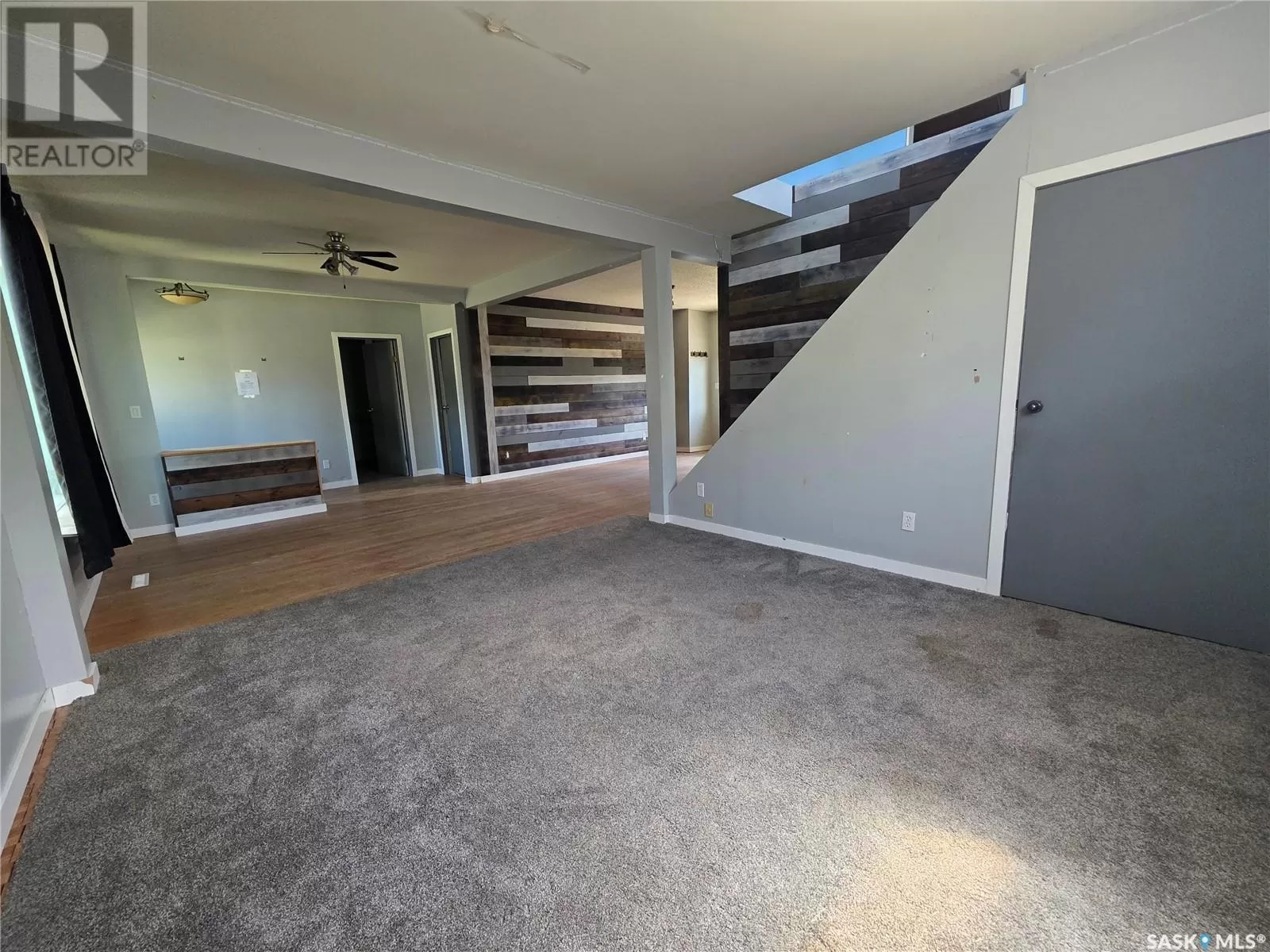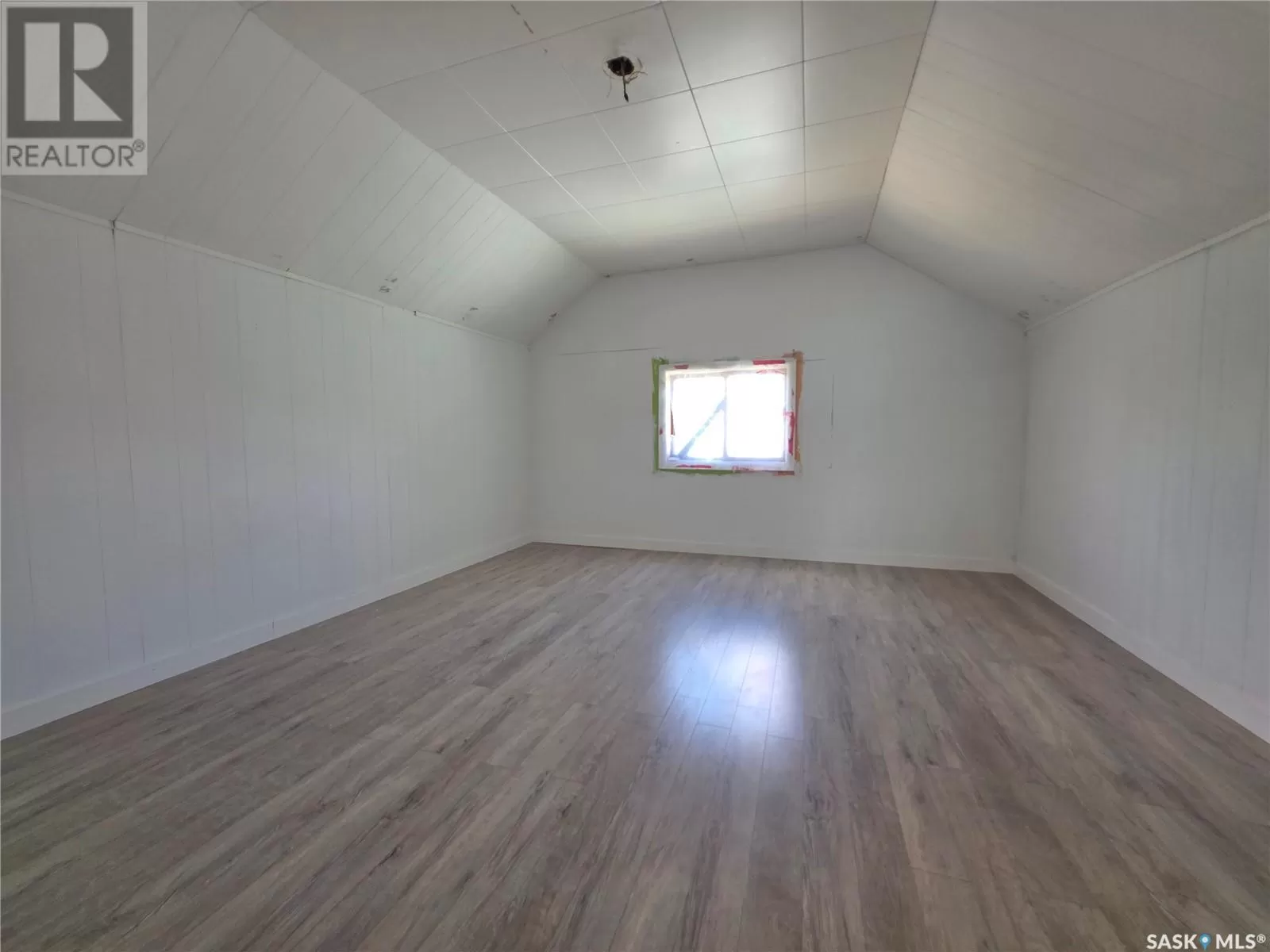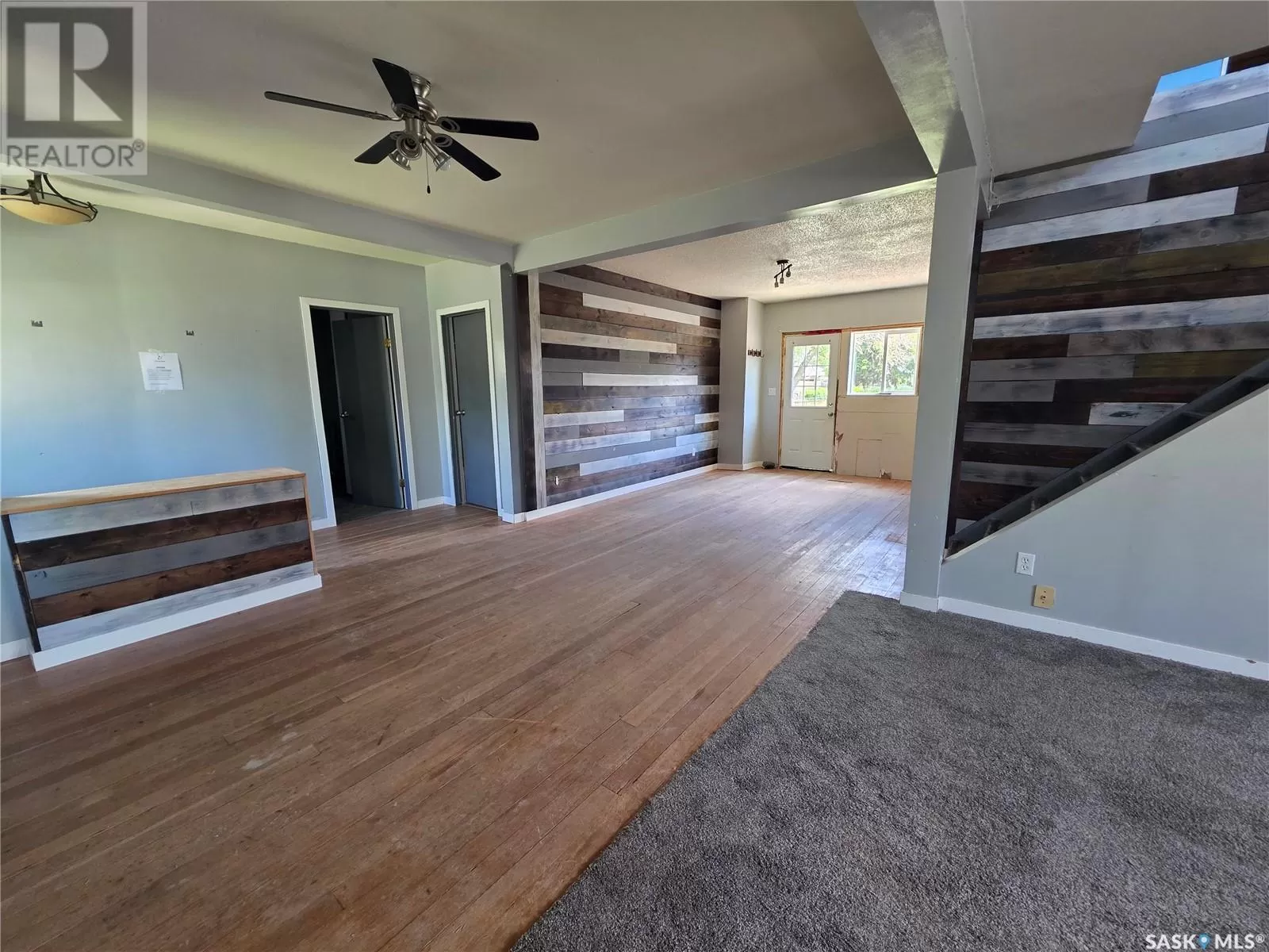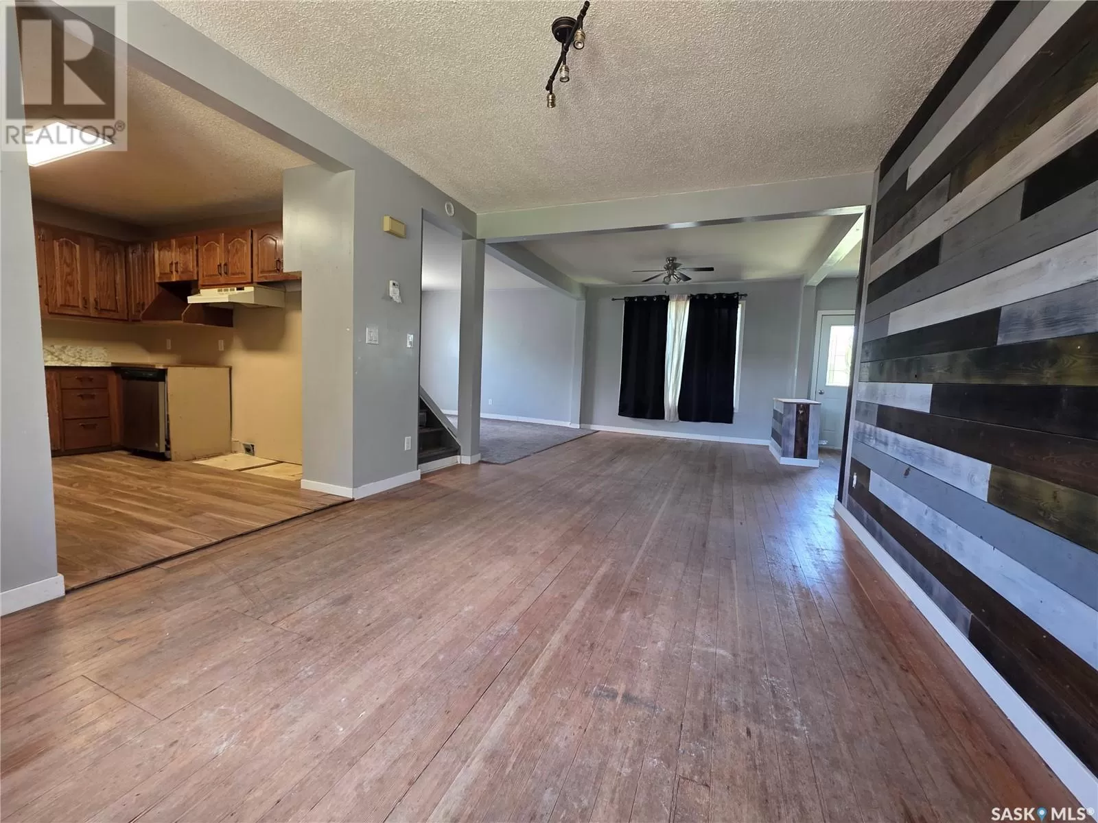 Discover the charm of Cabri, a cozy community just 40 minutes from Swift Current, with this one-and-a-half-story home blending charming character with modern updates. Step inside to an open-concept main floor showcasing rustic wood floors, flowing from the entry to the living and dining areas. The dining space features a striking barnwood feature wall and has seamless sightlines to the U-shaped kitchen with ample counter space and oak cupboards. The main floor primary bedroom boasts dual closets framed by a shiplap feature wall, while the four-piece bathroom/laundry room combination wows with a unique vaulted ceiling. Upstairs, is a fantastic feature with a secondary living room area as well as a second bedroom that would be perfect for an older child to have their own space. Outside, youâll find stone walkways, a built-in fire pit, landscaped flower beds, a partially fenced yard, mature trees, and plenty of green space. The double detached garage is mainly insulated but does not have power running to it. The foundation on this house has experienced some failure, so full disclosure that there may need to be some support required. If you have any questions or would like to see this home for yourself, feel free to call your real estate professional. (id:27476)
