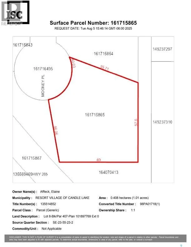 Over 1 Acre Lot in Candle Lakeâs Airpark Subdivision! Discover the perfect location to build your dream cabin on this large, beautifully treed 1.01-acre lot at the end of a quiet cul-de-sac in the desirable Airpark community. Enjoy exceptional privacy with no neighbours on three sides, while still being just minutes from the lake and local amenities. Services including power and natural gas are conveniently located at the front of the property. This prime location offers the best of both worldsâpeaceful surroundings with easy access to the lake, golf course, and Candle Lake Airpark. Lot Highlights: 1.01 acres in a private cul-de-sac Power & gas at property line No neighbours on three sides Close to lake, golf, and airstrip access Ideal site for your dream cabin or investment build (id:27476)
