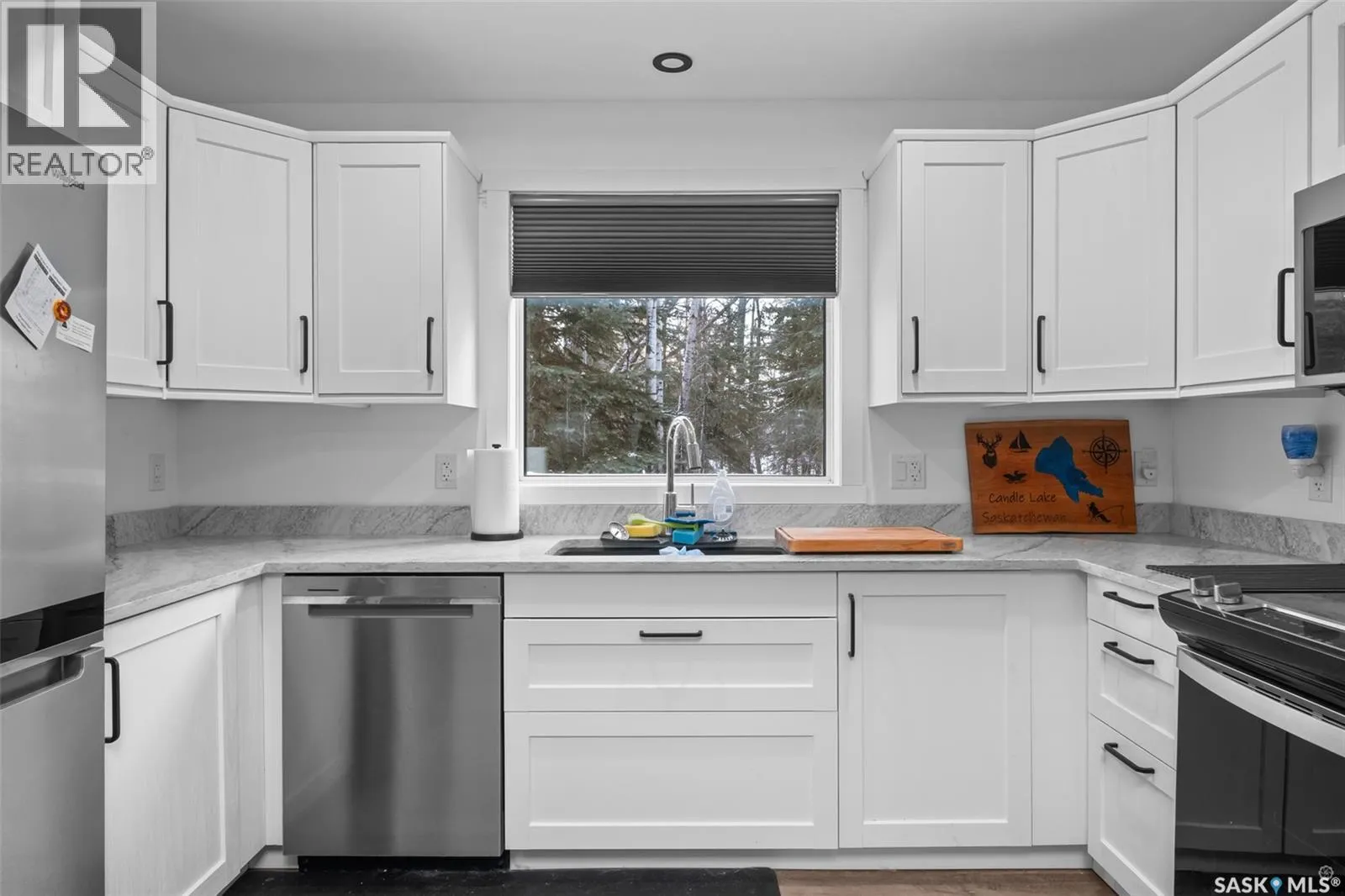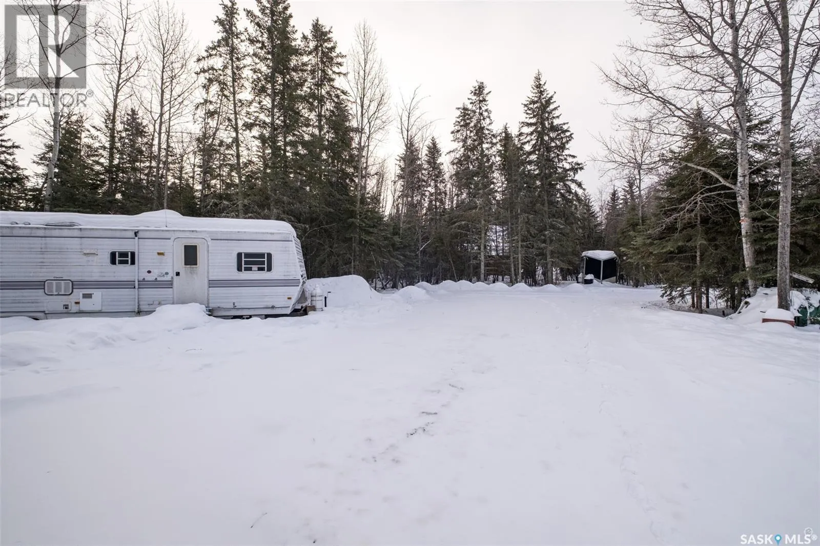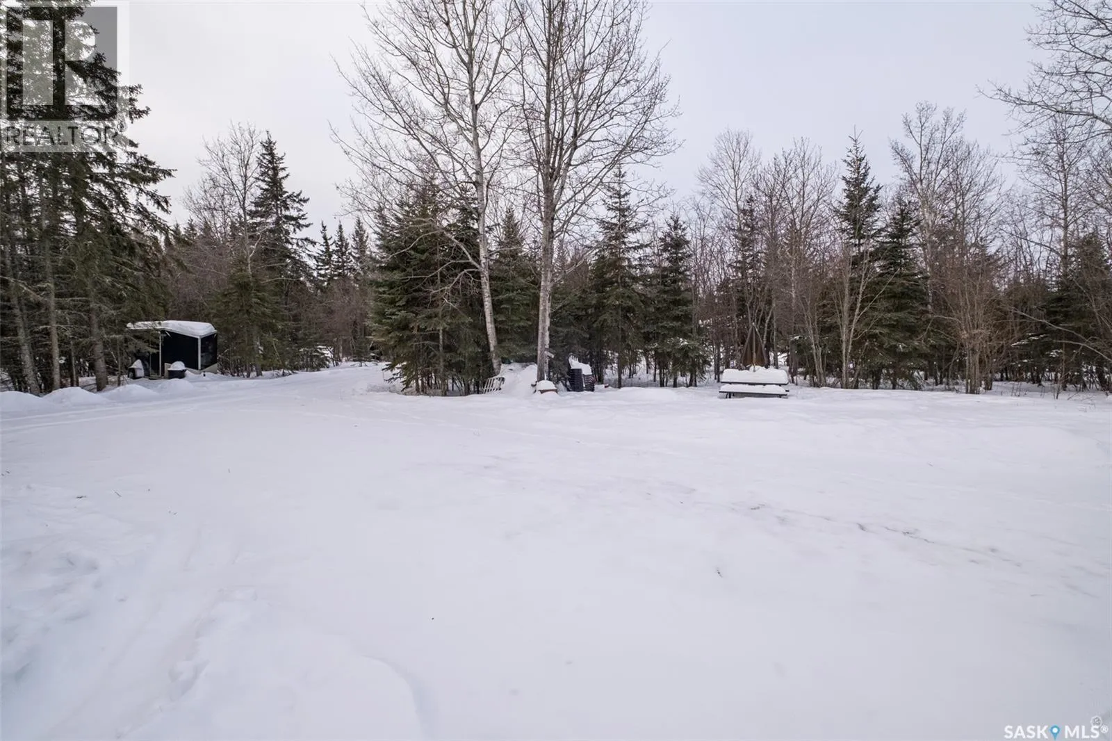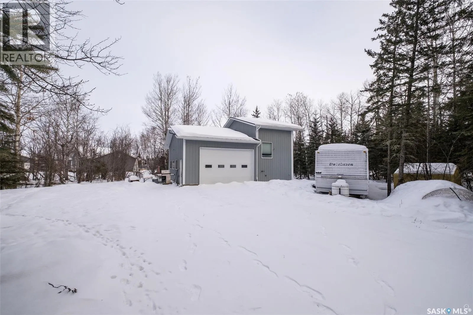 Enjoy lake life in this modern 2023 built retreat set on a private beautifully treed 1 acre lot in the popular Island View subdivision at Candle Lake. Whether you are settling in full time or escaping to the lake this 1,492 sqft home offers the space and flexibility to fit your lifestyle. The main living area is anchored by a huge open concept space and highlighted by a large garage door that opens directly to the outdoors, creating seamless indoor-outdoor living during the summer months. This versatile area offers endless possibilities and can be finished to suit your needs whether that means adding additional bedrooms, creating a spacious living room or designing the ultimate entertainment space. The layout flows naturally into a modern kitchen that features bright white cabinetry, stainless steel appliances and a large window above the sink that frames peaceful views of the surrounding trees. Just off the kitchen is a convenient laundry area and a stylish 3 piece bathroom that features a walk-in shower with a sleek tile surround and glass door. The upper level offers a spacious primary bedroom with a walk-in closet and a generously sized second bedroom. The home is built on a 5 inch concrete slab and includes a 1,400 gallon septic tank and a 500 gallon holding tank. It is pre-plumbed for in-floor heat, wired for Starlink and equipped with central air conditioning. With drilling still required, the property is prepared for a future well offering the chance to establish a reliable water source and there is ample space to build a garage or additional outbuildings. Enjoy a private serene setting surrounded by mature trees and shrubs complete with a dedicated firepit area for relaxing evenings. Located in one of Saskatchewanâs most sought after lake communities this property offers flexibility, space and modern construction. Book your showing today and start enjoying the Candle Lake lifestyle! (id:27476)