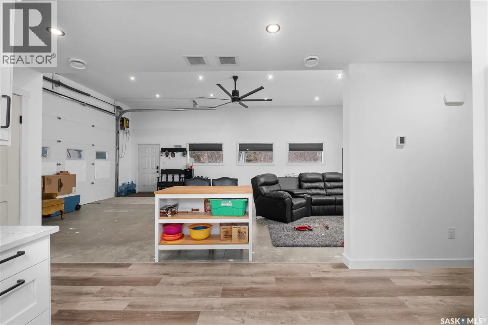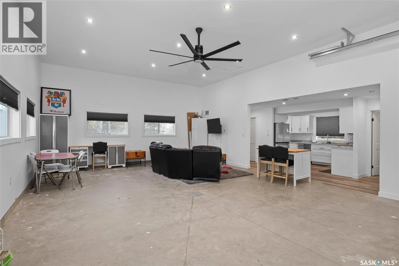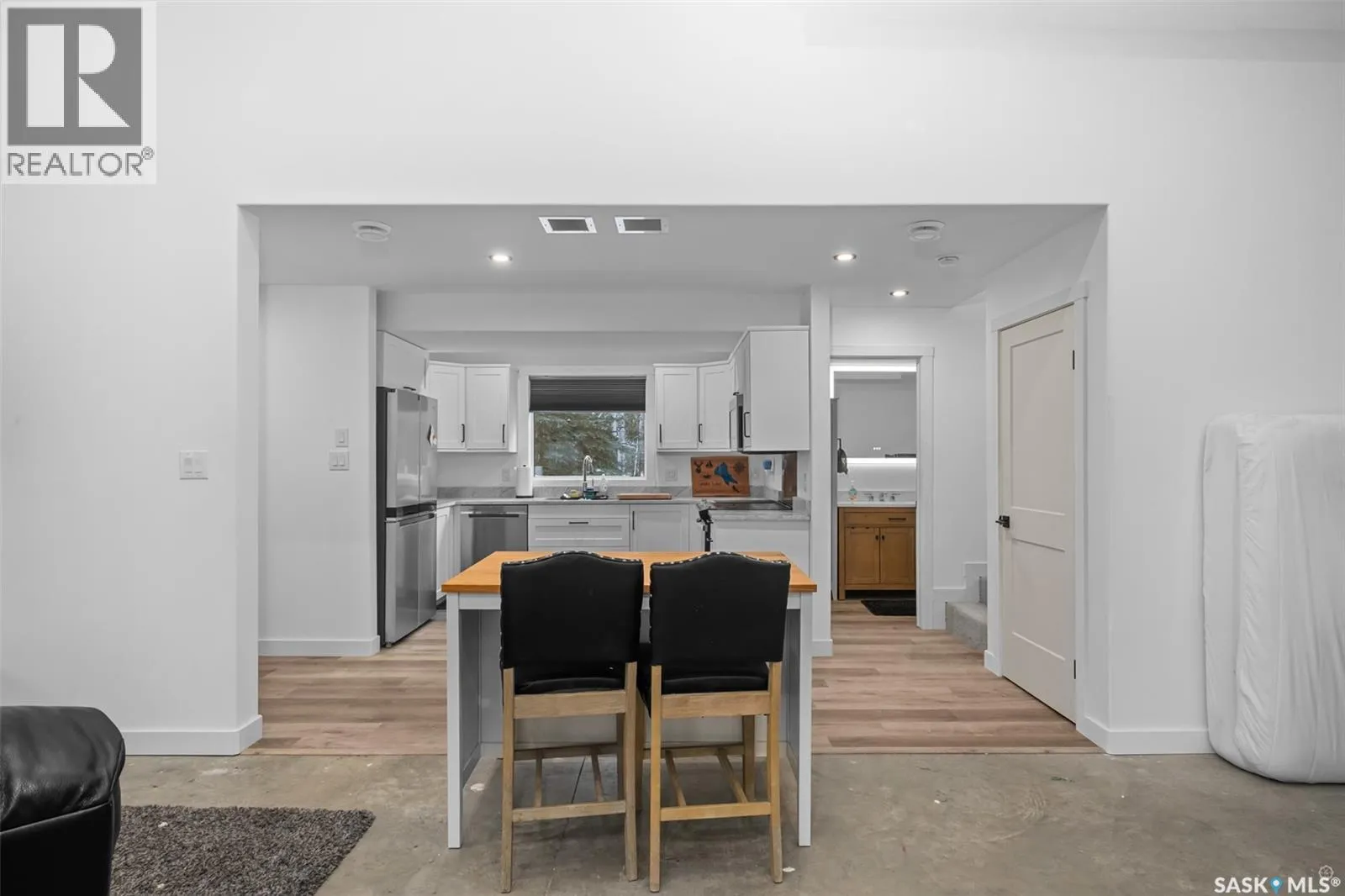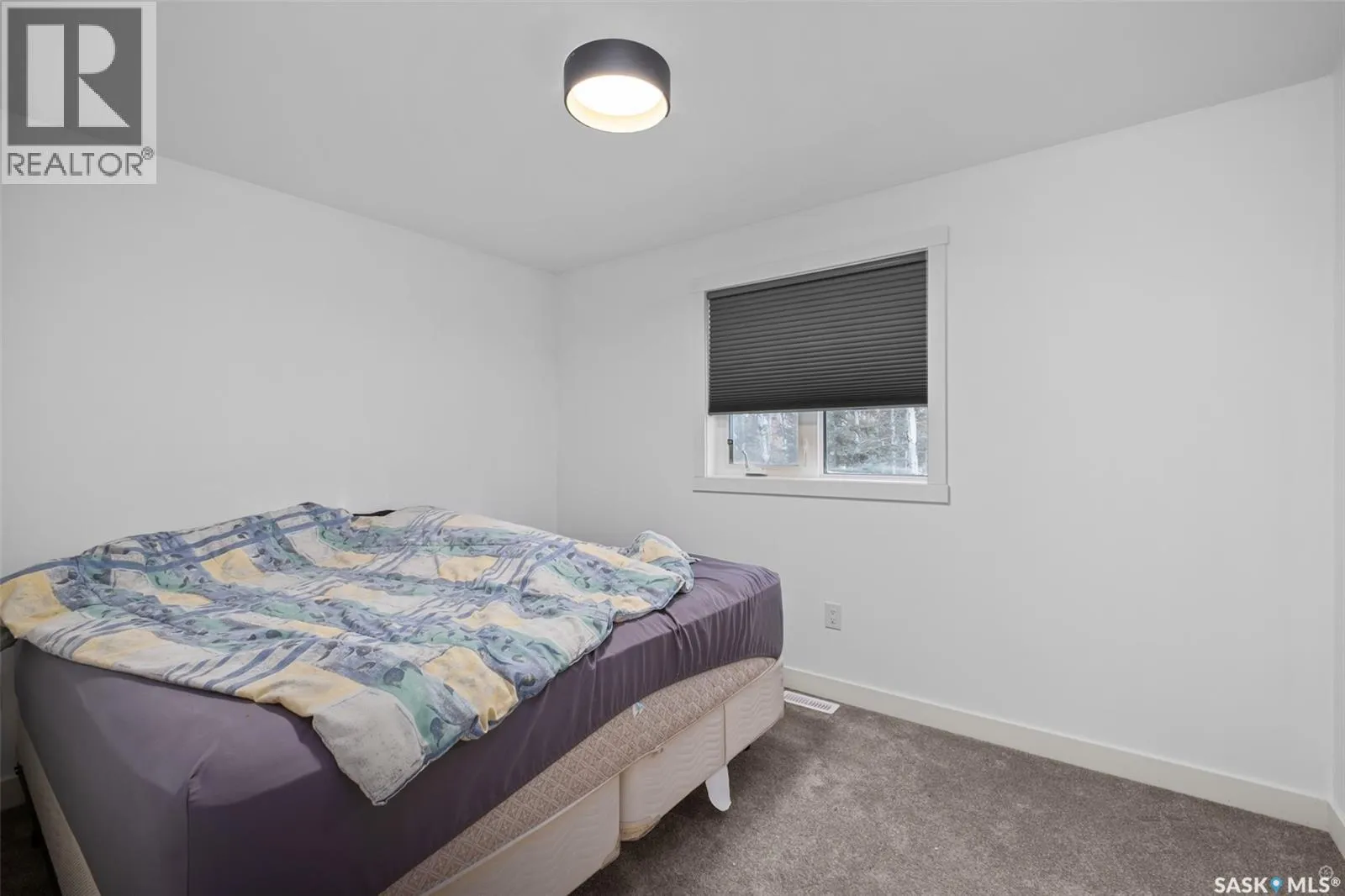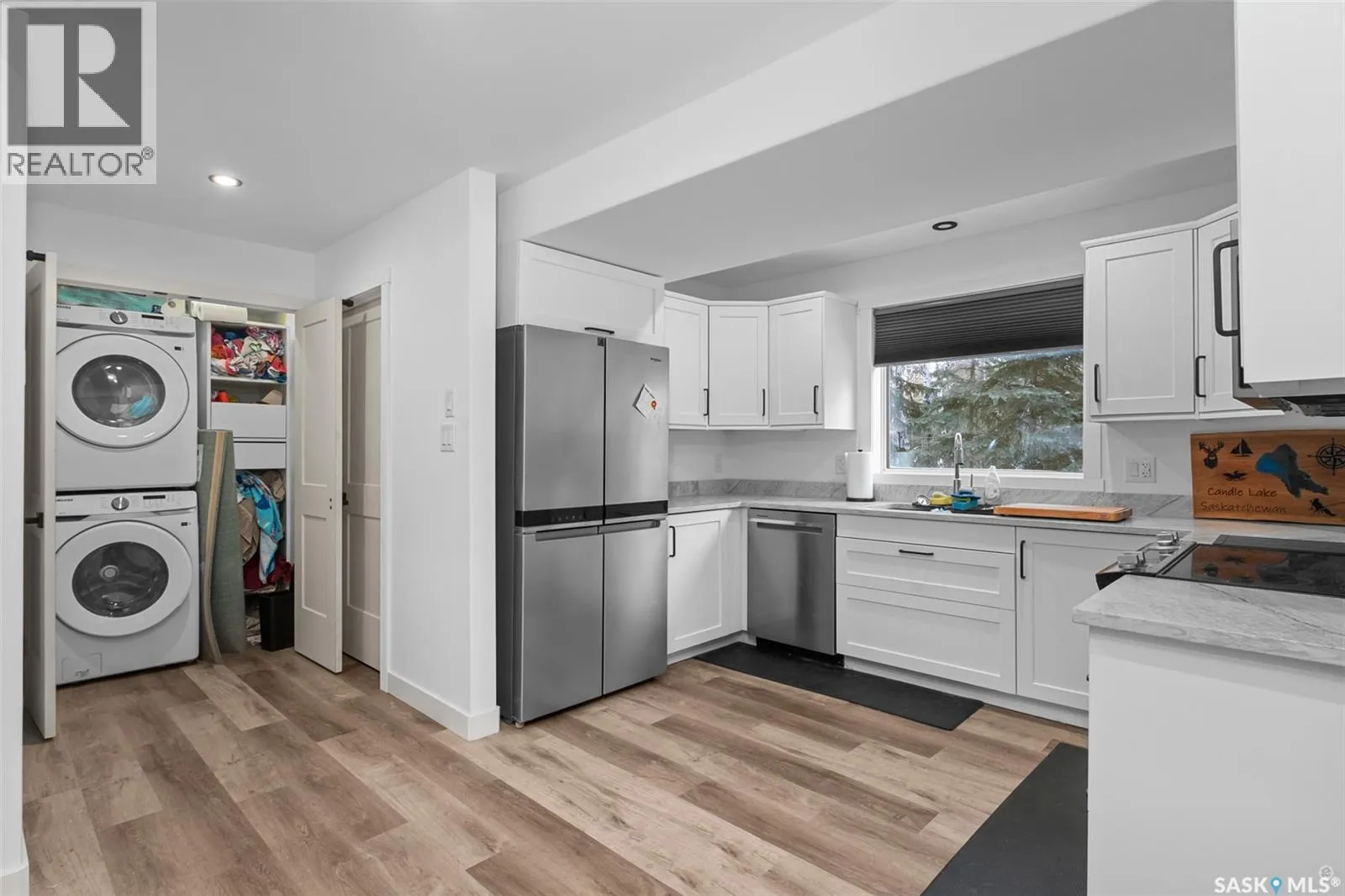 Enjoy lake life in this modern 2023 built retreat set on a private beautifully treed 1 acre lot in the popular Island View subdivision at Candle Lake. Whether you are settling in full time or escaping to the lake this 1,492 sqft home offers the space and flexibility to fit your lifestyle. The main living area is anchored by a huge open concept space and highlighted by a large garage door that opens directly to the outdoors, creating seamless indoor-outdoor living during the summer months. This versatile area offers endless possibilities and can be finished to suit your needs whether that means adding additional bedrooms, creating a spacious living room or designing the ultimate entertainment space. The layout flows naturally into a modern kitchen that features bright white cabinetry, stainless steel appliances and a large window above the sink that frames peaceful views of the surrounding trees. Just off the kitchen is a convenient laundry area and a stylish 3 piece bathroom that features a walk-in shower with a sleek tile surround and glass door. The upper level offers a spacious primary bedroom with a walk-in closet and a generously sized second bedroom. The home is built on a 5 inch concrete slab and includes a 1,400 gallon septic tank and a 500 gallon holding tank. It is pre-plumbed for in-floor heat, wired for Starlink and equipped with central air conditioning. With drilling still required, the property is prepared for a future well offering the chance to establish a reliable water source and there is ample space to build a garage or additional outbuildings. Enjoy a private serene setting surrounded by mature trees and shrubs complete with a dedicated firepit area for relaxing evenings. Located in one of Saskatchewanâs most sought after lake communities this property offers flexibility, space and modern construction. Book your showing today and start enjoying the Candle Lake lifestyle! (id:27476)