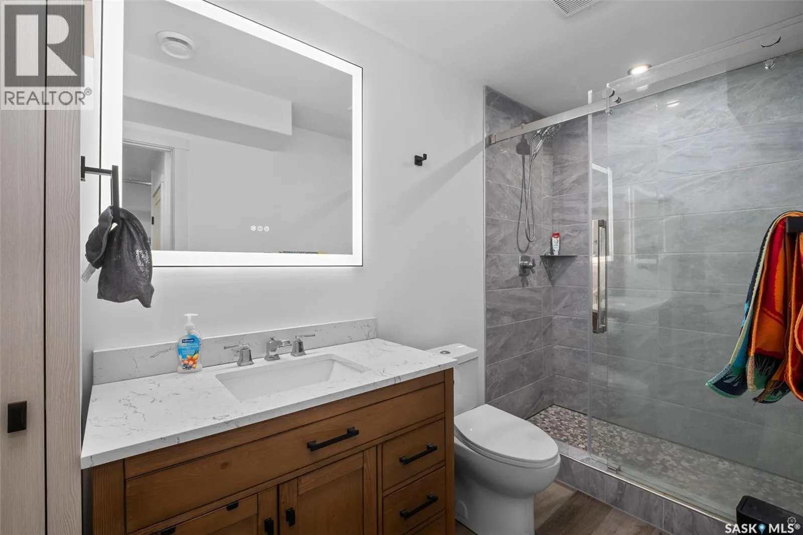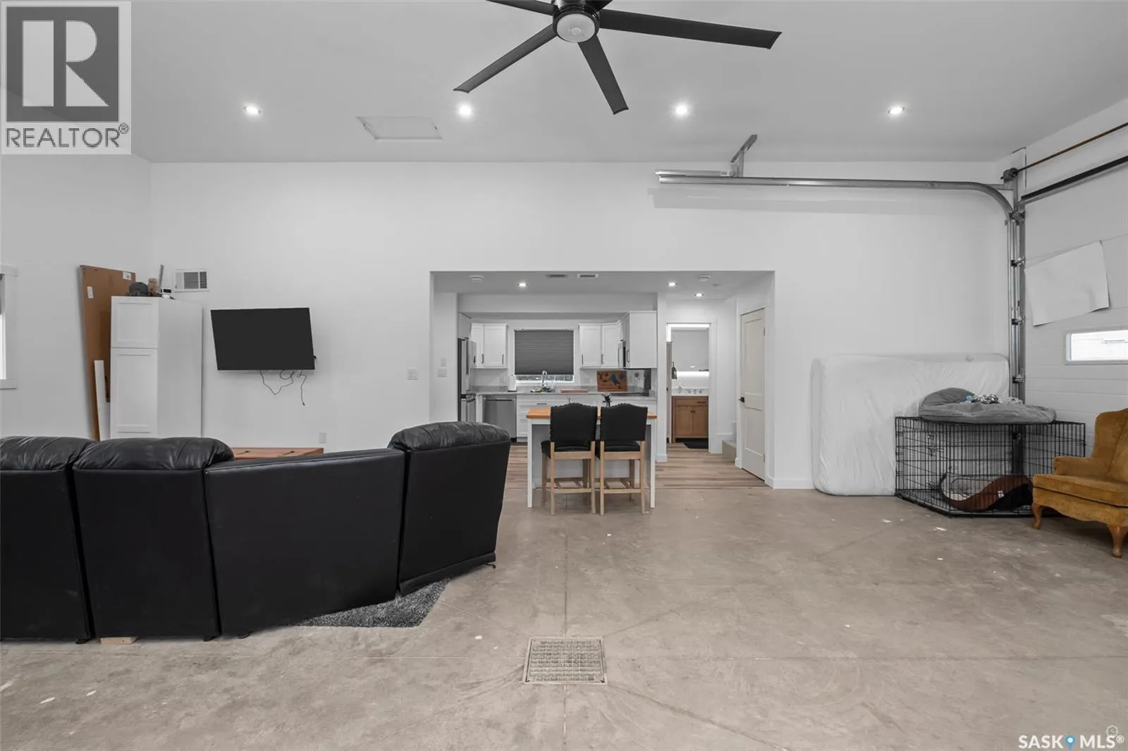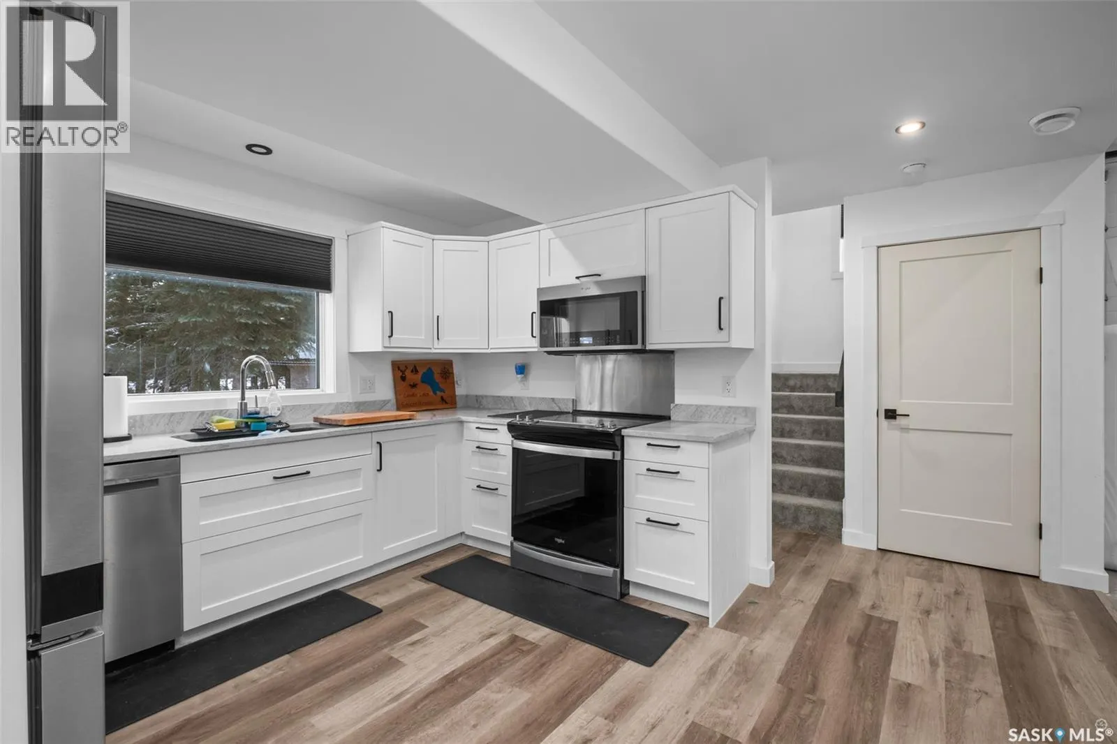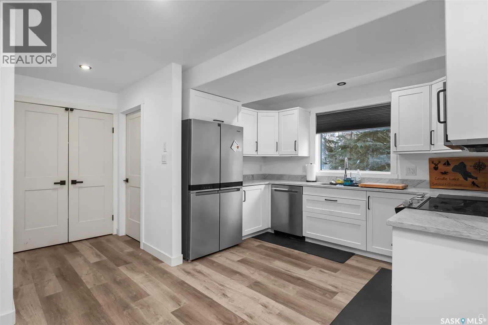 Enjoy lake life in this modern 2023 built retreat set on a private beautifully treed 1 acre lot in the popular Island View subdivision at Candle Lake. Whether you are settling in full time or escaping to the lake this 1,492 sqft home offers the space and flexibility to fit your lifestyle. The main living area is anchored by a huge open concept space and highlighted by a large garage door that opens directly to the outdoors, creating seamless indoor-outdoor living during the summer months. This versatile area offers endless possibilities and can be finished to suit your needs whether that means adding additional bedrooms, creating a spacious living room or designing the ultimate entertainment space. The layout flows naturally into a modern kitchen that features bright white cabinetry, stainless steel appliances and a large window above the sink that frames peaceful views of the surrounding trees. Just off the kitchen is a convenient laundry area and a stylish 3 piece bathroom that features a walk-in shower with a sleek tile surround and glass door. The upper level offers a spacious primary bedroom with a walk-in closet and a generously sized second bedroom. The home is built on a 5 inch concrete slab and includes a 1,400 gallon septic tank and a 500 gallon holding tank. It is pre-plumbed for in-floor heat, wired for Starlink and equipped with central air conditioning. With drilling still required, the property is prepared for a future well offering the chance to establish a reliable water source and there is ample space to build a garage or additional outbuildings. Enjoy a private serene setting surrounded by mature trees and shrubs complete with a dedicated firepit area for relaxing evenings. Located in one of Saskatchewanâs most sought after lake communities this property offers flexibility, space and modern construction. Book your showing today and start enjoying the Candle Lake lifestyle! (id:27476)