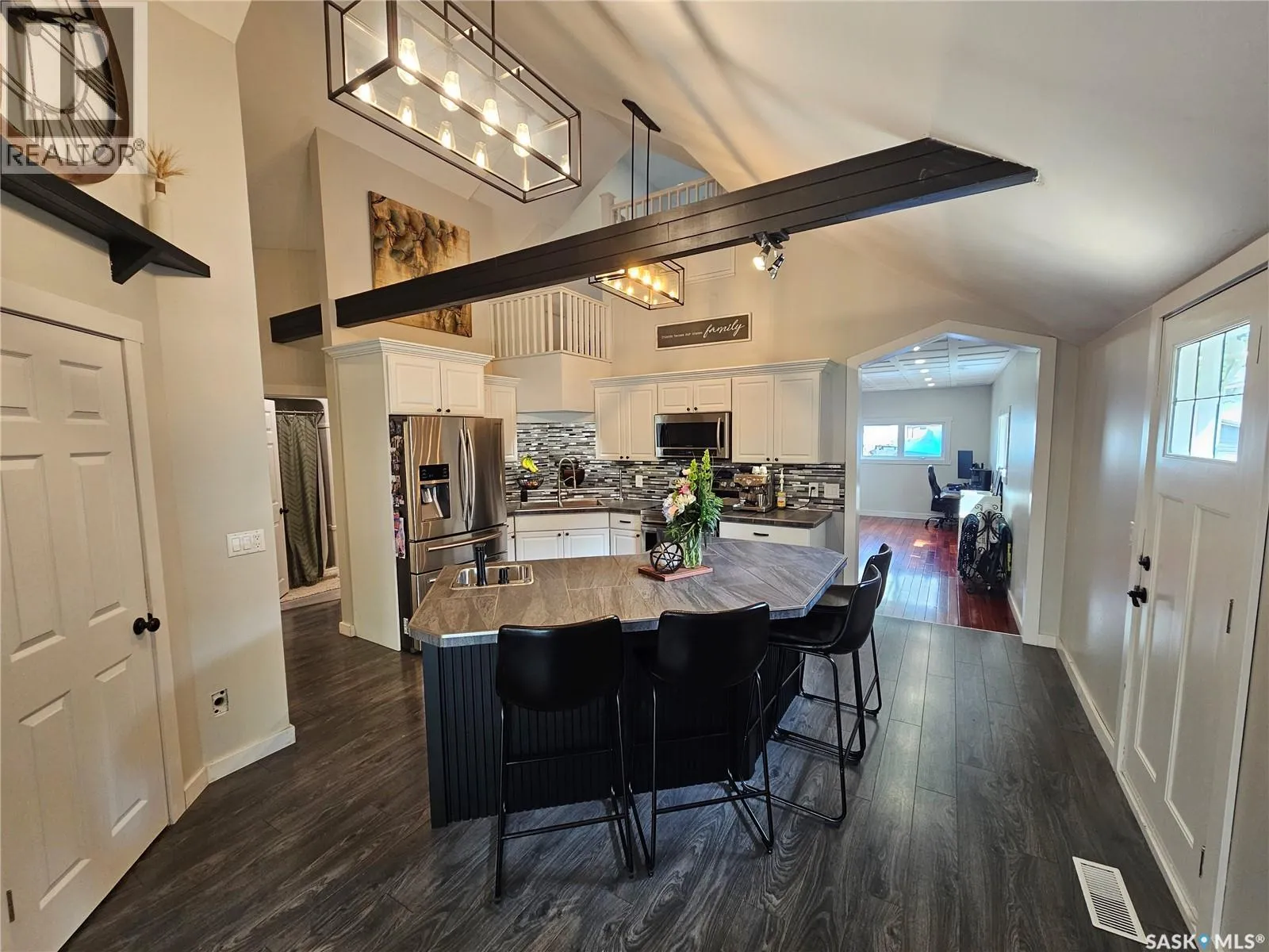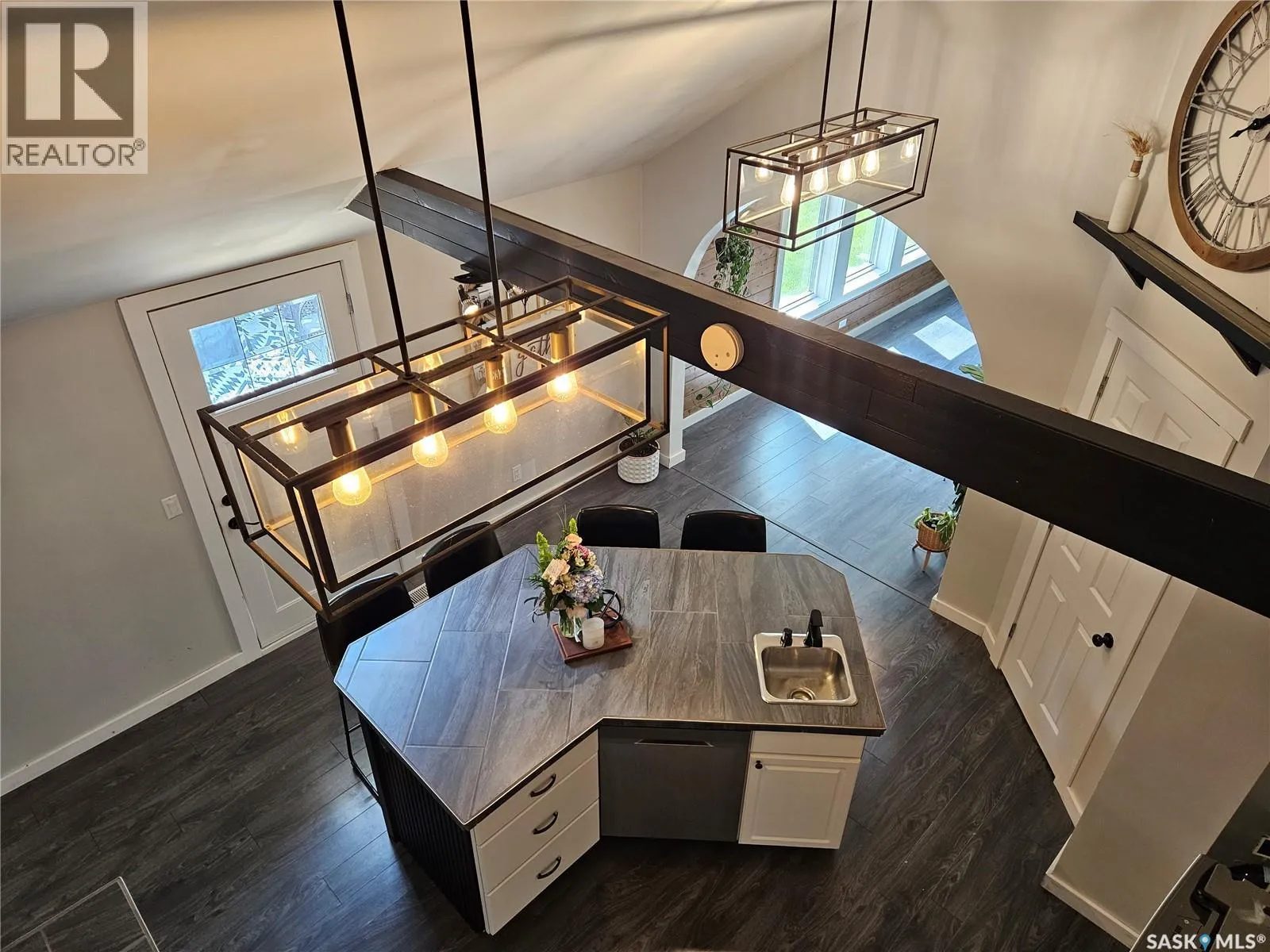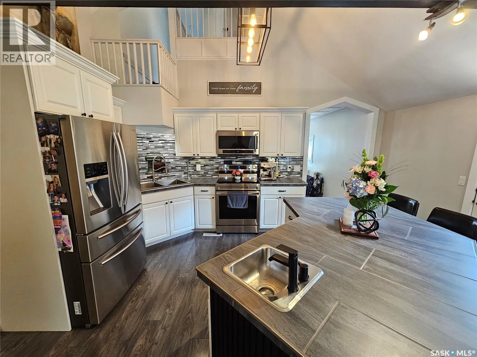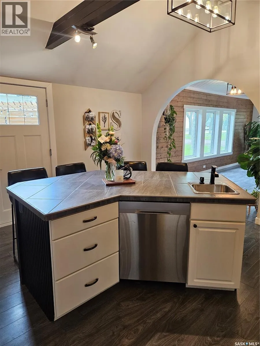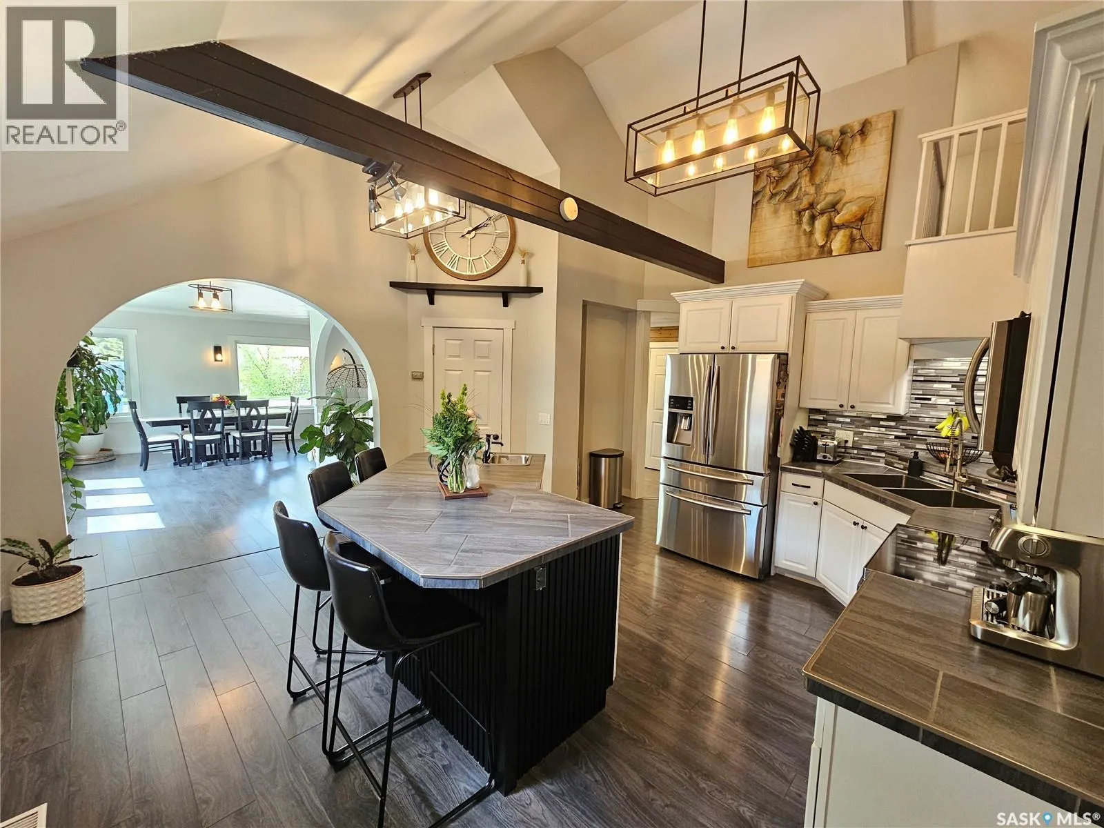Beautiful Two-Story Home in Carlyle â Stylish, Spacious, and Move-In Ready - Welcome to this stunning 2,112 sq ft two-story home located in the heart of Carlyle. Thoughtfully updated and impeccably maintained, this property offers both charm and functionality, perfect for families or those who love to entertain. As you step inside, you're greeted by a spacious foyer with ample closet space and room to comfortably store boots and outerwear. From here, beautifully crafted archway-style entry wallsâadding architectural flair and characterâlead you seamlessly into the dining and kitchen areas. The dining room is generous in size and features a cozy side nookâideal for reading, relaxing, or extra seating when guests are over. The kitchen is nothing short of spectacular, boasting a vaulted ceiling accented with a striking wood beam, a walk-in pantry, stainless steel appliances, tile countertops, stylish backsplash, and a large island with seatingâperfect for casual meals or entertaining. The living room is absolutely massive and serves as the heart of the home, anchored by a gorgeous fireplace designed to house your TV and serve as a stunning focal point. There's plenty of room for all your favorite furniture and easy access to the backyard. A convenient 3-piece bathroom completes the main level. Upstairs, you'll find three comfortable bedrooms, including the spacious primary bedroom that connects to a walk-through bathroomâalso accessible from the hallway. Itâs perfect for both privacy and practicality. The basement is unfinished, providing tons of storage space and potential to develop into additional living space. Recent Updates Include: Vinyl siding & new construction Kohler windows (2019), Fully renovated kitchen with new appliances (2019), New flooring throughout (excluding living room) (2019), Water heater (2021), Main level bathroom renovation (2023), Deck and pergola addition (2024), Upstairs bathroom (2025). Call your realtor today to schedule a viewing! (id:27476)