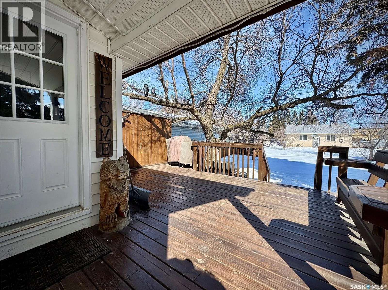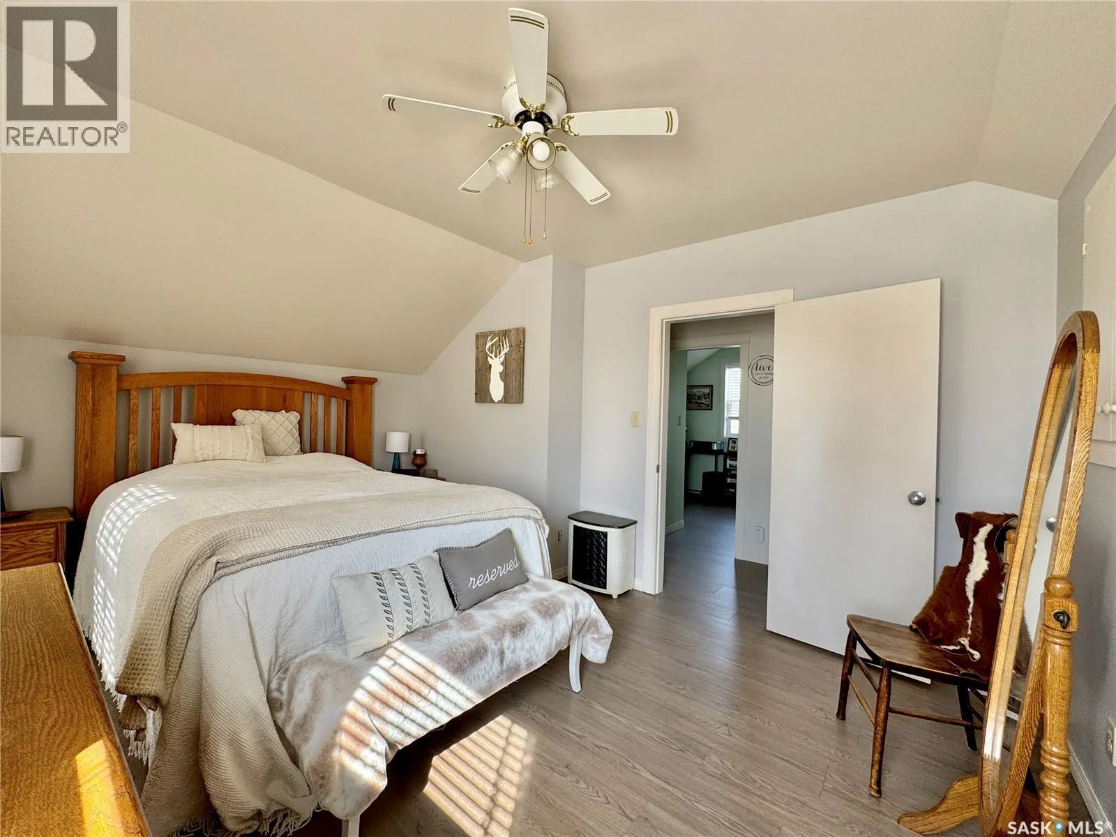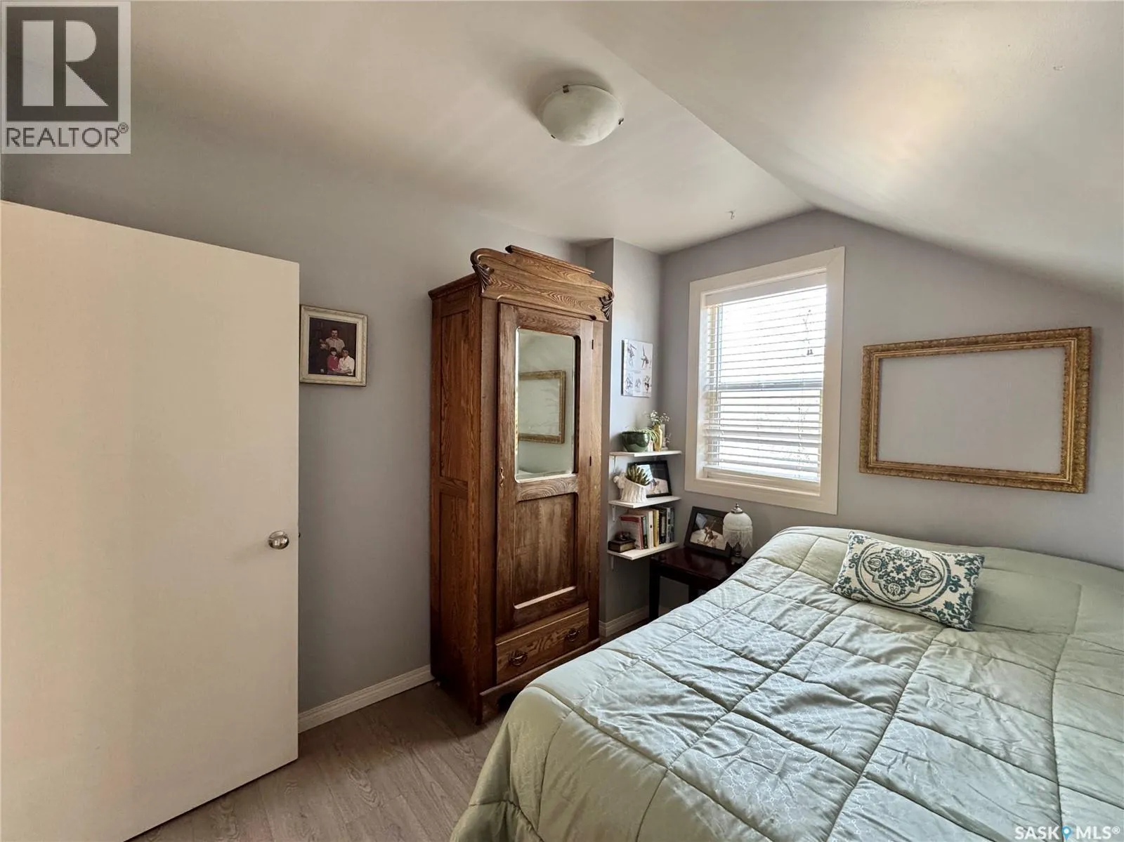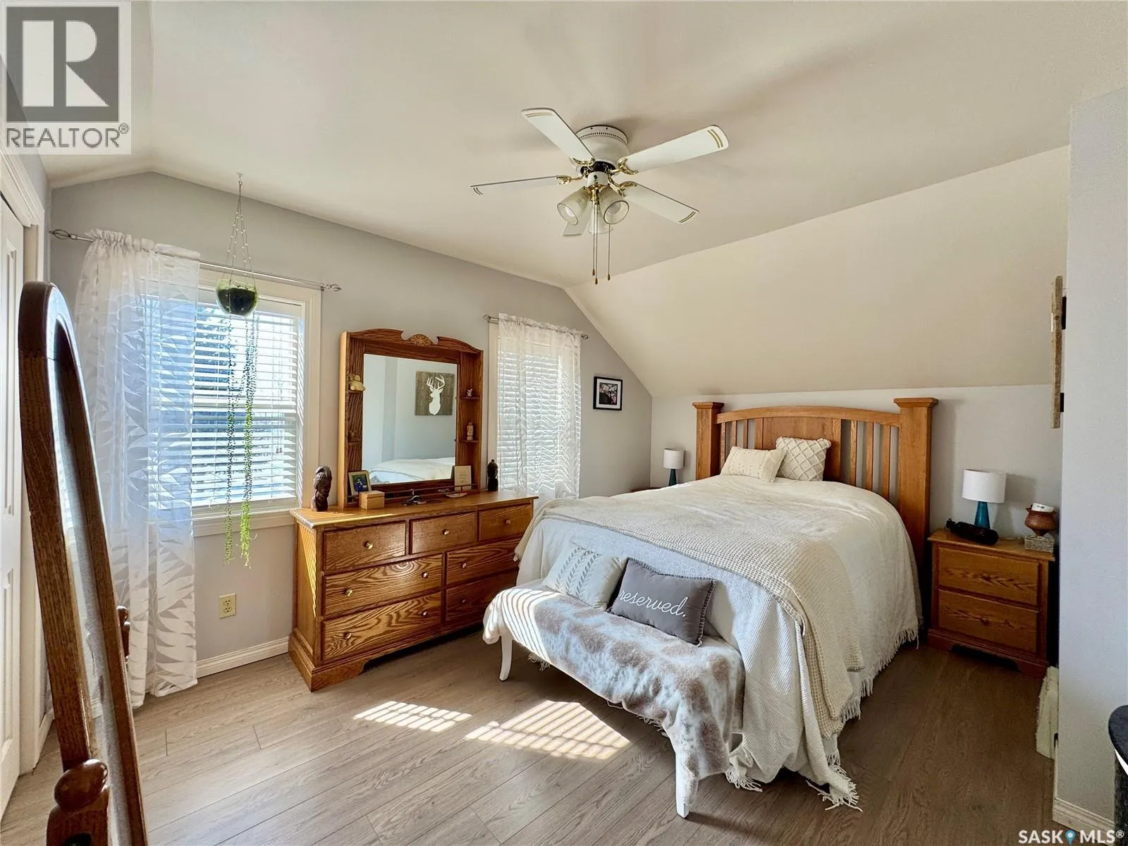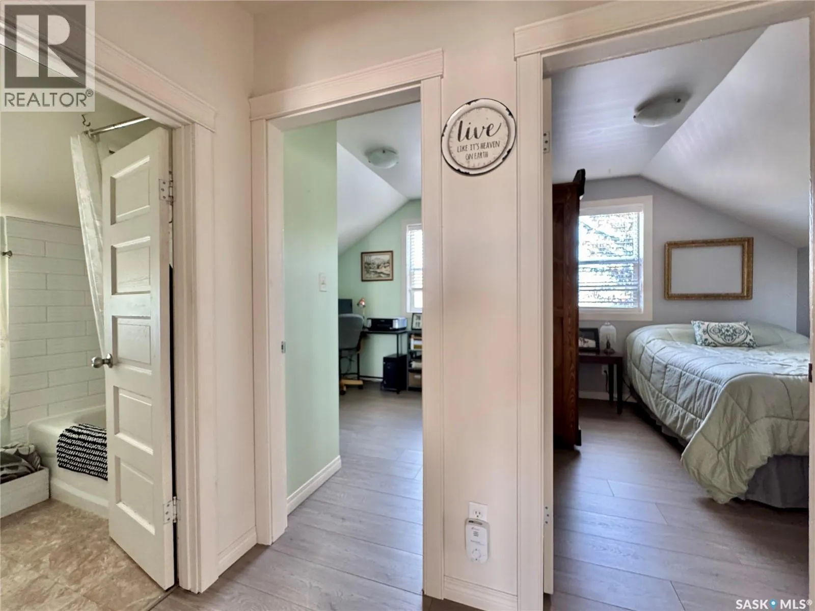 If youâve been searching for a true character property in Churchbridge, this two-story heritage house offers the best of both worlds. The main level welcomes you with nine-foot ceilings, gleaming hardwood floors, and updated trim that complements the homeâs heritage style. The eat-in kitchen is updated and includes a dishwasher, while the main floor laundry and two-piece bath add everyday convenience. A sizable rear entry opens onto a partially covered wooden deck, perfect for relaxing outside. Upstairs, youâll find three bedrooms totalâincluding the masterâall with new laminate flooring and a four-piece bathroom. The master bedroom offers a respectable closet. Most windows have been updated, so natural light fills the home. Downstairs, the finished basement serves as a storage zone and houses a high-efficient furnace (updated in 2012) and an on-demand water heater installed in 2024. Outside, thereâs a detached single-car garage with extra tool storage, plus a âcatioâ off the basement for your feline friends. This home is within walking distance to the elementary school and downtown amenities, making it convenient for everyday life. With its heritage charm, modern updates, and thoughtful details, this Churchbridge gem is ready to welcome its next owners. (id:27476)