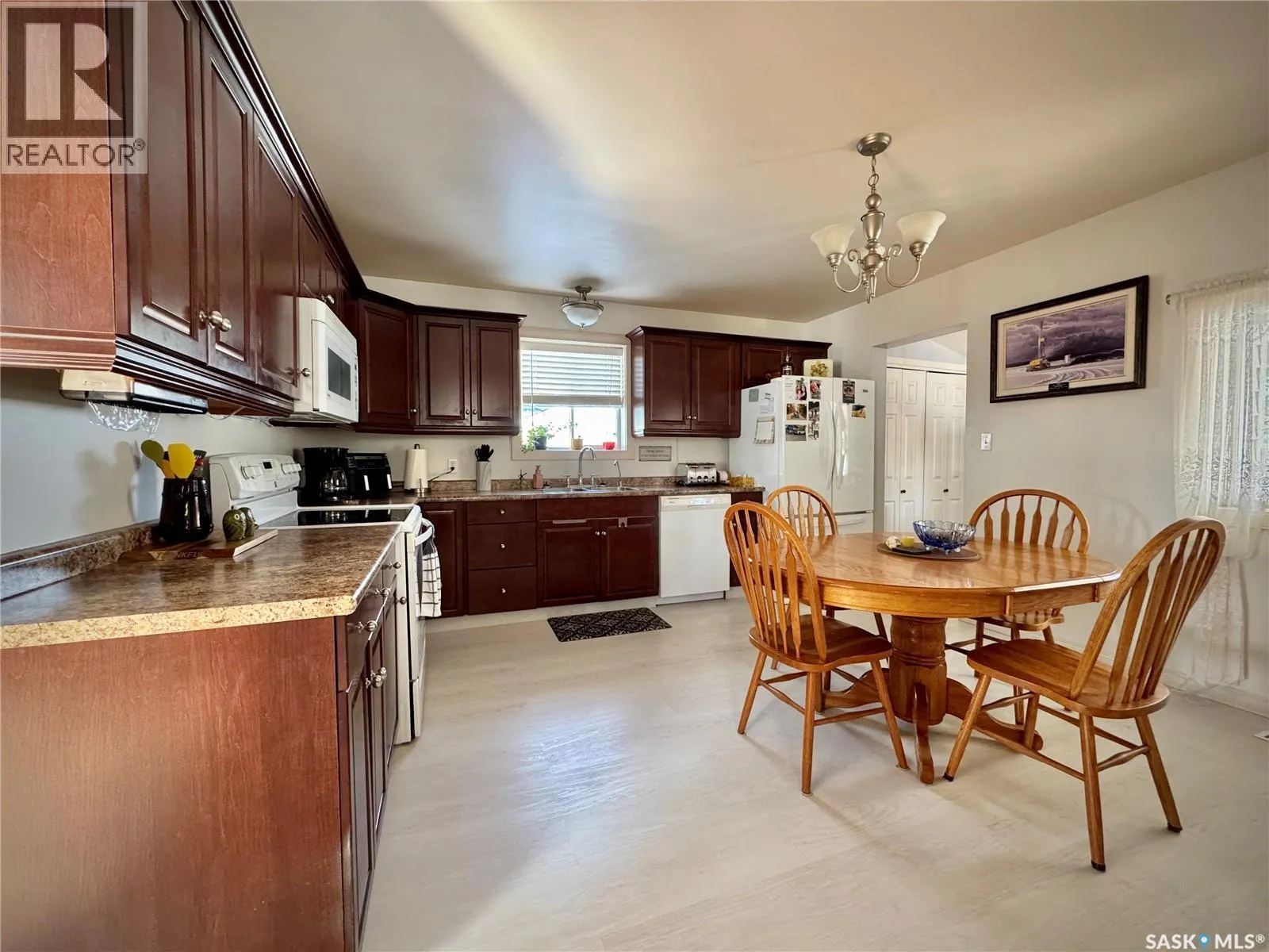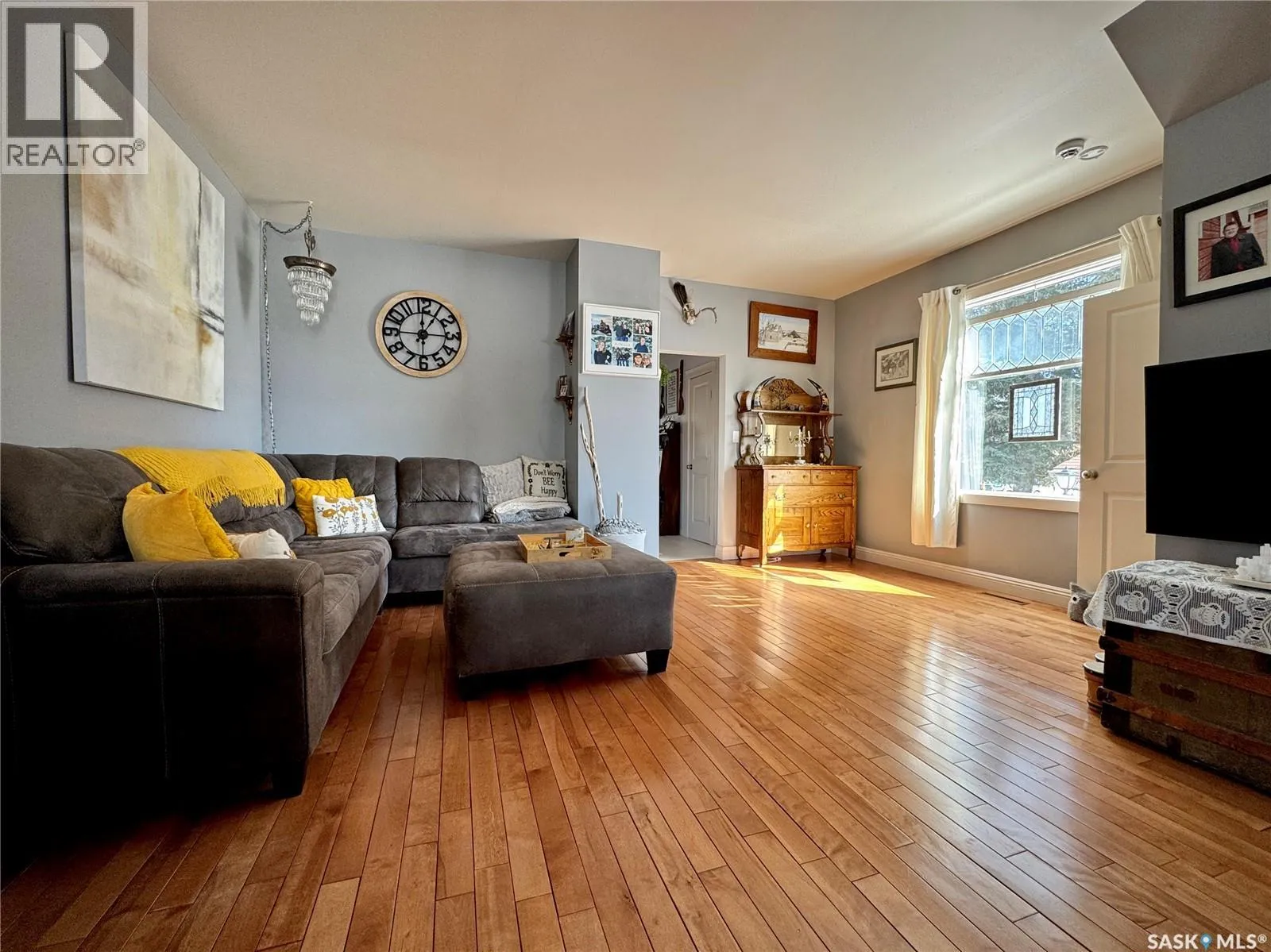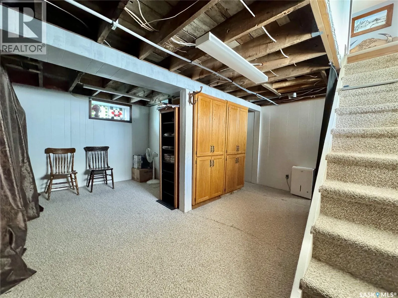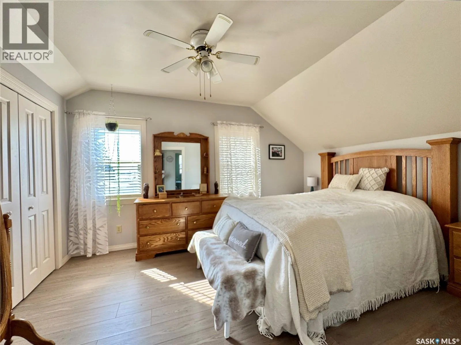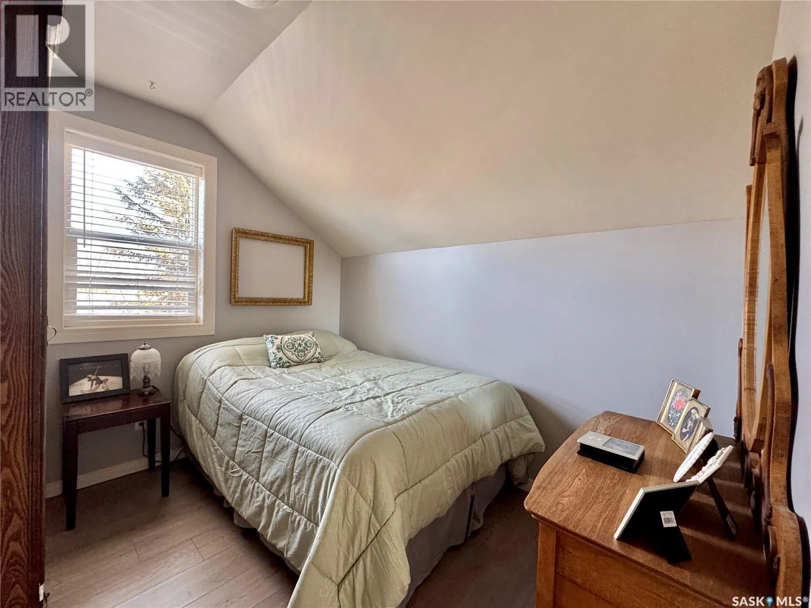 If youâve been searching for a true character property in Churchbridge, this two-story heritage house offers the best of both worlds. The main level welcomes you with nine-foot ceilings, gleaming hardwood floors, and updated trim that complements the homeâs heritage style. The eat-in kitchen is updated and includes a dishwasher, while the main floor laundry and two-piece bath add everyday convenience. A sizable rear entry opens onto a partially covered wooden deck, perfect for relaxing outside. Upstairs, youâll find three bedrooms totalâincluding the masterâall with new laminate flooring and a four-piece bathroom. The master bedroom offers a respectable closet. Most windows have been updated, so natural light fills the home. Downstairs, the finished basement serves as a storage zone and houses a high-efficient furnace (updated in 2012) and an on-demand water heater installed in 2024. Outside, thereâs a detached single-car garage with extra tool storage, plus a âcatioâ off the basement for your feline friends. This home is within walking distance to the elementary school and downtown amenities, making it convenient for everyday life. With its heritage charm, modern updates, and thoughtful details, this Churchbridge gem is ready to welcome its next owners. (id:27476)