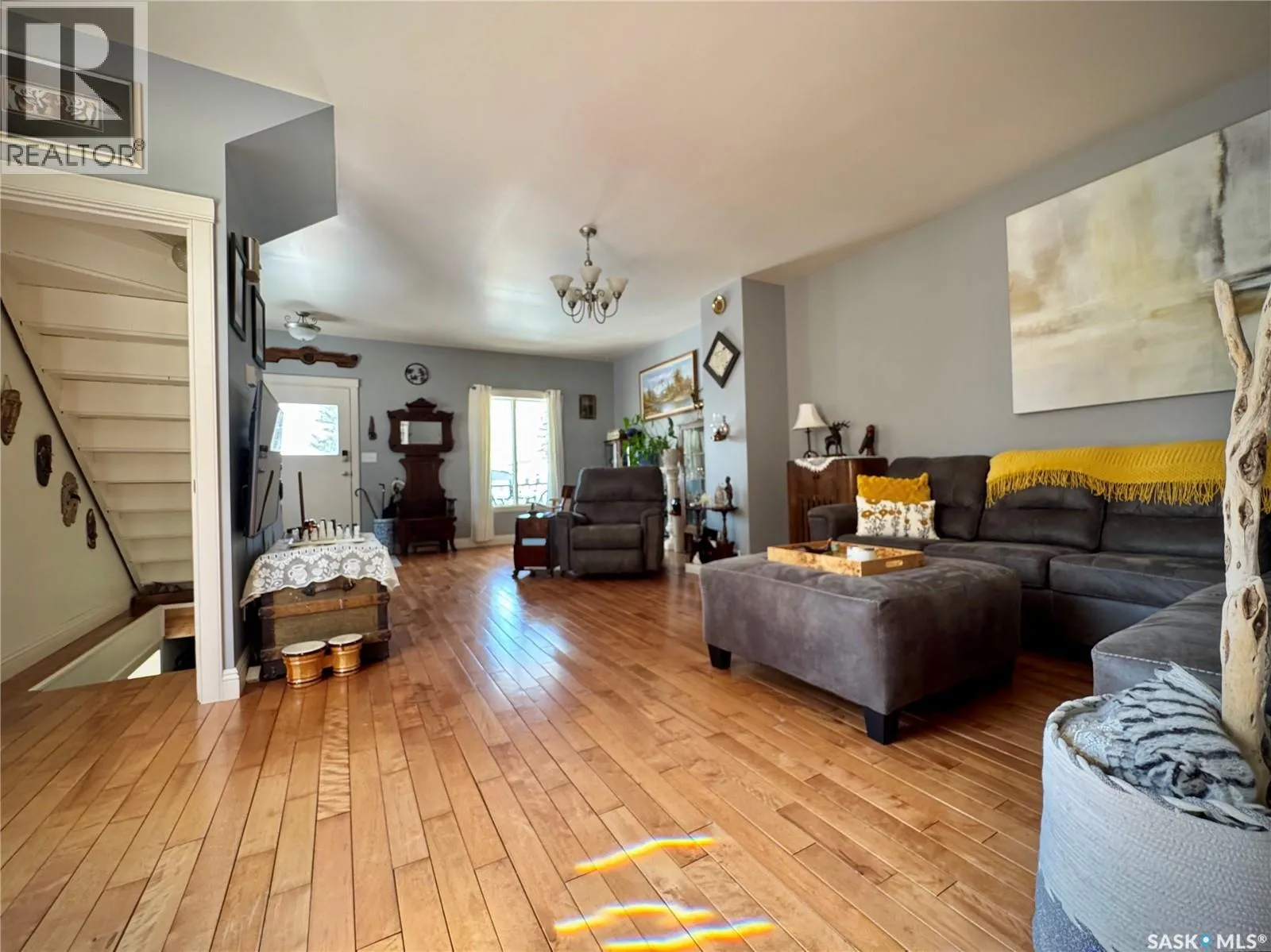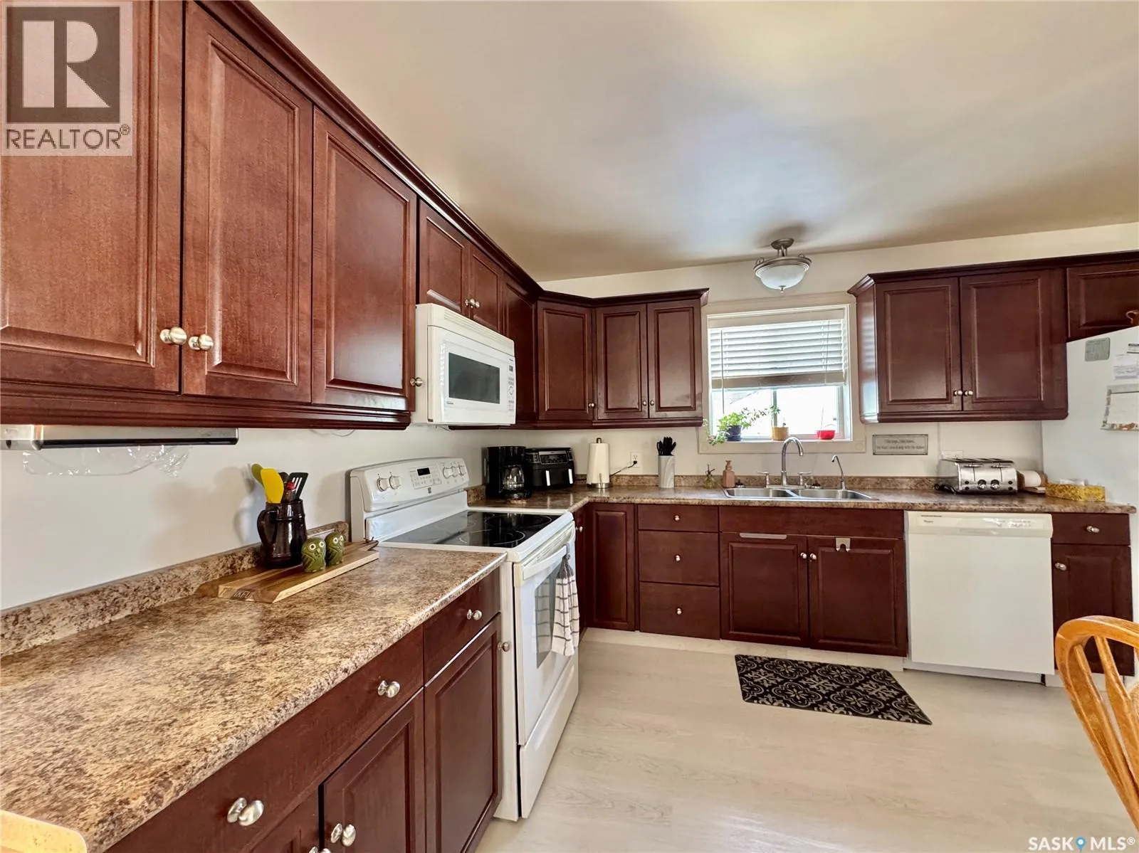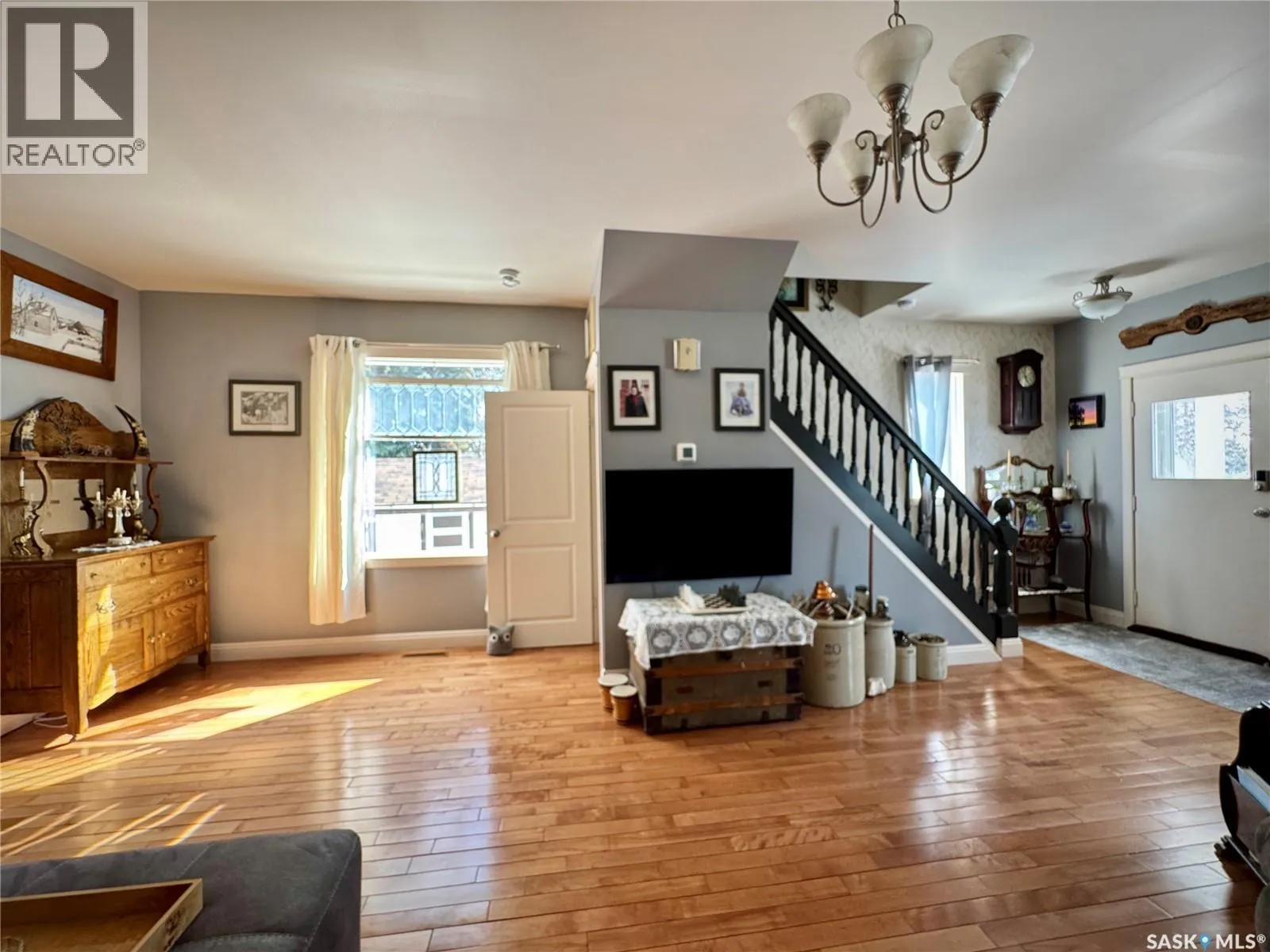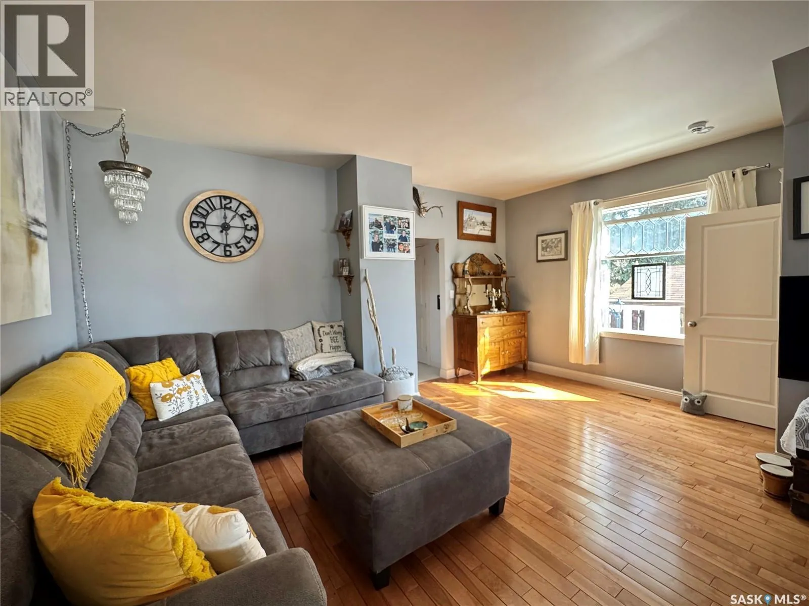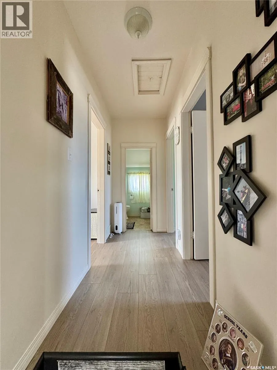 If youâve been searching for a true character property in Churchbridge, this two-story heritage house offers the best of both worlds. The main level welcomes you with nine-foot ceilings, gleaming hardwood floors, and updated trim that complements the homeâs heritage style. The eat-in kitchen is updated and includes a dishwasher, while the main floor laundry and two-piece bath add everyday convenience. A sizable rear entry opens onto a partially covered wooden deck, perfect for relaxing outside. Upstairs, youâll find three bedrooms totalâincluding the masterâall with new laminate flooring and a four-piece bathroom. The master bedroom offers a respectable closet. Most windows have been updated, so natural light fills the home. Downstairs, the finished basement serves as a storage zone and houses a high-efficient furnace (updated in 2012) and an on-demand water heater installed in 2024. Outside, thereâs a detached single-car garage with extra tool storage, plus a âcatioâ off the basement for your feline friends. This home is within walking distance to the elementary school and downtown amenities, making it convenient for everyday life. With its heritage charm, modern updates, and thoughtful details, this Churchbridge gem is ready to welcome its next owners. (id:27476)
