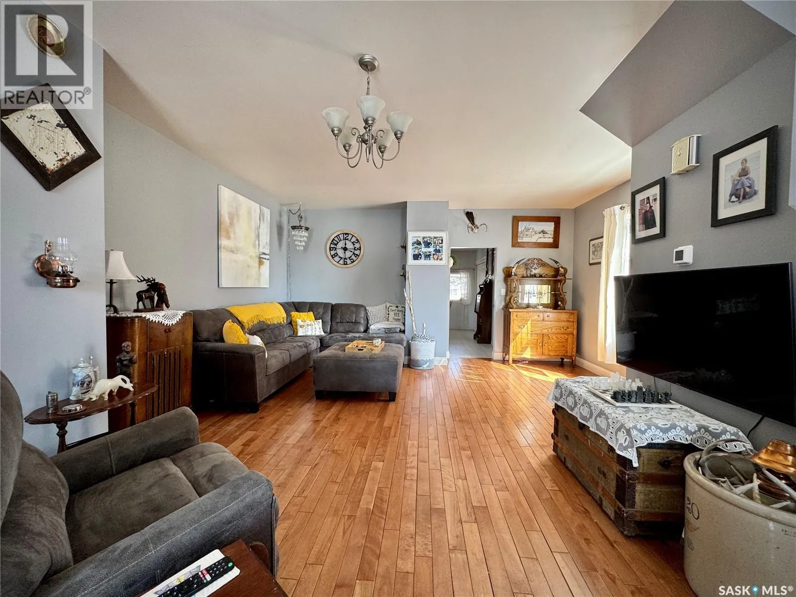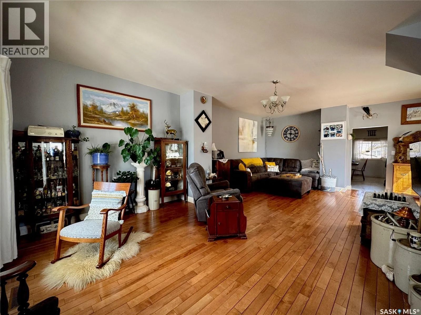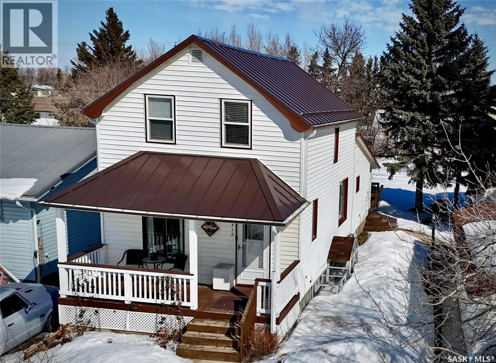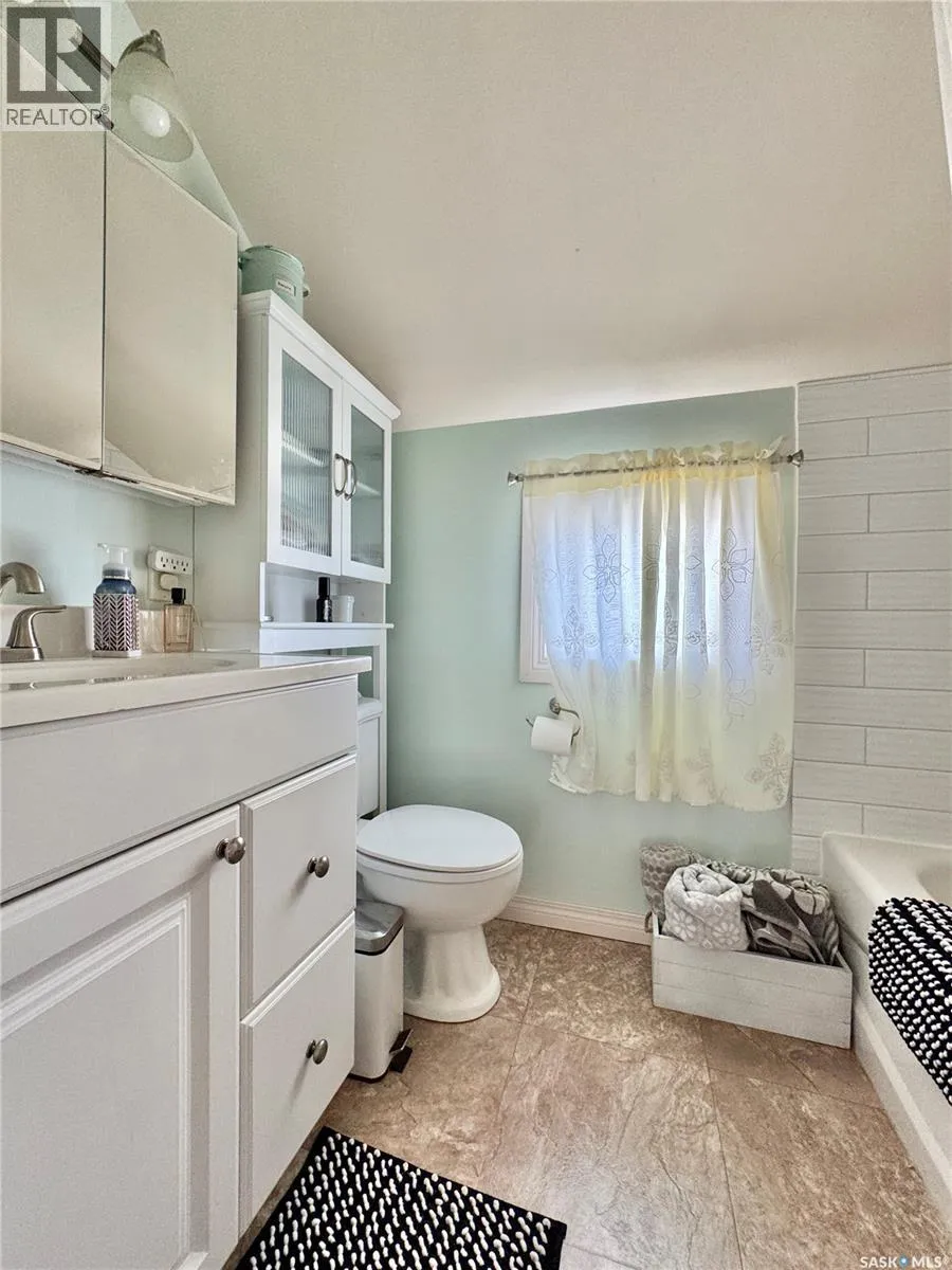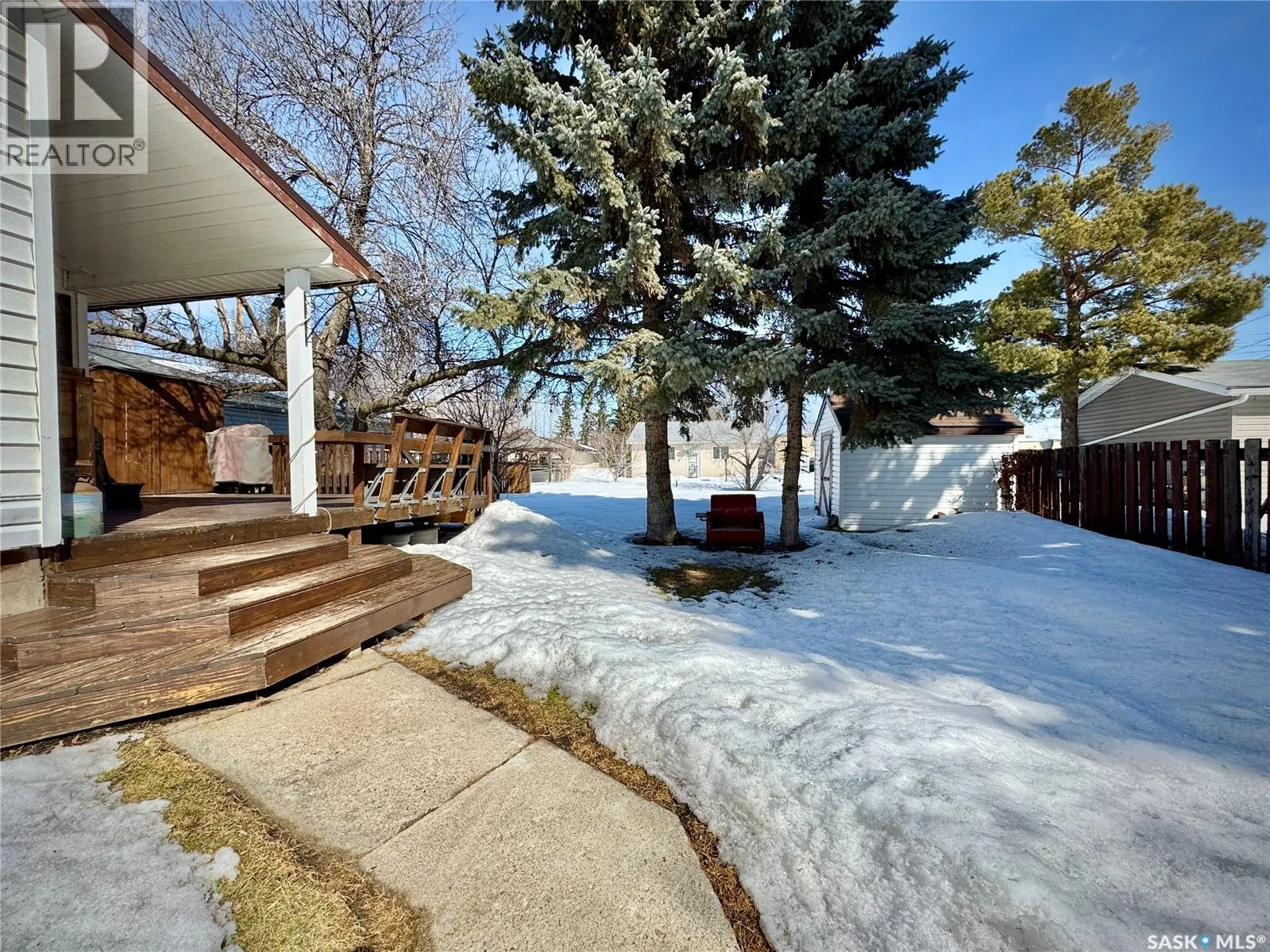 If youâve been searching for a true character property in Churchbridge, this two-story heritage house offers the best of both worlds. The main level welcomes you with nine-foot ceilings, gleaming hardwood floors, and updated trim that complements the homeâs heritage style. The eat-in kitchen is updated and includes a dishwasher, while the main floor laundry and two-piece bath add everyday convenience. A sizable rear entry opens onto a partially covered wooden deck, perfect for relaxing outside. Upstairs, youâll find three bedrooms totalâincluding the masterâall with new laminate flooring and a four-piece bathroom. The master bedroom offers a respectable closet. Most windows have been updated, so natural light fills the home. Downstairs, the finished basement serves as a storage zone and houses a high-efficient furnace (updated in 2012) and an on-demand water heater installed in 2024. Outside, thereâs a detached single-car garage with extra tool storage, plus a âcatioâ off the basement for your feline friends. This home is within walking distance to the elementary school and downtown amenities, making it convenient for everyday life. With its heritage charm, modern updates, and thoughtful details, this Churchbridge gem is ready to welcome its next owners. (id:27476)