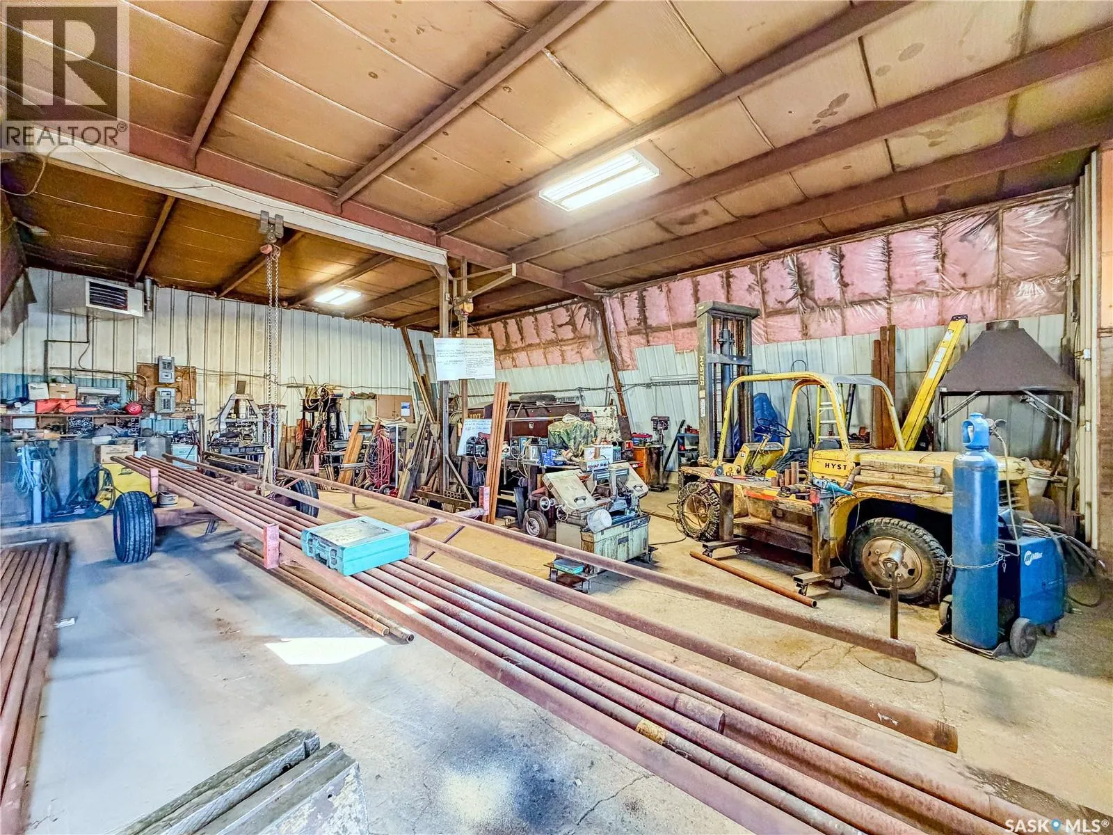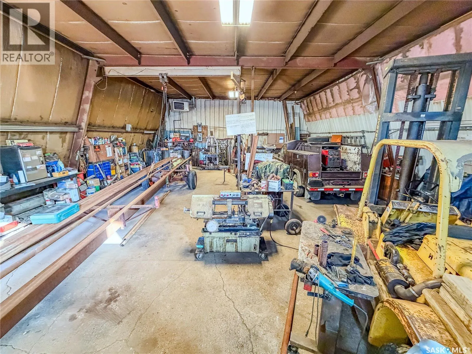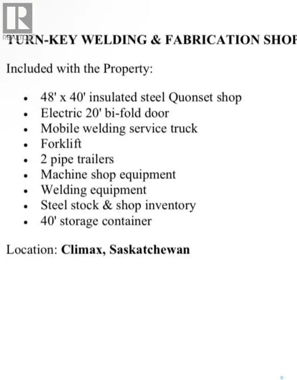 TURN-KEY WELDING & FABRICATION SHOP - EQUIPMENT & MOBILE SERVICE INCLUDED; Opportunity to own fully equipped welding + fabrication shop in the quiet agricultural community of Climax in southwest Saskatchewan. This shop has long supported local farms + agricultural businesses and is well positioned for new owner to continue serving the area. Potential to pursue additional work in nearby oilfield + industrial sectors depending on operatorâs services + connections. Major asset of the business is the mobile welding service unit, featuring rebuilt 1981 Chevrolet 1-ton service truck equipped with portable welder, compressor, torch setup, enclosed service body + built-in tool cabinets. This allows operator to provide on-site repairs + field service thru the surrounding farming region. The shop is a 1976 48'x40' steel Quonset building, offering framed + insulated structure with concrete floor, overhead heat + partial interior tin finishing for durability + easy maintenance. Access is provided thru a 20'x13'8" electric bi-fold door for machinery + equipment, along with a separate man door for convenient entry. A 40' C-Can storage container located beside shop provides additional secure storage. The sale includes a broad selection of welding, fabrication + machine shop equipment supporting services such as agricultural repair, custom fabrication, machining, auger rebuilding + general welding work. The equipment + included inventory create a fully outfitted working shop allowing a new owner to step right into operations without the time + cost of building a fabrication shop from the ground up. Also included are a forklift, two pipe trailers + large inventory of welding consumables + materials including steel stock, auger flighting, fasteners, rods, wire + related shop supplies. Excellent opportunity for welder, fabricator, or contractor looking to operate their own shop in rural Sask with equipment + infrastructure already in place. Full equipment list are in MLS Supplements. (id:27476)