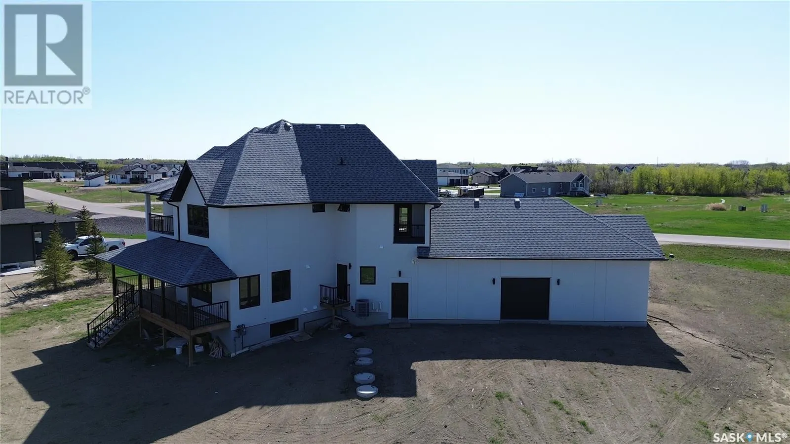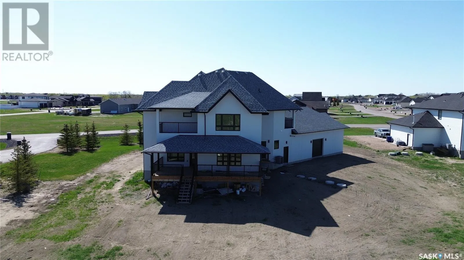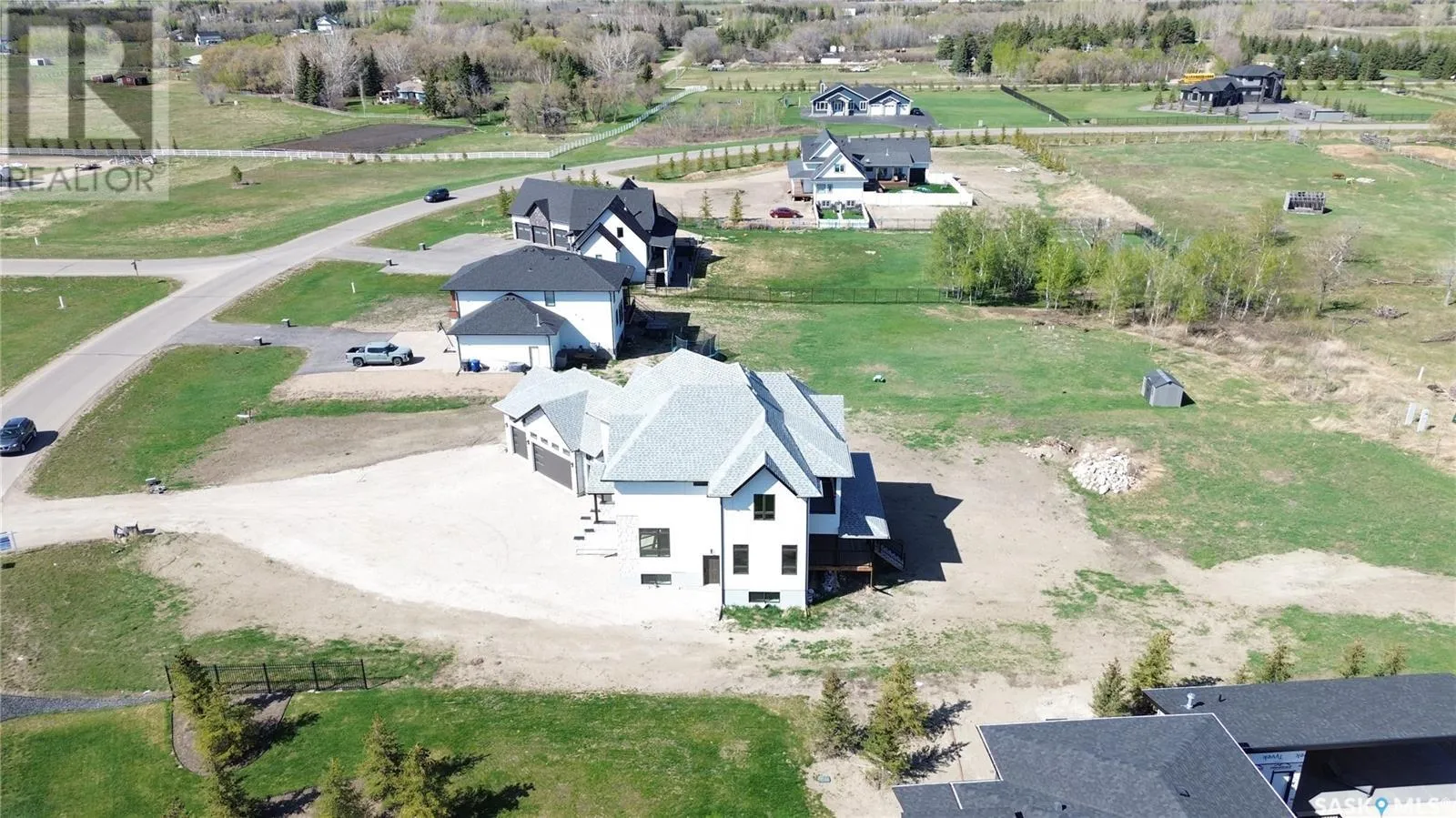 Welcome to this magnificently large and luxurious home in Edgemont Park Estates, one of the Saskatoon area's most exclusive and desirable acreage communities only a few minutes south of the city. Exquisite executive features abound inside and out with 2,837 square feet of living space above grade, an attached 4-car heated garage, plus a completely finished basement. With five bedrooms and six bathrooms, it's the perfect fit for a large family, boasting ample capacity for multigenerational, extended family, or those who enjoy hosting and entertaining guests. The main floor has an impressive living room with a soaring second-floor ceiling and an open-concept kitchen, dining area, and family room. The chef-worthy primary kitchen has custom cabinets with ceiling-high upper cabinets and high-end appliances, and is complemented by a second kitchen for food prep and spicy cooking. The upper level includes three generously sized bedrooms, three ensuite bathrooms, and two balconies for outdoor relaxation. The lower level offers a family room theatre, bar area, and two more bedrooms and full bathrooms. Upgrades include gorgeous engineered hardwood and tile floors, intricate finishing details, central air conditioning, an insulated exterior acrylic stucco system, 10 foot main floor walls, 9 foot 2nd floor and basement walls, and much more. Other wonderful features include main floor laundry, a massive covered deck, and a rear-facing overhead door. Ready for immediate possession, call now for more information or your own private preview. (id:27476)