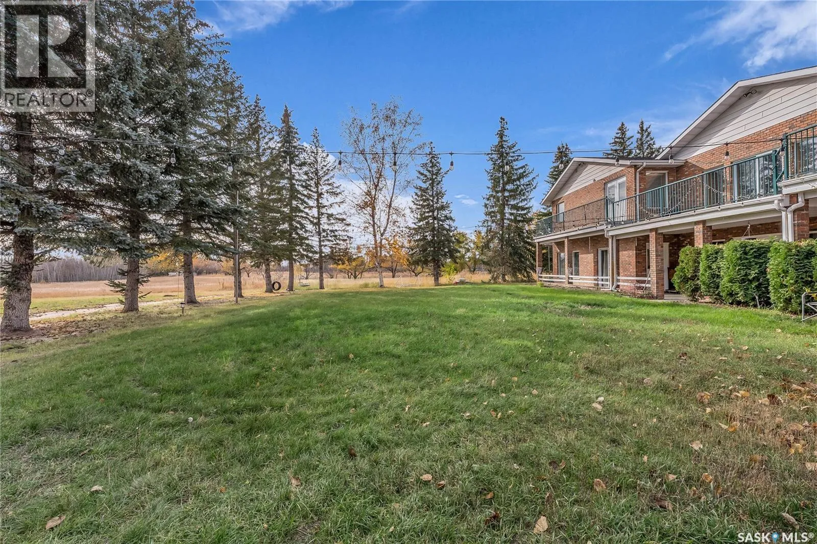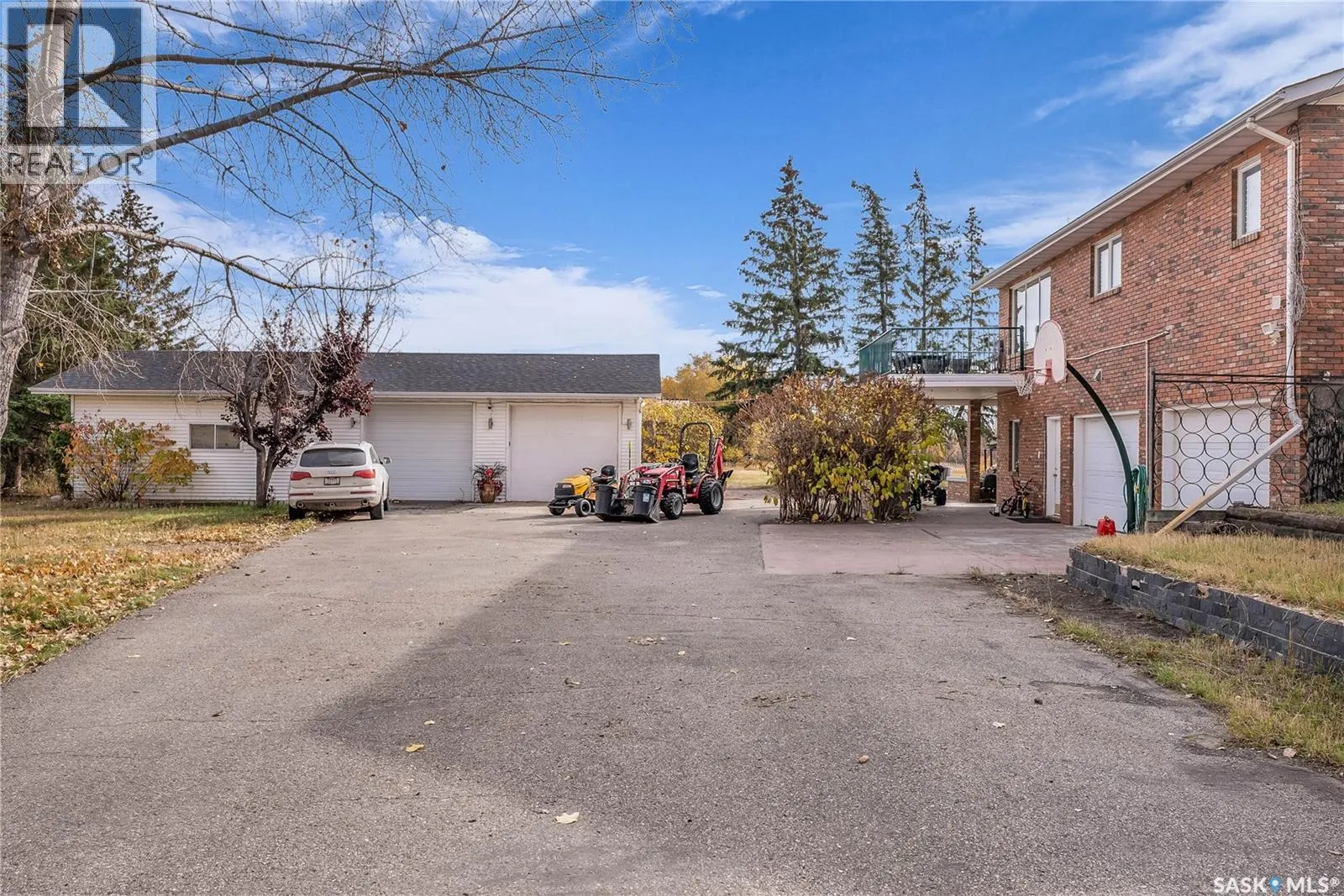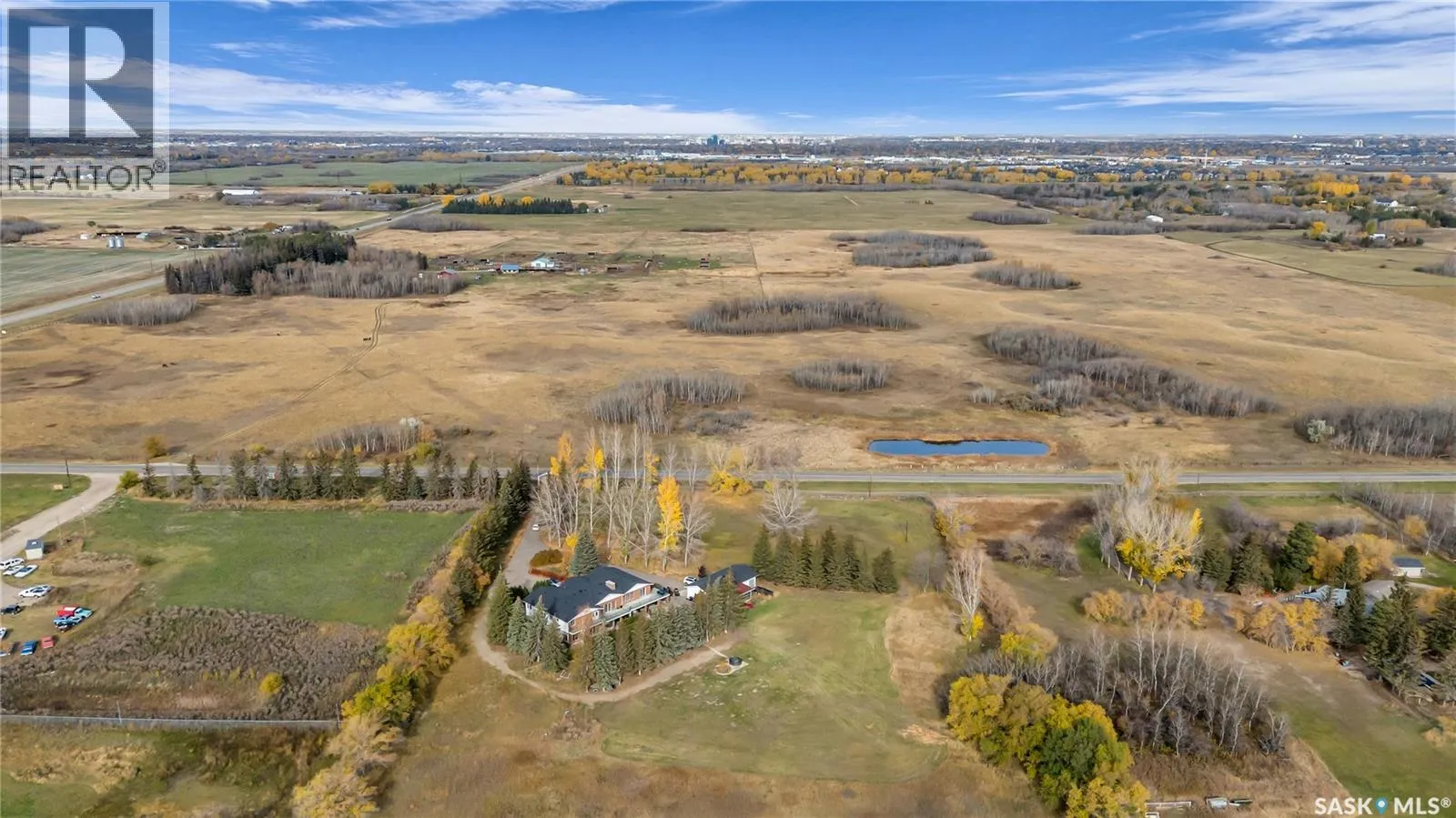 This remarkable estate combines luxurious residential living with expansive potential, offering a total of 9.06 acres. The property includes a 4.6-acre developed residential area with mature landscaping and a 3,447-square-foot walk-out bungalow (excluding the lower level) featuring five bedrooms and five bathrooms. With an open floor plan and formal spaces such as a 16' x 13.9' dining room, a 17' x 22' living room, and a gracious foyer, this home is designed for both comfort and elegance. Additional highlights include two wood-burning fireplaces, a spacious kitchen with an eating area, balconies, covered patio spaces, a double attached garage, a double detached garage, and a greenhouse. The remaining land is a natural lot, adding privacy and beautiful green space surrounding the residence. Additionally, this property offers potential for a zoning shift to commercial use, supported by nearby properties that have successfully made this transition. For those interested in expansion, an additional 5-acre parcel adjacent to the west side of the backyard is available for potential acquisition. This unique 9.06-acre estate, minutes from Saskatoon, offers an ideal blend of private, luxurious living with flexible zoning possibilities. (id:27476)