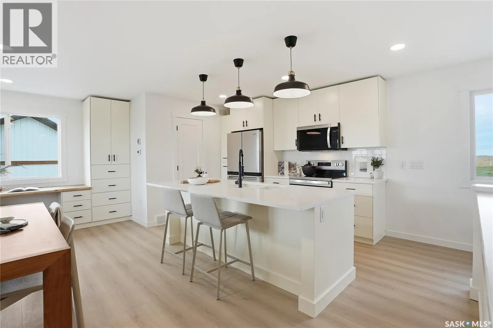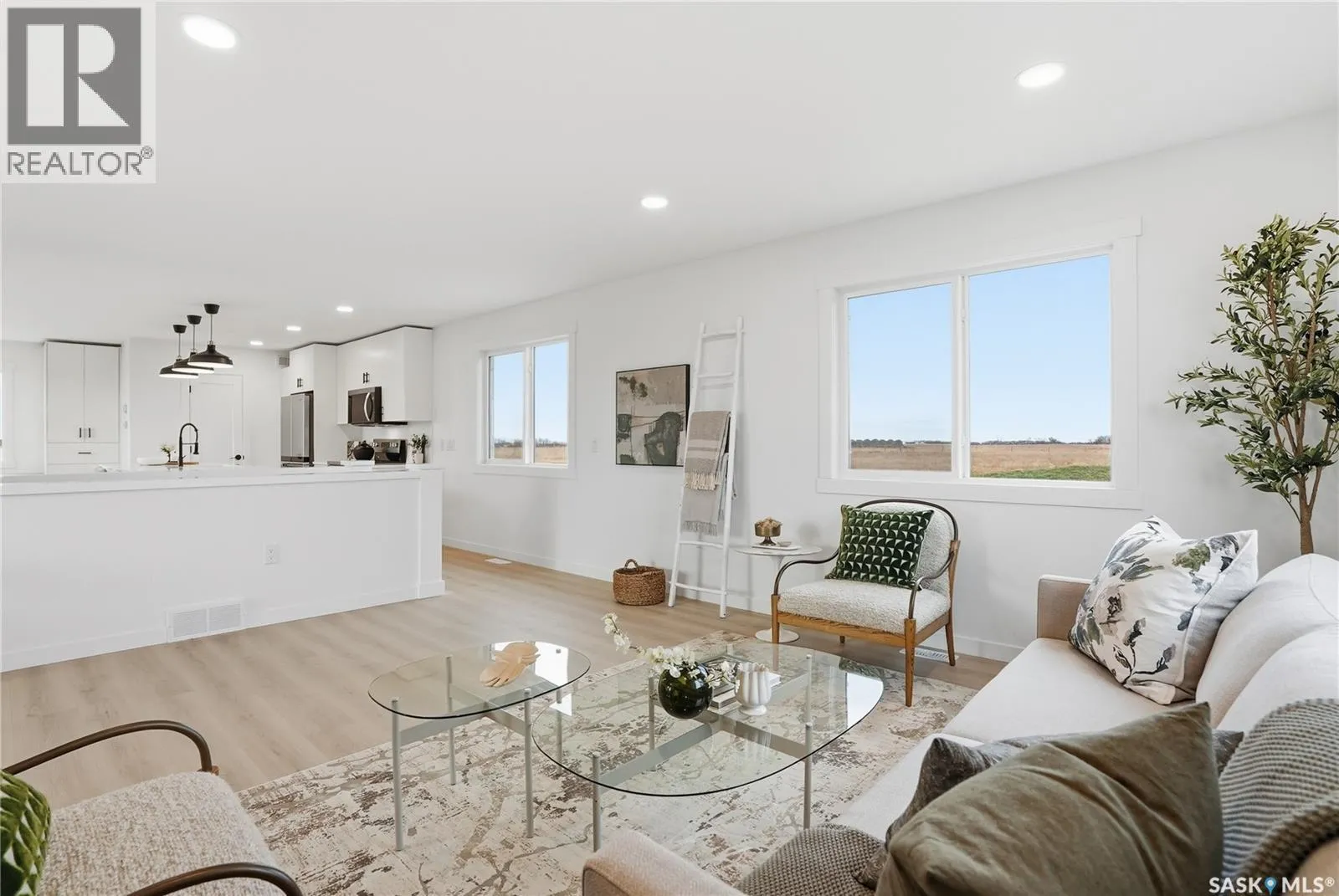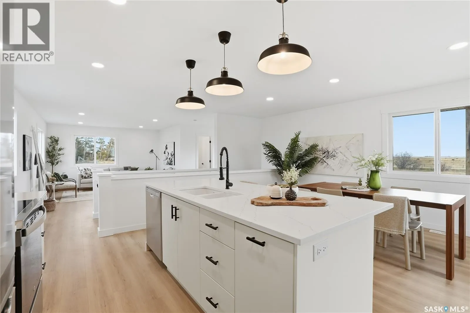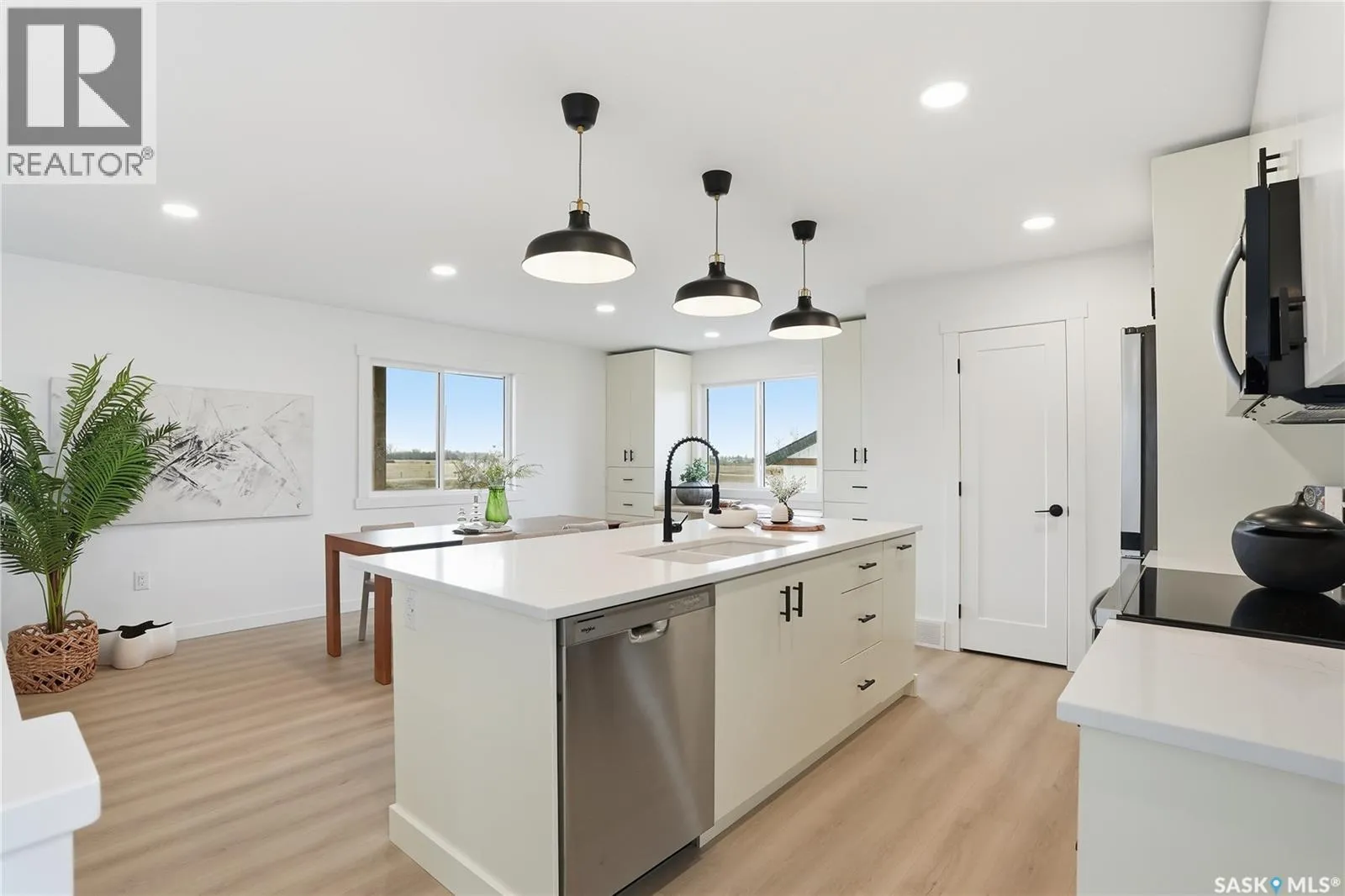 What an Opportunity! Just minutes west of Saskatoonâenjoy peaceful acreage living with city convenience! This newly constructed property sits on 3 acres and offers just over 1,700 sq. ft. of developed space (856 sq. ft. on the main level), featuring 4 beds, two baths, a fully developed basement, and an impressive heated triple detached garage (36â wide with a double overhead door). The home welcomes you home with a charming covered front porch and a functional large foyer complete with a built-in bench and a separate boot room area with floor-to-ceiling wardrobes. The open-concept main floor connects a spacious living room, dining area, and kitchen. The kitchen is a standout, showcasing an abundance of custom lacquer cabinetry, full-height pantry storage, quartz countertops, stainless steel appliances including a microwave hood fan, subway tile backsplash, and an oversized island ideal for large gatherings. The adjacent dining room easily accommodates a large table for the entire family! A convenient two-piece bath completes the main level. An open staircase leads to the bright lower level, which offers four bedrooms (one smallerâideal as a nursery, office, or den), a spacious family-style 4-piece bathroom, and a large walk-in closet in the primary bedroom. Outside, the detached 36â heated and insulated garage is a dream setupâcomplete with a workshop area and a double overhead door. The yard is unlandscaped but cleared and ready for your personal designâbring your garden plans and your green thumb. Property is built by a reputable experience Saskatoon builder. (id:27476)