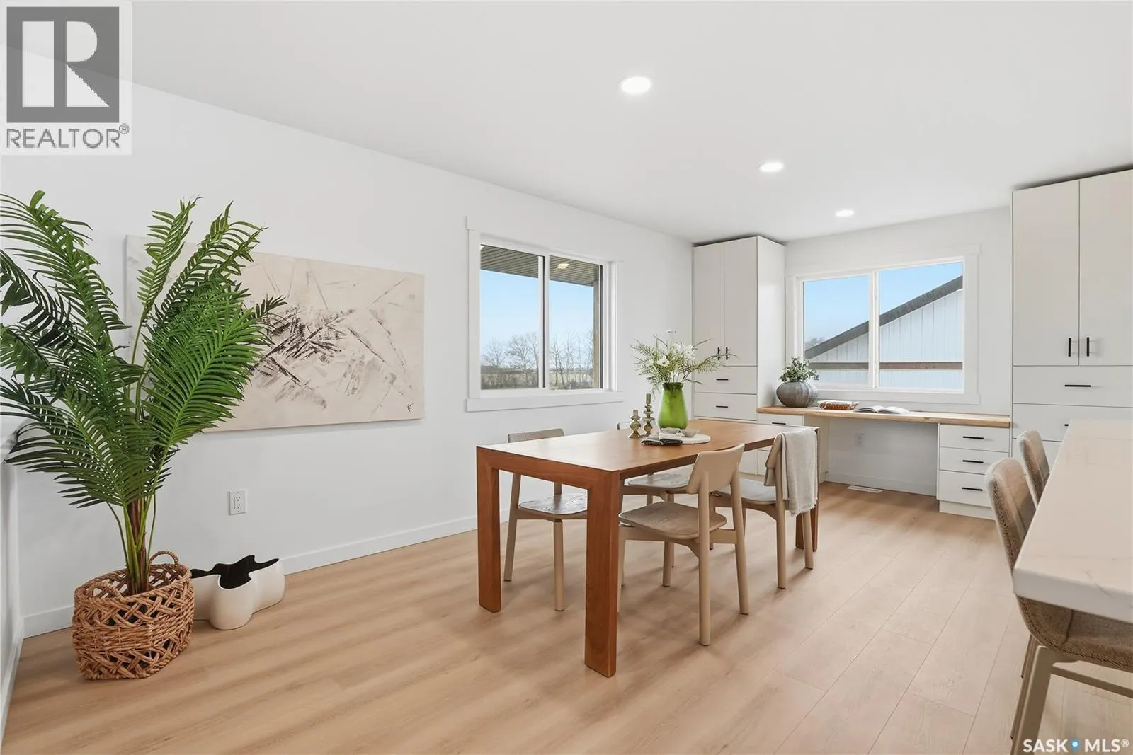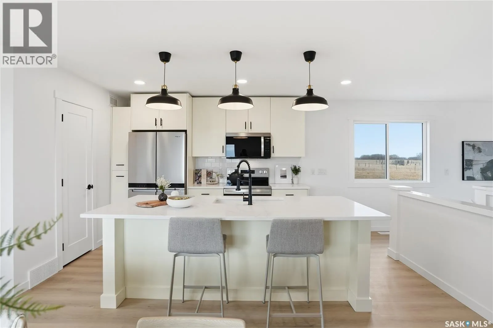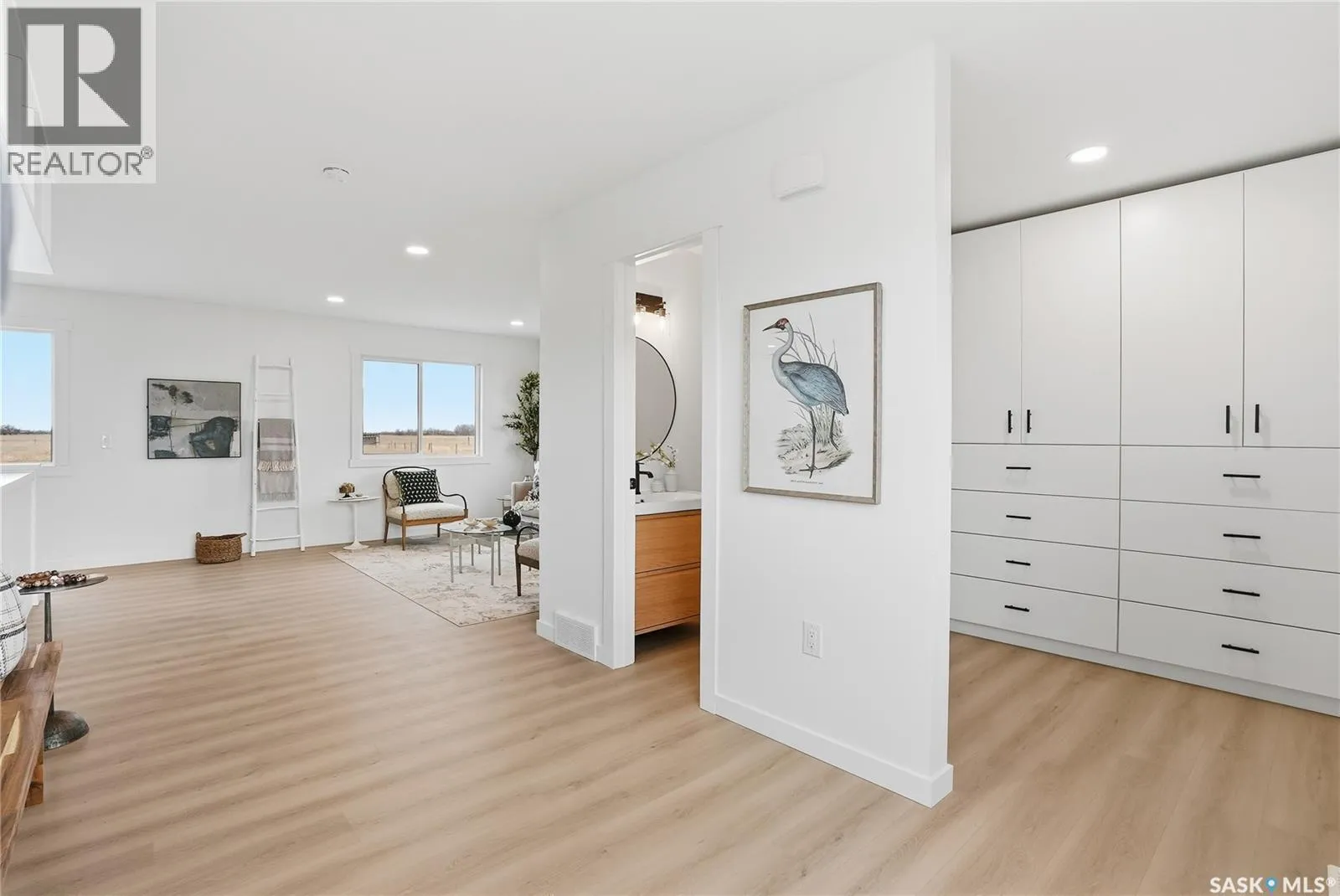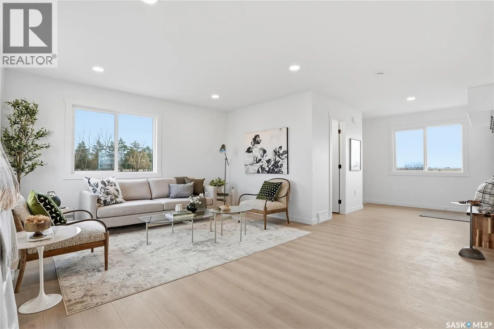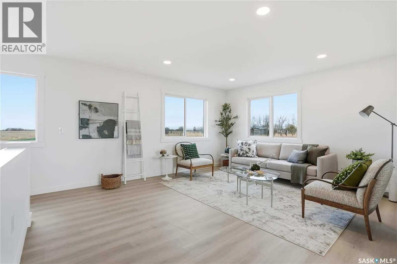 What an Opportunity! Just minutes west of Saskatoonâenjoy peaceful acreage living with city convenience! This newly constructed property sits on 3 acres and offers just over 1,700 sq. ft. of developed space (856 sq. ft. on the main level), featuring 4 beds, two baths, a fully developed basement, and an impressive heated triple detached garage (36â wide with a double overhead door). The home welcomes you home with a charming covered front porch and a functional large foyer complete with a built-in bench and a separate boot room area with floor-to-ceiling wardrobes. The open-concept main floor connects a spacious living room, dining area, and kitchen. The kitchen is a standout, showcasing an abundance of custom lacquer cabinetry, full-height pantry storage, quartz countertops, stainless steel appliances including a microwave hood fan, subway tile backsplash, and an oversized island ideal for large gatherings. The adjacent dining room easily accommodates a large table for the entire family! A convenient two-piece bath completes the main level. An open staircase leads to the bright lower level, which offers four bedrooms (one smallerâideal as a nursery, office, or den), a spacious family-style 4-piece bathroom, and a large walk-in closet in the primary bedroom. Outside, the detached 36â heated and insulated garage is a dream setupâcomplete with a workshop area and a double overhead door. The yard is unlandscaped but cleared and ready for your personal designâbring your garden plans and your green thumb. Property is built by a reputable experience Saskatoon builder. (id:27476)