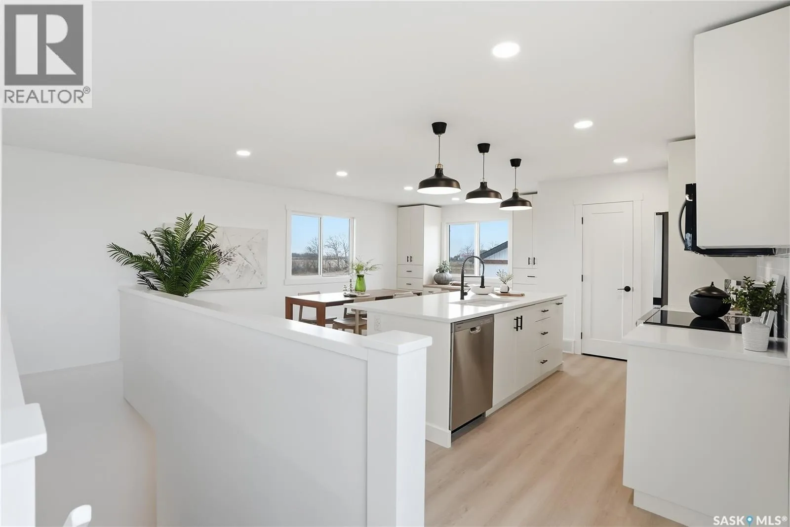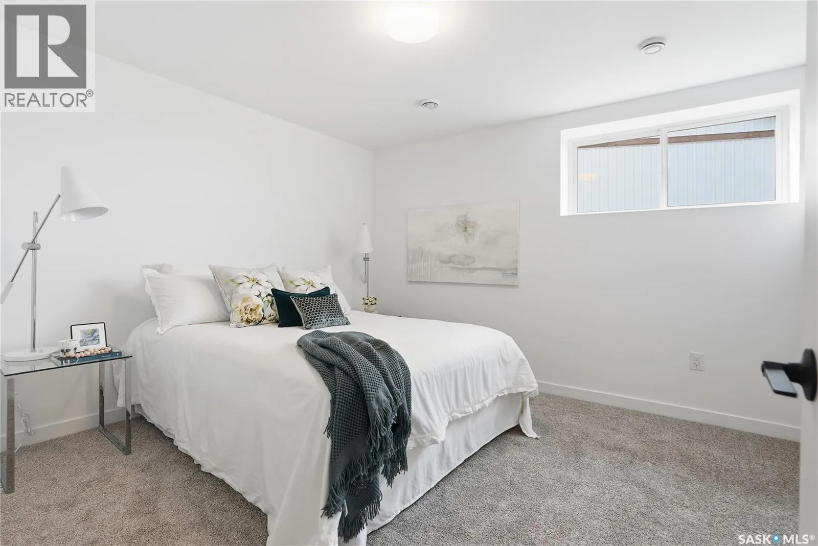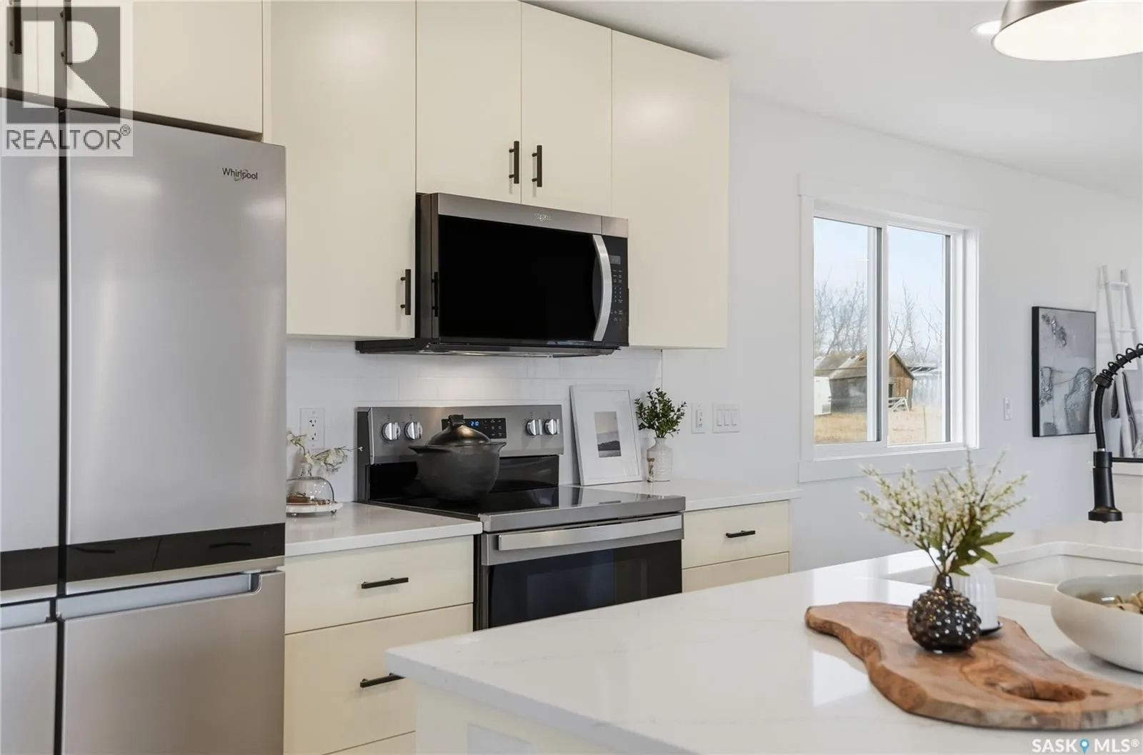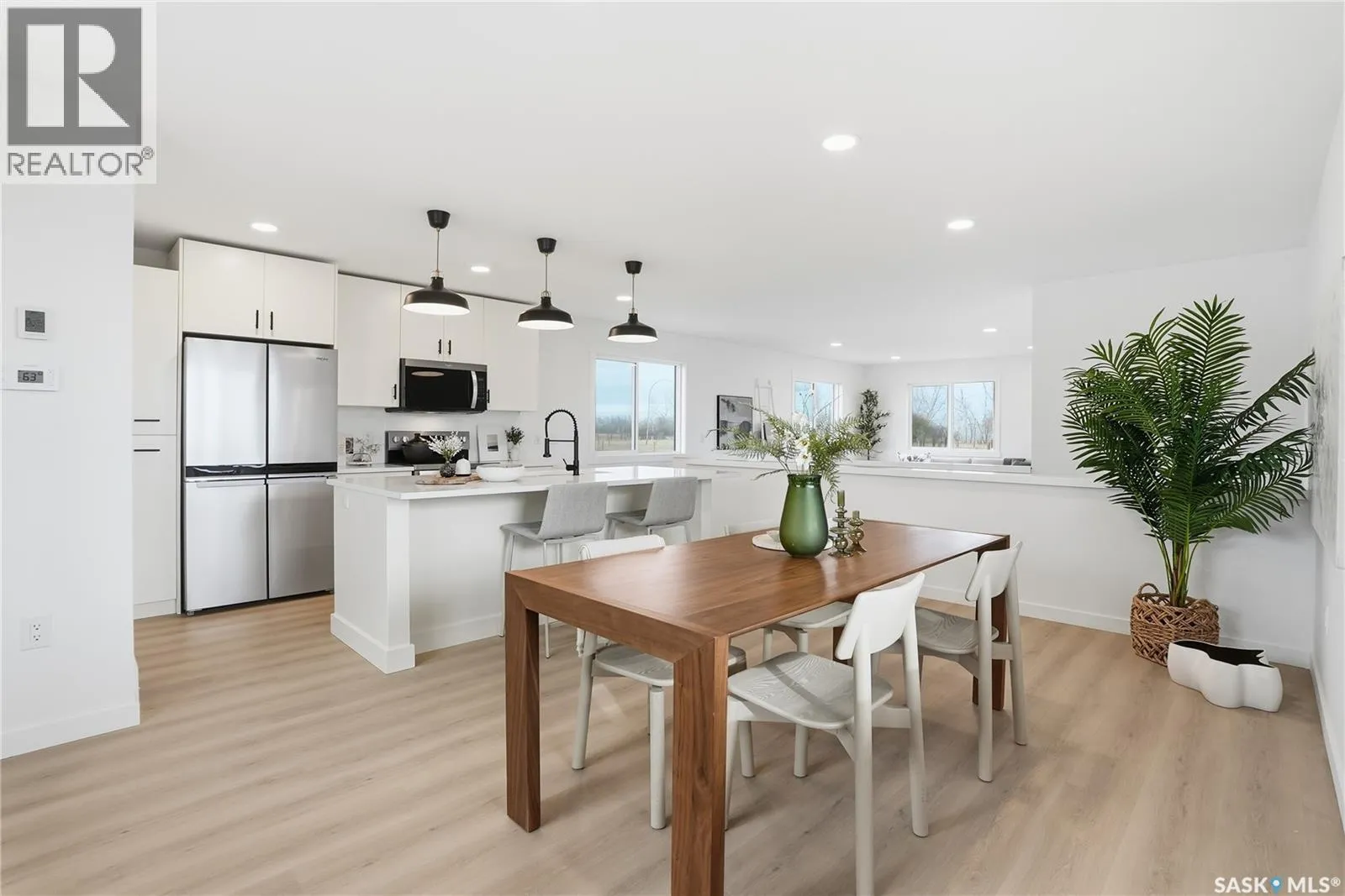 What an Opportunity! Just minutes west of Saskatoonâenjoy peaceful acreage living with city convenience! This newly constructed property sits on 3 acres and offers just over 1,700 sq. ft. of developed space (856 sq. ft. on the main level), featuring 4 beds, two baths, a fully developed basement, and an impressive heated triple detached garage (36â wide with a double overhead door). The home welcomes you home with a charming covered front porch and a functional large foyer complete with a built-in bench and a separate boot room area with floor-to-ceiling wardrobes. The open-concept main floor connects a spacious living room, dining area, and kitchen. The kitchen is a standout, showcasing an abundance of custom lacquer cabinetry, full-height pantry storage, quartz countertops, stainless steel appliances including a microwave hood fan, subway tile backsplash, and an oversized island ideal for large gatherings. The adjacent dining room easily accommodates a large table for the entire family! A convenient two-piece bath completes the main level. An open staircase leads to the bright lower level, which offers four bedrooms (one smallerâideal as a nursery, office, or den), a spacious family-style 4-piece bathroom, and a large walk-in closet in the primary bedroom. Outside, the detached 36â heated and insulated garage is a dream setupâcomplete with a workshop area and a double overhead door. The yard is unlandscaped but cleared and ready for your personal designâbring your garden plans and your green thumb. Property is built by a reputable experience Saskatoon builder. (id:27476)