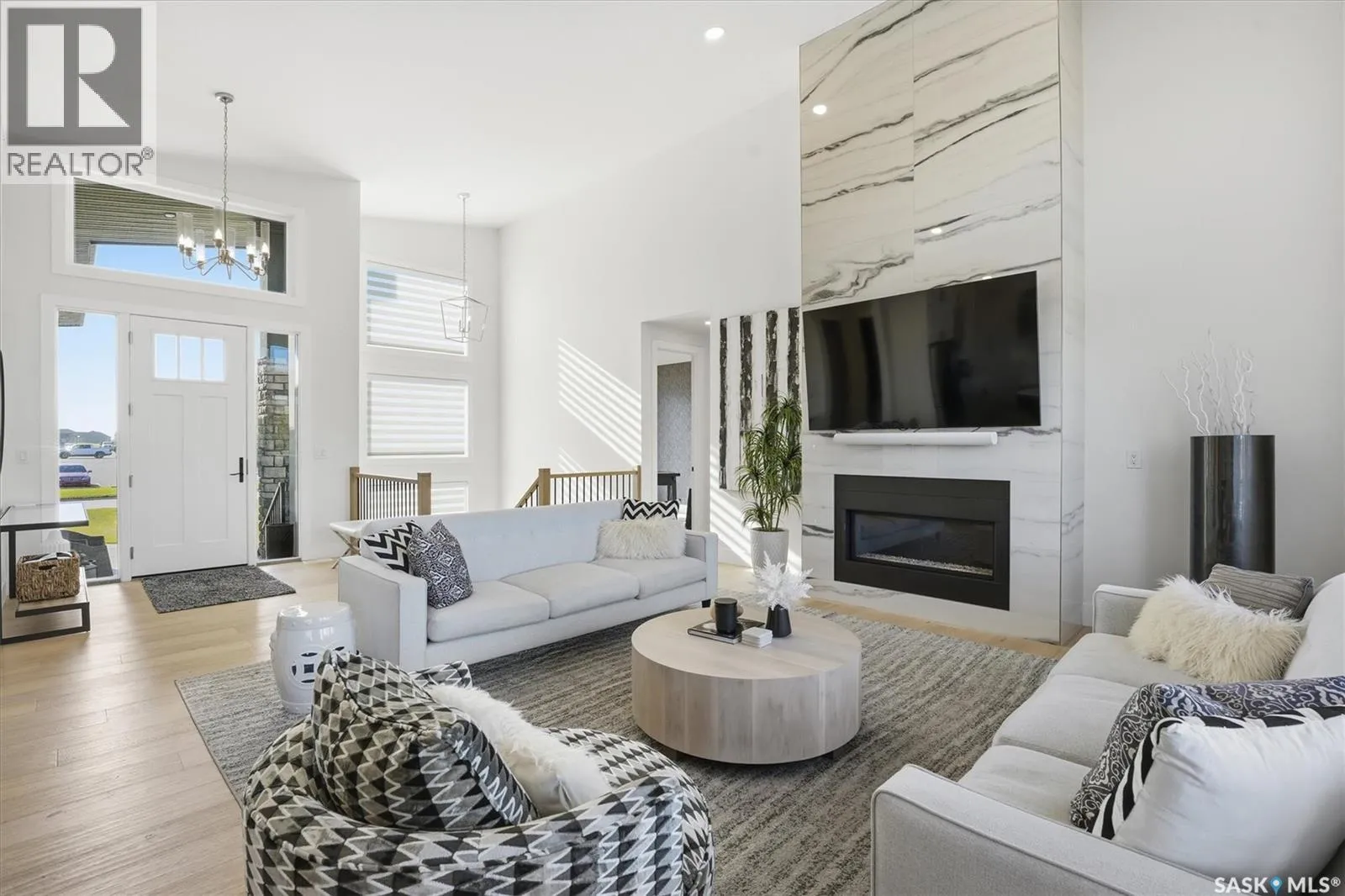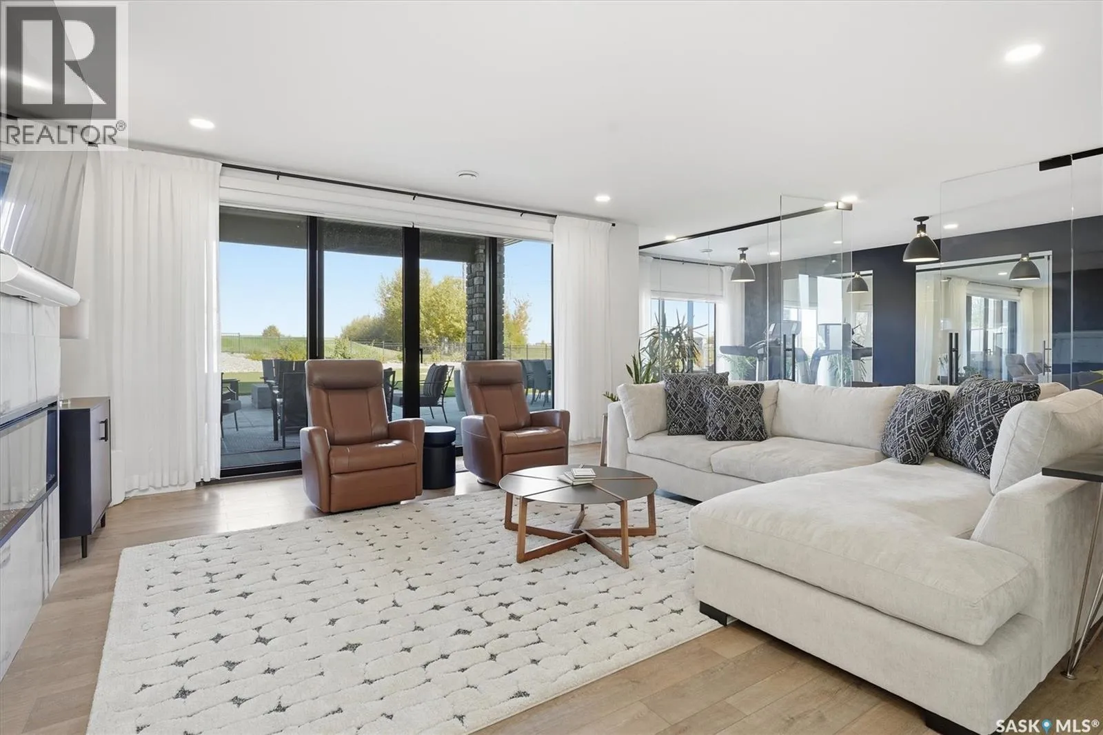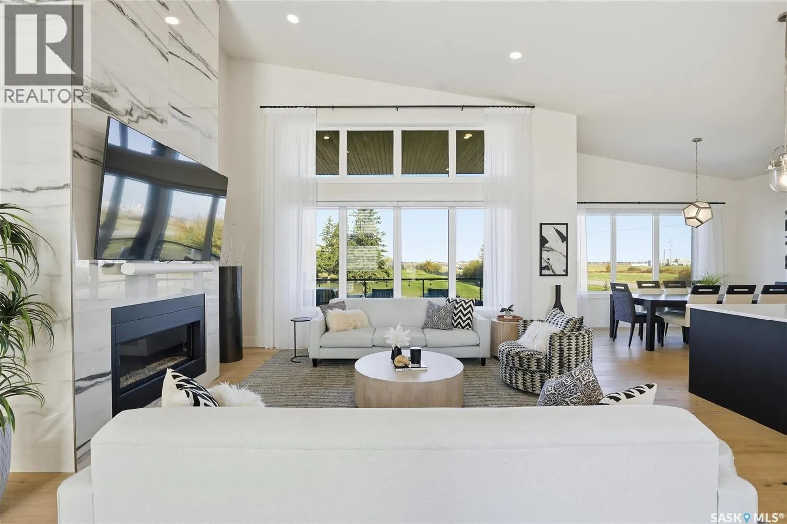 Absolute Stunner! Designer custom D&S Homes walkout bungalow, crafted with precision and showcasing an award-winning floor plan. Offering 1,694 sq ft on main plus a fully dev walkout basement, this 4-bed, 3 bath home is set on an expansive 17,000 sq ft lot backing the Greenbryre Golf Course â with no neighbouring homes in sight, only serene views of the course, a landscaped side buffer and open prairie fields. The entry opens into a breathtaking, light-filled great room with ultra-high soaring ceilings and a dramatic feature fireplace. The open-concept living, kitchen, and dining area is an entertainerâs dream, wrapped in oversized windows overlooking the course. The chefâs kitchen features soft-toned lacquer cabinetry with double-height uppers, quartz counters, full-height quartz backsplash, 5-burner gas range, walk thru pantry, a coffee bar, and a massive central island. The connected dining area is spacious enough for large gatherings and opens to a private covered deck for seamless indoor-outdoor entertaining.The main floor also includes a large boot room, a bright office, outfitted laundry room, and a luxurious primary suite complete with a fully tiled spa-style ensuite, walk-in shower, dual vanity, and walk-in. A striking custom staircase leads to the fully dev walkout level, which mirrors the quality of the main floor. This level offers a sprawling family room with a 2nd fireplace, floor to ceiling windows overlooking the show-stopping backyard, a wet bar with wine storage and seating area, and a dramatic full height glass-walled gym. 2 large bedrooms and a full bathroom complete this level. Additional highlights: ⢠Professionally landscaped grounds ⢠Heated double garage ⢠Zoned in-floor boiler plus forced-air furnace ⢠Instant hot water ⢠Central air ⢠Wired for a hot tub ⢠Underground sprinklers, oversized concrete drive A tasteful masterpiece in design and function â this Greenbryre walkout is spectacular in every detail. (id:27476)