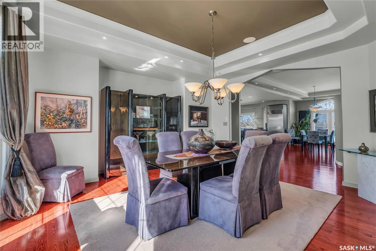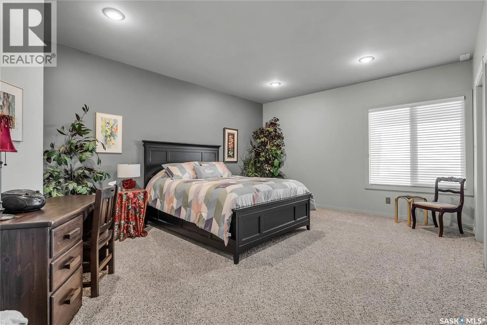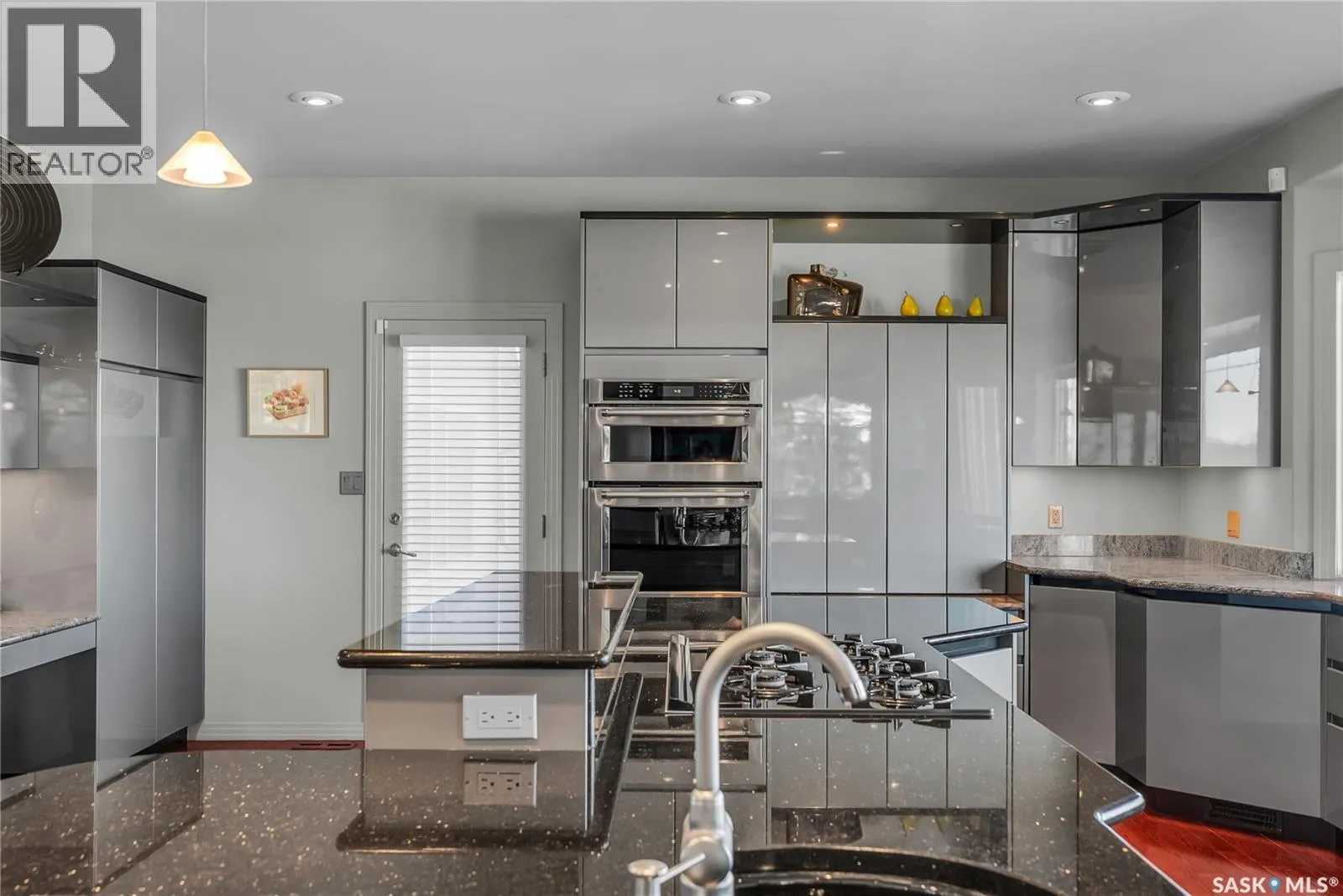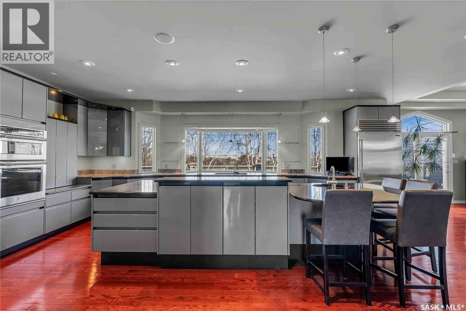 This 3640 sq ft Walkout Bungalow is situated on a 8.8 acre parcel with views of the South Saskatchewan River. With a wonderful location in an active community with rink & play center. Walking into this home, you are welcomed with double-door entry with phantom screens and a spacious foyer leading to an open floor plan with 10 ft ceilings. Great Room features a gas fireplace and custom Redl built-ins, large windows with scenic views. Custom Redl Kitchen is a perfect space with an abundance of cabinets, oversized island with seating, storage, gas cooktop, sink with garburator, granite countertops, baking counter with appliance storage, wall pantry with roll outs, Sub Zero Fridge, built in dishwasher, brand new trash compactor, built-in oven & microwave, coffee bar, dining nook with garden door to composite deck. Formal dining room with a buffet niche. Primary Bedroom is a full retreat with views of the river and access to the deck, gas fireplace with built-ins, dual walk-in closets(1 with stackable washer & dryer), a 4 piece en-suite with in-floor heat, air jet soaker tub, separate shower, dual vanity with granite top & linen closet, sitting area with direct access to basement gym and 3 piece bathroom. Den with a tray ceiling and bayed window.2-piece bathroom with custom stone countertop, laundry room with cabinets, sink, & craft/sewing desk complete the main. Walkout basement features in-floor heat, large family room with 3-way gas fireplace, garden door to covered, partially enclosed patio,games area with wet bar feature seating, fridge,dishwasher & sink. 2 large bedrooms with jack&jill 4- piece bathroom, den/craft room with closet, large mechanical/storage room with wine room. Home is wired for sound system,LED lighting up the driveway, new carpet(2023), new boiler(2023), central vac,4 furnaces & central air, window treatments, & generator for backup power. Attached 8-car heated garage, detached 12-car heated garage/workshop with hoist &cabinets &2-piece bathroom. (id:27476)