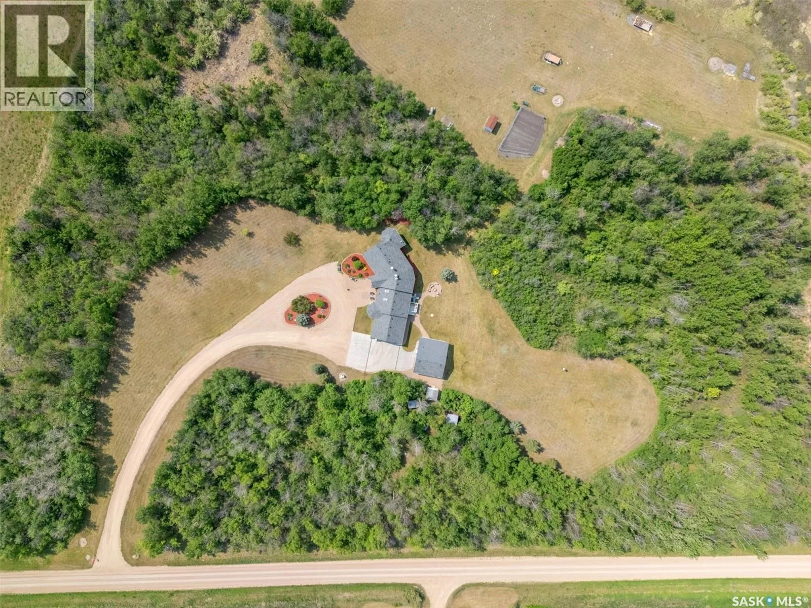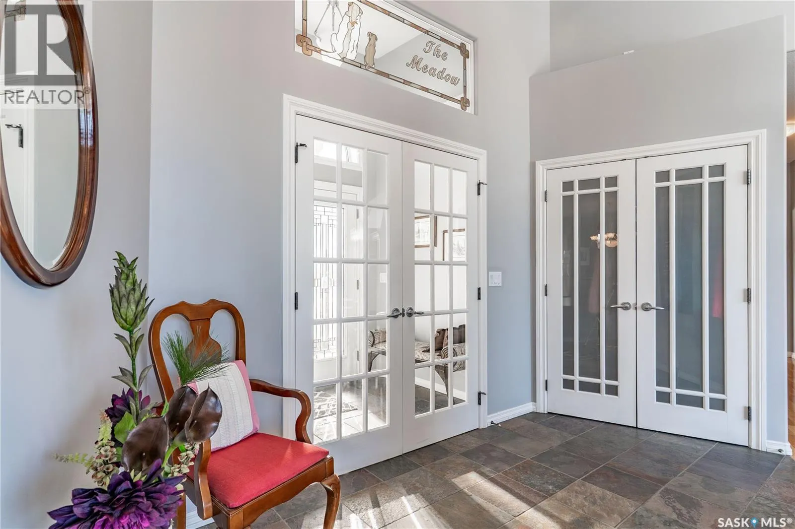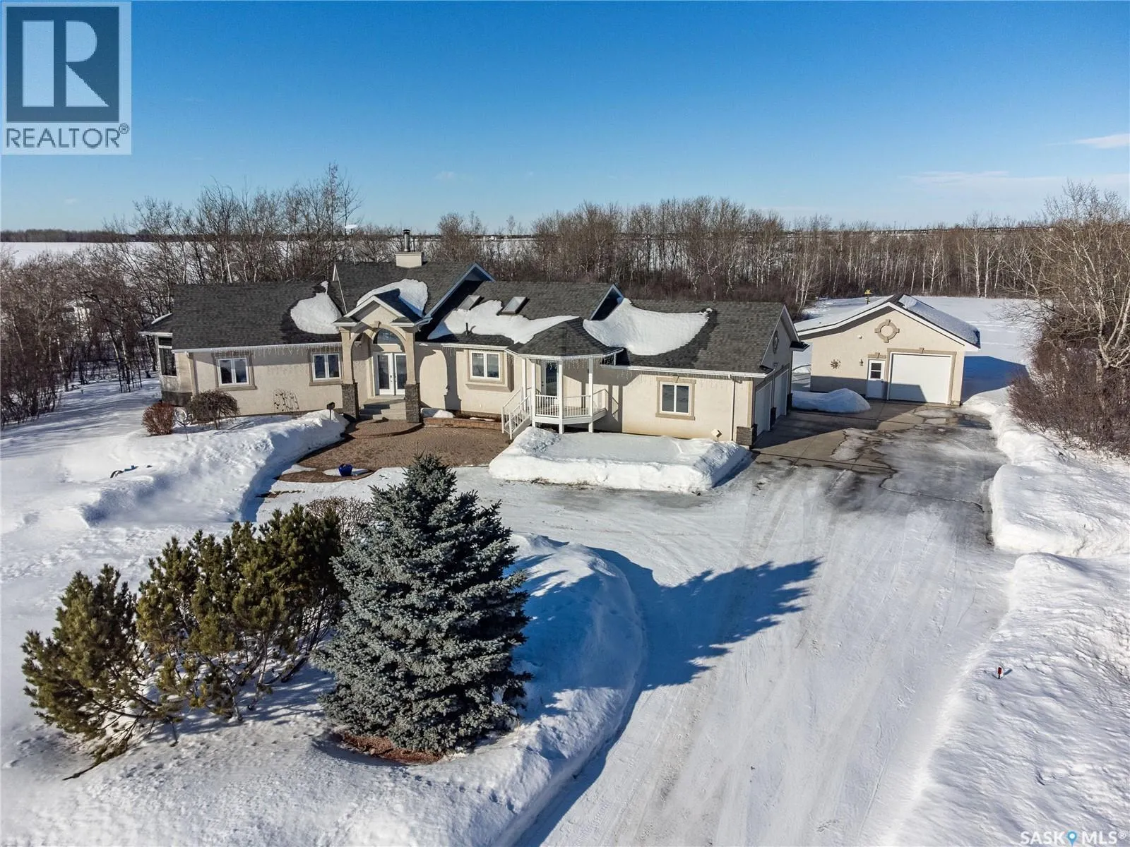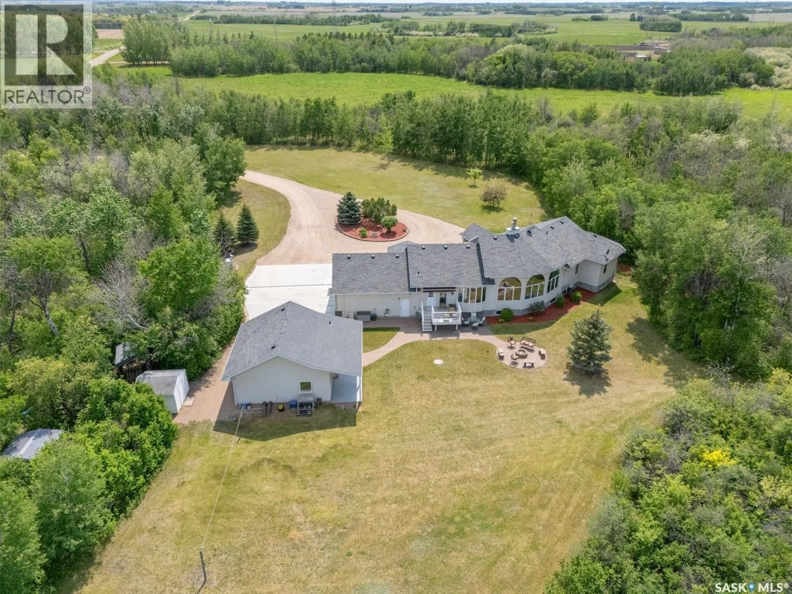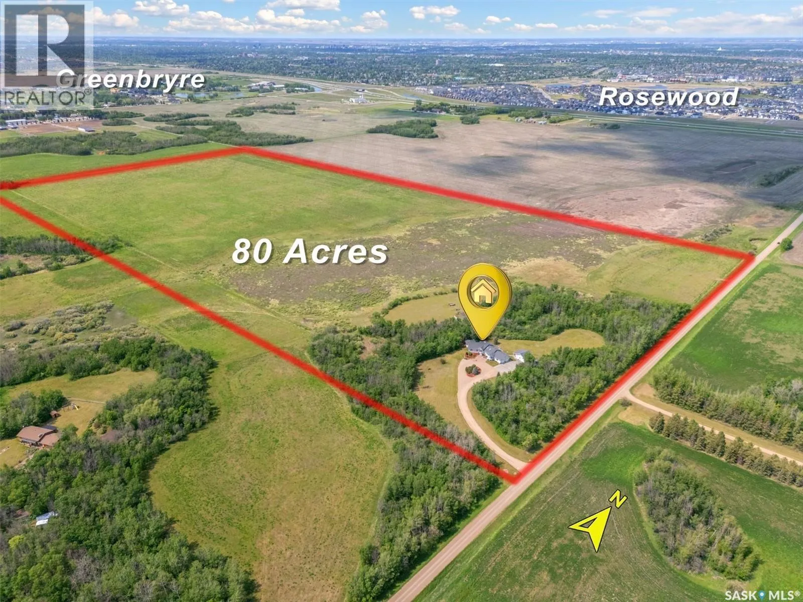 SE 07-36-04 W of 3rd Welcome to The Meadow, 80 acres of pure serenity on the southeast doorstep of Saskatoon. This peaceful paradise offers the privacy and tranquility of country living, just minutes from Costco and Greenbryre Golf & Country Club. This sprawling, custom-built Ehrenburg bungalow is designed for comfort, beauty, and connection to the nature. The grand front entry welcomes you with soaring vaulted ceilings and a sweeping sense of space. The centerpiece of the great room is a stunning wood-burning fireplace, creating a warm, inviting atmosphere enhanced by floor-to-ceiling windows that frame breathtaking views of the wilderness waiting for you out your back door. White oak hardwood gleams throughout the main floor, paired with slate tile in the foyer and kitchen. The spacious kitchen features a large 8-foot granite island, gas stove, built in oven, ample cupboard space, and easy flow into a turret-shaped sun porchâperfect for morning coffee or sunny, lazy afternoons. This south-facing gem is flooded with natural light and designed to make the most of every season. The main floor also includes laundry, three well-appointed bathrooms, and three bedrooms. The primary bedroom offers a peaceful retreat, complete with a three-piece ensuite and a private turret-shaped sunroom for year-round quiet moments of rest and reflection. Additional features include a heated double attached garage and a wide single detached garage with shower and bathroom facilitiesâan ideal workshop with ample space for storage and tons of room for any project. The full basement is ready for your custom development, with in-floor heating lines already roughed in. Whether you're looking to raise a family, escape the city, or simply enjoy life in harmony with nature, The Meadow delivers the best of all worldsâprivacy, space, and proximity to everything you need. Must be experienced to be fully appreciated. Call your favourite Realtor® to arrange a private viewing today! (id:27476)