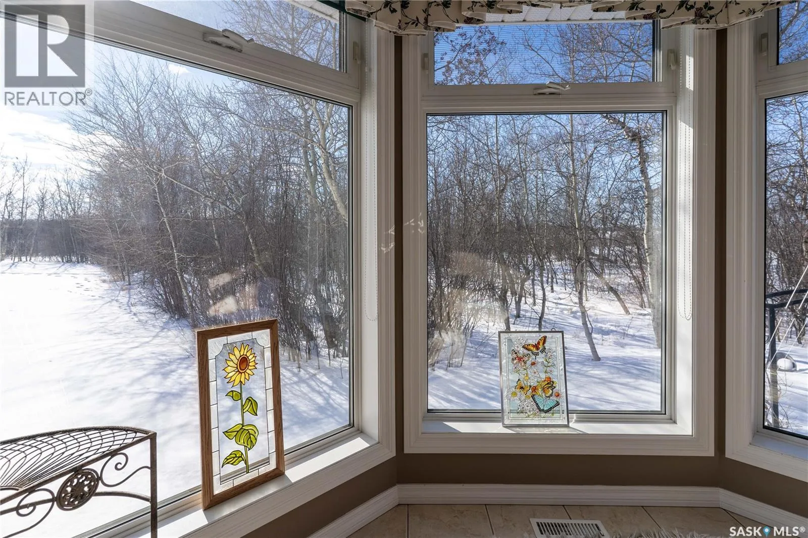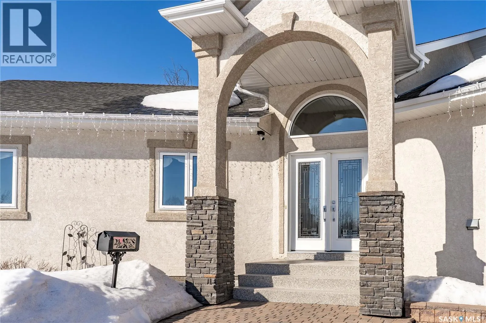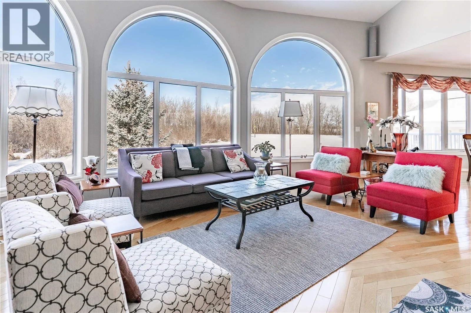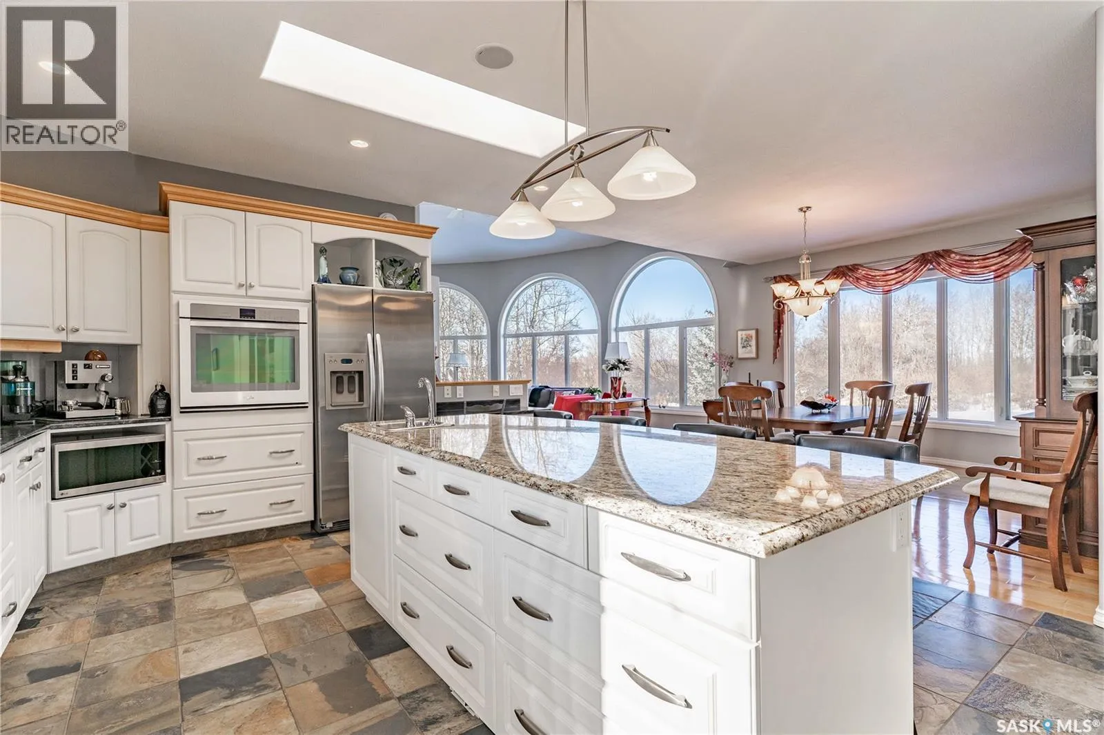 SE 07-36-04 W of 3rd Welcome to The Meadow, 80 acres of pure serenity on the southeast doorstep of Saskatoon. This peaceful paradise offers the privacy and tranquility of country living, just minutes from Costco and Greenbryre Golf & Country Club. This sprawling, custom-built Ehrenburg bungalow is designed for comfort, beauty, and connection to the nature. The grand front entry welcomes you with soaring vaulted ceilings and a sweeping sense of space. The centerpiece of the great room is a stunning wood-burning fireplace, creating a warm, inviting atmosphere enhanced by floor-to-ceiling windows that frame breathtaking views of the wilderness waiting for you out your back door. White oak hardwood gleams throughout the main floor, paired with slate tile in the foyer and kitchen. The spacious kitchen features a large 8-foot granite island, gas stove, built in oven, ample cupboard space, and easy flow into a turret-shaped sun porchâperfect for morning coffee or sunny, lazy afternoons. This south-facing gem is flooded with natural light and designed to make the most of every season. The main floor also includes laundry, three well-appointed bathrooms, and three bedrooms. The primary bedroom offers a peaceful retreat, complete with a three-piece ensuite and a private turret-shaped sunroom for year-round quiet moments of rest and reflection. Additional features include a heated double attached garage and a wide single detached garage with shower and bathroom facilitiesâan ideal workshop with ample space for storage and tons of room for any project. The full basement is ready for your custom development, with in-floor heating lines already roughed in. Whether you're looking to raise a family, escape the city, or simply enjoy life in harmony with nature, The Meadow delivers the best of all worldsâprivacy, space, and proximity to everything you need. Must be experienced to be fully appreciated. Call your favourite Realtor® to arrange a private viewing today! (id:27476)