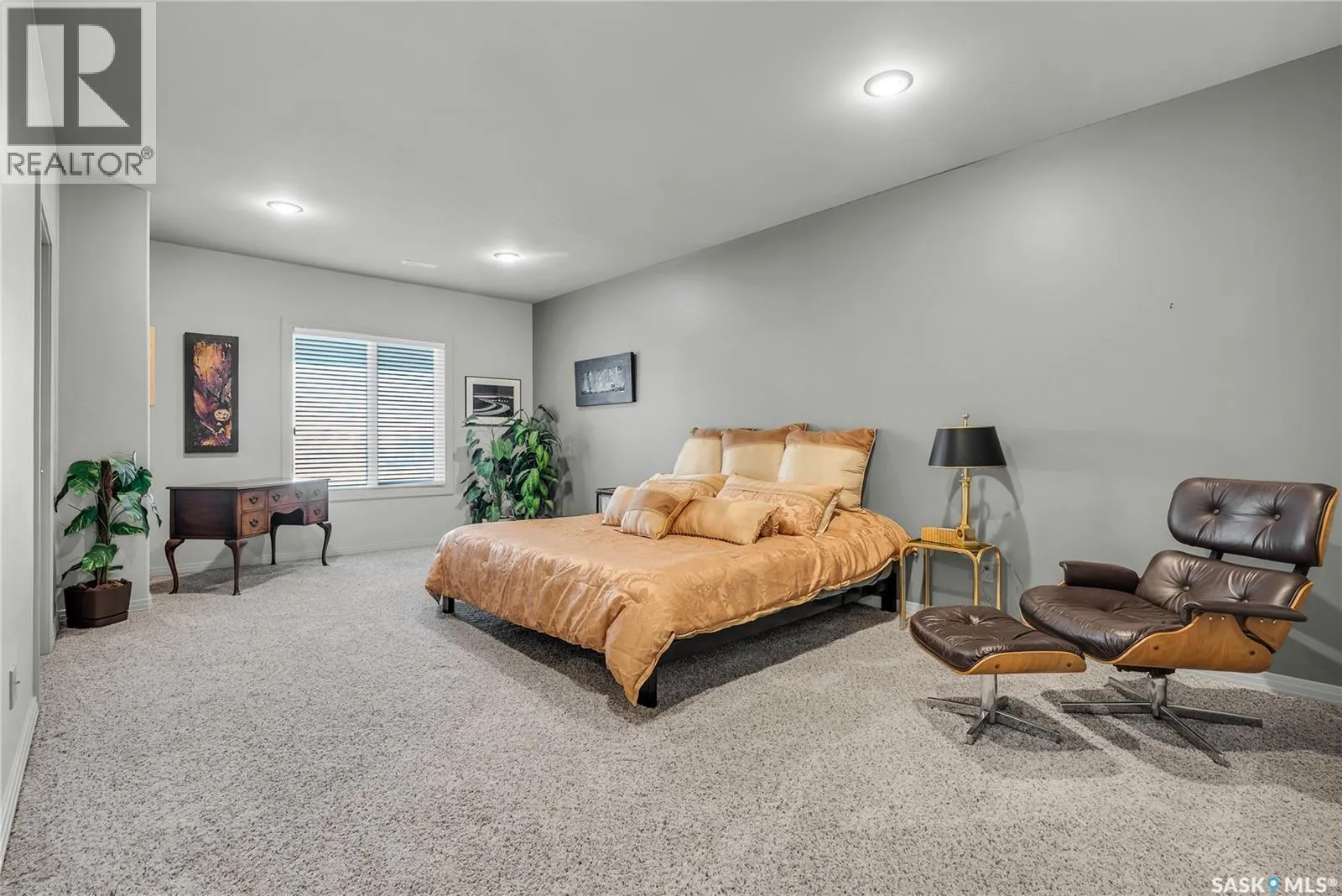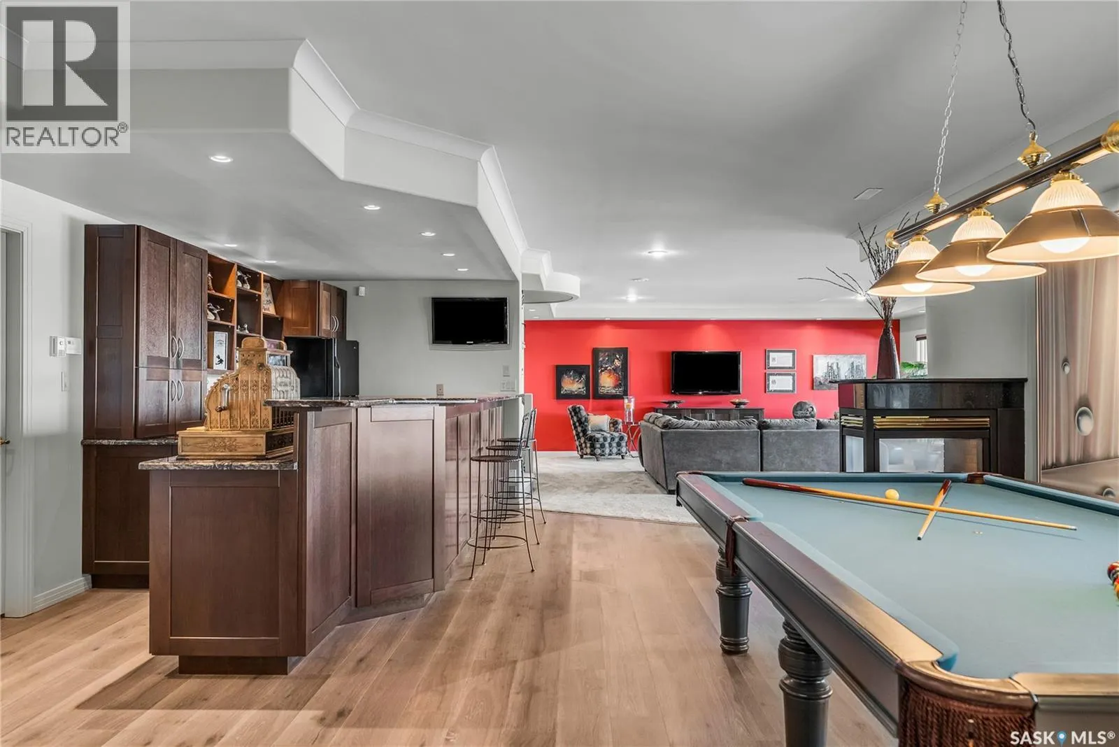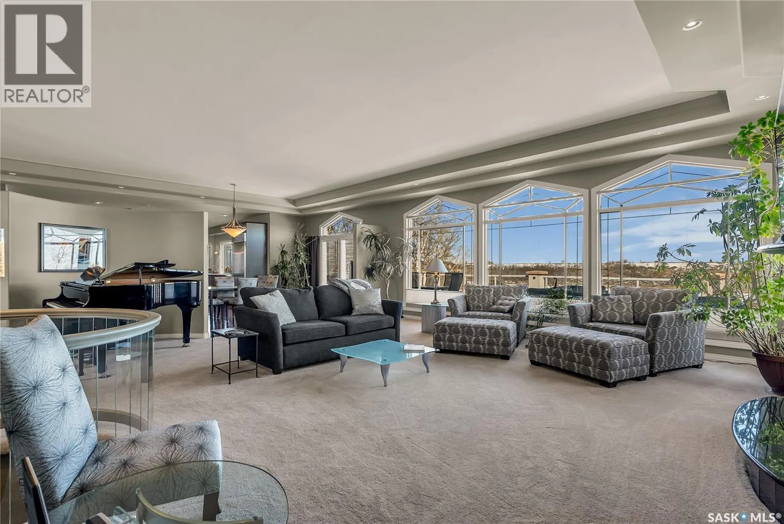 This 3640 sq ft Walkout Bungalow is situated on a 8.8 acre parcel with views of the South Saskatchewan River. With a wonderful location in an active community with rink & play center. Walking into this home, you are welcomed with double-door entry with phantom screens and a spacious foyer leading to an open floor plan with 10 ft ceilings. Great Room features a gas fireplace and custom Redl built-ins, large windows with scenic views. Custom Redl Kitchen is a perfect space with an abundance of cabinets, oversized island with seating, storage, gas cooktop, sink with garburator, granite countertops, baking counter with appliance storage, wall pantry with roll outs, Sub Zero Fridge, built in dishwasher, brand new trash compactor, built-in oven & microwave, coffee bar, dining nook with garden door to composite deck. Formal dining room with a buffet niche. Primary Bedroom is a full retreat with views of the river and access to the deck, gas fireplace with built-ins, dual walk-in closets(1 with stackable washer & dryer), a 4 piece en-suite with in-floor heat, air jet soaker tub, separate shower, dual vanity with granite top & linen closet, sitting area with direct access to basement gym and 3 piece bathroom. Den with a tray ceiling and bayed window.2-piece bathroom with custom stone countertop, laundry room with cabinets, sink, & craft/sewing desk complete the main. Walkout basement features in-floor heat, large family room with 3-way gas fireplace, garden door to covered, partially enclosed patio,games area with wet bar feature seating, fridge,dishwasher & sink. 2 large bedrooms with jack&jill 4- piece bathroom, den/craft room with closet, large mechanical/storage room with wine room. Home is wired for sound system,LED lighting up the driveway, new carpet(2023), new boiler(2023), central vac,4 furnaces & central air, window treatments, & generator for backup power. Attached 8-car heated garage, detached 12-car heated garage/workshop with hoist &cabinets &2-piece bathroom. (id:27476)