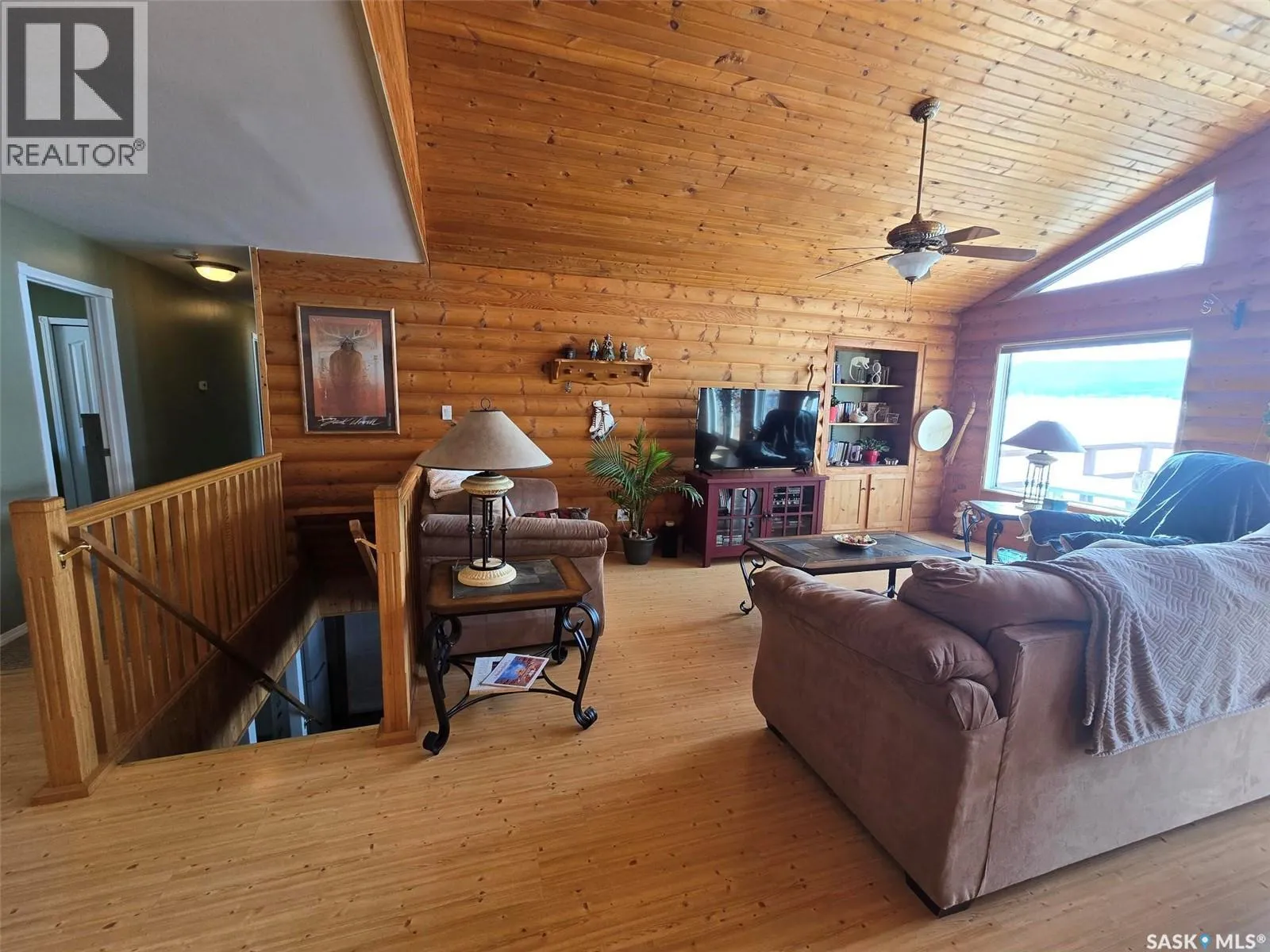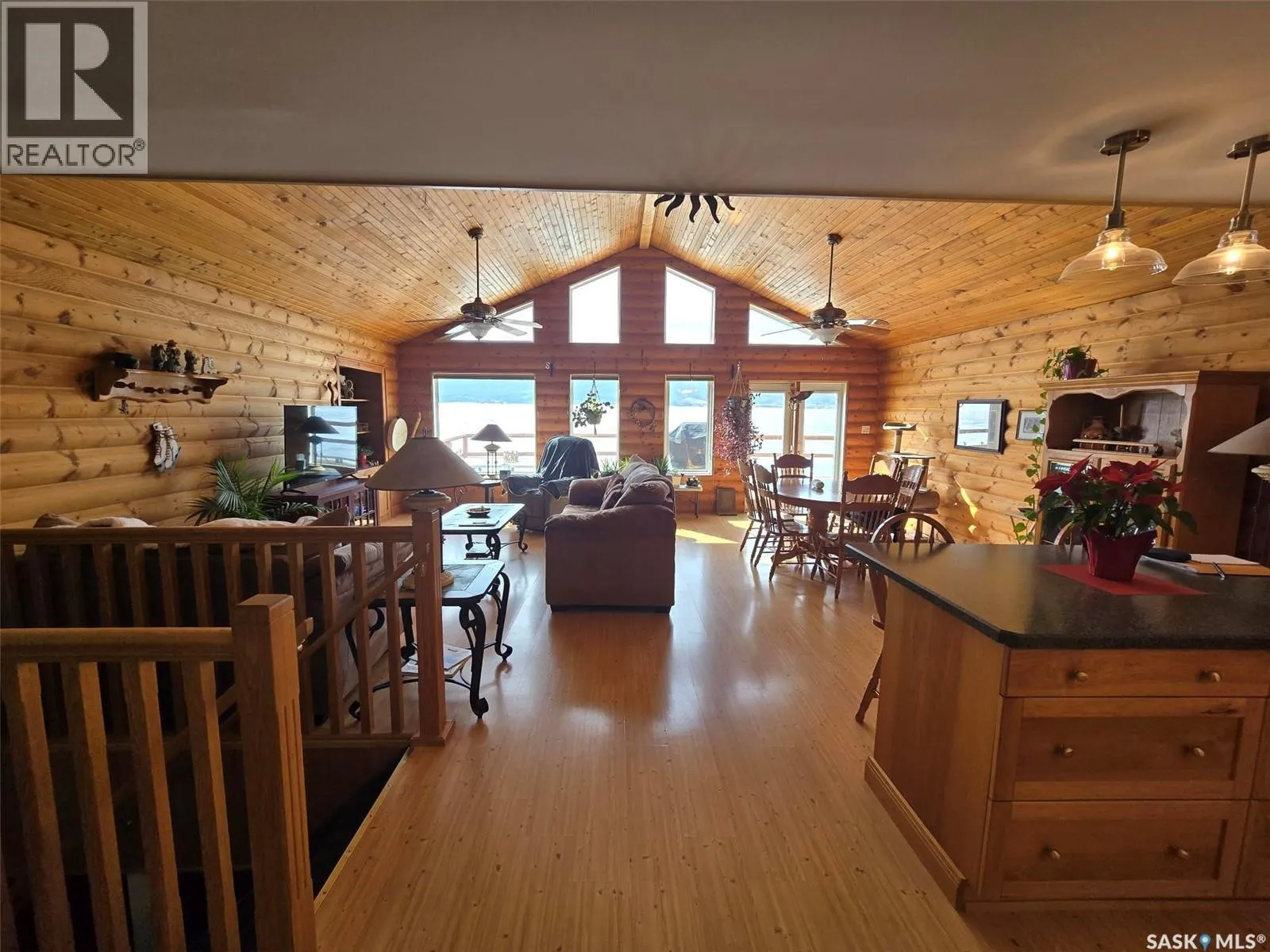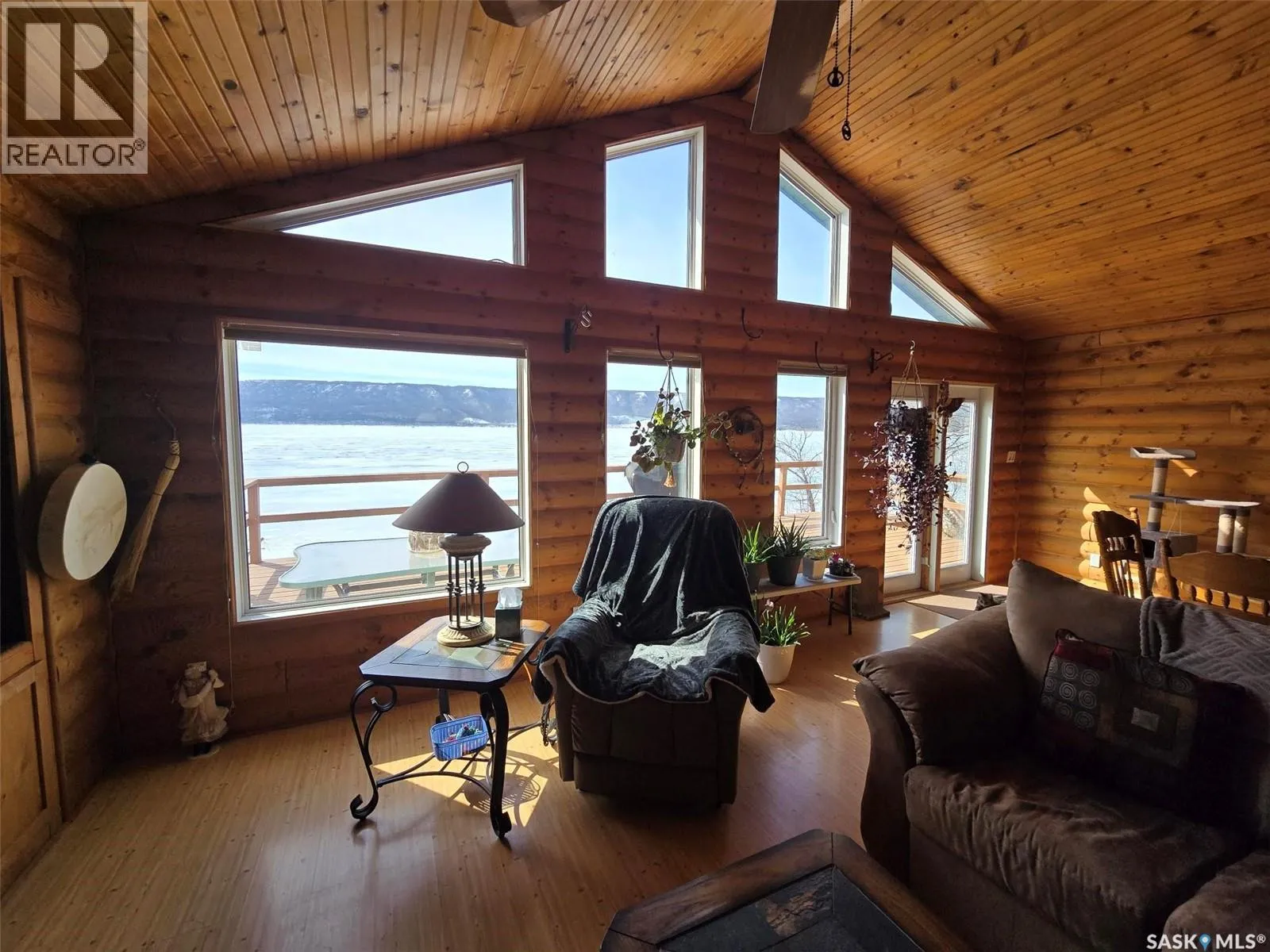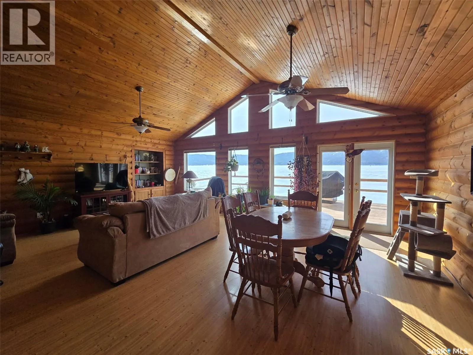 Sunsets are breathtaking at 104 Elk Road , Crooked Lake in this 3 bedroom plus 2 bath all season home with a combined total of just over 3000 sq ft. This property offers more than that though with lake front lifestyle in a log style bungalow built in 2002 with an amazing yard. Be close to nature with no direct neighbours on either side on this leased lot. The home boasts vaulted ceilings in the front living room, with south west windows allowing natural light to filter through all day. The kitchen is massive for all the company that lake life brings. There are 2 islands, one with a breakfast bar area and one is moveable with seating. Birch cabinets warm the space and provide lots of storage. Stainless steel appliances are quite new to include the BI dishwasher, fridge, stove, and microwave hood fan. Lighting has been updated. The 3 piece bath down the hall is spacious and has been renovated. Main floor laundry is situated in the Jack n' Jill bathroom off the Primary bedroom. This 4 piece bath has a jet tub and walk in shower. Wake up to the view of the lake in the Primary room , lots of closet space. Across the hall , a second bedroom. The walk out basement will be a great area to set up a gym, a rec space, extra family room , and hosts a 3rd bedroom. Boat house access on this level or turn it into a "Man Cave" , a place to set up a work shop. This sale will include a Hydo- pool Hot tub approx 6 years old, currently being used with minerals. There is a change room/ lean-to beside. Large storage shed found on the back side by the parking area. Lake life is all about the outdoors, and the bottom deck and balcony will be your favorite location. Septic - 1200 Concrete, Eco green Tank for propane, comes with dock and track. Lease is $2838 due in Dec and tax is $3106 due in Sept. Financing is available with terms and conditions . Water is delivered to home and stored in poly tank. This property is on a "No Through Road" come check it out before summer disappears. (id:27476)