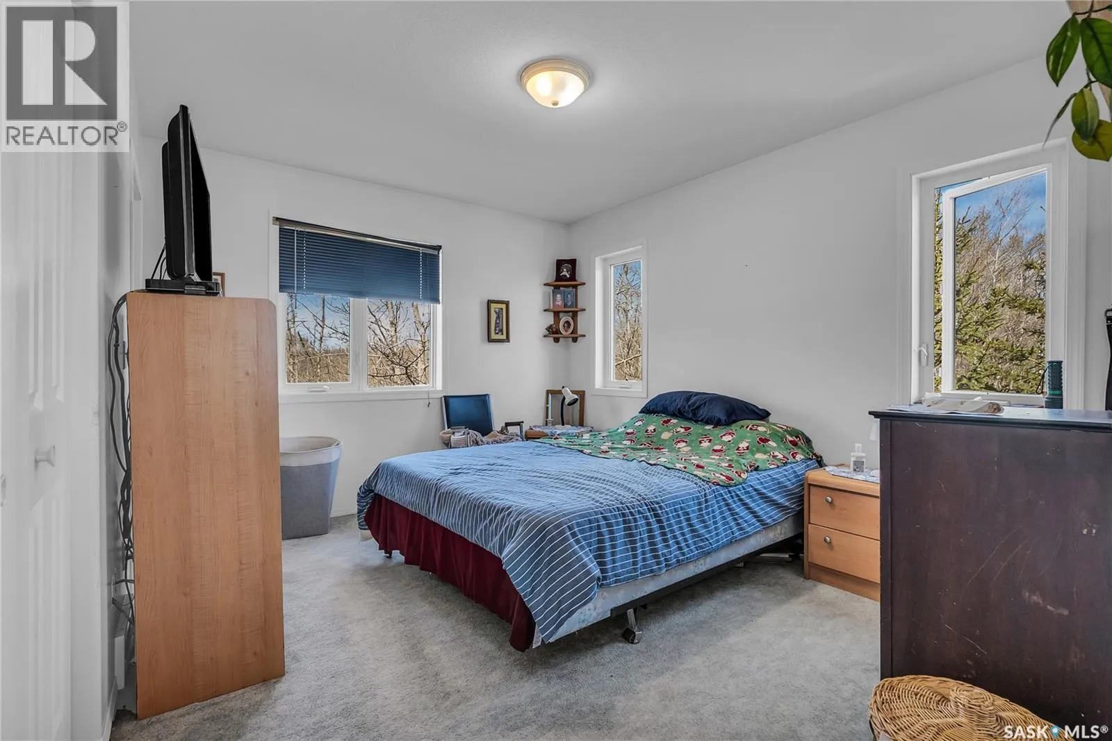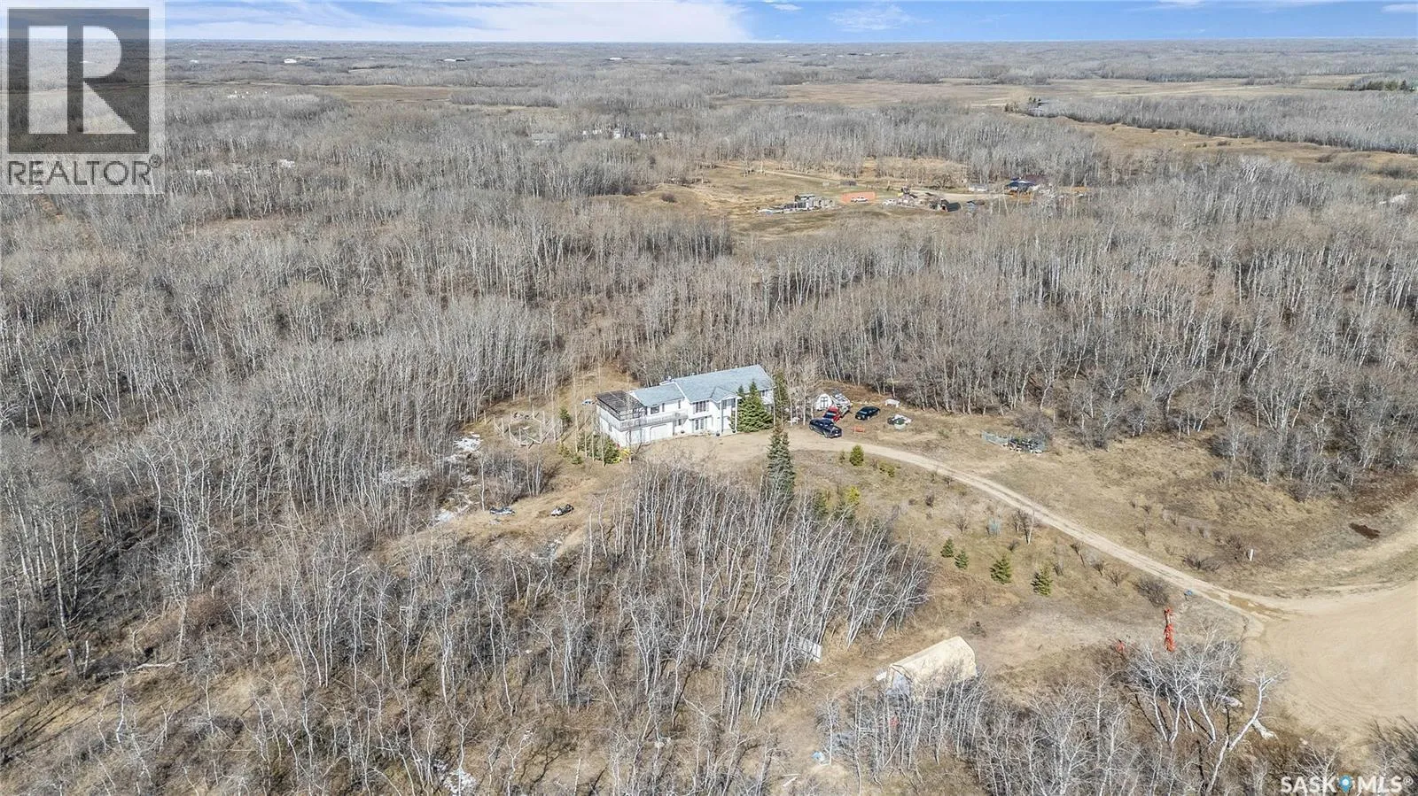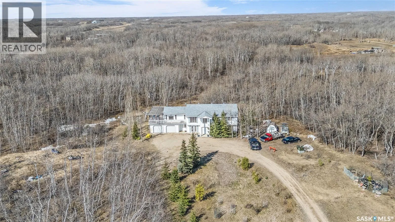 24 Km South of Saskatoon On Hwy #11 to Friesen Trail, turn west to Mercier Pl & Turn South & go to the end, west side. Settle in before spring hits and enjoy peaceful acreage living just minutes off Highway 11. The property is perfectly private yet easily accessible, with little to no highway noise. This spacious 2,800 sq ft two-storey home (about 1,600 sq ft up and 1,200 sq ft down) offers 5 bedrooms, 3 bathrooms, a main floor office, a large master suite with space for a second office, laundry on both levels, and a sunroom that steps out to a wrap-around deck. The attached 24' x 26' garage includes built-in shelving, generous storage, and 220V power. Inside, the home features walnut hardwood, laminate, linoleum, and carpet flooring, hickory kitchen cabinetry and railings, and cozy family rooms on both levels with a wood-burning fireplace and a gas stove/fireplace. The 10-acre parcel offers major upside. Per the seller, there is potential to subdivide roughly 7 excess acres into multiple acreage lots (minimum approved lot size of 0.4 acres), creating a strong long-term development or resale opportunity. A 42" bored well supplies abundant water, with a city water line available if preferred. The yard features 200+ planted trees, thick bush for privacy, and regular wildlife visits. School buses service Dundurn Elementary and Clavet High School. Private, spacious, and full of potential. Call your Realtor for your private viewing. (id:27476)