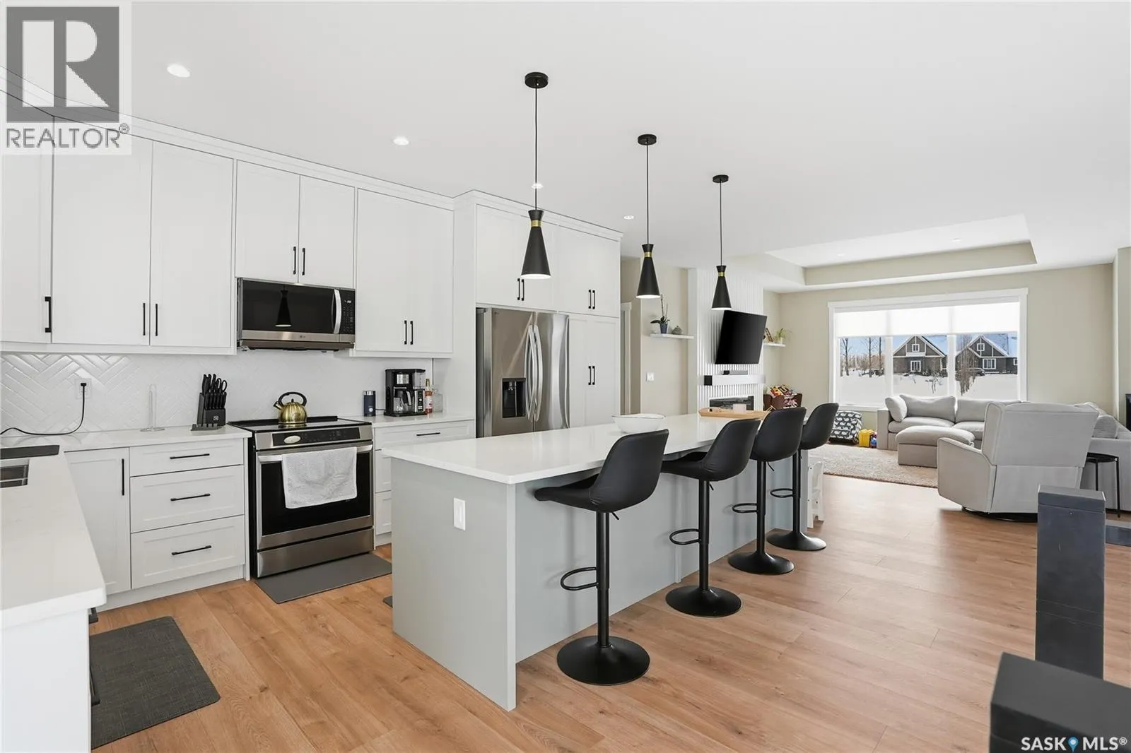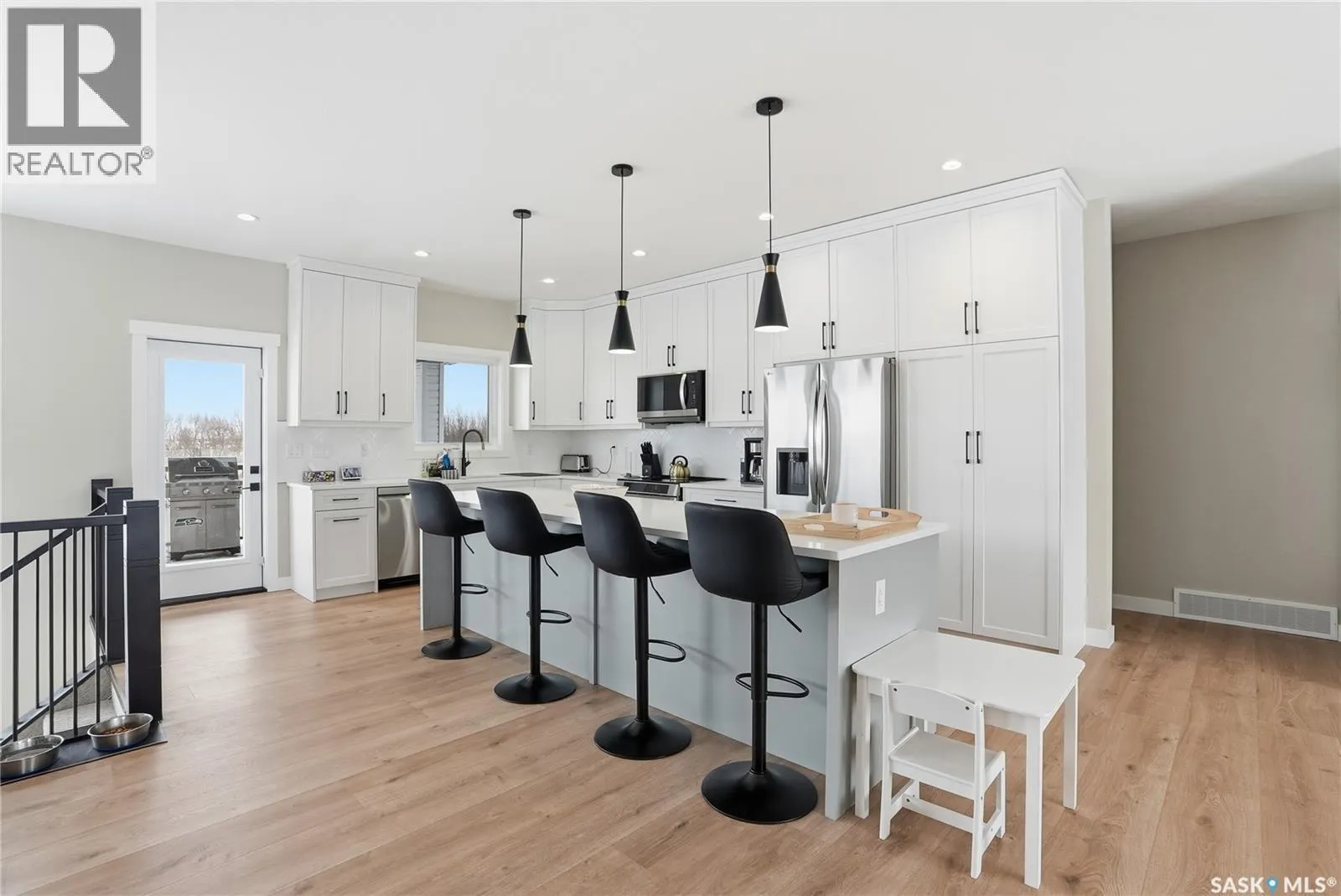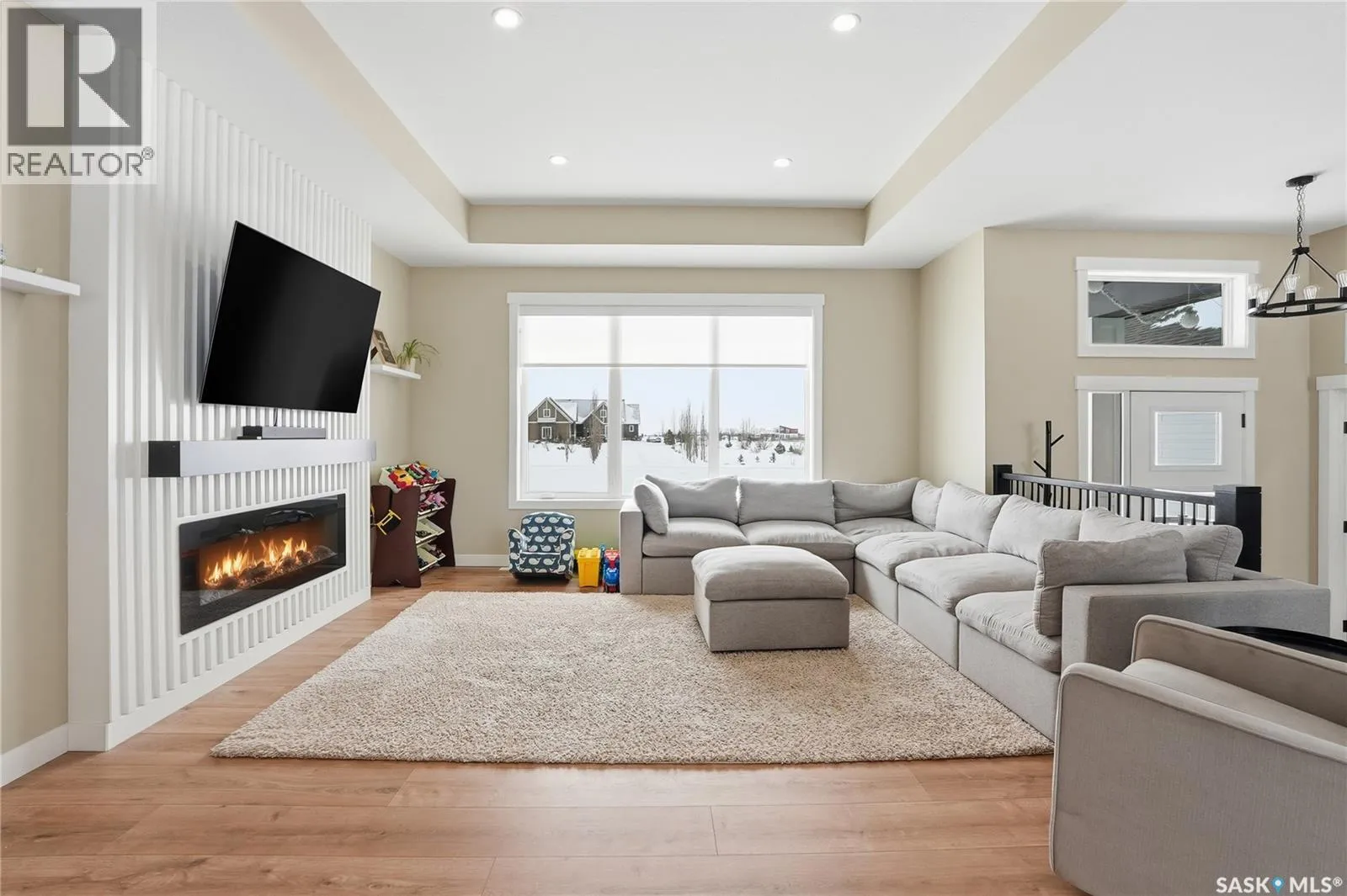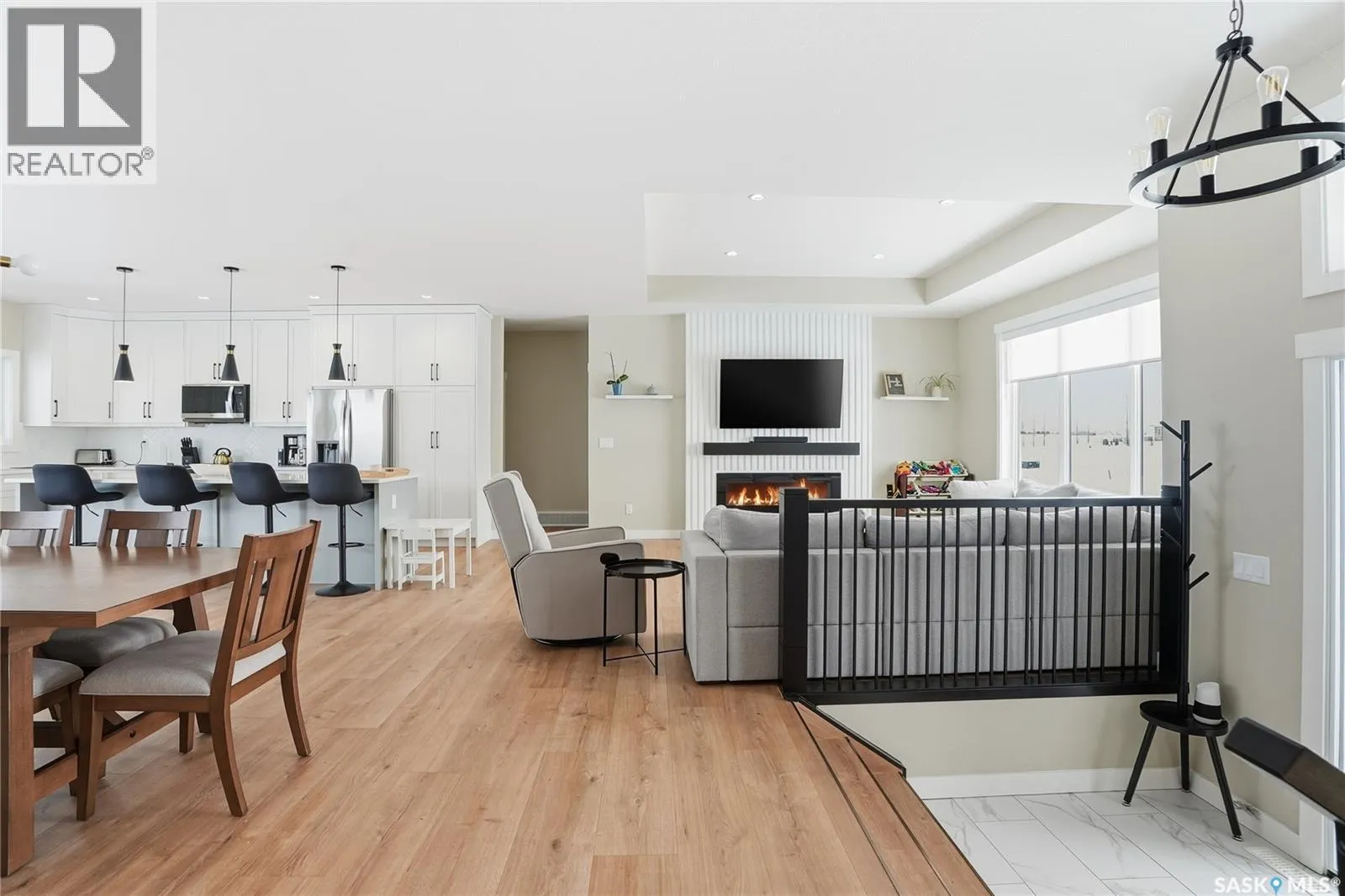 Welcome to Pheasant Meadows Estates! Nestled just minutes from Saskatoon, this stunning newly built home offers approximately 1,735 sq ft of thoughtfully designed living space in the sought-after community of Pheasant Meadows Estates. Step inside to a bright and airy open-concept main floor featuring a welcoming living area with an electric fireplace, stylish modern light fixtures, and triple-pane vinyl windows with Low-E and Argon gas for superior energy efficiency. The heart of the home is the modern modular kitchen, complete with quartz countertops, a beautiful tile backsplash, a generous pantry, and a large island â perfect for entertaining or everyday family life. The adjacent dining area flows seamlessly for effortless living. The main floor also offers two well-sized bedrooms sharing a 4-piece bathroom, plus a convenient 2-piece powder room. Retreat to the primary bedroom suite, complete with its own private 4-piece en-suite bath. The undeveloped basement is flooded with natural light thanks to sunshine windows, making it a bright and inviting blank canvas â ready for your personal touch and vision. Outside, enjoy your 16' x 12' covered deck, ideal for Saskatchewan evenings, and the impressive triple-car attached garage providing ample space for vehicles, storage, and more. Contact your favourite REALTOR® today to book your private showing! (id:27476)