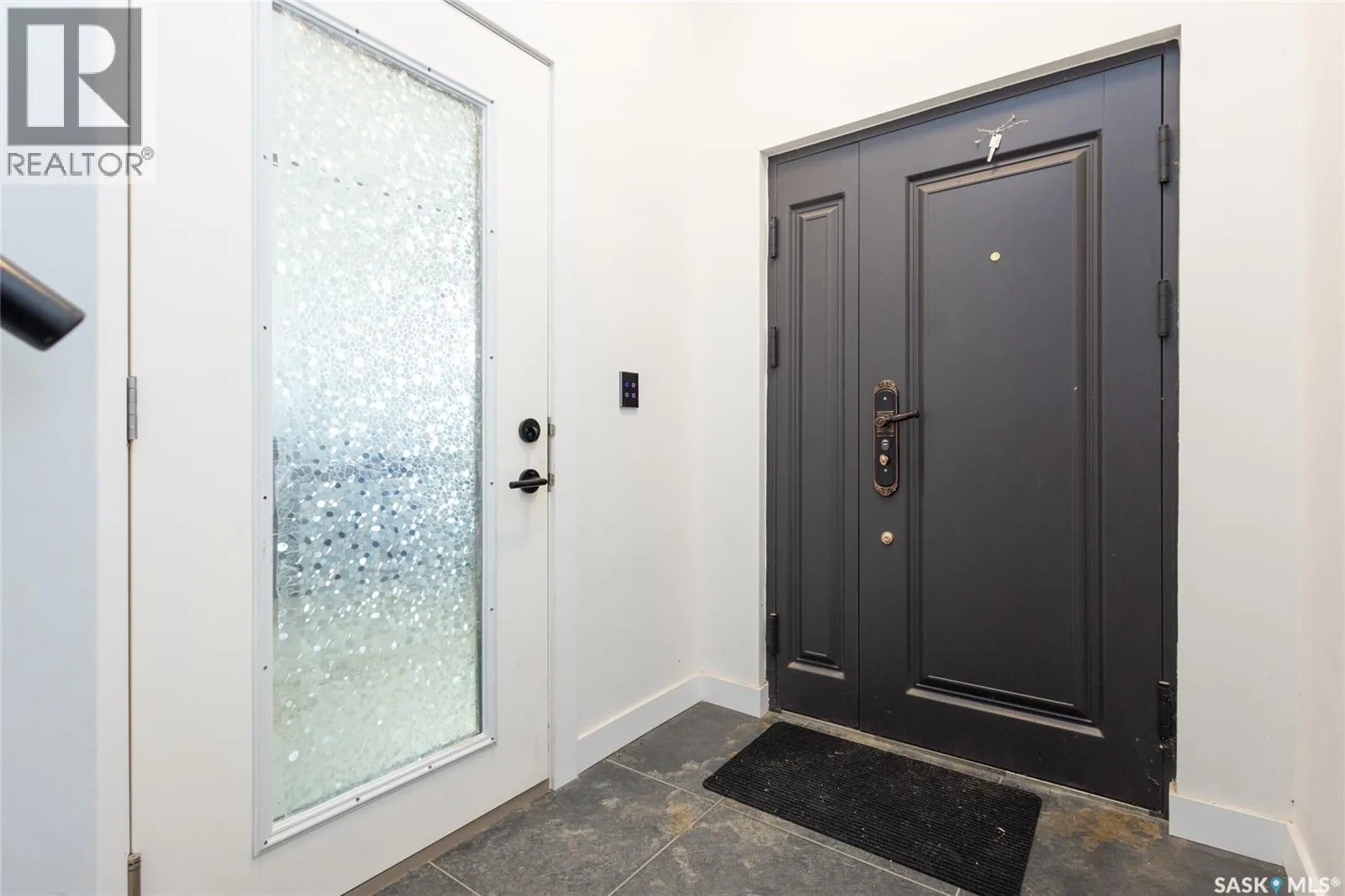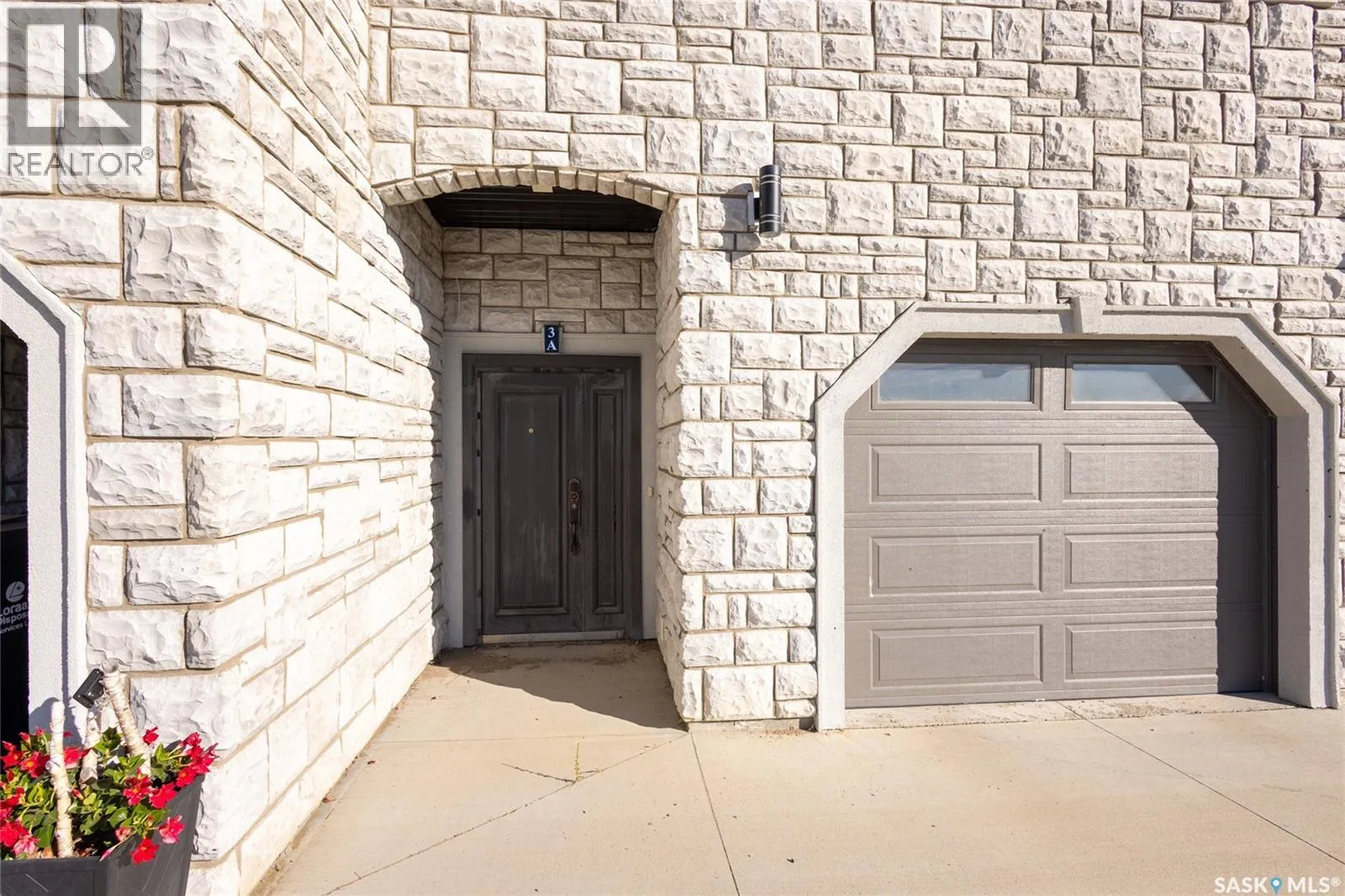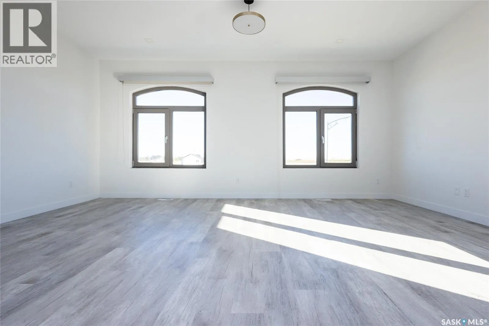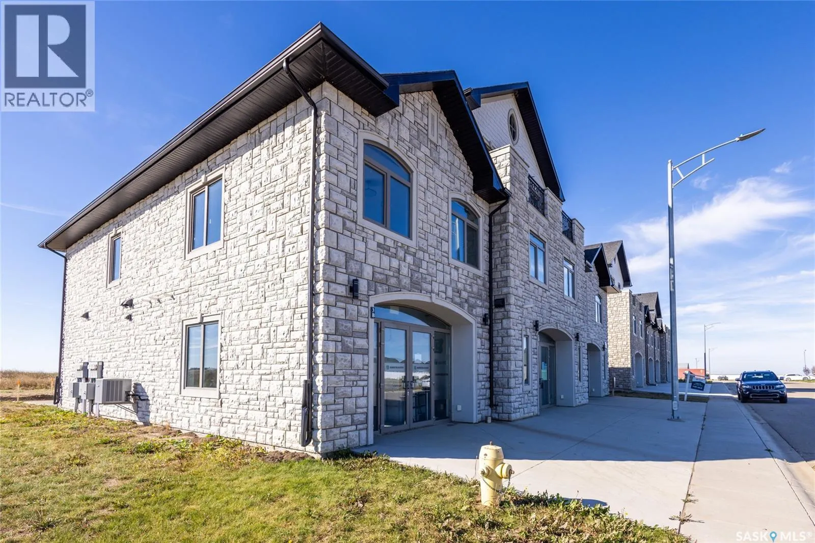 Rare found commercial and residential combined for sale. No Condo Fees. End Unit including side landscrape yard for personal use. First floor has commercial space: can be office or make a coffee shop. 2nd floor offers living area: large living room with around huge windows, beautiful kitchen has L-shape island and quartz counter tops. Master bedroom with walk-in closet and 3pc bathroom ensuite. One more good size bedroom. Very bright and great country view around. 9 feet ceiling and central A/C. Located just minutes away from Blackstrap Lake and about 20 minutes away from Saskatoon. (id:27476)