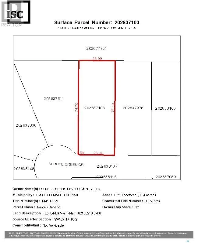 Spruce Creek is one of the most beautiful luxury developments, just outside the city. With lots ranging from 0.38 to 0.64 acres, there's plenty of space to develop whatever you and your builder can dream up. Just 7 mins to the East side of Regina, you get all the benefits of living away from the hustle, but with a short commute to all that the city has to offer. Spruce Creek has concrete (yes, concrete) roads and a community lake, creating a very unique and beautiful development. Lots can be purchased personally or by your builder. Some building requirements exist. There are still several lots remaining in this phase, check listings for additional options. Future phases include additional lots to the East including an additional lake. All prices are GST applicable. (id:27476)