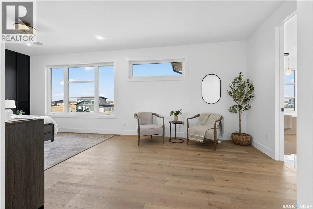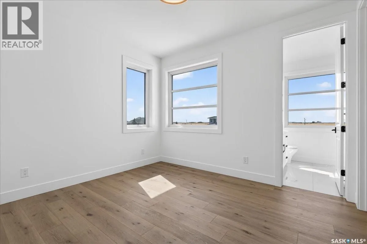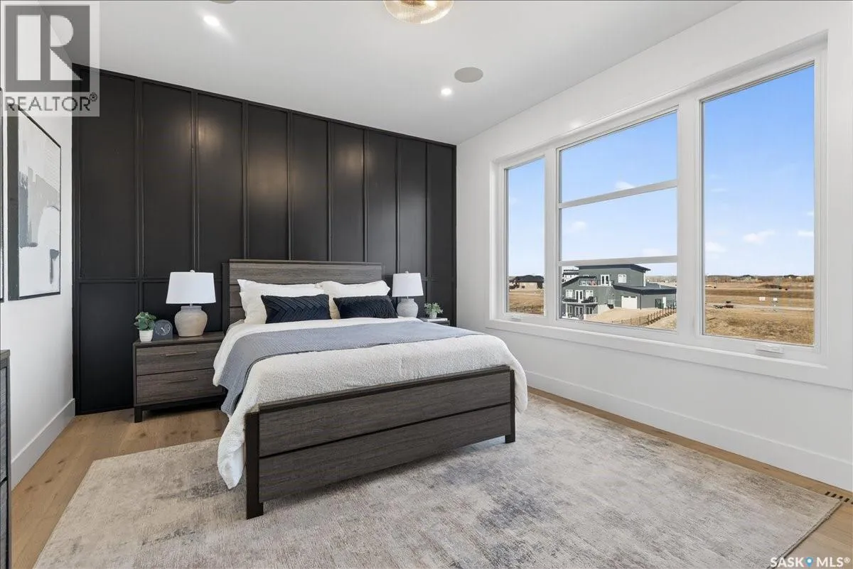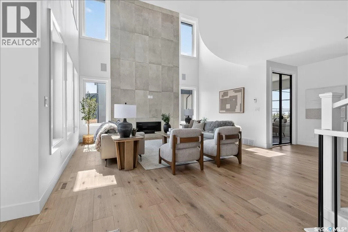 Spruce Creek Estates Experience true luxury living in this one-of-a-kind custom-built estate offering 5,140 sq ft of finished space, set against serene country views just 3 minutes from Pilot Butte and 10 minutes from Regina. Showcasing striking architecture with curved walls and high-end custom details, this home is a true showstopper. The grand custom three-story spiral staircase is the focal highlight, introducing the quality craftsmanship throughout. Featuring 6 bedrooms and 6 bathrooms, the home is finished with 8â interior doors, designer lighting, extensive custom cabinetry, quartz countertops with slab backsplashes, and oak hardwood flooring. The main floor impresses with 20â ceilings in the great room, a floor-to-ceiling surround gas fireplace, large windows (window treatments to be installed), a den, and dining area with access to a covered deck. The extensive chefâs kitchen includes an 8â quartz island, ceiling-height cabinetry, double fridge/freezer, 48â gas range, and built in coffee station, plus a back secondary spice kitchen. A pantry, mudroom, and access to the massive heated 4-car garage with 13â ceilings, in-floor heat, built in cabinetry and sink. Upstairs features a curved mezzanine, flex space, and 4 bedrooms, each with its own ensuite and walk-in closet. The primary suite offers a sitting area and spa-inspired ensuite with freestanding tub, custom shower, and a fully built-out walk-in closet. The fully developed walkout basement includes in-floor heating, 2 bedrooms, a rec room with gas fireplace, and an entertaining bar with island and wine storage, plus access to a covered concrete patio. This spacious lot offer options for a pool or a backyard oasis of your design. Additional features include dual HE furnaces & A/C units, zoned heating, built-in speakers, RO system, water softener, 200 amp panel, alarm system. Progressive New Home Warranty. A remarkable home blending luxury, design, and lifestyle and lower property taxes! (id:27476)
