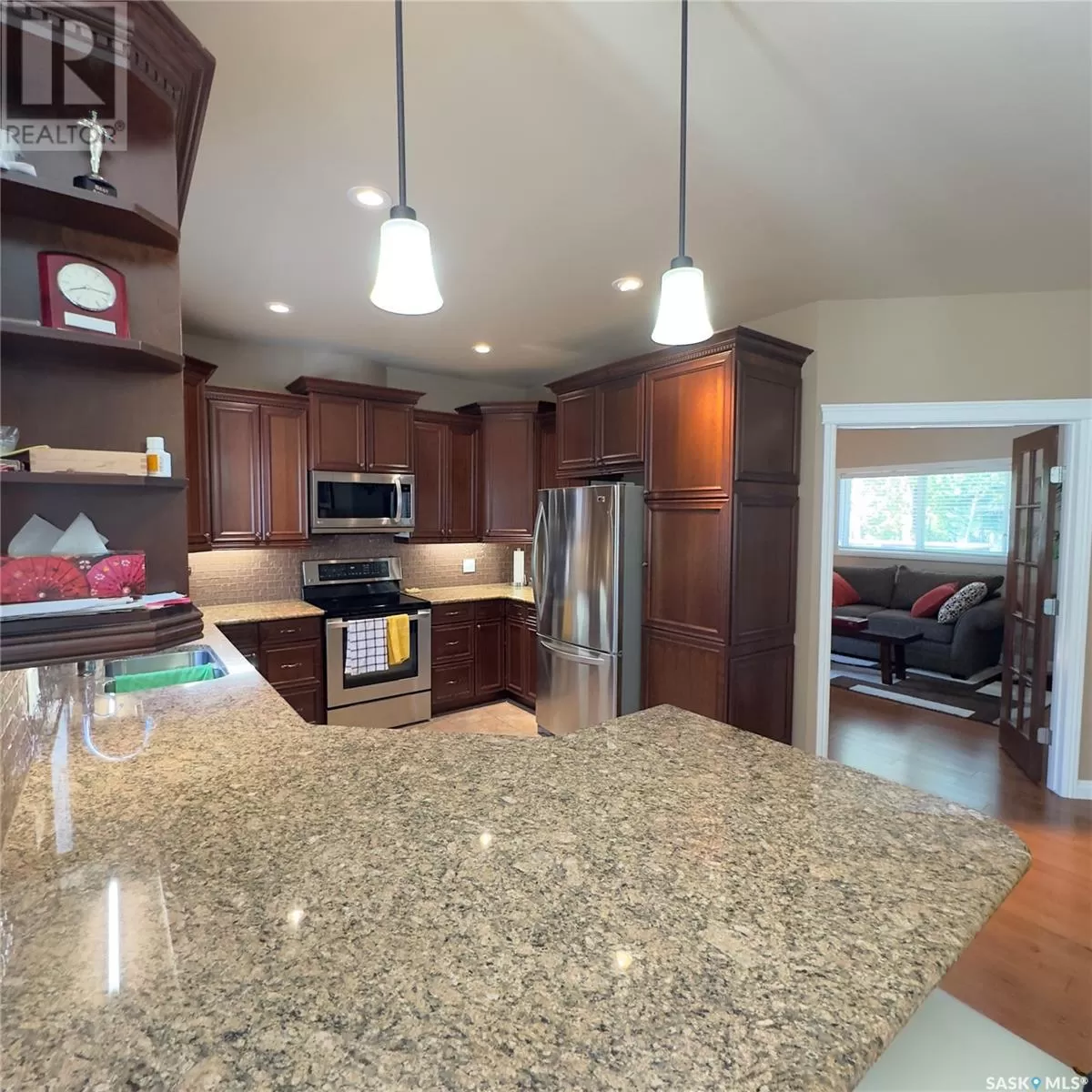 This four-season home beautiful two storey home located in Elk Ridge Resort is move in ready. The custom-built home offers more than 2900 square feet of finished living space above ground. Beautifully designed open concept walk up features hardwood floors, cherrywood cabinets, 9ft ceilings, wood burning fireplace, large den and primary bedroom with ensuite and jet tub. The striking kitchen offers custom cabinetry, granite countertops, stainless steel LG appliances and access to a sunroom off the living room and a spacious deck with natural gas BBQ hook-up. The main floor includes a beautiful family room, wet bar, gas fireplace, bedrooms, three piece bathroom, laundry and opens onto a large screened in porch which provides the perfect place to entertain family and friends This home comes with lots of extras including in floor heating throughout the main floor including all bathrooms and garage, reverse osmosis and water softener, heating and cooling central air conditioning, central vacuum, 20kw natural gas Generac generator, low maintenance yard with beautiful xeriscape, brand new Napoleon gas BBQ, snowblower and lawnmower and the upper floor thermostat can be monitored and controlled form a distance through WFIF. This home has everything you need. Close by you will find championship 27 hole golf course, spa, restaurants, nature trails, skating, show showing and more. This home is a must see. (id:27476)