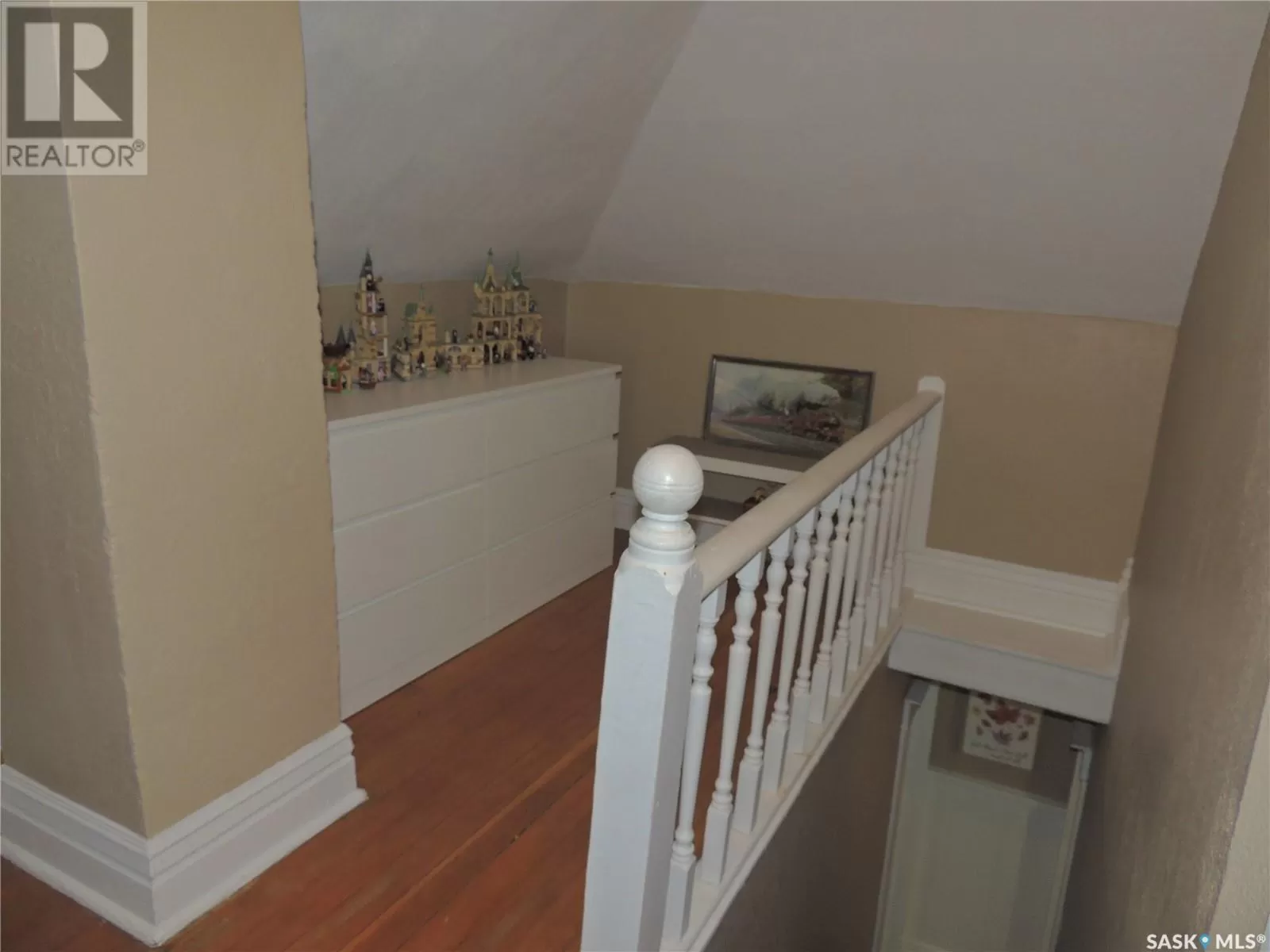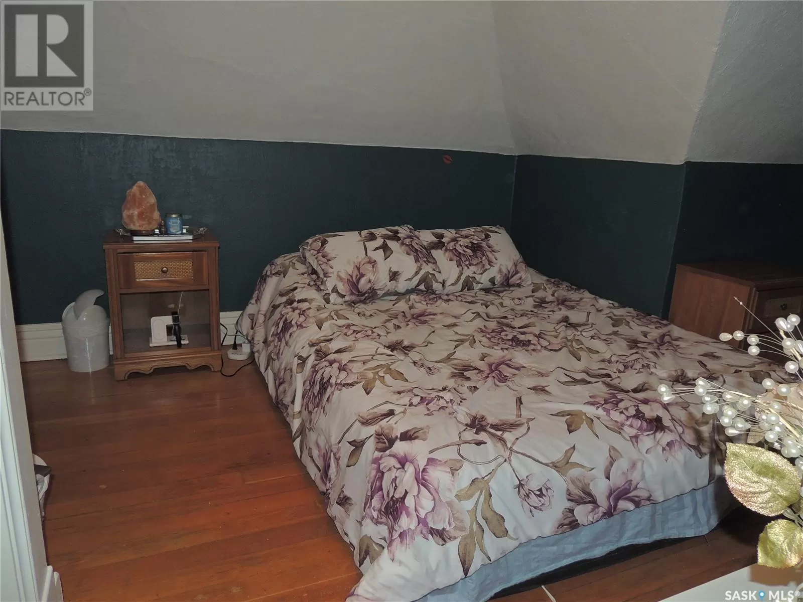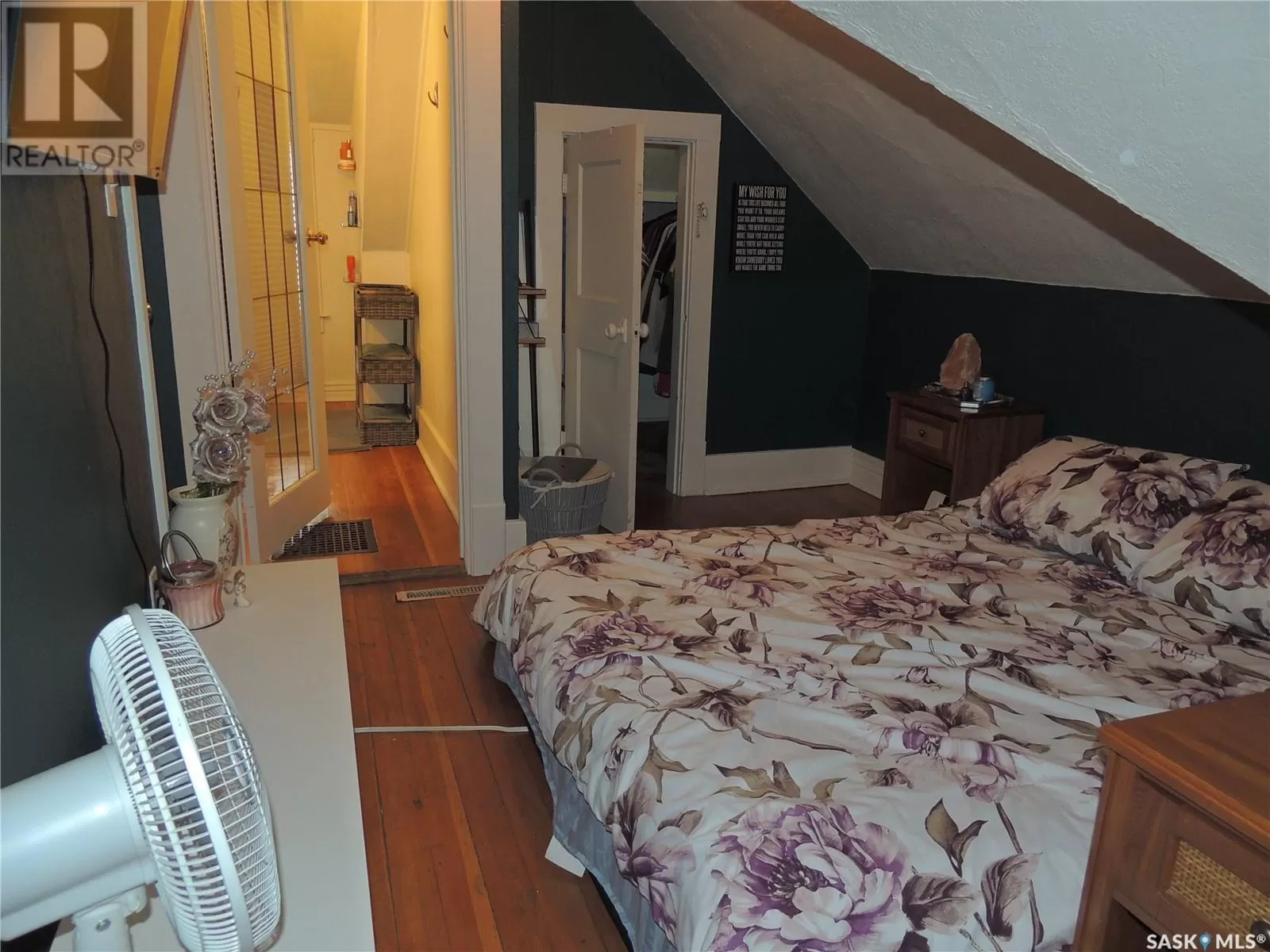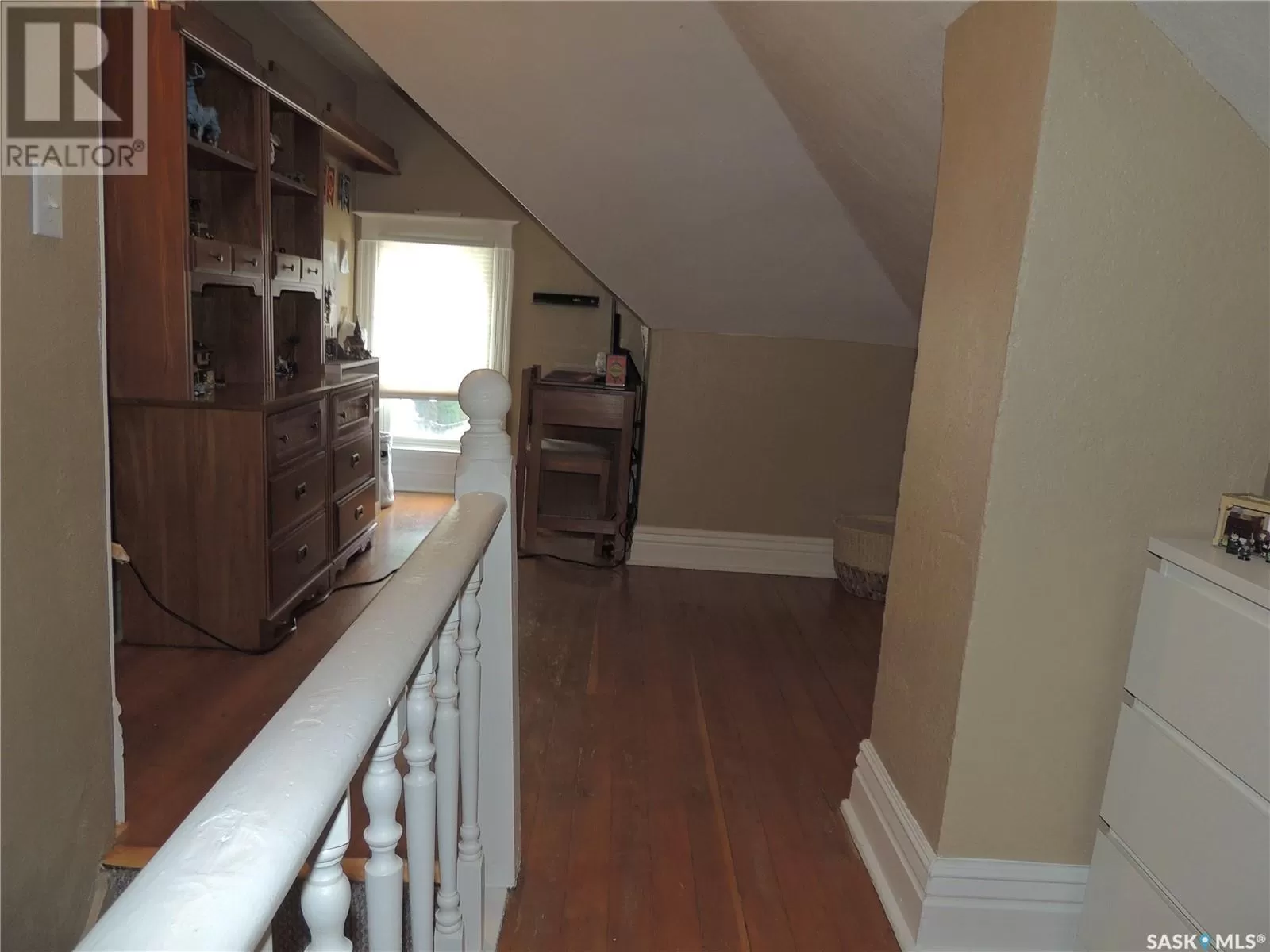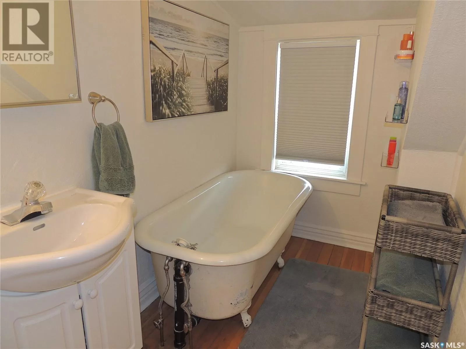 This home is full of character but still has many updates throughout the home. The front veranda is full of opening windows to let the breeze through on a beautiful Sask summer night. It has 2 original stained glass windows looking into the home. The kitchen has oak cabinets and is open to the rear living room. There is access off it to the back yard or directly into the basement. The main floor has 2 bedrooms and a 3 piece bathroom. The upstairs has an open loft area. The bedroom has a walk in closet and ensuite bathroom with original claw foot soaker tub. The basement is dry and great for storage and has the laundry area. The yard is well treed and has a single detached garage. The furnace was done in 2024, and the sewer line was done in 2025. (id:27476)