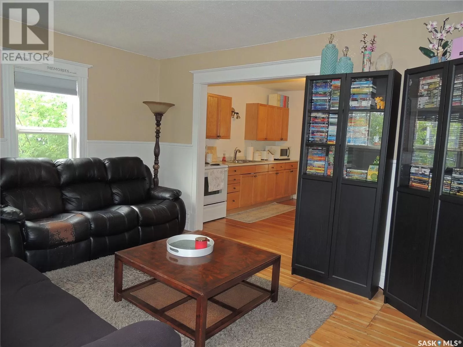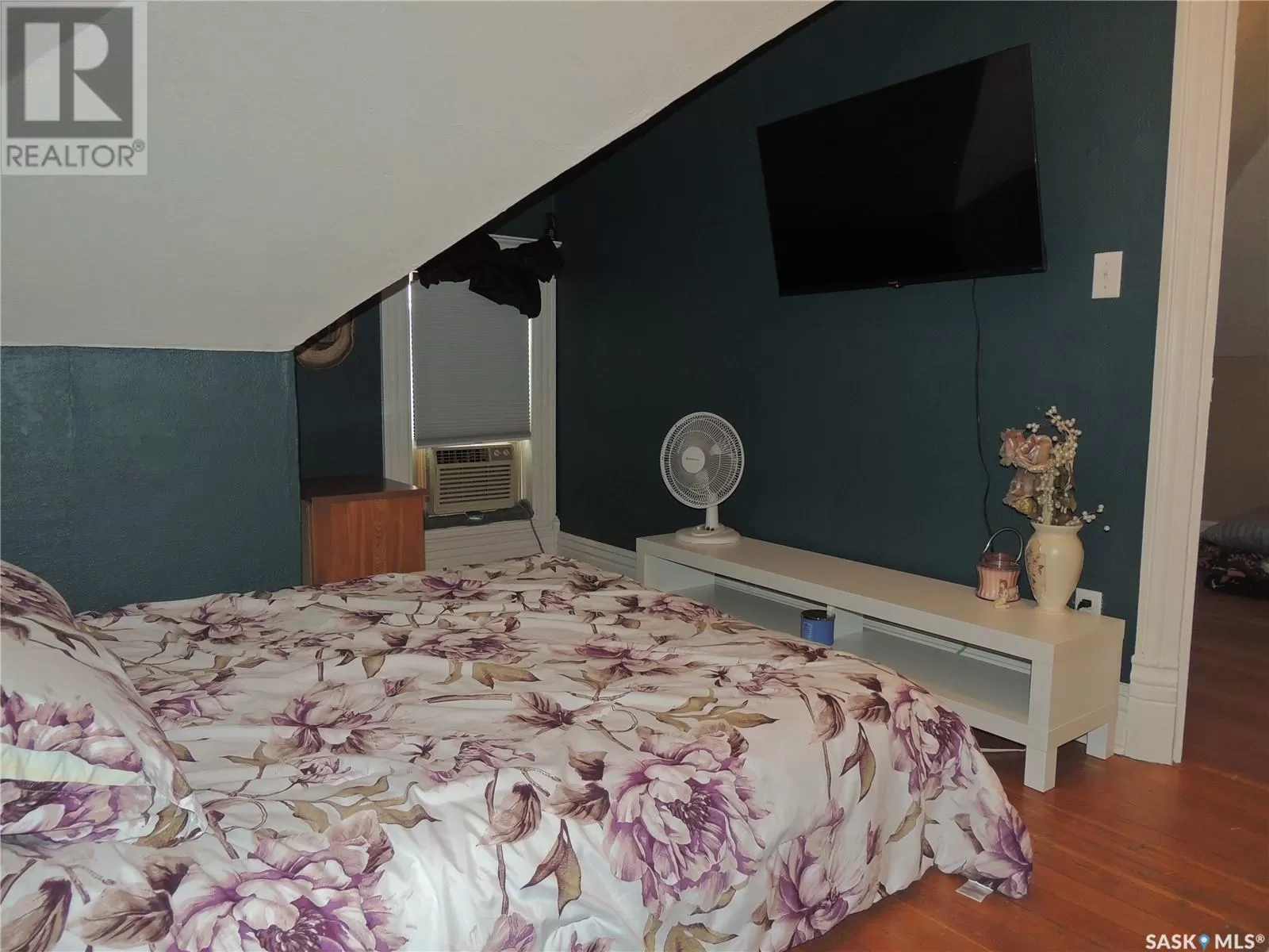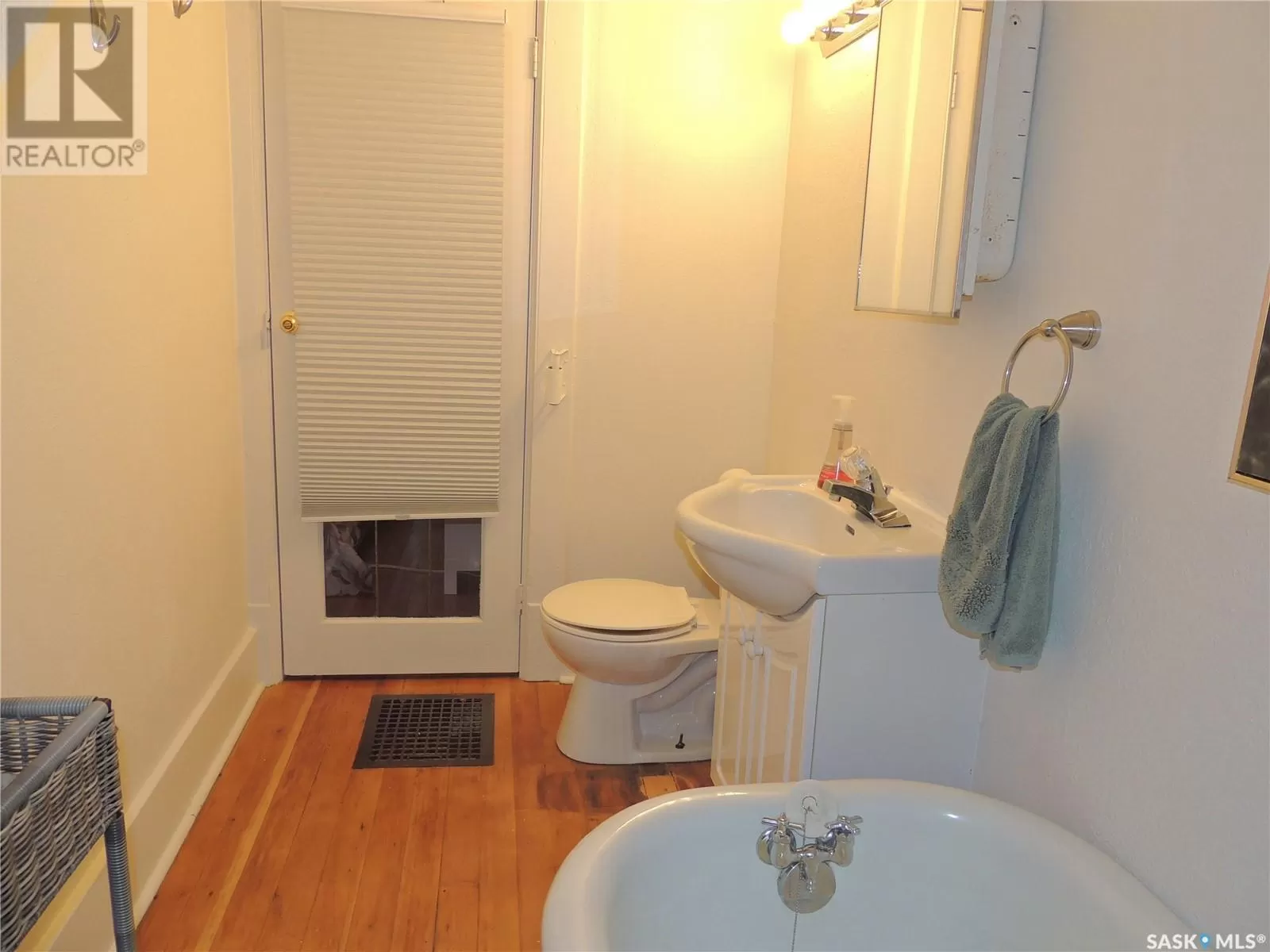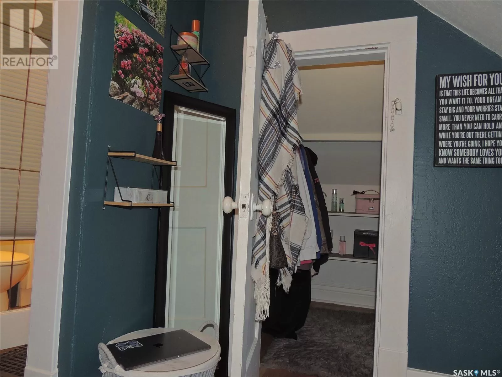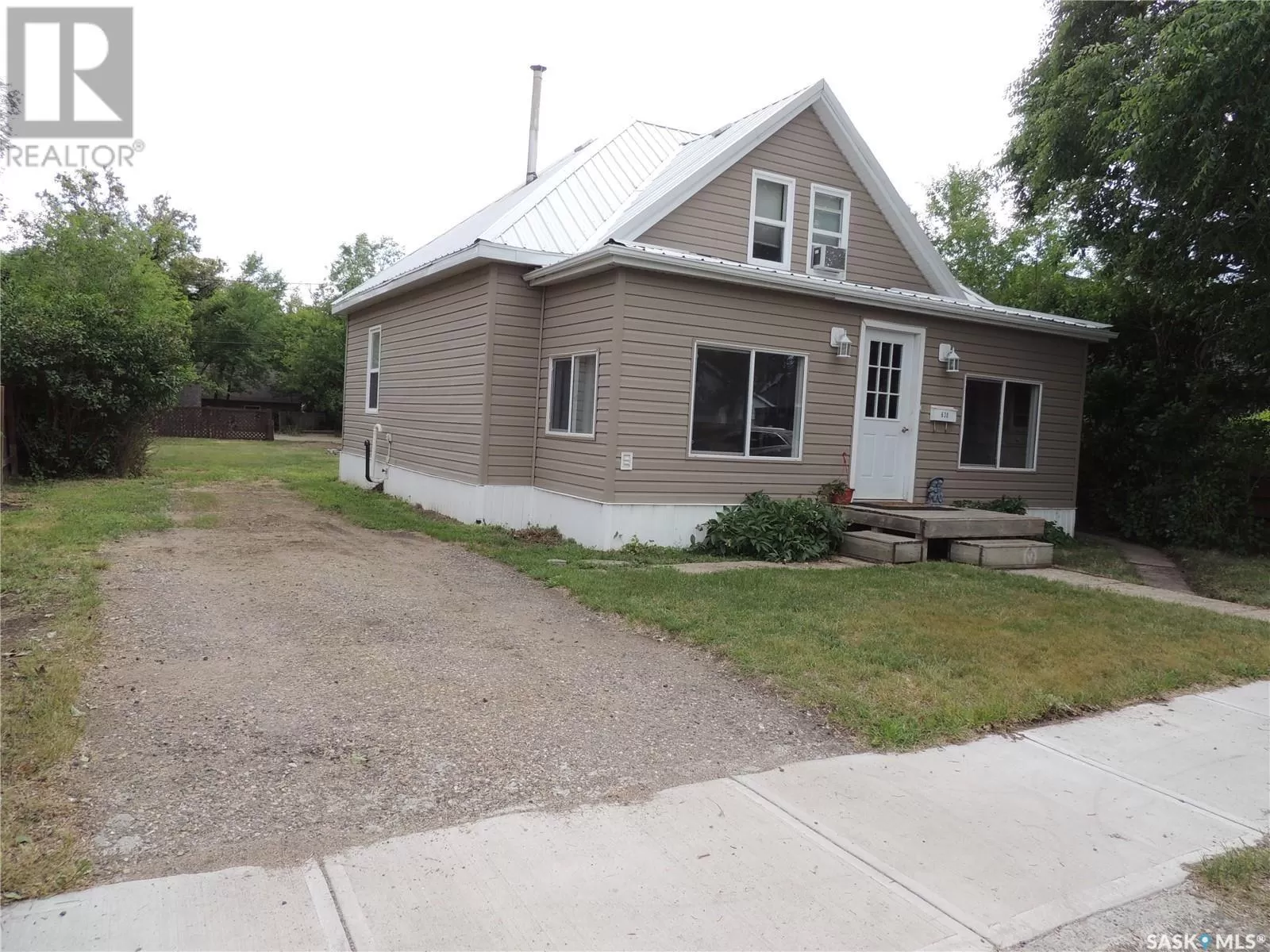 This home is full of character but still has many updates throughout the home. The front veranda is full of opening windows to let the breeze through on a beautiful Sask summer night. It has 2 original stained glass windows looking into the home. The kitchen has oak cabinets and is open to the rear living room. There is access off it to the back yard or directly into the basement. The main floor has 2 bedrooms and a 3 piece bathroom. The upstairs has an open loft area. The bedroom has a walk in closet and ensuite bathroom with original claw foot soaker tub. The basement is dry and great for storage and has the laundry area. The yard is well treed and has a single detached garage. The furnace was done in 2024, and the sewer line was done in 2025. (id:27476)