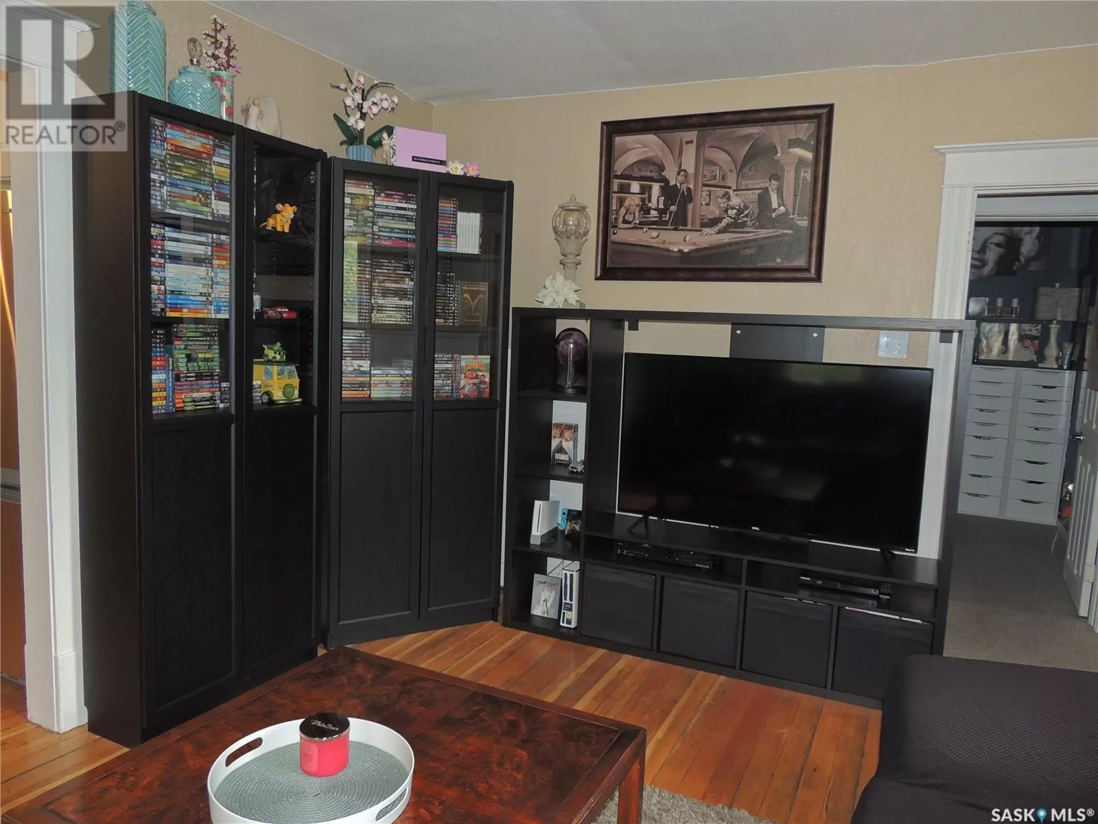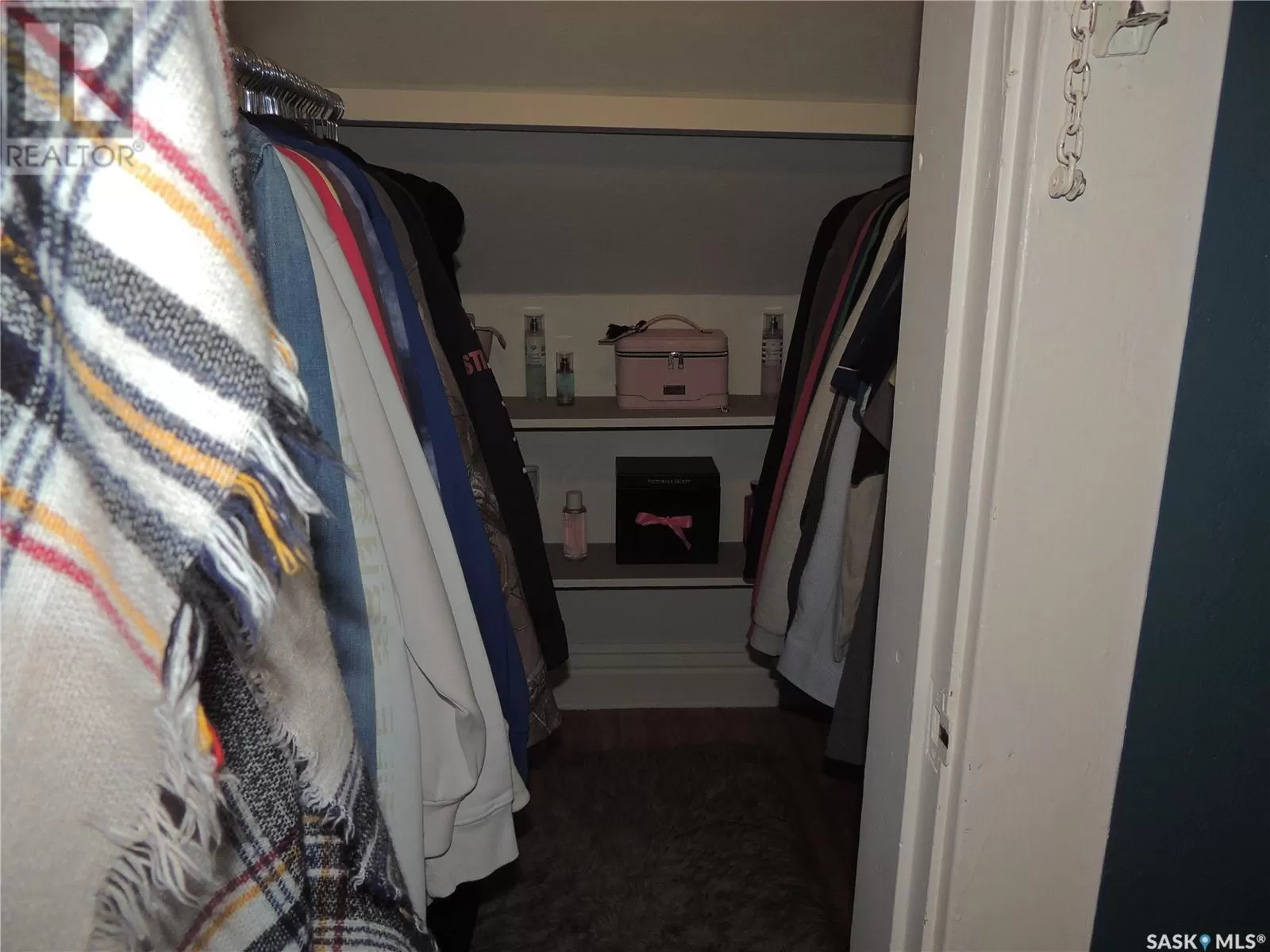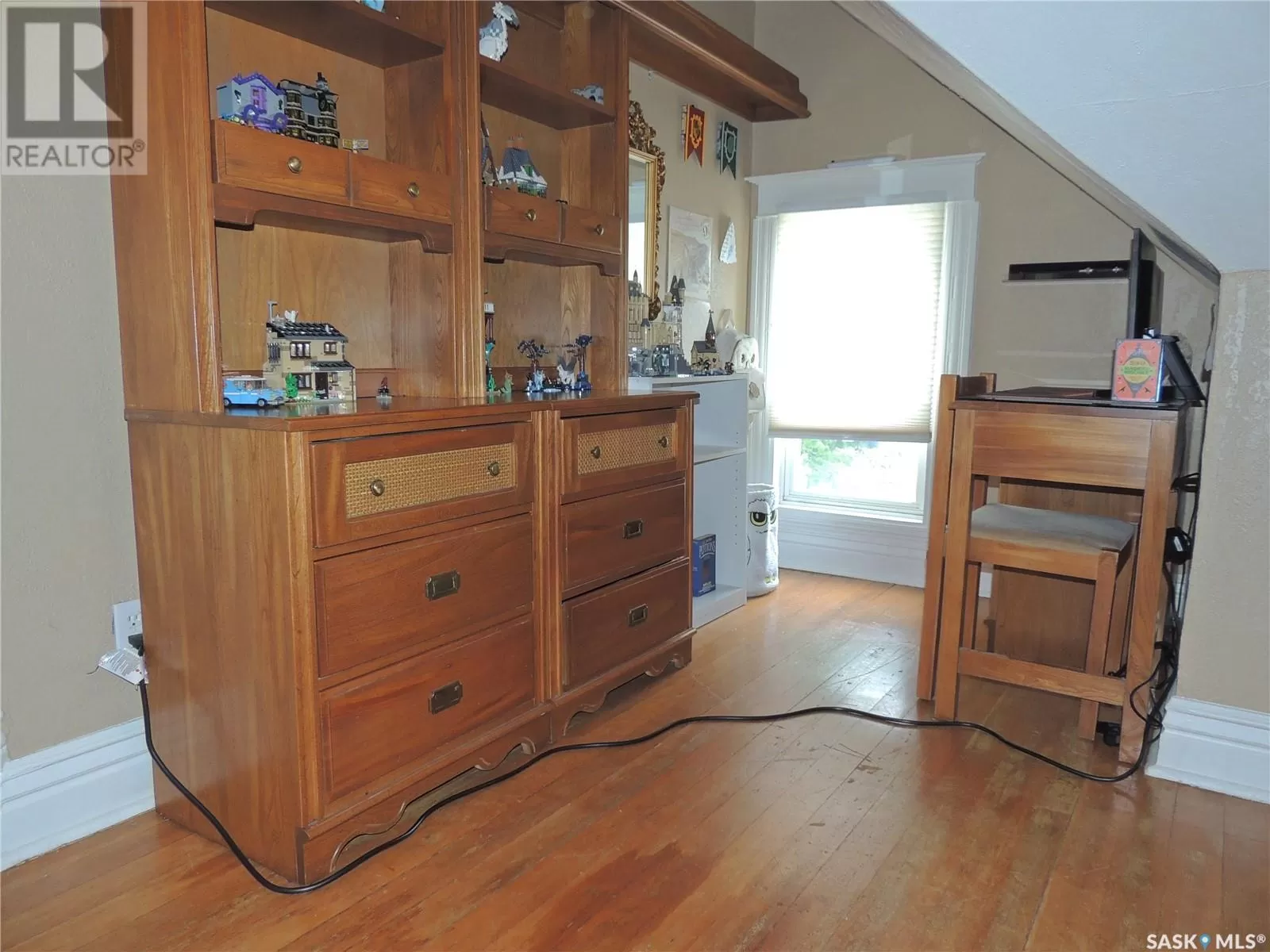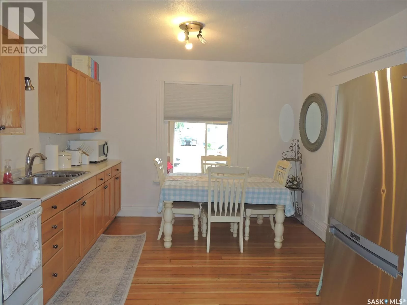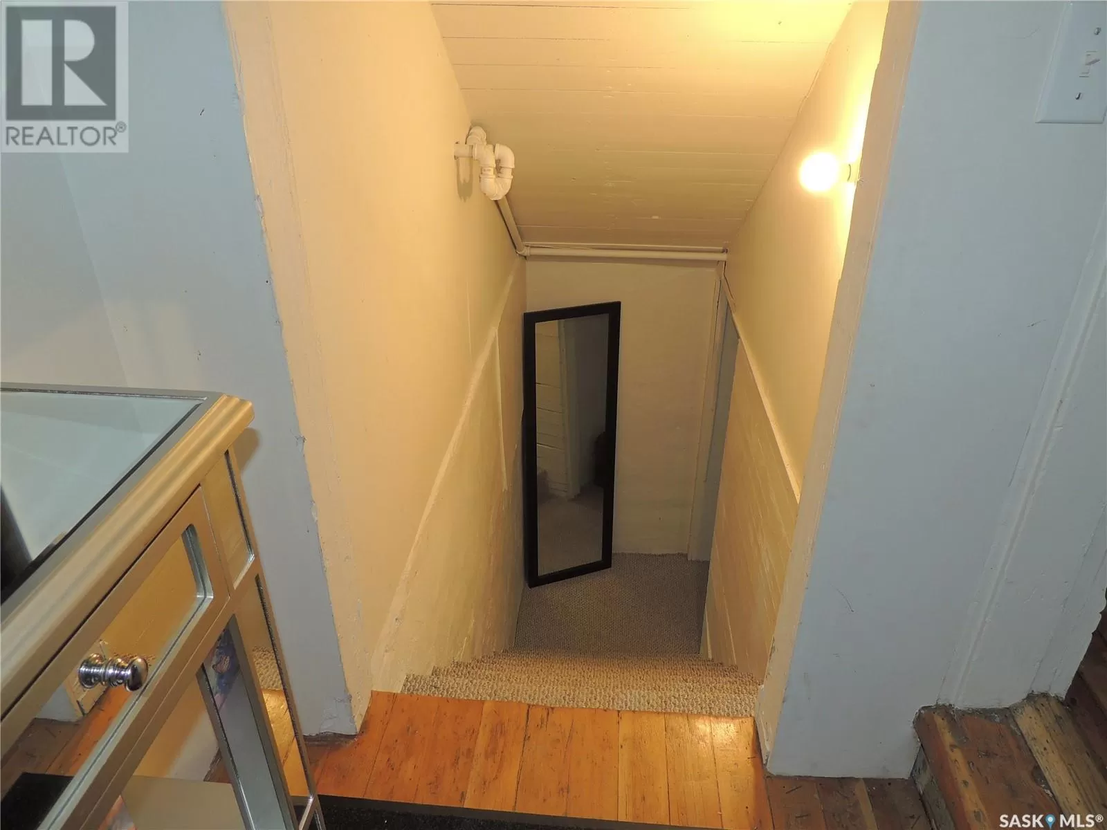 This home is full of character but still has many updates throughout the home. The front veranda is full of opening windows to let the breeze through on a beautiful Sask summer night. It has 2 original stained glass windows looking into the home. The kitchen has oak cabinets and is open to the rear living room. There is access off it to the back yard or directly into the basement. The main floor has 2 bedrooms and a 3 piece bathroom. The upstairs has an open loft area. The bedroom has a walk in closet and ensuite bathroom with original claw foot soaker tub. The basement is dry and great for storage and has the laundry area. The yard is well treed and has a single detached garage. The furnace was done in 2024, and the sewer line was done in 2025. (id:27476)