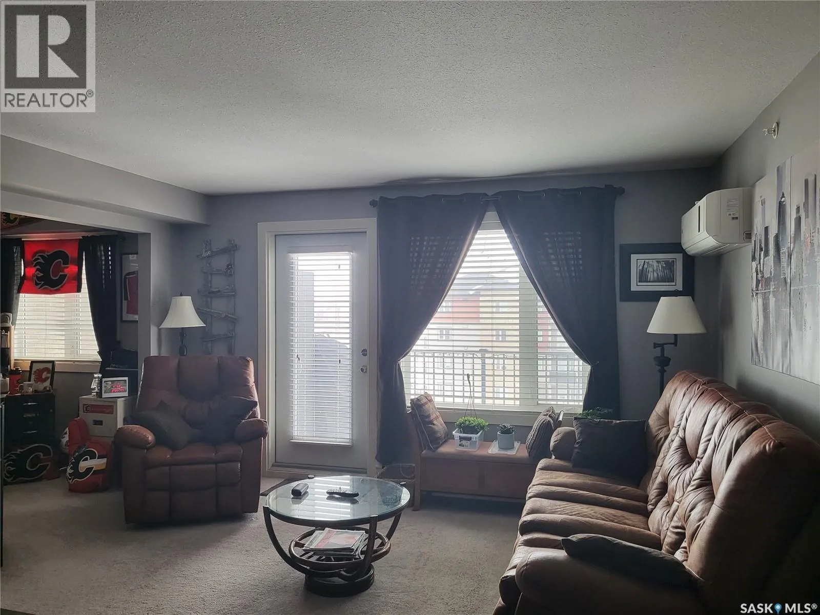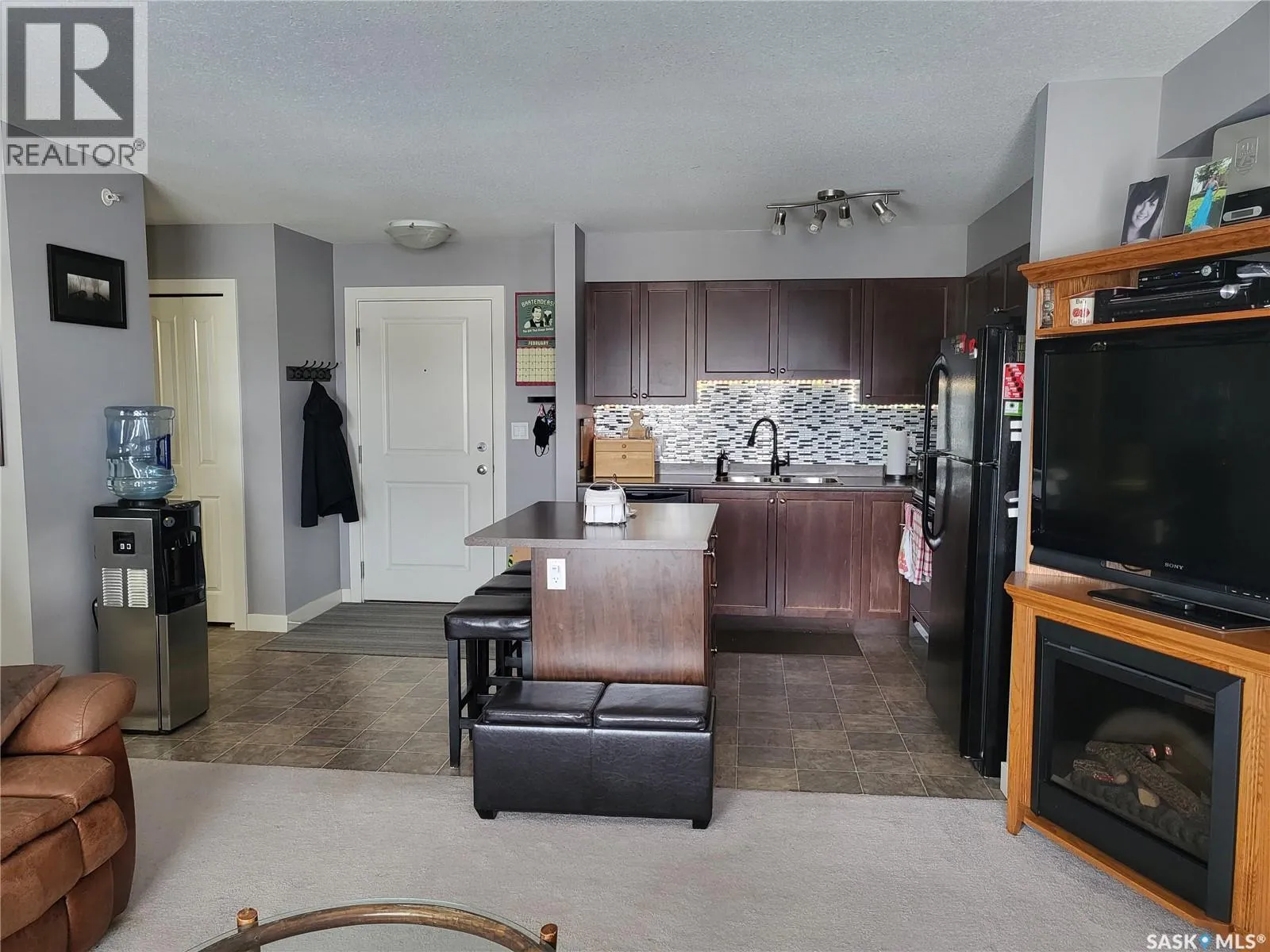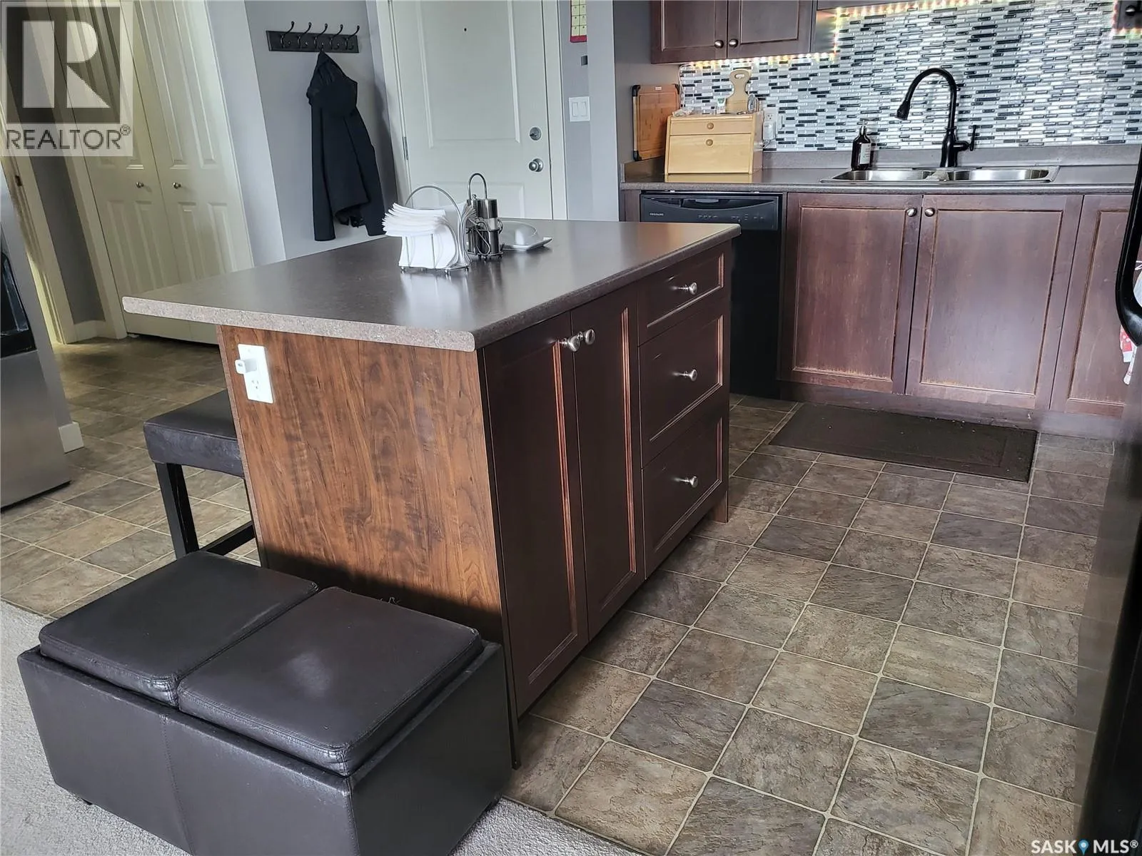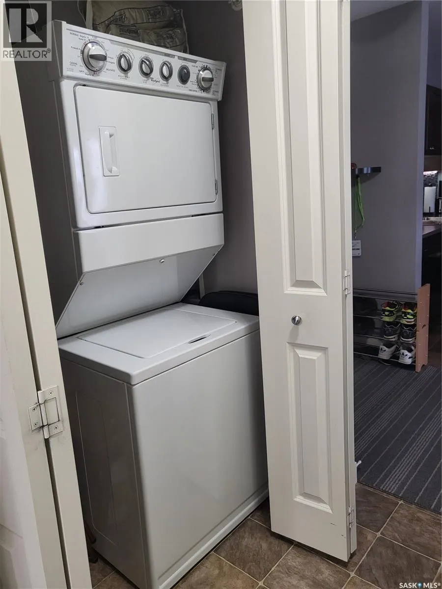 Fantastic view from this top floor condo located in Petterson Point. This one bedroom with a den is painted in a modern grey and grey carpet in the living room, den , bedroom and walk in closet! The kitchen has plenty of cupboards plus an island to sit at with additional storage space and all appliances. The bedroom is large enough for a queen sized bed plus dresser and nigh stand. The walk in closet is spacious enough for all your clothing attire and more! Enter your full bathroom from 2 different ways! There is also a front closet for all your jackets and shoes and another adjacent closet with a stacking washer/dryer! To finish off this condo is a large balcony to sit out on and enjoy! Call to view today!! (id:27476)