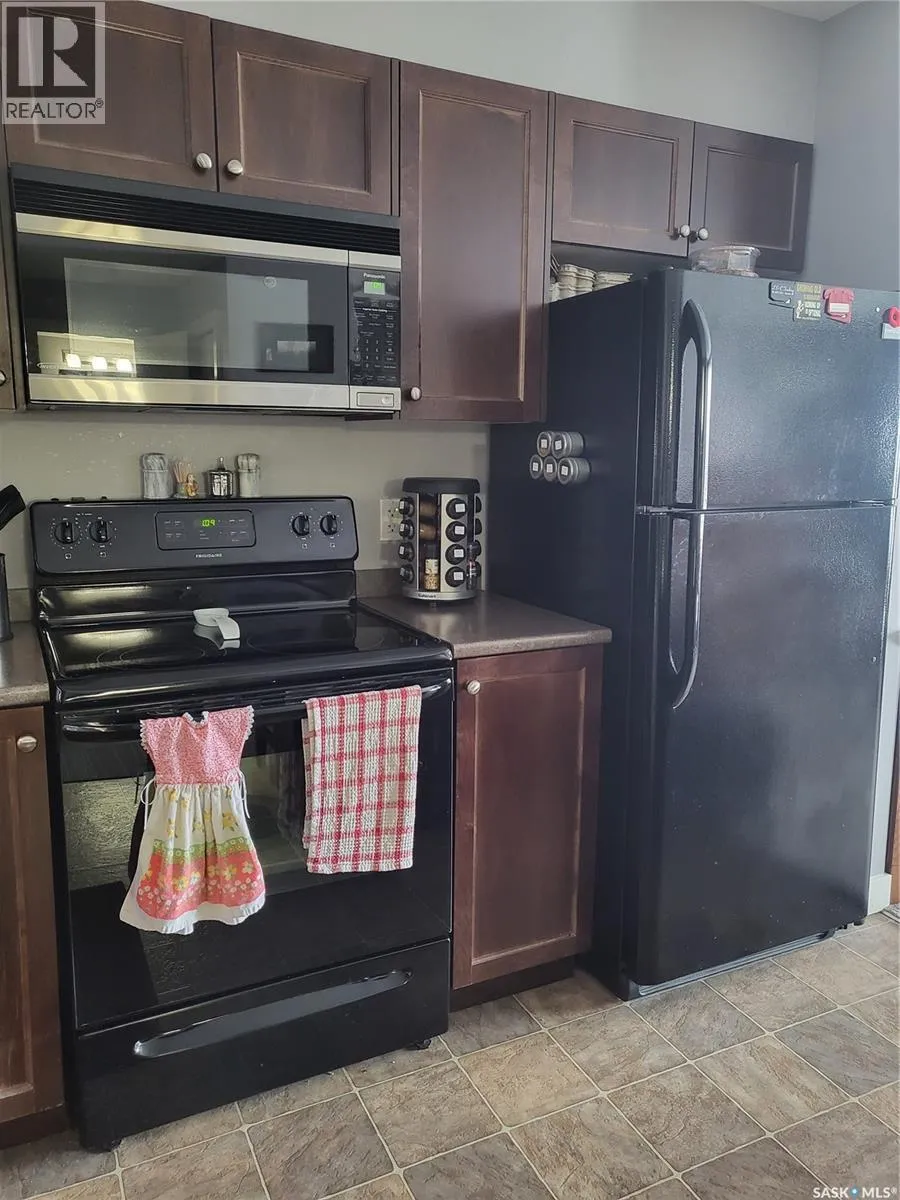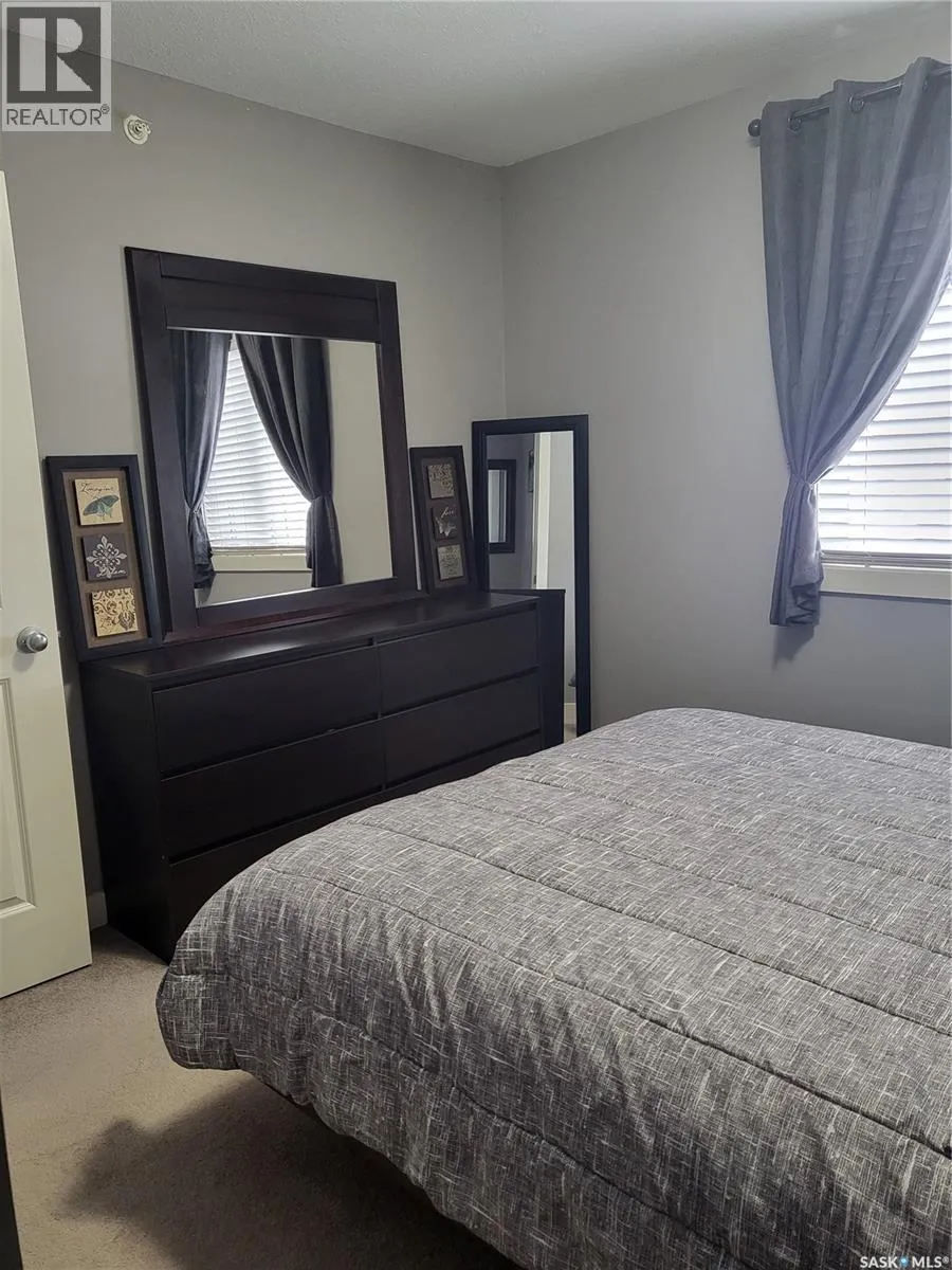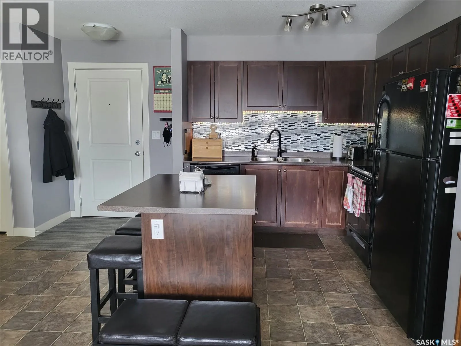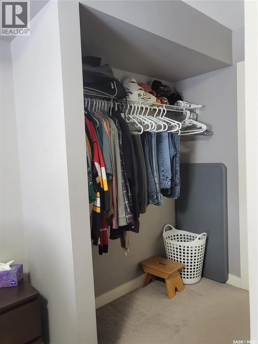 Fantastic view from this top floor condo located in Petterson Point. This one bedroom with a den is painted in a modern grey and grey carpet in the living room, den , bedroom and walk in closet! The kitchen has plenty of cupboards plus an island to sit at with additional storage space and all appliances. The bedroom is large enough for a queen sized bed plus dresser and nigh stand. The walk in closet is spacious enough for all your clothing attire and more! Enter your full bathroom from 2 different ways! There is also a front closet for all your jackets and shoes and another adjacent closet with a stacking washer/dryer! To finish off this condo is a large balcony to sit out on and enjoy! Call to view today!! (id:27476)