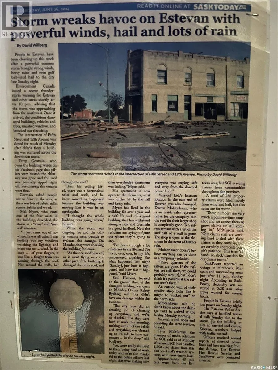 Lots 21-24, Block 13 , Plan No. 12538, Ext 33-35Lots 44-46, Block 13, Plan No. 101261089, Ext 31-32 ATTENTION INVESTORS & CONTRACTORS! Exceptional opportunity in the heart of Downtown Estevan! This 12,000 sq. ft. (100â x 120â) commercial lot is ideally located just one block from the cityâs four major banks and a variety of retail stores â a prime location for your next investment or redevelopment project. The existing building sustained significant damage in the June 2024 hailstorm and requires extensive renovations. Price reflects lot value. A Phase 1 Environmental Report is included. With its excellent downtown exposure and flexible layout, the property offers great revenue potential, featuring multiple options for main floor retail space and upper-level living quarters. Realtor Owned Property. (id:27476)
