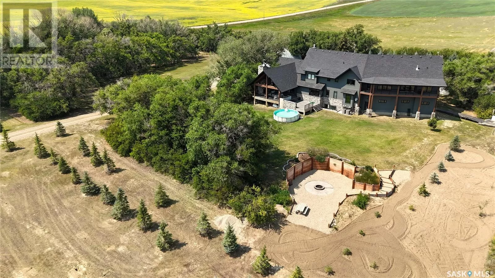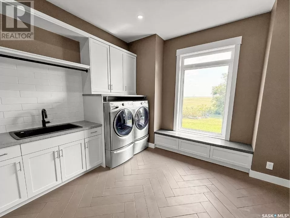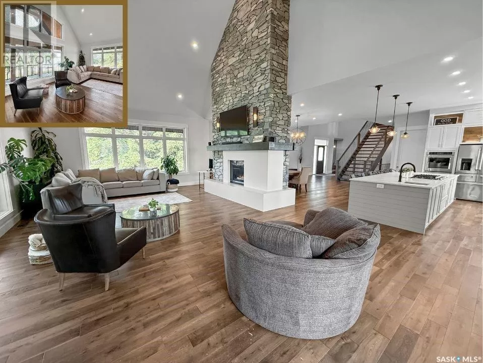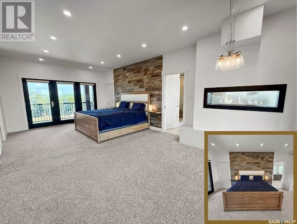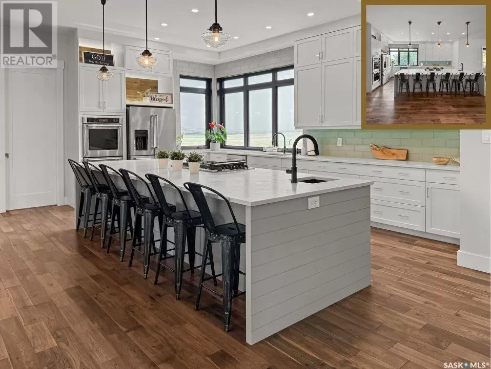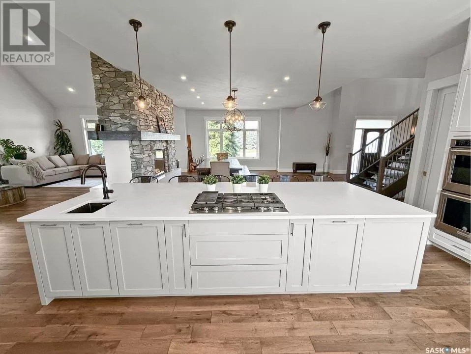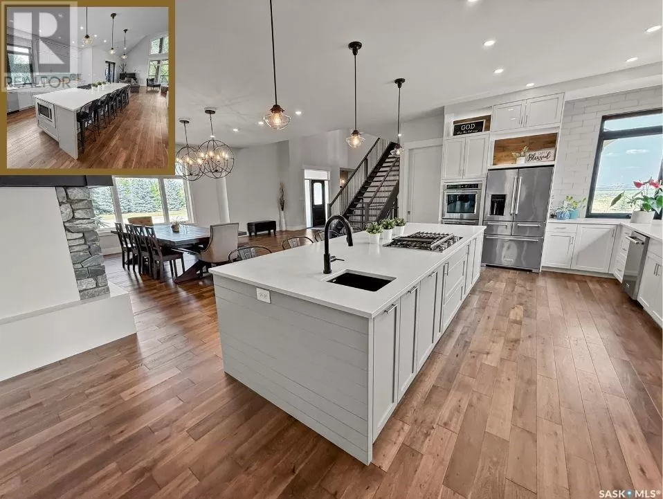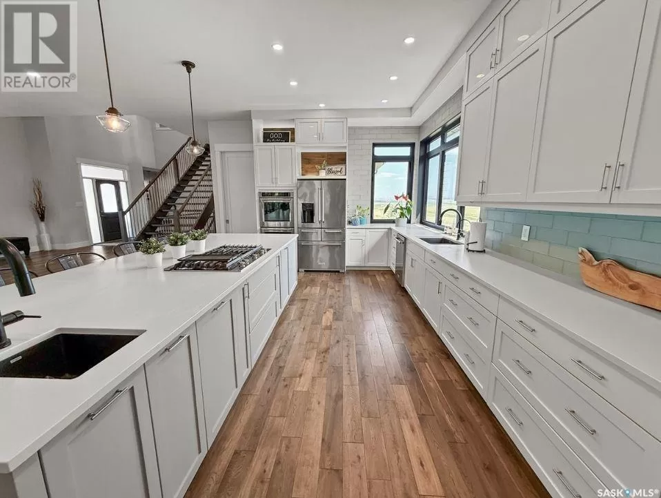 East on #1 Highway turn North prior to Rush Lake onto RR #3115, acreage on east side of road Welcome to a showstopping acreage just minutes from townâwhere luxury, functionality & wide-open spaces come together in the most stunning way. Built in 2017, this exceptional 2-storey home offers over 4,400 sq ft of finished living space, a heated triple attached garage & outdoor amenities that are next-level. Step into the oversized entry & prepare to be wowed by the open-riser staircase with floating treads leading both up & down. The heart of the home is a grand open-concept kitchen, dining room & great room with vaulted ceilings, floor-to-ceiling windows & a dramatic double-sided gas fireplace that anchors the living space & formal dining area. Gorgeous hardwood floors flow throughout the main. The dream kitchen is magazine-worthyâquartz counters, oversized sit-up island w prep sink, 5-burner gas range, BI ovens, full appliance pkg & a jaw-dropping butlerâs pantry. Wall-to-wall windows bring the outdoors in, garden doors lead to a vaulted, covered 2-tiered deck featuring a stone-accented wood-burning fireplace. This is outdoor living at its finestâdesigned for gathering, relaxing & unobstructed country views. A full 3-pc bath & large laundry/mudroom off the garage complete the main floor. Upstairs, the primary suite is a true retreatâcontemporary black French doors open to both north & south-facing balconies. Enjoy his & hers walk-in closets, a spa-inspired ensuite w freestanding tub, double vanities, tiled shower & a 2-sided gas fireplace shared w the bedroom. A home gym w balcony access, open-concept office, 3 additional bedrooms (one oversized), & a 5-pc main bath round out this level. The partially finished basement offers a huge family/games room, 2 more bedrooms & an upgraded mechanical room. Outside, enjoy a beautifully treed yard, firepit, above-ground pool, 40x60 Quonset converted to an indoor rink + outdoor rink. The well offers ample water. This one-of-a-kind acreage offers luxury, lifestyle & spaceâinside & out. (id:27476)