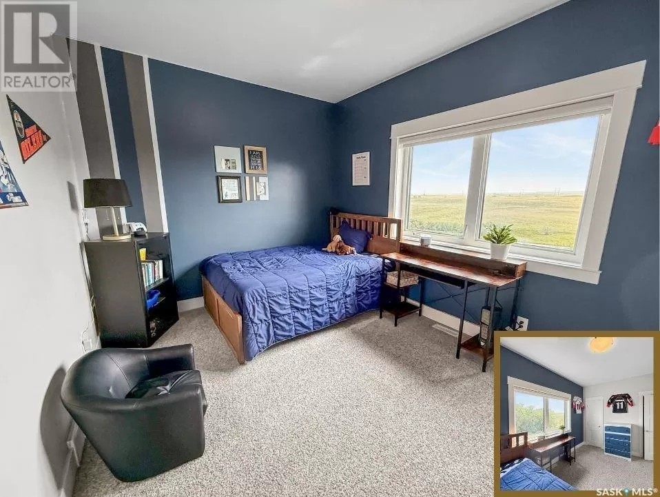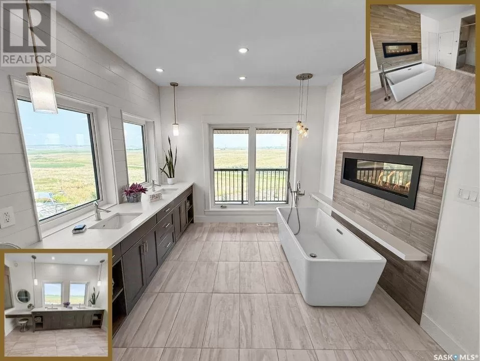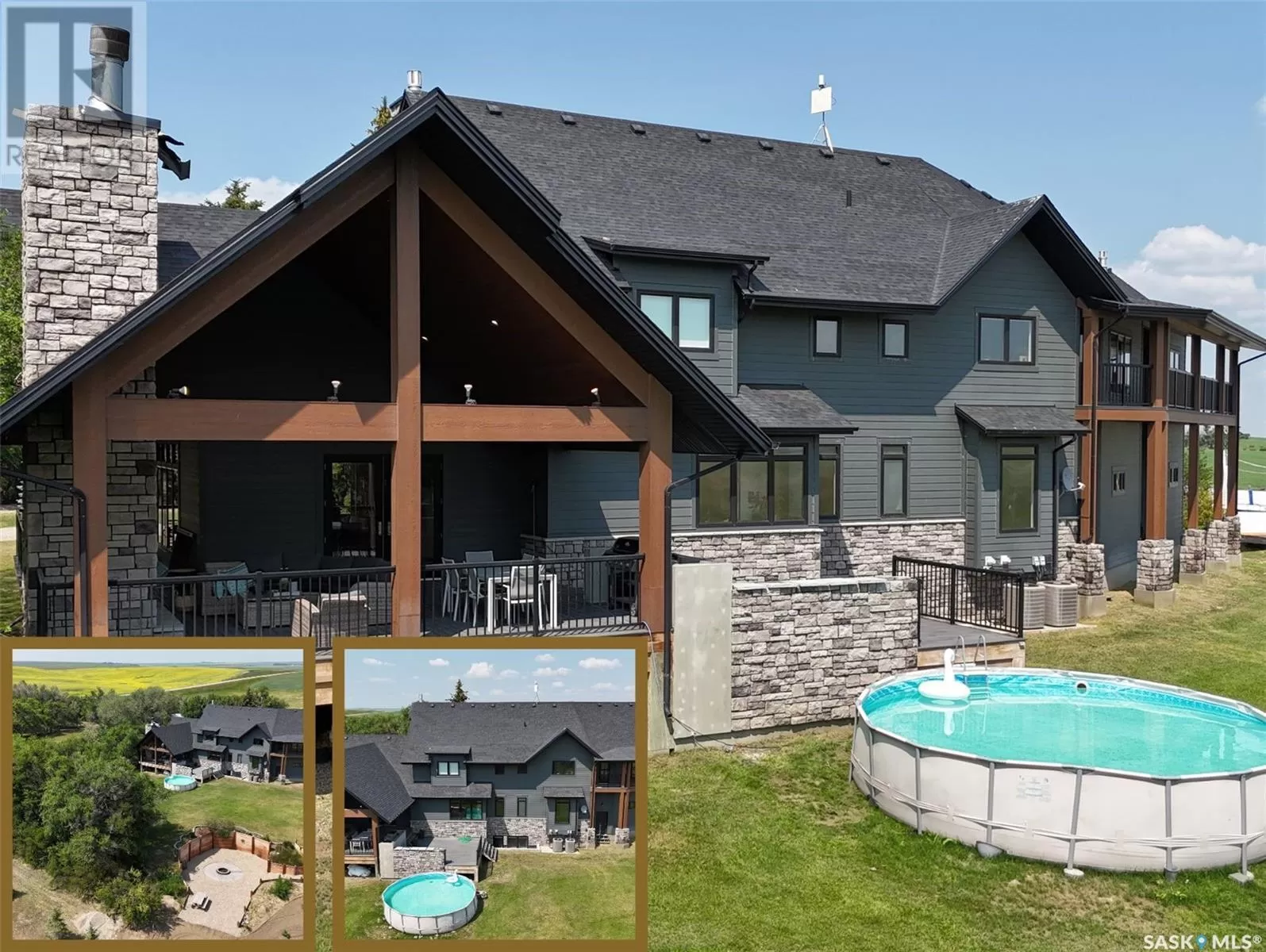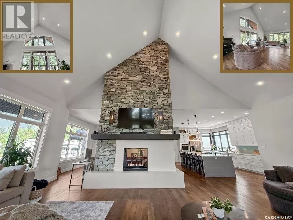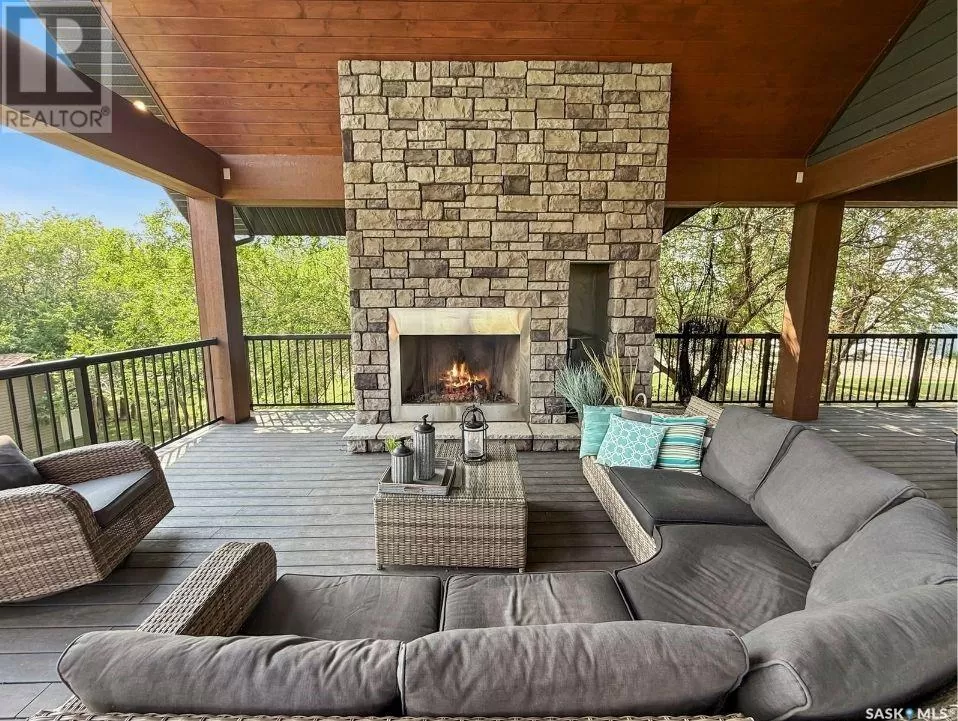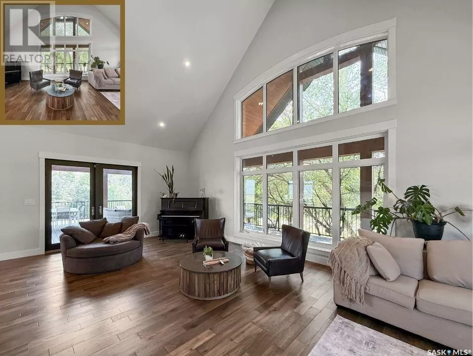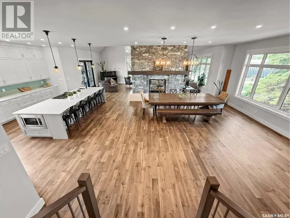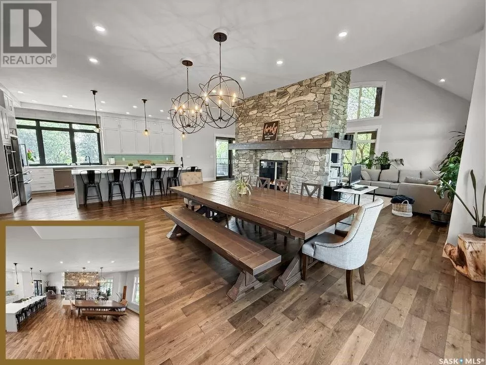 East on #1 Highway turn North prior to Rush Lake onto RR #3115, acreage on east side of road Welcome to a showstopping acreage just minutes from townâwhere luxury, functionality & wide-open spaces come together in the most stunning way. Built in 2017, this exceptional 2-storey home offers over 4,400 sq ft of finished living space, a heated triple attached garage & outdoor amenities that are next-level. Step into the oversized entry & prepare to be wowed by the open-riser staircase with floating treads leading both up & down. The heart of the home is a grand open-concept kitchen, dining room & great room with vaulted ceilings, floor-to-ceiling windows & a dramatic double-sided gas fireplace that anchors the living space & formal dining area. Gorgeous hardwood floors flow throughout the main. The dream kitchen is magazine-worthyâquartz counters, oversized sit-up island w prep sink, 5-burner gas range, BI ovens, full appliance pkg & a jaw-dropping butlerâs pantry. Wall-to-wall windows bring the outdoors in, garden doors lead to a vaulted, covered 2-tiered deck featuring a stone-accented wood-burning fireplace. This is outdoor living at its finestâdesigned for gathering, relaxing & unobstructed country views. A full 3-pc bath & large laundry/mudroom off the garage complete the main floor. Upstairs, the primary suite is a true retreatâcontemporary black French doors open to both north & south-facing balconies. Enjoy his & hers walk-in closets, a spa-inspired ensuite w freestanding tub, double vanities, tiled shower & a 2-sided gas fireplace shared w the bedroom. A home gym w balcony access, open-concept office, 3 additional bedrooms (one oversized), & a 5-pc main bath round out this level. The partially finished basement offers a huge family/games room, 2 more bedrooms & an upgraded mechanical room. Outside, enjoy a beautifully treed yard, firepit, above-ground pool, 40x60 Quonset converted to an indoor rink + outdoor rink. The well offers ample water. This one-of-a-kind acreage offers luxury, lifestyle & spaceâinside & out. (id:27476)