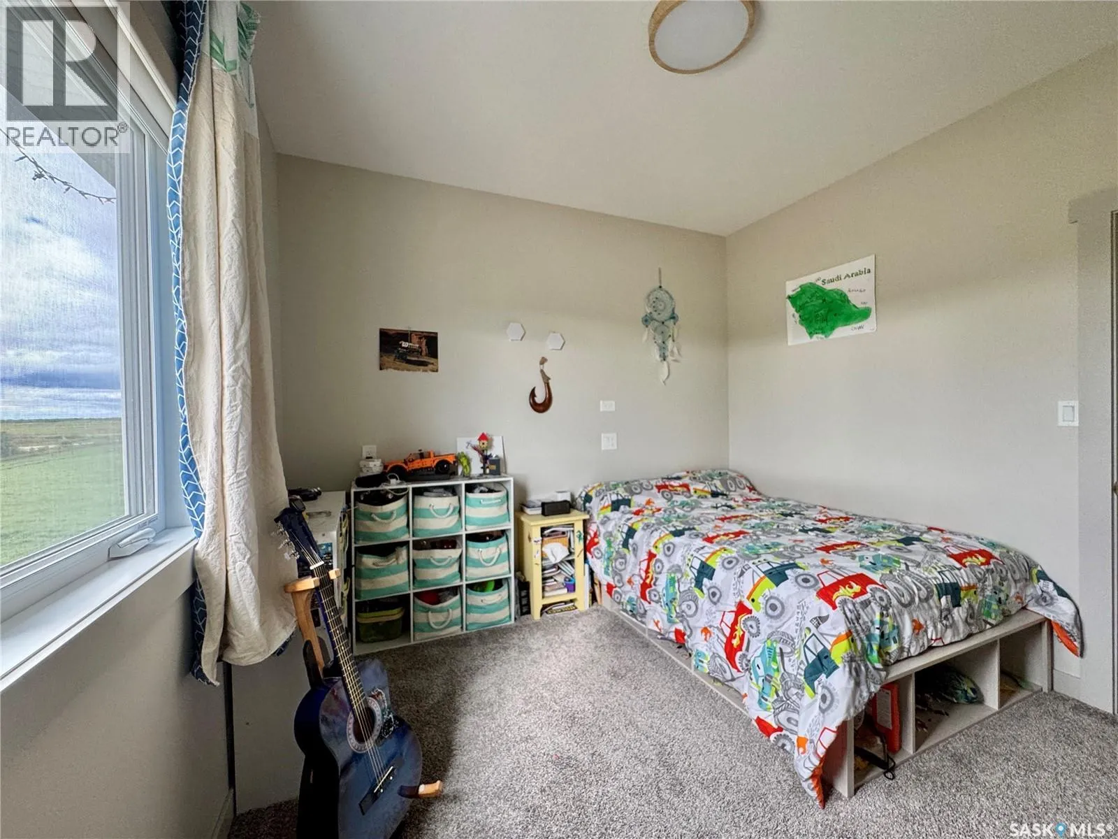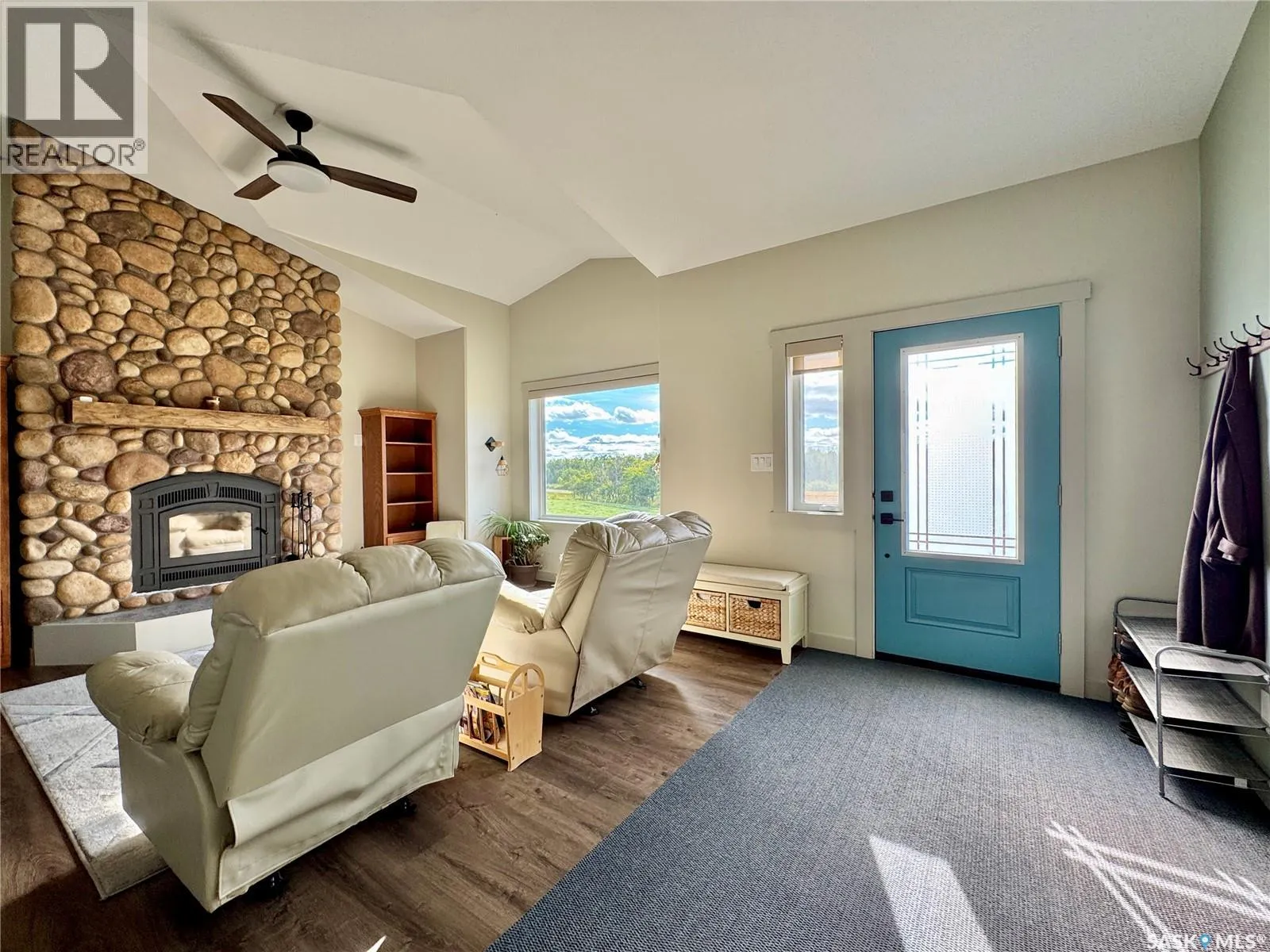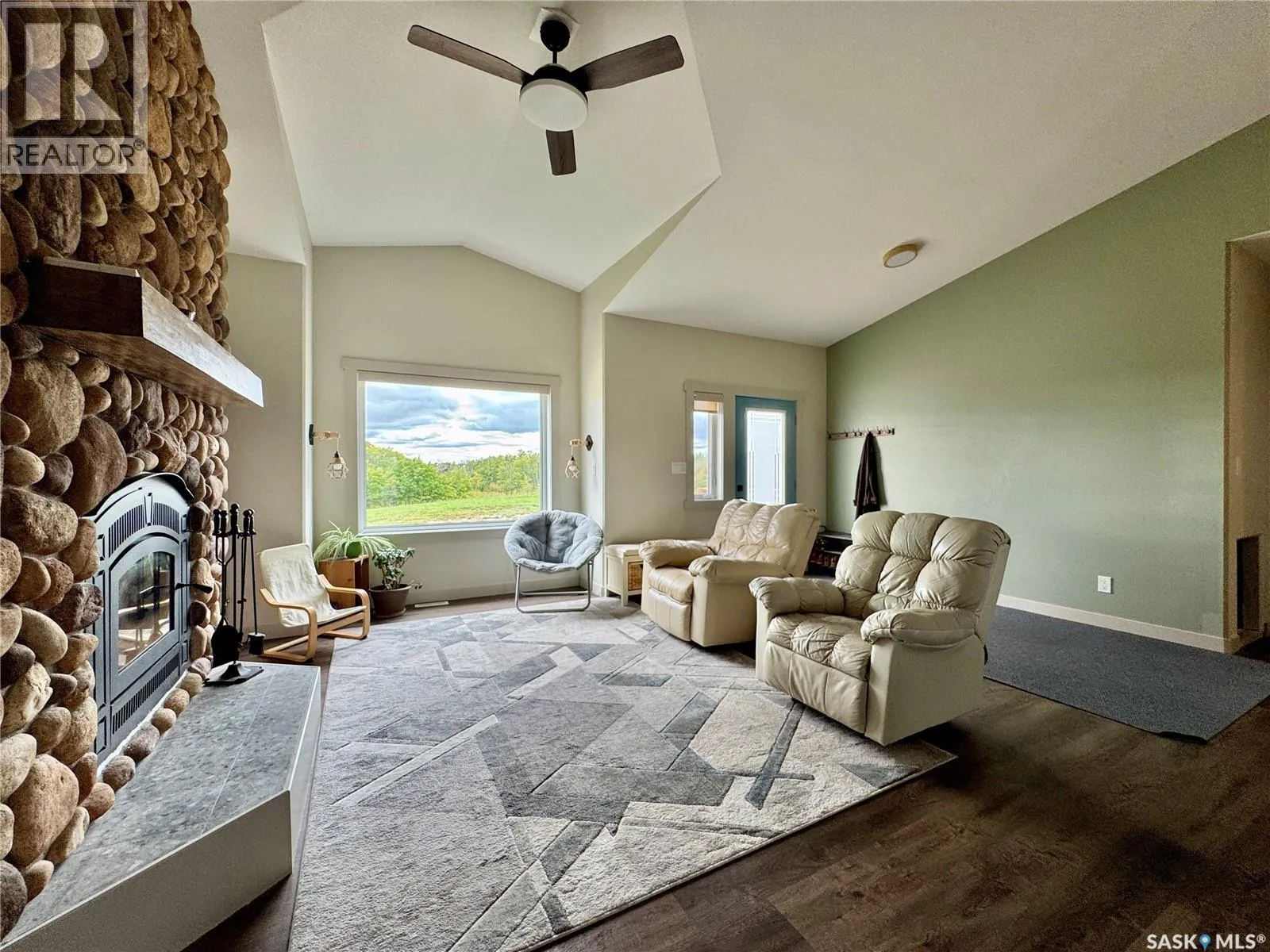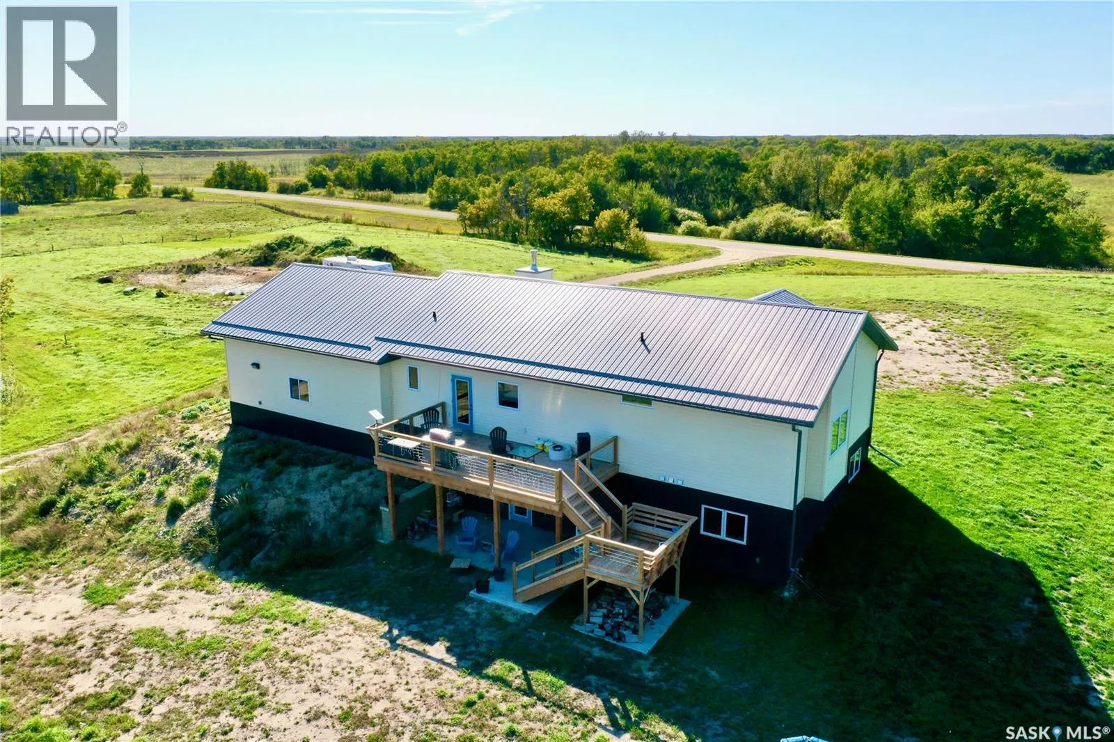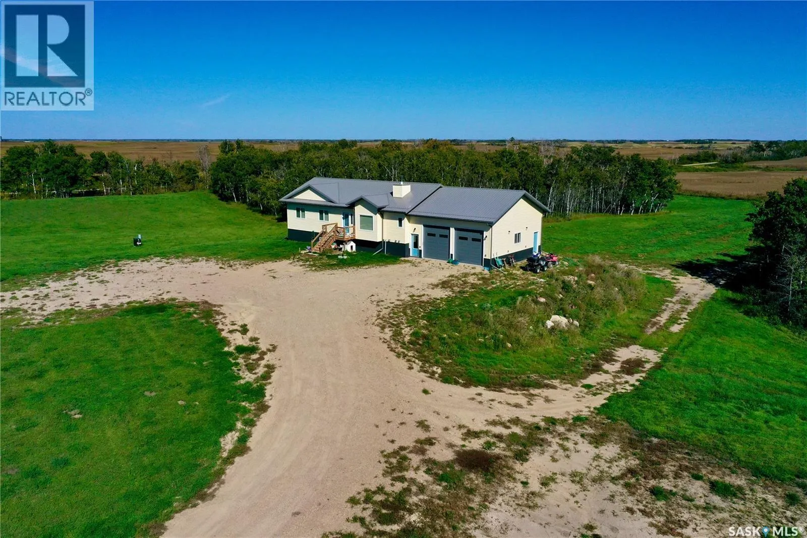 West of Stockholm down Excel Road North - look for signs - text agent for pin drop At Natures Edge Acres, nature and new construction come together in a way rarely seen in SE Saskatchewan. Tucked behind a mature shelterbelt where deer and songbirds wander, this 2022 custom build delivers more than 3,000 sqft. of exceptional living spaceâa chance to own a true countryside original without the wait of building. Designed from the ground up with family and entertaining in mind, the home offers 5 bedrooms and 4 bathrooms, plus a surprise youâll be talking about long after the showing: a 6th bedroom with a built-in slide right at the heart of the house. Whether itâs kids at play or simply hauling heavy bags downstairs, the slide turns everyday tasks into something fun. The main living area wows from the moment you walk in. Vaulted ceilings and wall-to-wall windows capture prairie light from sunrise to those legendary Saskatchewan sunsets. A dramatic floor-to-vault river rock fireplace anchors the spaceâbeautiful to look at and practical too, with settings that keep the home warm even if the power goes out. The chefâs kitchen is ready for gatherings big or small, complete with a generous prep island, deep dovetailed pot drawers, and soft-close cabinetry. The sink frames tranquil eastern views while the west-facing picture window serves up nightly sunset shows. Built with modern efficiency in mind, the home features geothermal heating and cooling, weeping tile, excellent insulation, and spa-style ensuite showers. The electrical wiring has been thoughtfully plannedââoverbuilt,â as the owners like to sayâso youâre ready for anything from a future basement bar with toe-kick lighting to advanced tech upgrades. Outside, the unfinished shop is already set up for big projects with a welder plug, 30-amp camper hookup, and doors tall enough for a lifted truck. Whether youâre after a family retreat, a place to host unforgettable gatherings, or simply room to breathe, this acreage offers a rare combination of new-home comfort and Saskatchewanâs natural beauty. (id:27476)