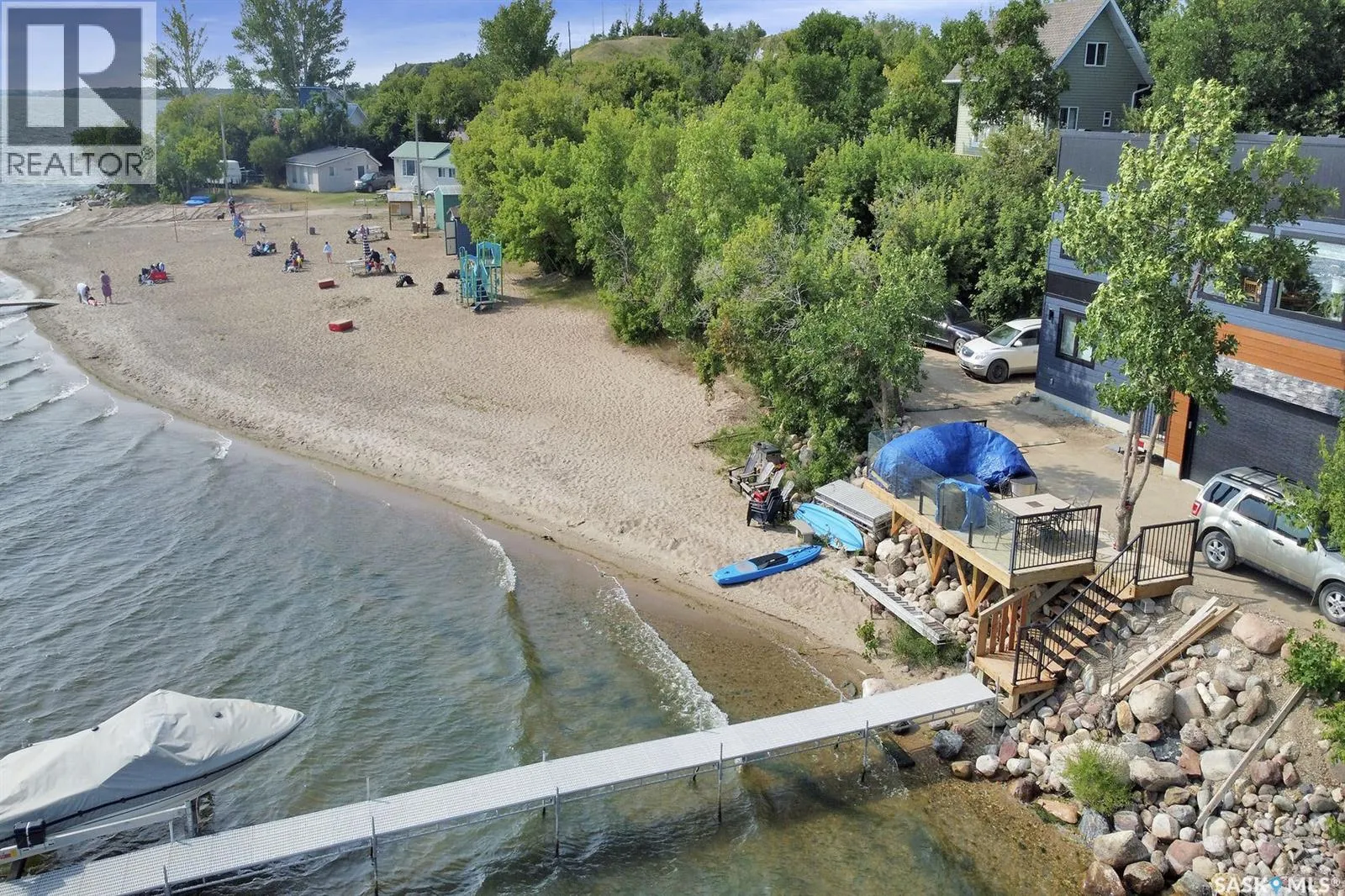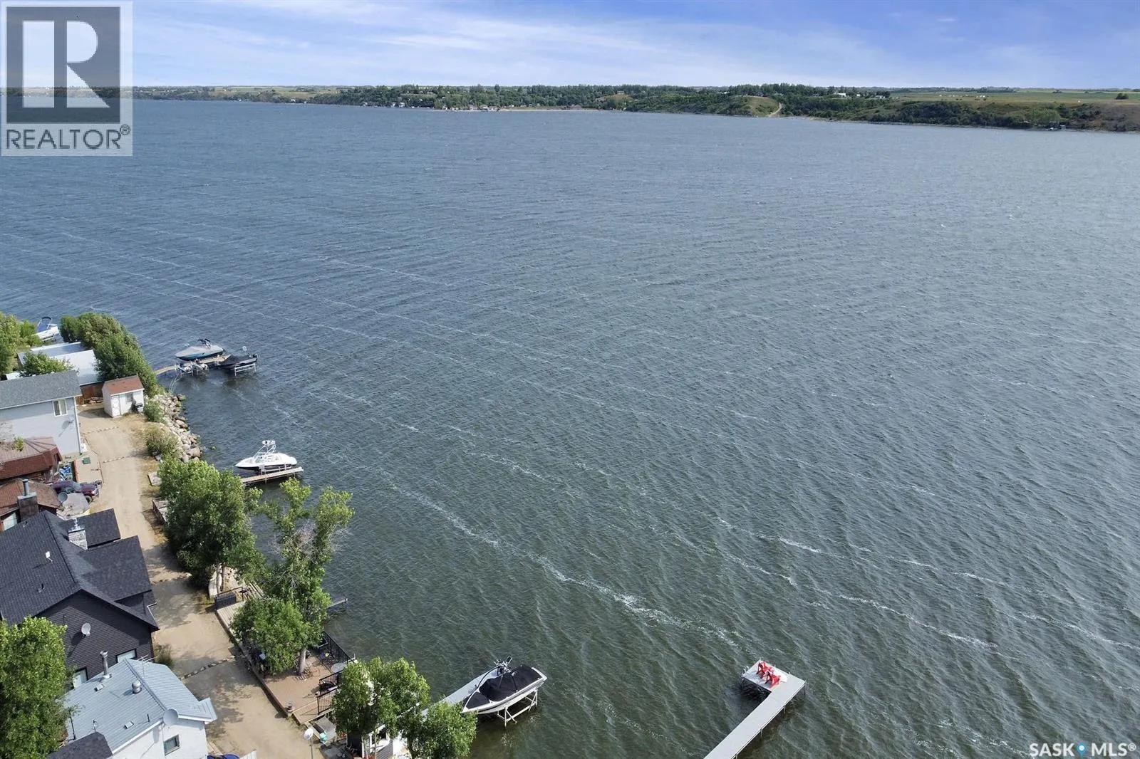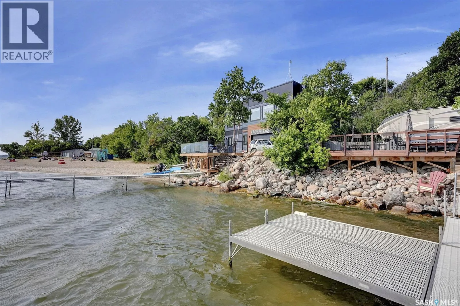 LOCATION! LOCATION! LOCATION! This Lakefront lot in Grandview Beach is only 2 lots from the main beach! Build your dream getaway only 50 minutes from Regina and 12 minutes away from the village of Dilke for the closest grocery and services. The lot is landscaped with rock and a seating area and a large lake front composite deck measuring 24x10 with a cooking bar and outside fridge. There are two 35 amp plugs and power to the shed. There is septic (1500 gallon 2017) and town water hookup (not drinkable). A gas line runs in the middle of the road and there is the ability to run a line to the property. Concrete Retaining wall was installed in 2022, each block weighs approx. 4500 lbs. The retaining wall was not required; it was installed for a clean and secure future cabin build. Neighbours live there full time. Land is on leased Crown land and the lease expires May 15, 2062. Dock is included. Trailer, boat and lift negotiable with the seller. (id:27476)
