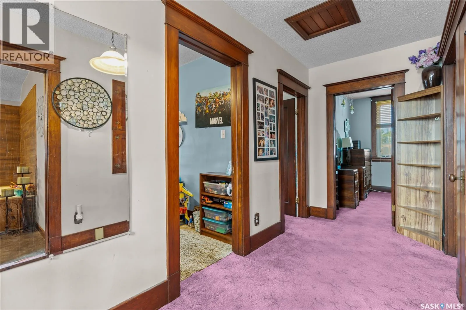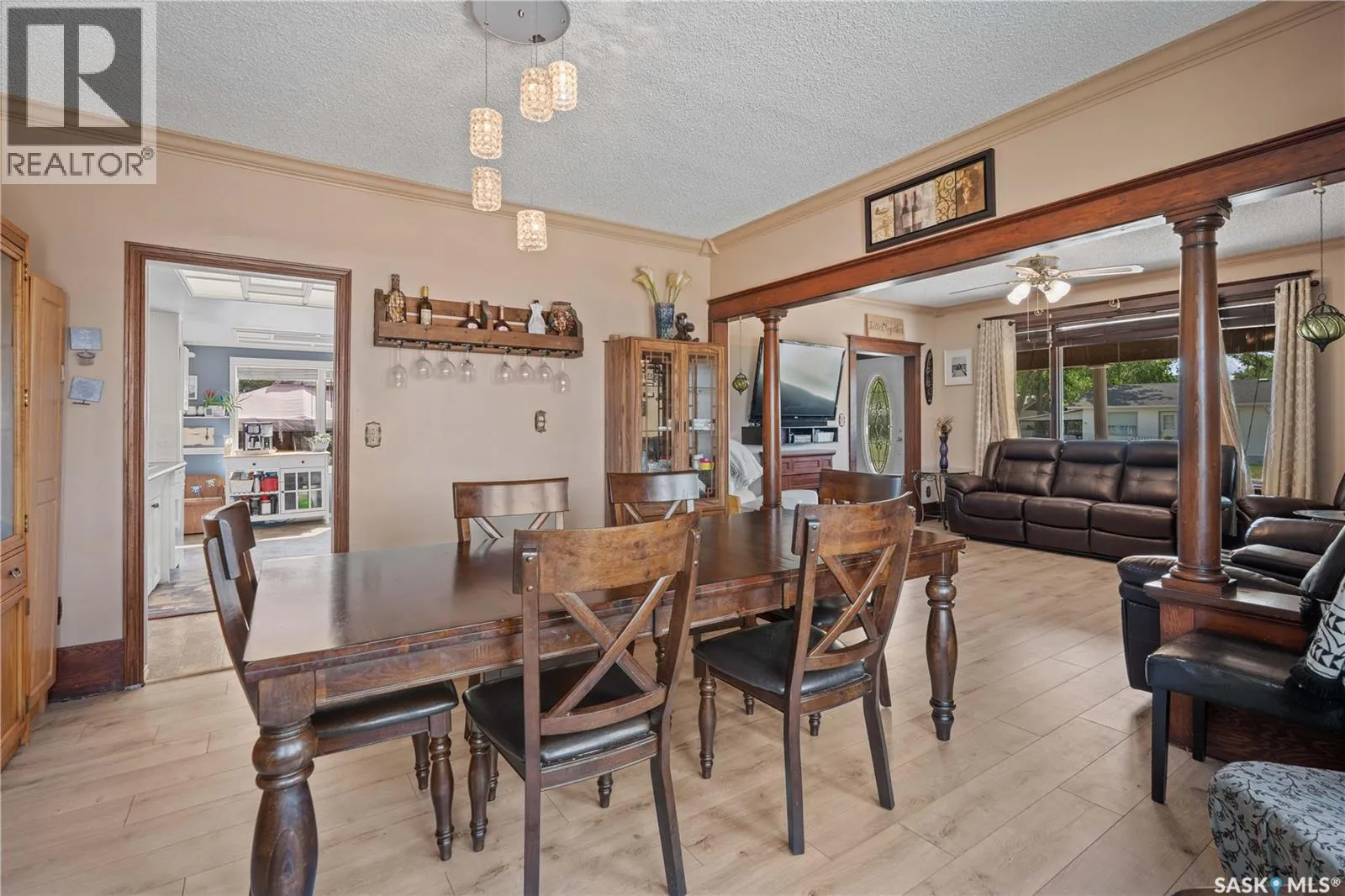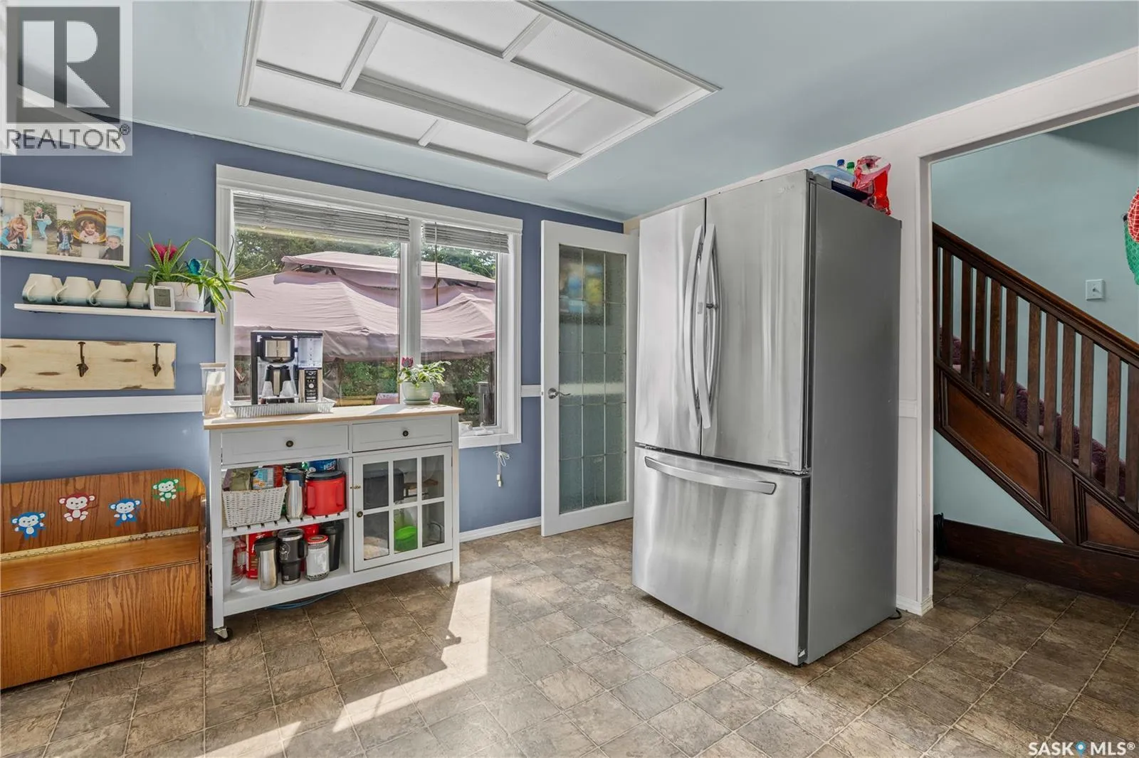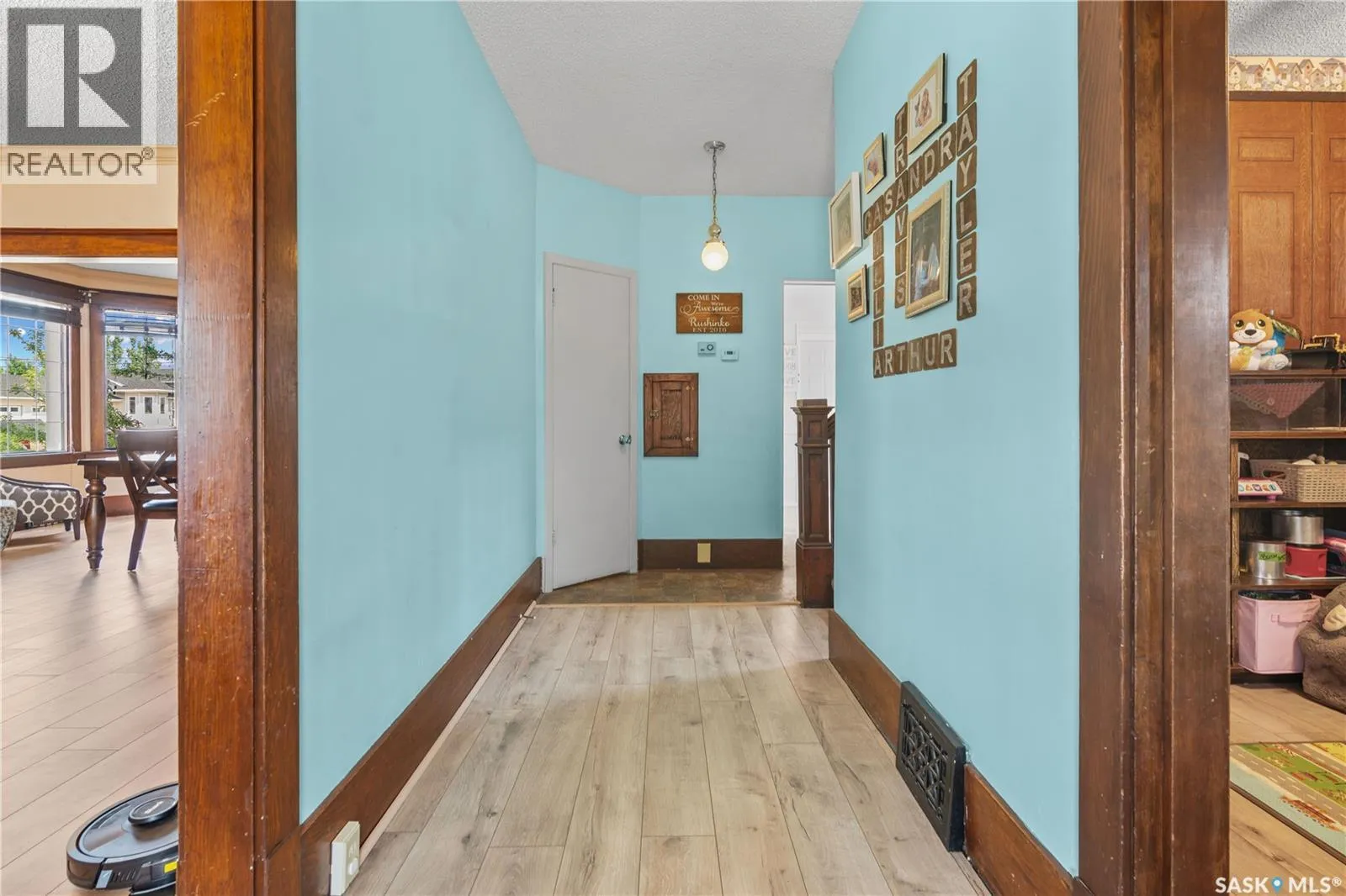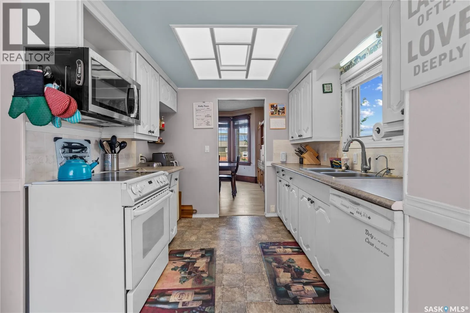 Gravelbourg offers small-town historic charm in a family-friendly, safe communityâideal for home buyers seeking affordable real estate in a welcoming rural Saskatchewan setting with all the amenities found in larger centres. These include a hospital, doctors, Collège Mathieu, Kâ12 schools, shopping, groceries, restaurants, local businesses, RCMP services, a cultural centre, and family activities including swim club, all within ten minutes of Thompson Lake Regional Park and golf course. This solid, character-filled historic Eaton home for sale in Gravelbourg, Saskatchewan offers five bedrooms, three bathrooms, and an oversized (24' x 32') heated attached garage with direct entry, parking for eight vehicles plus RV parking. The home blends timeless charm with major updates, including being professionally moved onto a solid, energy-efficient ICF (Insulated Concrete Form) foundation with in-floor heat in the basement in 2001âan incredibly valuable upgrade for long-term durability and peace of mind. Step onto the inviting covered front porch and into the main floor featuring tall ceilings, a spacious living room, dining room, kitchen, front office/den, and a 2pc bath. Upstairs offers four bedrooms and a luxurious bathroom with a jacuzzi soaker tub and separate shower. The basement adds more living space with in-floor heat, a cozy gas fireplace in the family room, an additional bedroom (*window may not meet current legal egress), and a 3pc bathroom. Recent updates include a brand new metal roof, PVC fencing, new flooring in the dining and living rooms, new grass in the backyard, and a xeriscaped front yardâgreat for cutting down those watering bills. Ready for a lifestyle change and considering small-town Saskatchewan living? Donât forget to click the multimedia link to VIEW THE VIRTUAL TOUR. Contact your REALTOR® today to book a viewing. (id:27476)