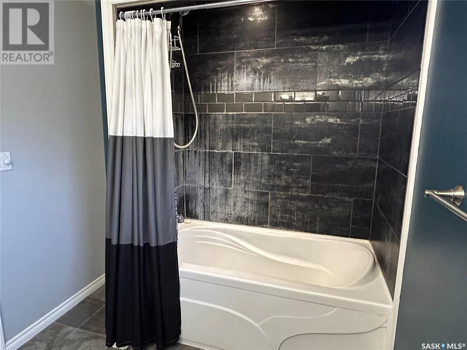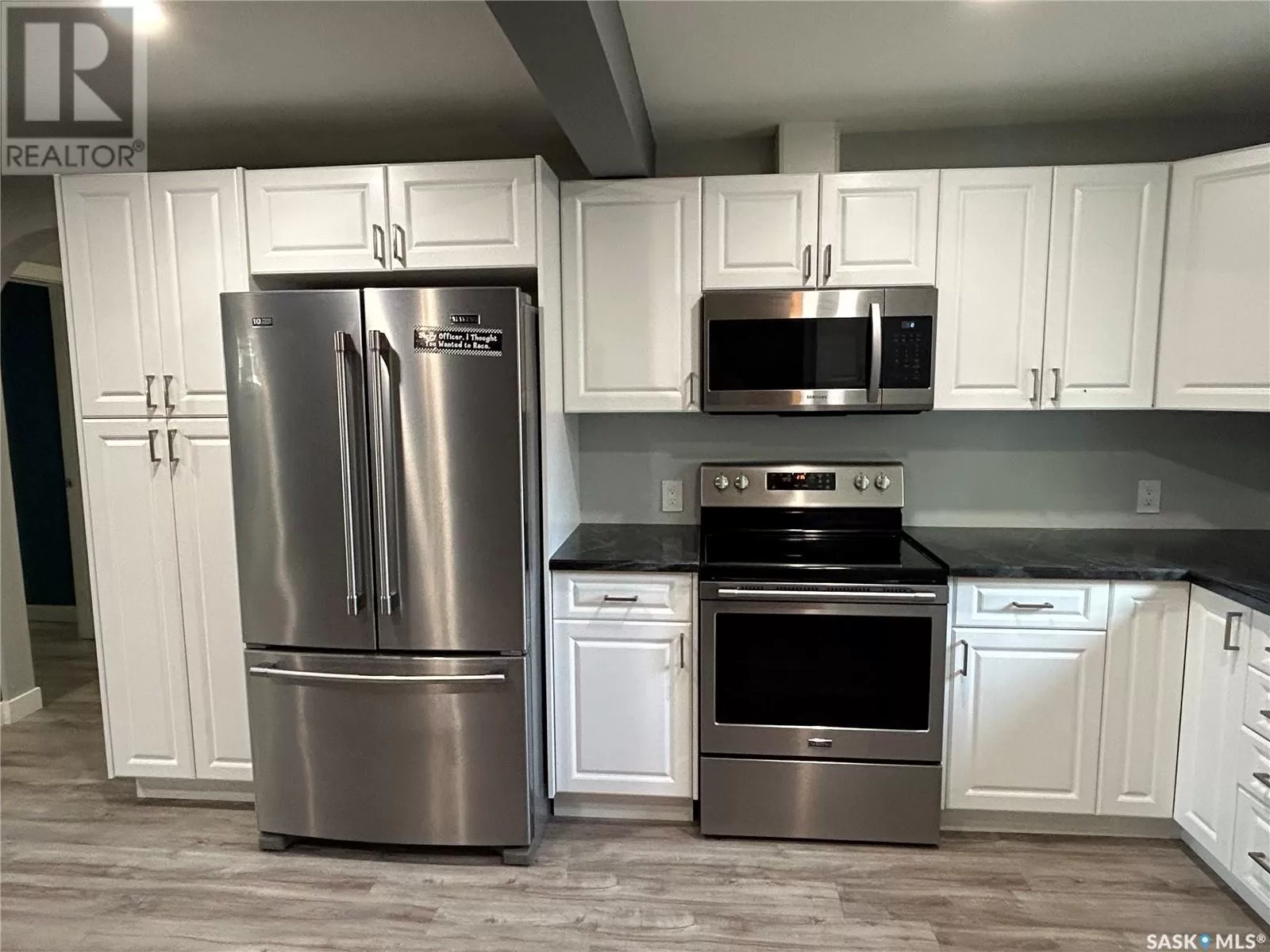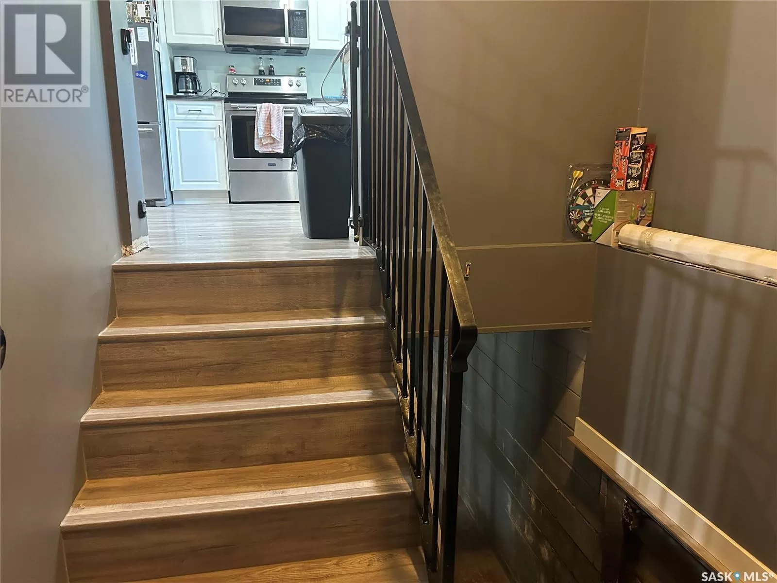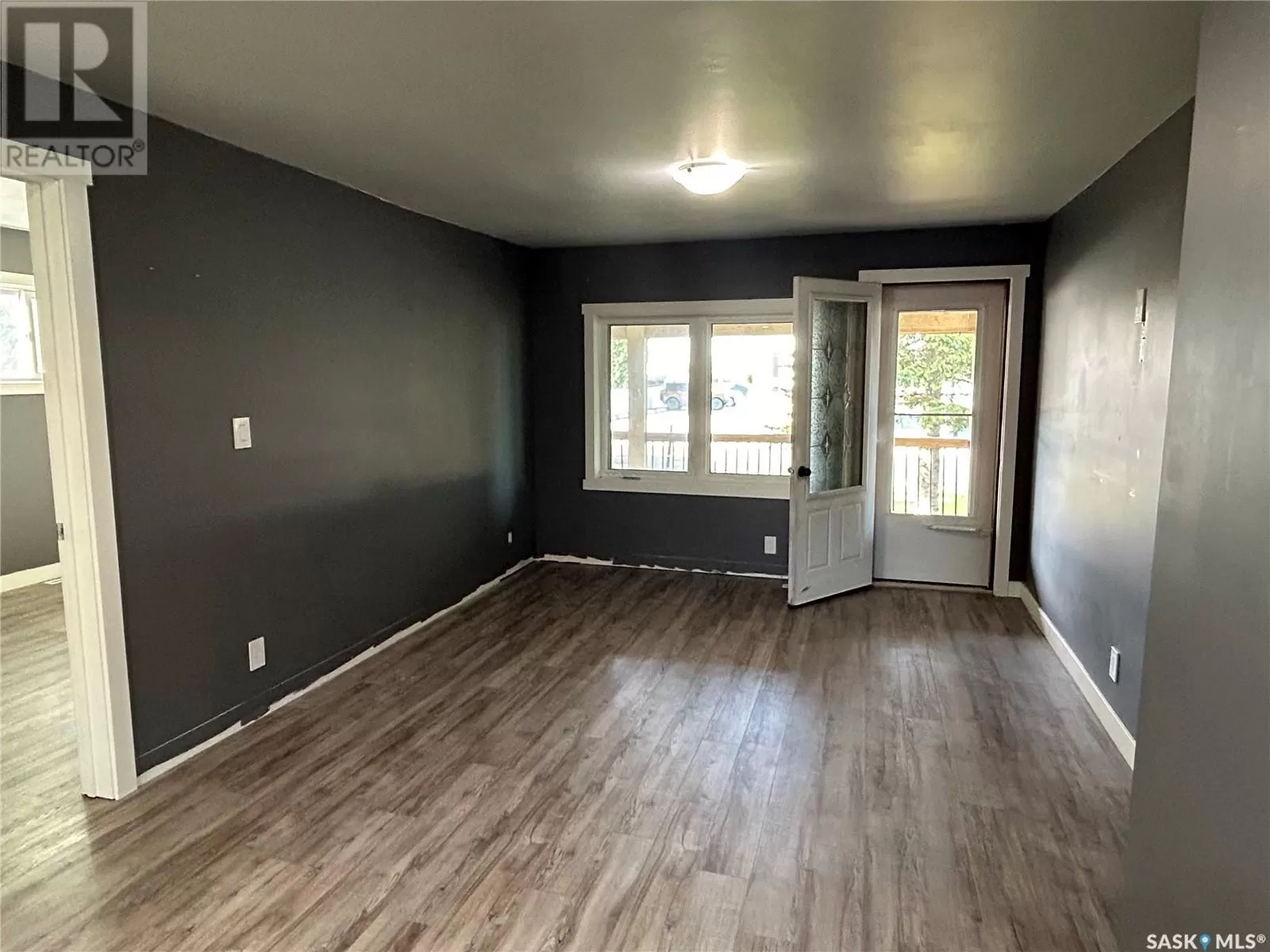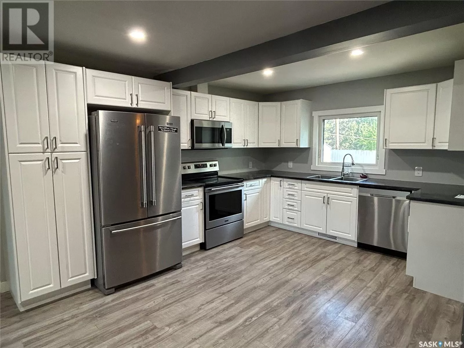 This home in Halbrite, 20 minutes east of Weyburn on Highway 39, is situated on a large double lot, with a detached garage, work area and loads of parking on the driveway. Upon entering the home, you are greeted by the beautiful kitchen with open plan dining area and living area. Two bedrooms on the main floor with a play area and a 4-piece bathroom. The basement is unfinished but potential for a second family area, bathroom or bedroom. This home has had some extensive interior renovations since the current owner bought this house, including kitchen, bathroom, and flooring. Call today for more information or you own private viewing. (id:27476)