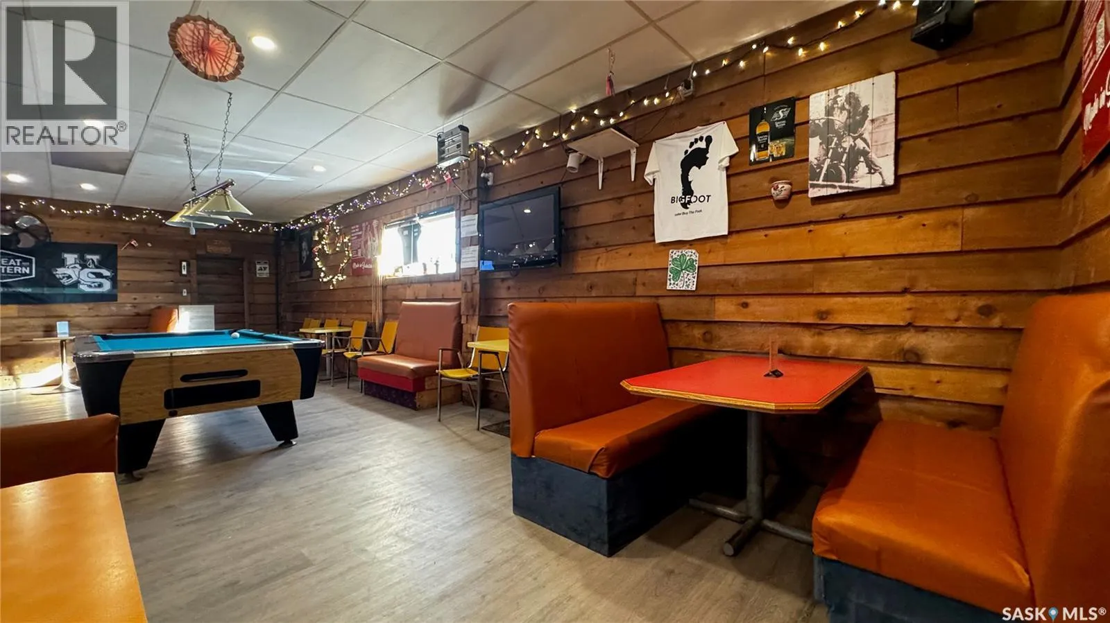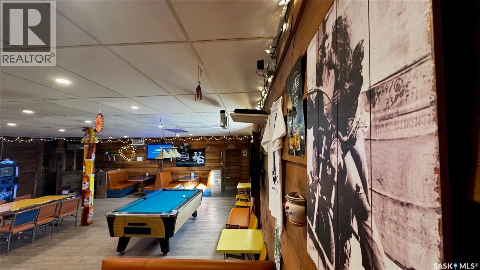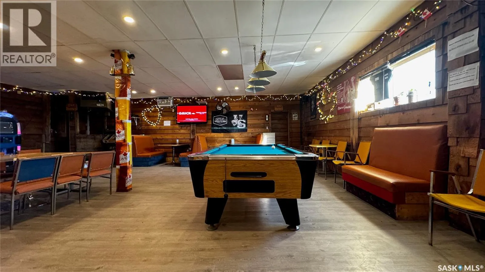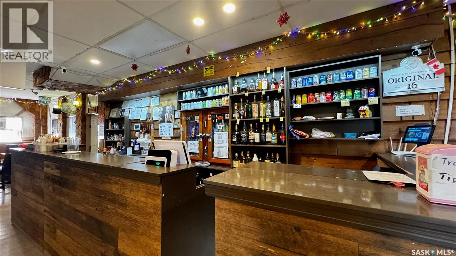 Just 45 minutes from Saskatoon, this exceptional 6000 sq ft, two-storey commercial property in the Town of Hanley offers a rare opportunity to acquire the building, land and a fully operational restaurant-bar business with diverse revenue streams and strong community roots. The main floor features the only Canadian-style restaurant bar in Hanley, equipped with a restaurant liquor permit (minors allowed 11 a.m.â10 p.m.), off-sale liquor permit, tobacco permit, 6 VLTs, 1 ATM, pool table, kickboxing machine, and jukebox, with seating capacity for 100 guests plus an inviting covered outdoor patio. A spacious 18' Ã 12' walk-in cooler, fully outfitted commercial kitchen, and a 20' Ã 24' single attached rear garage add to operational efficiency for the owner or manager. The second floor provides extensive accommodation, including one guest suite with kitchen and private bath, five guest rooms with individual sinks, two shared bathrooms with shower stalls, and a storage room. The opposite side of the upper level features an ownerâs suite, an office, and a versatile flex room suitable as an additional office, guest room, or managerâs room. The building is heated by a natural-gas floor-model furnace with forced air and cooled by wall A/C units in select areas. Hanley draws steady traffic with amenities such as a hockey rink, golf course, nearby horse racing, and a regional high school, while the business benefits from loyal patrons, including local residents, sports fans, and families from provincial football and youth hockey leagues. The current owner actively supports local sports and is willing to stay for training, making this a smooth transition for the next operator of this thriving multifaceted establishment. (id:27476)