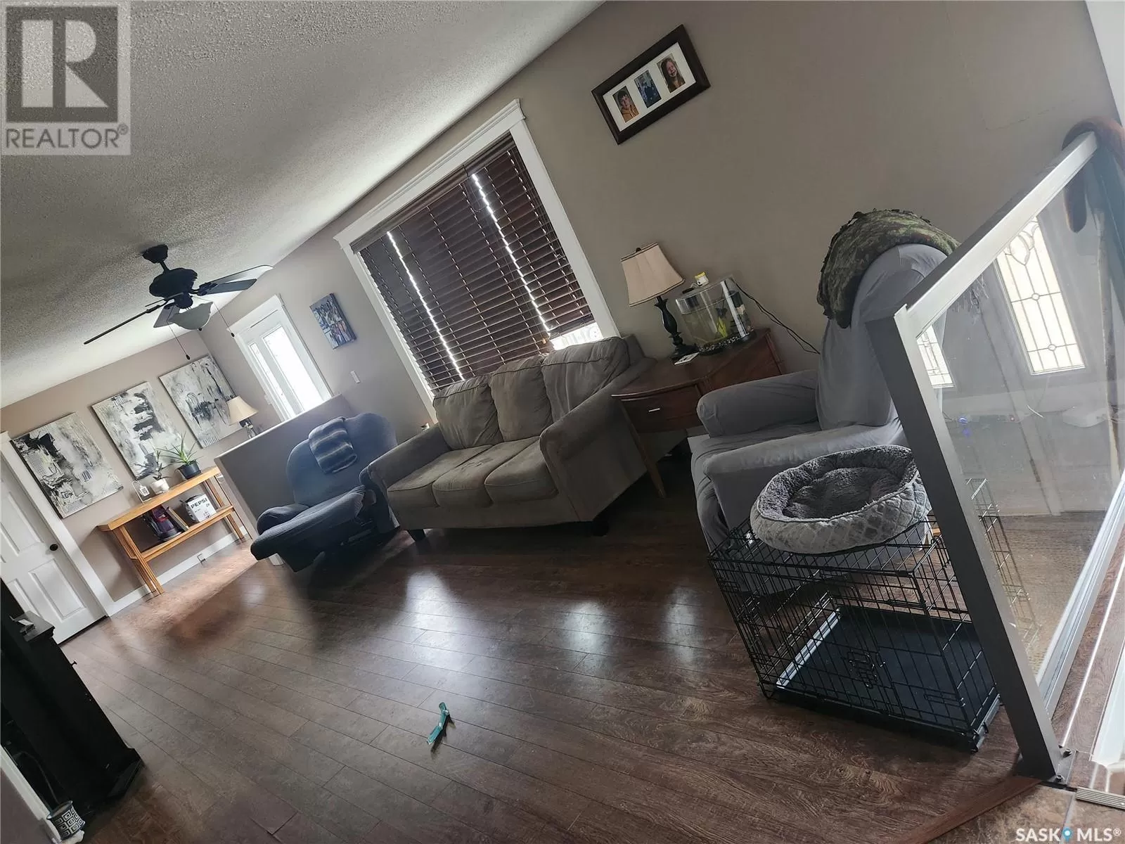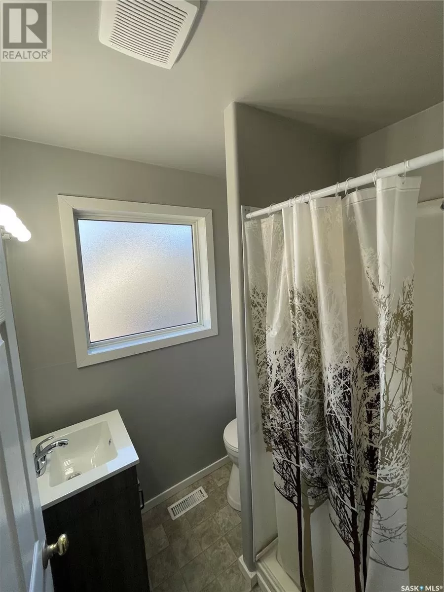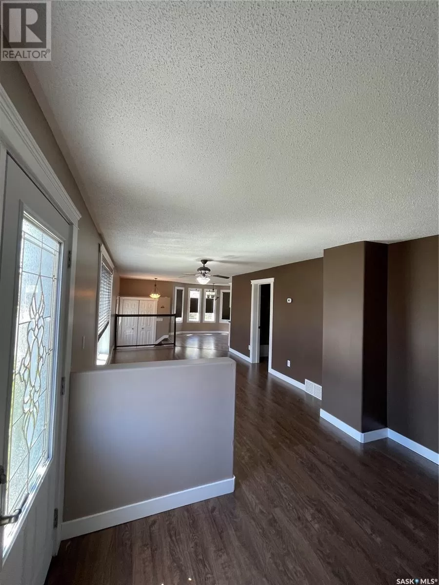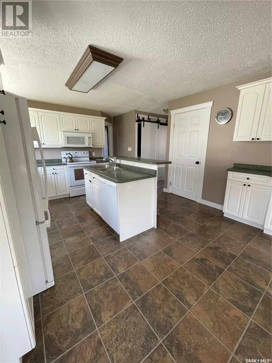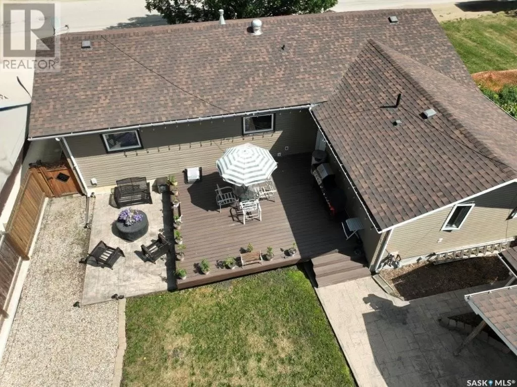 1 block South from k-12 school This beautifully updated, move-in-ready home features 4 bedrooms and 2 bathrooms, all conveniently located on one level. The laundry facilities are also on the main floor for added convenience. The primary bedroom boasts a walk-in closet and a 3-piece bathroom. Three additional large bedrooms offer plenty of space for family or guests. The open concept design enhances the living space, flowing seamlessly from the front door through to the dining area and kitchen, and then north to the living room. Every room has been thoughtfully updated with new finishes, windows, and doors. The kitchen features fresh white cabinets, ample cabinet space, and a side wine and coffee bar, along with modern appliances including a built-in dishwasher, fridge, stove, and a microwave oven over the stove. The spacious main bathroom includes his and her sinks and a tiled tub surround. Outside, the large deck faces west, perfect for enjoying morning coffee. The backyard is designed for relaxation and entertainment, with a privacy fence, fire pit area, and an insulated, electrically heated shed with a large roll access door. Additionally, the downstairs area, while primarily a service area, provides useful storage space and houses the water heater, furnace, and electrical service panels. The home is equipped with air conditioning and is ready for quick possession. Donât miss the opportunity to view this fantastic propertyâcall today to set up your private viewing! (id:27476)