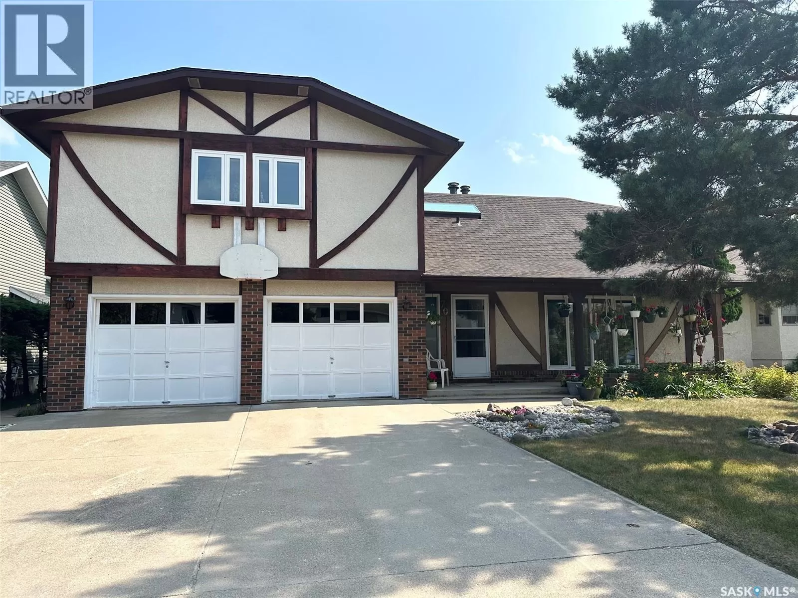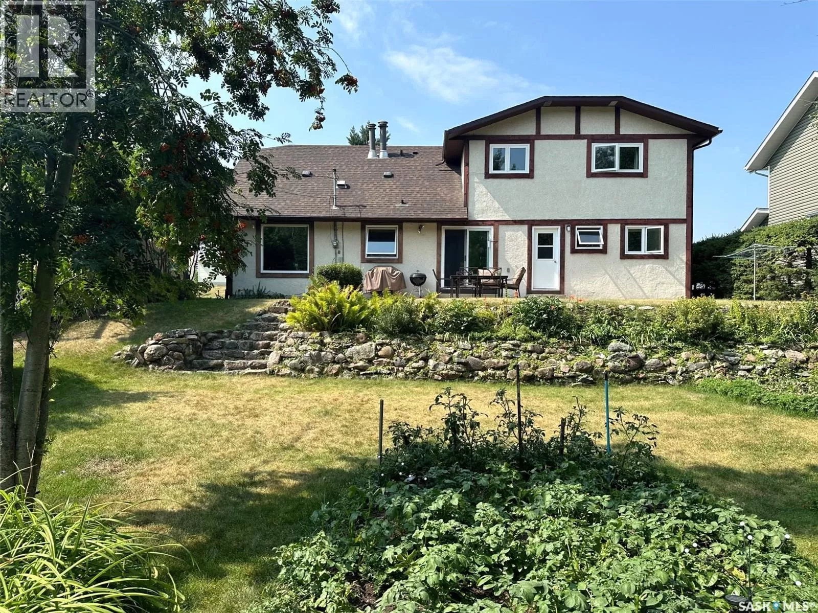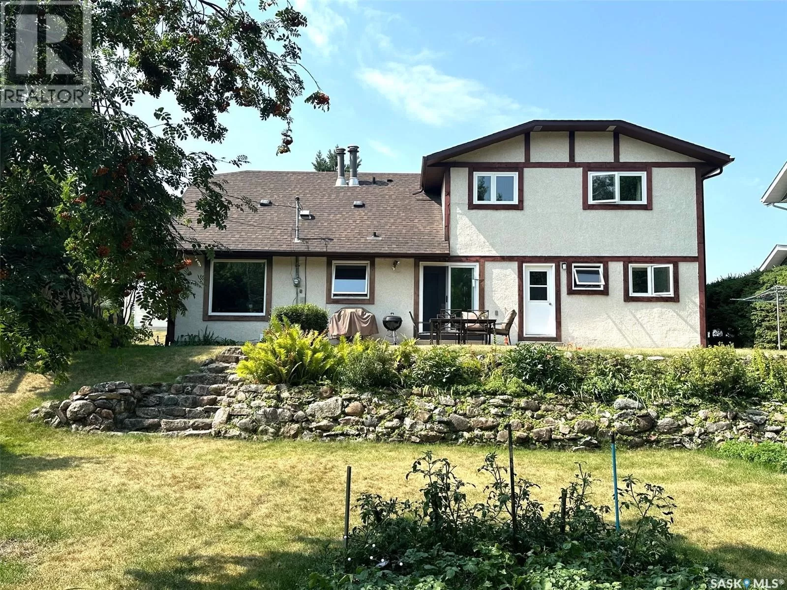Welcome to 706 Donald Street, a spacious and inviting 5-bedroom, 4-bathroom home nestled within town limits yet surrounded by nature. The exterior offers a beautifully landscaped yard with rock retaining walls covered by cascading perennials. Mature trees and natural growth provide privacy, while the backyard features a garden space and two sheds for additional storage. This property backs onto the east forest, offering peaceful views and a sense of seclusion. Inside, the upper level includes four bedrooms and two full bathrooms, with one room currently serving as a office. The main level has been recently updated with vinyl plank flooring in the living room and formal dining area, and a walk-in shower has been added to the back entrance, transforming it into a convenient three-piece bath. A patio door off the breakfast nook leads to a large patio that overlooks the backyard. The home is equipped with central air conditioning for year-round comfort. The finished lower level includes a guest bedroom, a craft or workroom, a sewing room, and a laundry area, along with ample space for entertaining. A truly unique shower stall with stained glass mosaic. An attached two-car garage adds convenience, and the original build features two inches of styrofoam under the stucco and R60 insulation in the attic, contributing to impressive energy efficiency as reflected in the utility bills. This well-maintained home is ready for its new ownersâcall or text today to schedule your private viewing. (id:27476)