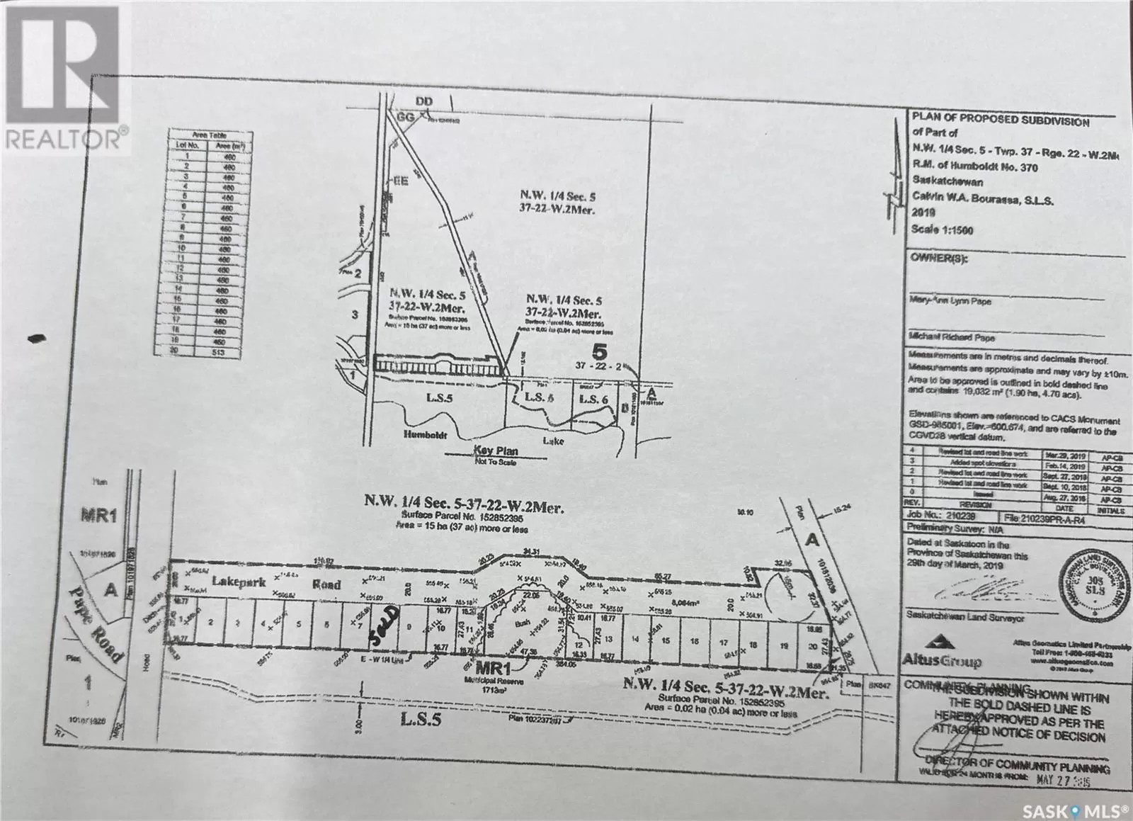 19 Vacant Interior RV lots on North Side of Humboldt Lake! Enjoy lake living on these private lots with limited traffic as there is no through road. Each lot is .11 acre. Culverts and driveways have been installed and trees planted. Lots have 100 amp power to property line for each lot. Three lots have power boxes on them (lot 3, 14, 16). Some building restrictions apply. Buyer to sign Servicing Agreement with Pape Holdings Inc.. Buyer responsible for utility hookup costs. Buyer is responsible for septic holding tank cost and install. Buyers to consult with RM of Humboldt regarding building guidelines and approval. There is a limited number of water rights that could be purchased at an additional cost. Minutes from the City of Humboldt and approx. 50 min from the BHP Jansen Potash Mine site. Call today for more information! (id:27476)