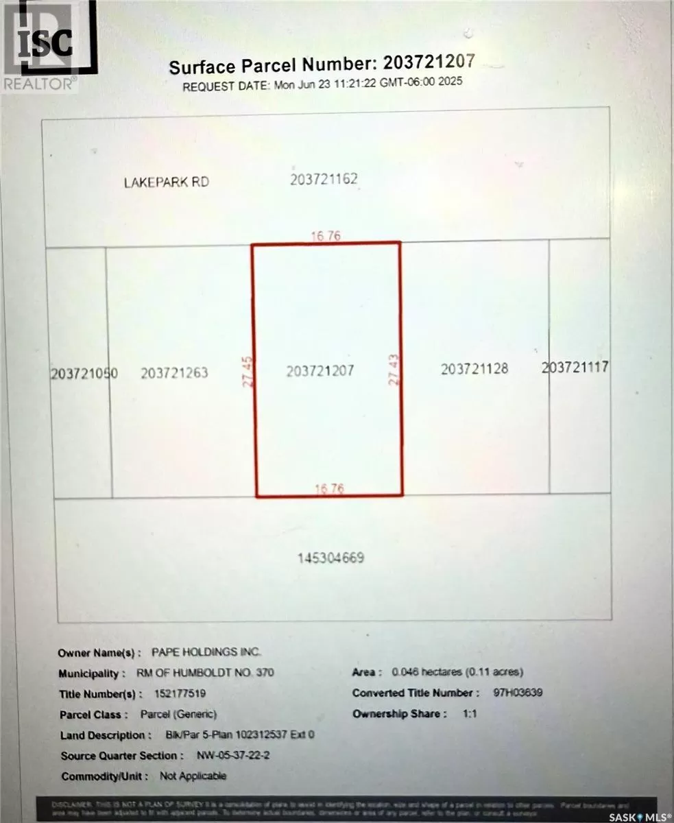 Enjoy lake living on this lot. The Seasonal lot is .11 acre. Culverts and driveways have been installed and trees planted. Lot has 100 amp power to property line. Buyer to sign Servicing Agreement with Pape Holdings Inc.. Buyer responsible for utility hookup costs. Buyer is responsible for septic holding tank cost and install. Buyers to consult with RM of Humboldt regarding building guidelines and approval. Minutes from the City of Humboldt and approx. 50 min from the BHP Jansen Potash Mine site. Call today for more information! (id:27476)
